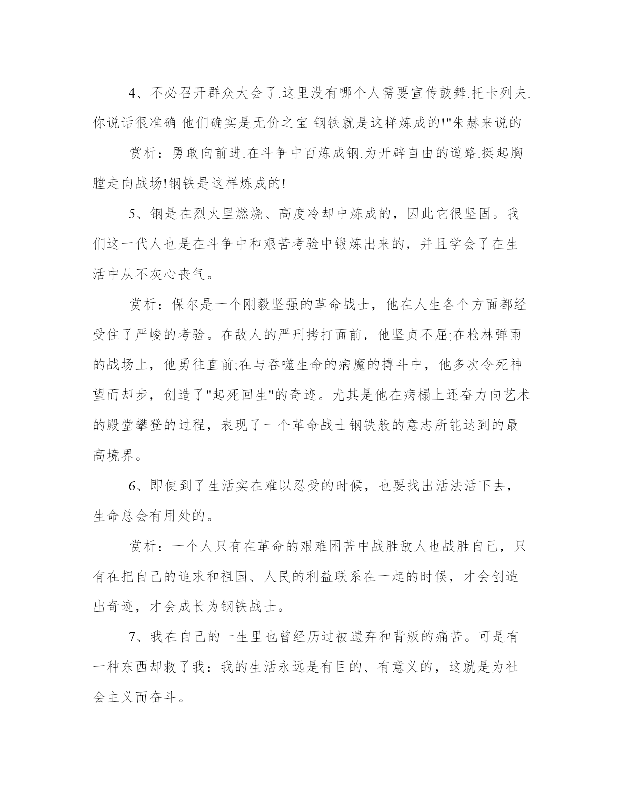《钢铁是怎样炼成的》句子及赏析1、人最宝贵的东西是生命.生命对人来说只有一次.因此.人的一生应当这样度过:当一个人回首往事时.不因虚度年华而悔恨.也不因碌碌无为而羞愧,这样.在他临死的时候.能够说.我把整个生命和全部精力都献给了人生最宝贵的事业--为人类的解放而奋斗.我们必须抓紧时间生活.因为即使是一场暴病或意外都可能终止生命.赏析:当一个人身体健康.充满青春活力的时候.坚强是比较简单和容易做到的事.只有生活像铁环那样把你紧紧箍住的时候.坚强才是光荣的业绩2、领袖的逝世没有引起党的队伍涣散.就像一棵大树一样.强有力的将根深深地扎入土壤中.即使削掉树梢.也绝不会因此而凋零.赏析:知道为什么而死.问题就不同了.明白了这一点的人.也就有了力量.要是你感到真理是在你那一面.你甚至会从容就义的.英雄的行为就是这样产生的.3、收起枪.别跟任何人说.哪怕.生活无法忍受也要坚持下去.这样的生活才有可能变得有价值.赏析:任何一个傻瓜在任何时候都能结束他自己!这是最怯懦也是最容易的出路.即使到了生活实在难以忍受的时候.也要找出活法活下去.生命总会有用处的.4、不必召开群众大会了.这里没有哪个人需要宣传鼓舞.托卡列夫.你说话很准确.他们确实是无价之宝.钢铁就是这样炼成的!"朱赫来说的.赏析:勇敢向前进.在斗争中百炼成钢.为开辟自由的道路.挺起胸膛走向战场!钢铁是这样炼成的!5、钢是在烈火里燃烧、高度冷却中炼成的,因此它很坚固。我们这一代人也是在斗争中和艰苦考验中锻炼出来的,并且学会了在生活中从不灰心丧气。赏析:保尔是一个刚毅坚强的革命战士,他在人生各个方面都经受住了严峻的考验。在敌人的严刑拷打面前,他坚贞不屈;在枪林弹雨的战场上,他勇往直前;在与吞噬生命的病魔的搏斗中,他多次令死神望而却步,创造了"起死回生"的奇迹。尤其是他在病榻上还奋力向艺术的殿堂攀登的过程,表现了一个革命战士钢铁般的意志所能达到的最高境界。6、即使到了生活实在难以忍受的时候,也要找出活法活下去,生命总会有用处的。赏析:一个人只有在革命的艰难困苦中战胜敌人也战胜自己,只有在把自己的追求和祖国、人民的利益联系在一起的时候,才会创造出奇迹,才会成长为钢铁战士。7、我在自己的一生里也曾经历过被遗弃和背叛的痛苦。可是有一种东西却救了我:我的生活永远是有目的、有意义的,这就是为社会主义而奋斗。赏析:在全身瘫痪、双目失明后,他生命的全部需要,就是能够继续为党工作。正像他所说的:"我的整个生命和全部精力,都献给了世界上最壮丽的事业――为人类的解放而斗争。"为理想而献身的精神是他在遭遇苦难时的救赎,钢铁般的意志和顽强奋斗的高贵品质成就了他的革命事业。