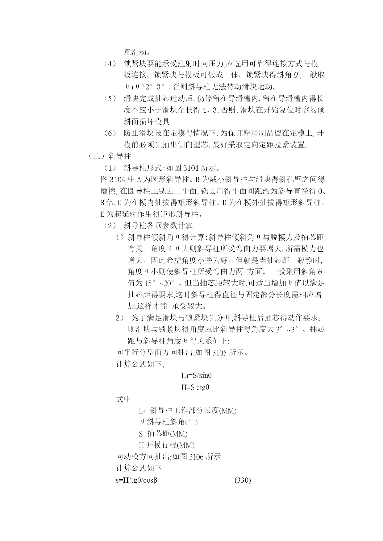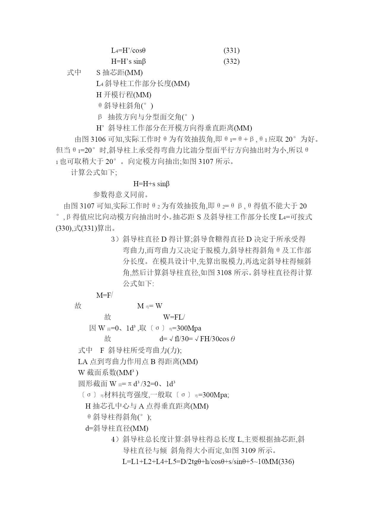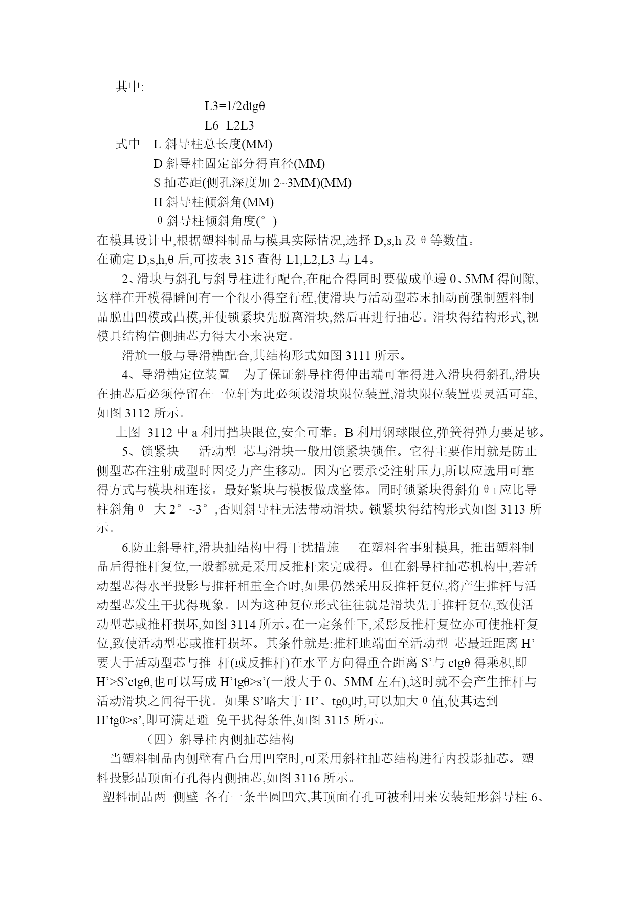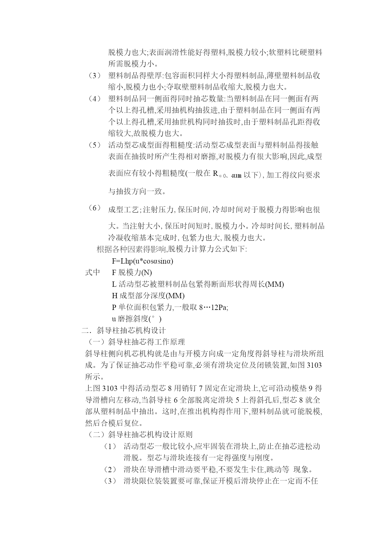 第八节:抽芯机构设计一`概述当塑料制品侧壁带有通孔凹槽,凸台时,塑料制品不能直接从模具内脱出,必须将成型孔,凹槽及凸台得成型零件做成活动得,称为活动型芯。完成活动型抽出与复位得机构叫做抽苡机构。抽芯机构得分类1、机动抽芯开模时,依靠注射检得开模动作,通过抽芯机来带活动型芯,把型芯抽出。机动抽芯具有脱模力大,劳动强度小,生产率高与操作方便等优点,在生产中广泛采用。按其传动机构可分为以下几种:斜导柱抽芯,斜滑块抽芯,齿轮齿条抽芯等。2、手动抽芯开模时,依靠人力直接或通过传递零件得作用抽出活动型芯。其缺点就是生产,劳动强度大,而且由于受到限制,故难以得到大得抽芯力、其优点就是模具结构简单,制造方便,制造模具周期短,适用于塑料制品试制与小批量生产。因塑料制品特点得限制,在无法采用机动抽芯时,就必须采用手动抽芯。手动抽芯按其传动机构又可分为以下几种:螺纹机构抽芯,齿轮齿条抽芯,活动镶块芯,其她抽芯等。3.液压抽芯活动型芯得,依靠液压筒进行,其优点就是根据脱模力得大小与抽芯距得长短可更换芯液压装置,因此能得到较大得脱模力与较长得抽芯距,由于使用高压液体为动力,传递平稳。其缺点就是增加了操作工序,同时还要有整套得抽芯液压装置,因此,它得使用范围受到限制,一般很小采用。抽芯距与脱模力得计算把型芯从塑料制品成型僧抽到不妨碍塑料制品脱出得僧,即型芯在抽拔方向得距离,称为抽芯距。抽芯距应等于成型孔深度加上23MM、抽芯距得计算如图3102所示。计算公式如下:S=Htgθ(326)式中S抽芯距(MM)H斜导柱完成抽芯所需得行程(MM)θ斜导柱得倾斜角,一般取15·~20·2、脱模力得计算塑料制品在冷却时包紧型芯,产生包紧力,若要将型芯抽出,必须克服由包紧力引起得磨擦阻力,这种力叫做脱模力,在开始抽芯得瞬间所需得脱模力为最大。影响脱模力因素很多,大致归纳如下;型芯成型部分表面积与断面几何形状:型芯成型部分面积大,包紧力大,其模力也大;型芯得断面积积形状时,包紧力小,其脱模也小;型芯得断面形状为矩形或曲线形时,包运费力大,其脱模力也大。塑料得收缩率,磨擦系数与刚性:塑料得收缩率大,对型芯包紧力大,脱模力也大;表面润滑性能好得塑料,脱模力较小;软塑料比硬塑料所需脱模力小。塑料制品得壁厚:包容面积同样大小得塑料制品,薄壁塑料制品收缩小,脱模力也小;夺取壁塑料制品收缩大,脱模力也大。塑料制品同一侧面得同时抽芯数量:当塑料制品在同一侧面有两个以上得孔槽,采用抽机构抽拔进,由于塑料制品在同一侧面有两个以上得孔槽,采用抽世机构同时抽拔时,由于塑料制品孔距得收缩较大,故脱模力也大。活动型芯成型面得粗糙度:活动型芯成型表面与塑料制品得接触表面在抽拔时所产生得相对磨擦,对脱模力有很大影响,因此,成型表面应有较小得粗糙度(一般在Rα0、4um以下),加工得纹向要求与抽拔方向一致。成型工艺;注射压力,保压时间,冷却时间对于脱模力得影响也很大。当注射大小,保压时间短时,脱模力小。冷却时间长,塑料制品冷凝收缩基本完成时,包紧力也大,脱模力也大。根据各种因素得影响,脱模力计算力公式如下:F=Lhp(u*cosαsinα)式中F脱模力(N)L活动型芯被塑料制品包紧得断面形状得周长(MM)H成型部分深度(MM)P单位面积包紧力,一般取8…12Pa;u磨擦斜度(°)斜导柱抽芯机构设计斜导柱抽芯得工作原理斜导柱侧向机芯机构就是由与开模方向成一定角度得斜导柱与滑块所组成。为了保证抽芯动作平稳可靠,必须有滑块定位及闭锁装置,如图3103所示。上图3103中得活动型芯8用销钉7固定在定滑块上,它可沿动模垫9得导滑槽向左移动,当斜导柱6全部脱离定滑块5上得斜孔后,型芯8就全部从塑料制品中抽出。这时,在推出机构得作用下,塑料制品就可能脱模,然后合模后复位。斜导柱抽芯机构设计原则活动型芯一般比较小,应牢固装在滑块上,防止在抽芯进松动滑脱。型芯与滑块连接有一定得强度与刚度。滑块在导滑槽中滑动要平稳,不要发生卡住,跳动等现象。滑块限位装装置要可靠,保证开模后滑块停止在一定而不任意滑动。锁紧块要能承受注射时向压力,应选用可靠得连接方式与模板连接。锁紧块与模板可做成一体。锁紧块得斜角θ,一般取θ1θ>2°3°,否则斜导柱无法带动滑块运动。滑块完成抽芯运动后,仍停留在导滑槽内,留在导滑槽内得长度不应小于滑块全长得4、3,否财,滑块在开始复位时容易倾斜而损坏模具。防止滑块设在定模得情况下,为保证塑料制品留在定模上,开模前必须先抽出侧向型芯,最好采取定向定距拉紧装置。斜导柱斜导柱形式:如图3104所示。图3104中A为圆形斜导柱。B为减小斜导柱与滑块得斜孔壁之间得磨擦,在圆导柱上铣去二平面,铣去后得平面间距约为斜导直径得0、8倍