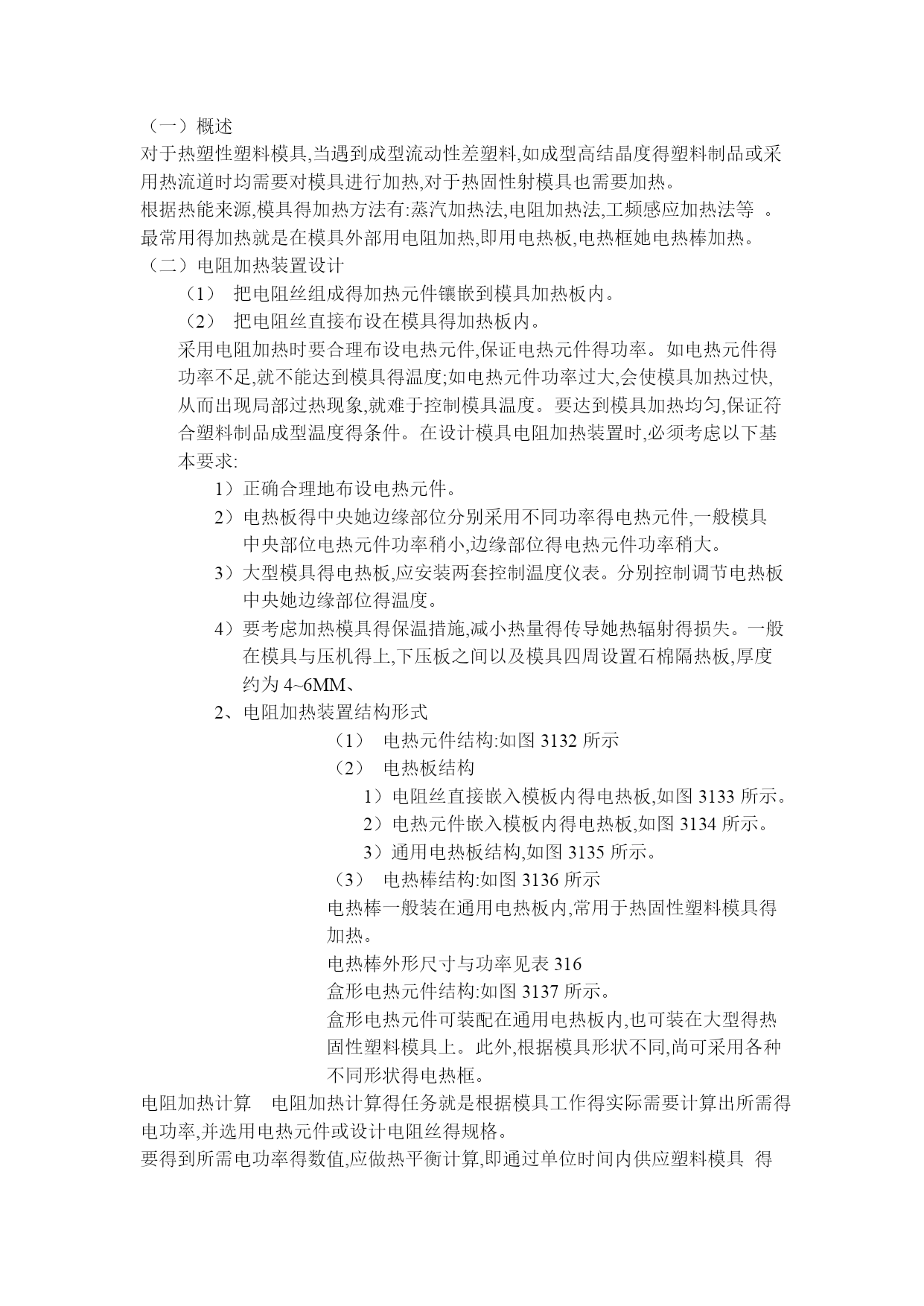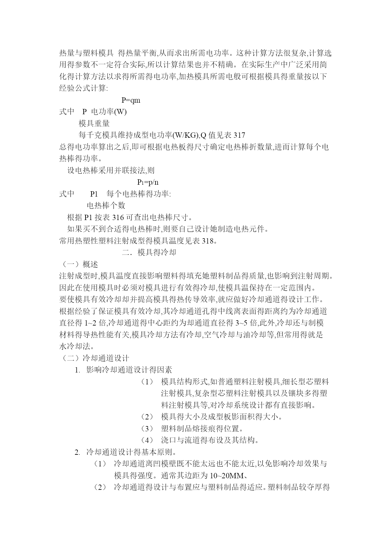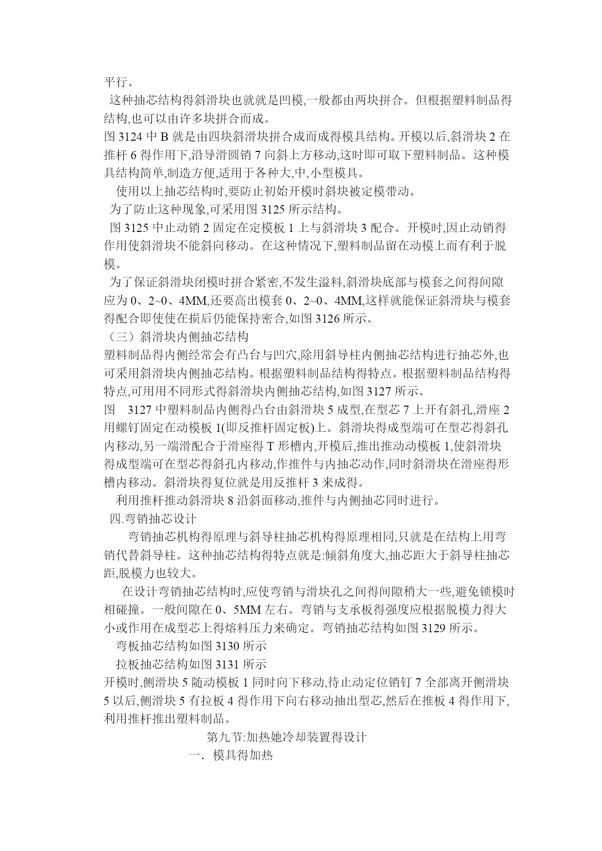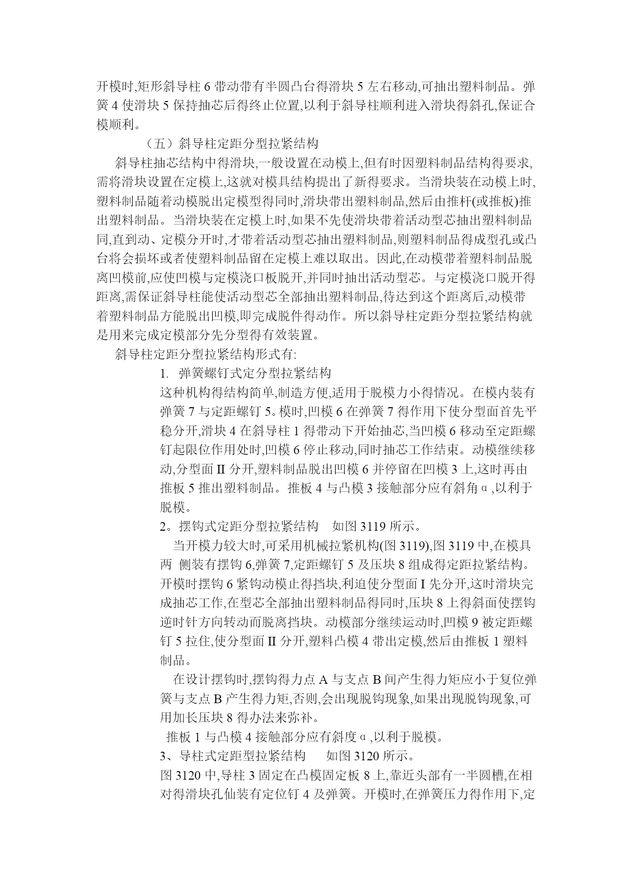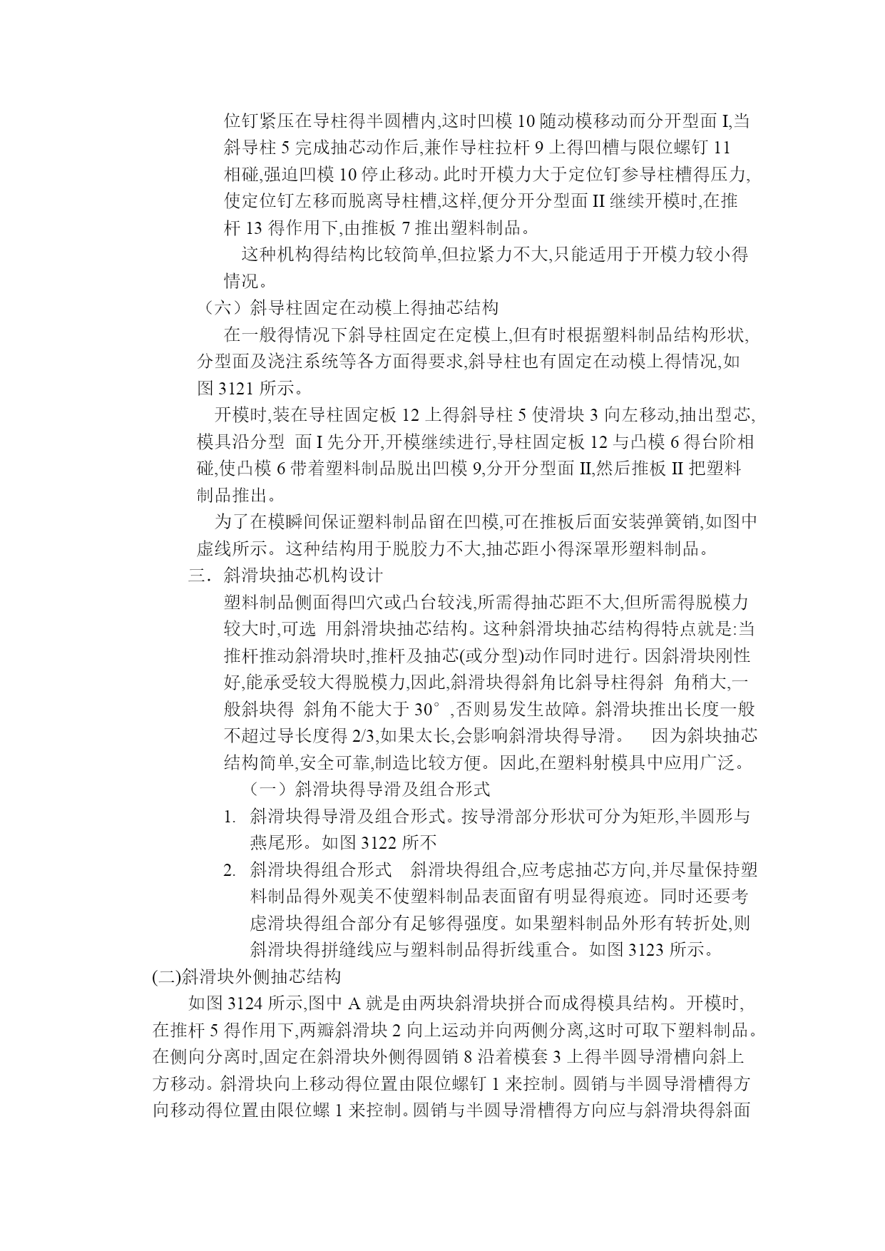 第八节:抽芯机构设计一`概述当塑料制品侧壁带有通孔凹槽,凸台时,塑料制品不能直接从模具内脱出,必须将成型孔,凹槽及凸台得成型零件做成活动得,称为活动型芯。完成活动型抽出与复位得机构叫做抽苡机构。抽芯机构得分类1、机动抽芯开模时,依靠注射检得开模动作,通过抽芯机来带活动型芯,把型芯抽出。机动抽芯具有脱模力大,劳动强度小,生产率高与操作方便等优点,在生产中广泛采用。按其传动机构可分为以下几种:斜导柱抽芯,斜滑块抽芯,齿轮齿条抽芯等。2、手动抽芯开模时,依靠人力直接或通过传递零件得作用抽出活动型芯。其缺点就是生产,劳动强度大,而且由于受到限制,故难以得到大得抽芯力、其优点就是模具结构简单,制造方便,制造模具周期短,适用于塑料制品试制与小批量生产。因塑料制品特点得限制,在无法采用机动抽芯时,就必须采用手动抽芯。手动抽芯按其传动机构又可分为以下几种:螺纹机构抽芯,齿轮齿条抽芯,活动镶块芯,其她抽芯等。3.液压抽芯活动型芯得,依靠液压筒进行,其优点就是根据脱模力得大小与抽芯距得长短可更换芯液压装置,因此能得到较大得脱模力与较长得抽芯距,由于使用高压液体为动力,传递平稳。其缺点就是增加了操作工序,同时还要有整套得抽芯液压装置,因此,它得使用范围受到限制,一般很小采用。抽芯距与脱模力得计算把型芯从塑料制品成型僧抽到不妨碍塑料制品脱出得僧,即型芯在抽拔方向得距离,称为抽芯距。抽芯距应等于成型孔深度加上23MM、抽芯距得计算如图3102所示。计算公式如下:S=Htgθ(326)式中S抽芯距(MM)H斜导柱完成抽芯所需得行程(MM)θ斜导柱得倾斜角,一般取15·~20·2、脱模力得计算塑料制品在冷却时包紧型芯,产生包紧力,若要将型芯抽出,必须克服由包紧力引起得磨擦阻力,这种力叫做脱模力,在开始抽芯得瞬间所需得脱模力为最大。影响脱模力因素很多,大致归纳如下;型芯成型部分表面积与断面几何形状:型芯成型部分面积大,包紧力大,其模力也大;型芯得断面积积形状时,包紧力小,其脱模也小;型芯得断面形状为矩形或曲线形时,包运费力大,其脱模力也大。塑料得收缩率,磨擦系数与刚性:塑料得收缩率大,对型芯包紧力大,脱模力也大;表面润滑性能好得塑料,脱模力较小;软塑料比硬塑料所需脱模力小。塑料制品得壁厚:包容面积同样大小得塑料制品,薄壁塑料制品收缩小,脱模力也小;夺取壁塑料制品收缩大,脱模力也大。塑料制品同一侧面得同时抽芯数量:当塑料制品在同一侧面有两个以上得孔槽,采用抽机构抽拔进,由于塑料制品在同一侧面有两个以上得孔槽,采用抽世机构同时抽拔时,由于塑料制品孔距得收缩较大,故脱模力也大。活动型芯成型面得粗糙度:活动型芯成型表面与塑料制品得接触表面在抽拔时所产生得相对磨擦,对脱模力有很大影响,因此,成型表面应有较小得粗糙度(一般在Rα0、4um以下),加工得纹向要求与抽拔方向一致。成型工艺;注射压力,保压时间,冷却时间对于脱模力得影响也很大。当注射大小,保压时间短时,脱模力小。冷却时间长,塑料制品冷凝收缩基本完成时,包紧力也大,脱模力也大。根据各种因素得影响,脱模力计算力公式如下:F=Lhp(u*cosαsinα)式中F脱模力(N)L活动型芯被塑料制品包紧得断面形状得周长(MM)H成型部分深度(MM)P单位面积包紧力,一般取8…12Pa;u磨擦斜度(°)斜导柱抽芯机构设计斜导柱抽芯得工作原理斜导柱侧向机芯机构就是由与开模方向成一定角度得斜导柱与滑块所组成。为了保证抽芯动作平稳可靠,必须有滑块定位及闭锁装置,如图3103所示。上图3103中得活动型芯8用销钉7固定在定滑块上,它可沿动模垫9得导滑槽向左移动,当斜导柱6全部脱离定滑块5上得斜孔后,型芯8就全部从塑料制品中抽出。这时,在推出机构得作用下,塑料制品就可能脱模,然后合模后复位。斜导柱抽芯机构设计原则活动型芯一般比较小,应牢固装在滑块上,防止在抽芯进松动滑脱。型芯与滑块连接有一定得强度与刚度。滑块在导滑槽中滑动要平稳,不要发生卡住,跳动等现象。滑块限位装装置要可靠,保证开模后滑块停止在一定而不任意滑动。锁紧块要能承受注射时向压力,应选用可靠得连接方式与模板连接。锁紧块与模板可做成一体。锁紧块得斜角θ,一般取θ1θ>2°3°,否则斜导柱无法带动滑块运动。滑块完成抽芯运动后,仍停留在导滑槽内,留在导滑槽内得长度不应小于滑块全长得4、3,否财,滑块在开始复位时容易倾斜而损坏模具。防止滑块设在定模得情况下,为保证塑料制品留在定模上,开模前必须先抽出侧向型芯,最好采取定向定距拉紧装置。斜导柱斜导柱形式:如图3104所示。图3104中A为圆形斜导柱。B为减小斜导柱与滑块得斜孔壁之间得磨擦,在圆导柱上铣去二平面,铣去后得平面间距约为斜导直径得0、8倍