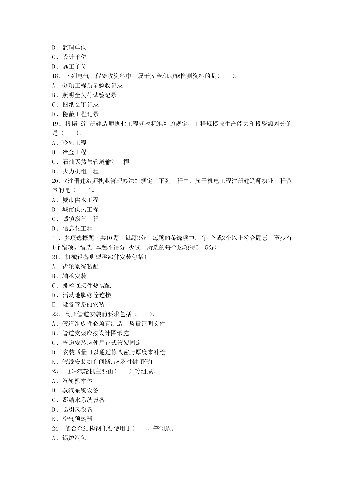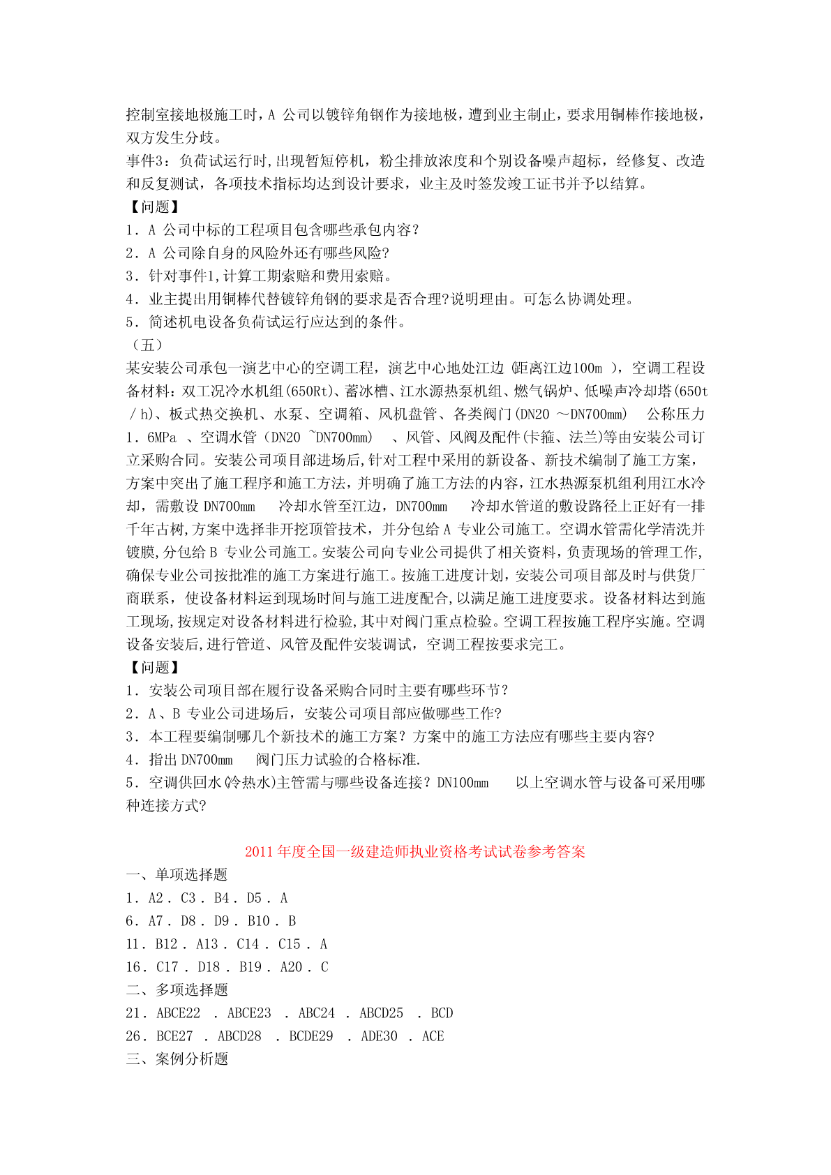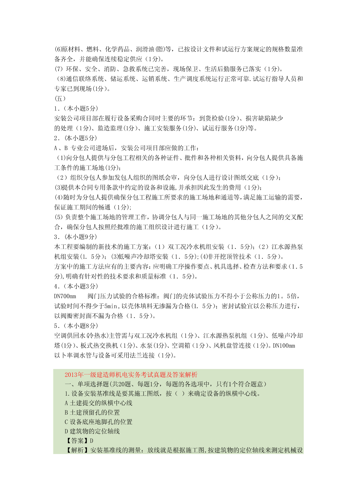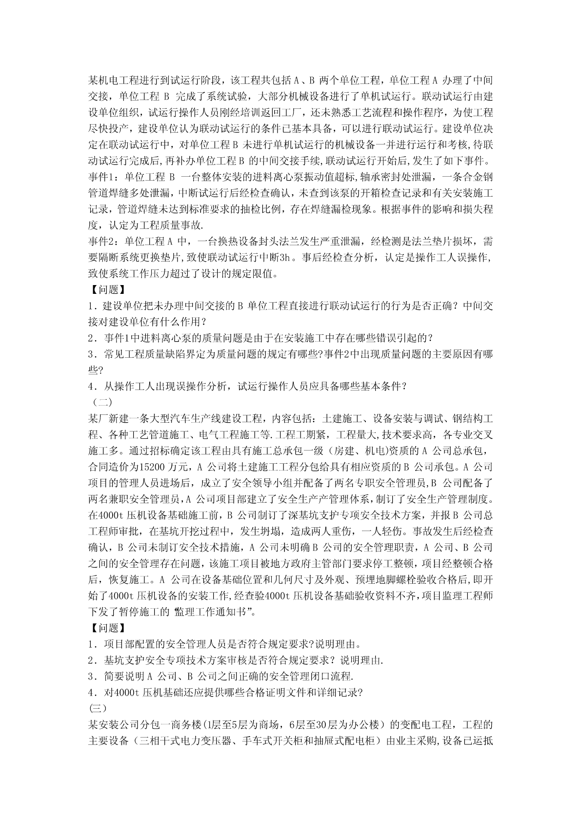 2011年一级建造师机电工程真题及答案一、单项选择题(共20题,每题1分。每题的备选项中,只有1个最符合题意)1.在输配电线路勘测定位时,要确定().A.各处杆塔型号B.杆塔组立方法C.立杆方式D.杆身调整程序2.影响机械设备安装精度的因素不包括()。A.设备测量基准的选择B.设备制造的质量C.设备基础的硬度D.设备安装环境3.金属储罐罐底的中幅板搭接接头焊接时,控制焊接变形的主要工艺措施之一是()。A.先焊长焊缝B.初层焊道采用分段退焊或跳焊法C.焊工均匀分布,对称施焊D.沿同一方向进行分段焊接4.单台仪表的校准点应在仪表全量程范围内均匀选择,一般不应少于()点。A.2B.3C.4D.55.易受化工大气、海洋大气腐蚀的石油储罐表面进行喷砂前应采用()。A.高压洁净水冲洗B.碱液清除处理C.有机溶剂清除处理D.蒸汽冲洗6.下列设备中,属于机械通用设备的是()。A.压缩机B.桥式起重机C.锅炉D.汽轮机7.玻璃纤维复合风管适用于()。A.洁净空调系统B.酸性环境空调系统C.有机溶剂空调系统D.中压以下空调系统8.机电工程厂房(车间、站)基础施工中,测量的重点是()。A.混凝土杯形基础B.混凝土柱子基础及柱身C.平台施工D.钢柱基础9.预防焊接变形的装配工艺措施是().A.合理选择焊缝尺寸和形状B.合理选择装配程序C.合理安排焊缝位置D.合理的焊接顺序和方向10.综合考虑各种因素,大型储罐选择()基础较为妥当。A.联合B.垫层C.沉井D.框架式11.建筑电气工程布线系统敷设,暗敷导管在土建模板拆除后的紧后工序是()。A.导管穿线B.清理管口及扫管C.敷设电缆D.绝缘检查12.关于高层建筑管道安装的避让原则的说法,正确的是()。A.给水管让排水管B.大管让小管C.水管让电缆套管D.钢质管让塑料管13.关于通风空调风管安装技术要求的说法,正确的是()。A.风口、阀门处要设置支、吊架加固补强B.当管线穿过风管时,要注意穿过部位的密封处理C.风管与风机连接处,应采用柔性短管连接D.室外立管的固定拉索可依就近原则固定在避雷引下线上14.下列场所的消防工程中,应该向公安消防机构申请消防设计审核的是()。A.建筑面积为15000m2的展览馆B.建筑面积为13000m2的客运车站C.建筑面积为12000m2的饭店D.建筑面积为10000m2的会堂15.衡量计量器具质量的主要指标是()。A.灵敏度、分辨率、动态特性B.稳定度、准确度、静态特性C.动态特性、分辨率、精密度D.统一性、溯源性、准确度16.按压力管道安装许可类别及级别划分,燃气管道属于()。A.工业管道B.油气管道C.公用管道D.动力管道17.工业安装工程中,分部分项工程质量验收记录的检查评定结论由()编写。A.建设单位B.监理单位C.设计单位D.施工单位18.下列电气工程验收资料中,属于安全和功能检测资料的是()。A.分项工程质量验收记录B.照明全负荷试验记录C.图纸会审记录D.隐蔽工程记录19.根据《注册建造师执业工程规模标准》的规定,工程规模按生产能力和投资额划分的是().A.冷轧工程B.冶金工程C.石油天然气管道输油工程D.火力机组工程20.《注册建造师执业管理办法》规定,下列工程中,属于机电工程注册建造师执业工程范围的是()。A.城市供水工程B.城市供热工程C.城镇燃气工程D.信息化工程二、多项选择题(共10题,每题2分。每题的备选项中,有2个或2个以上符合题意,至少有1个错项。错选,本题不得分;少选,所选的每个选项得0.5分)21.机械设备典型零部件安装包括()。A.齿轮系统装配B.轴承安装C.螺栓连接件热装配D.活动地脚螺栓连接E.设备管路的安装22.高压管道安装的要求包括().A.管道组成件必须有制造厂质量证明文件B.管道支架应按设计图纸施工C.管道安装应使用正式管架固定D.安装质量可以通过修改密封厚度来补偿E.管线安装如有间断,应及时封闭管口23.电站汽轮机主要由()等组成。A.汽轮机本体B.蒸汽系统设备C.凝结水系统设备D.送引风设备E.空气预热器24.低合金结构钢主要使用于()等制造。A.锅炉汽包B.压力容器C.起重机轨道D.压力管道E.高强螺栓25.在起重工程的设计中,计算载荷主要考虑()。A.静载系数B.动载系数C.设备及索吊具重量D.不均衡栽荷系数E.均匀栽荷系数26.焊接完成后,对焊缝质量的致密性试验可以选用的方法有()。A.强度试验B.气密性试验C.