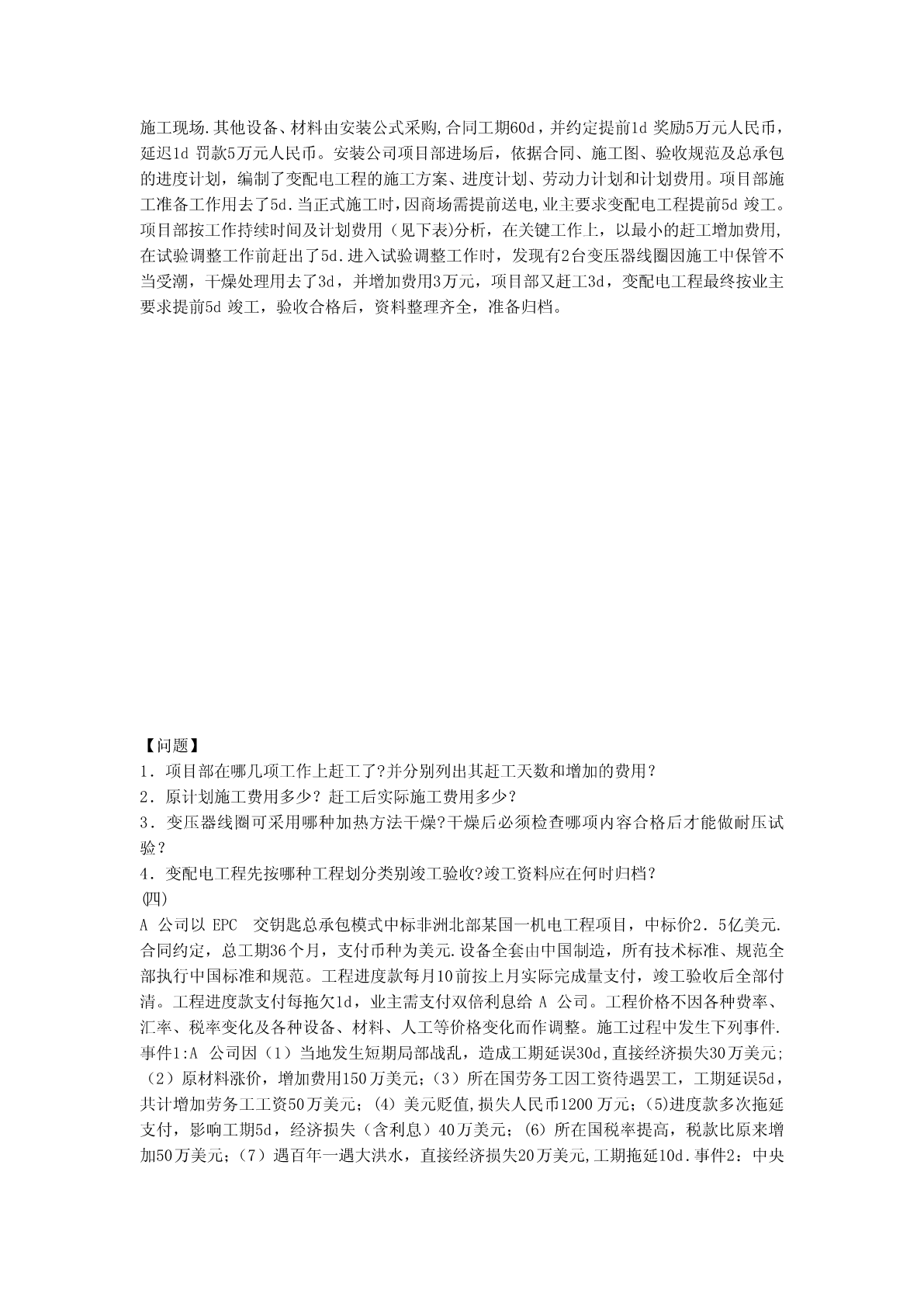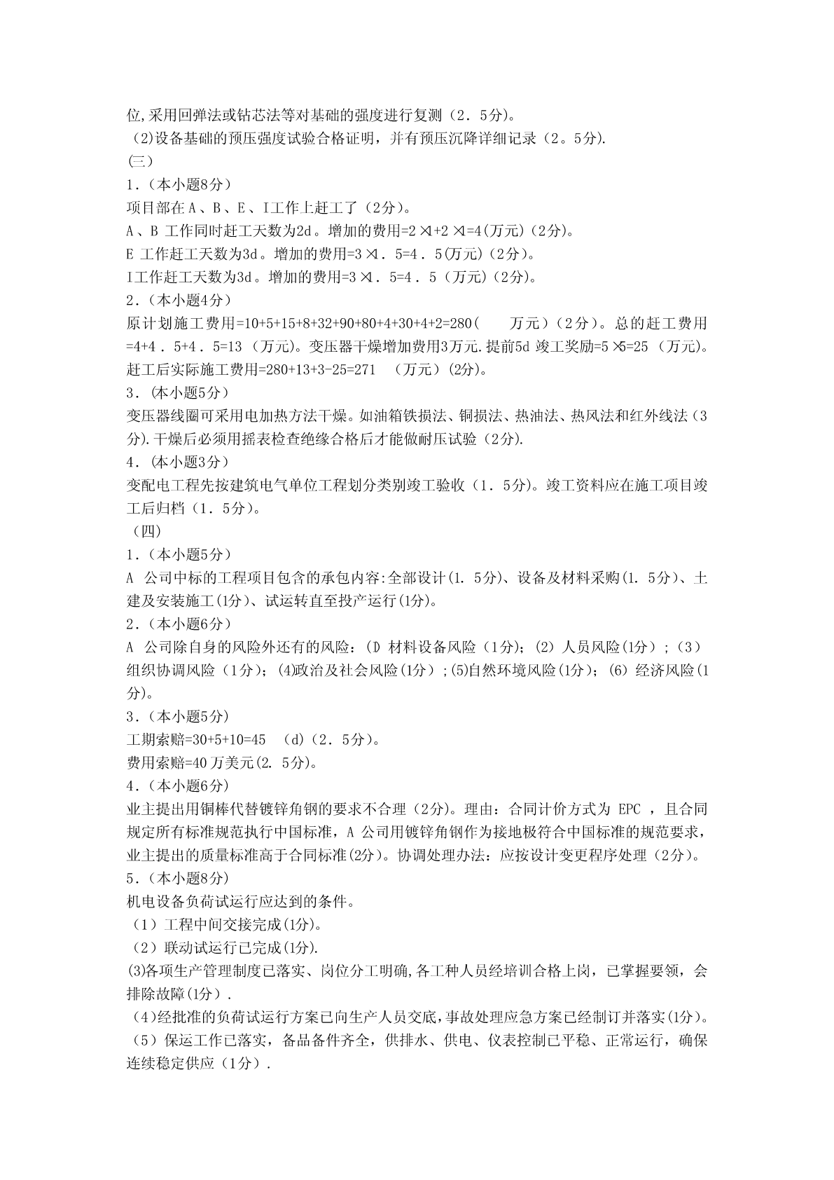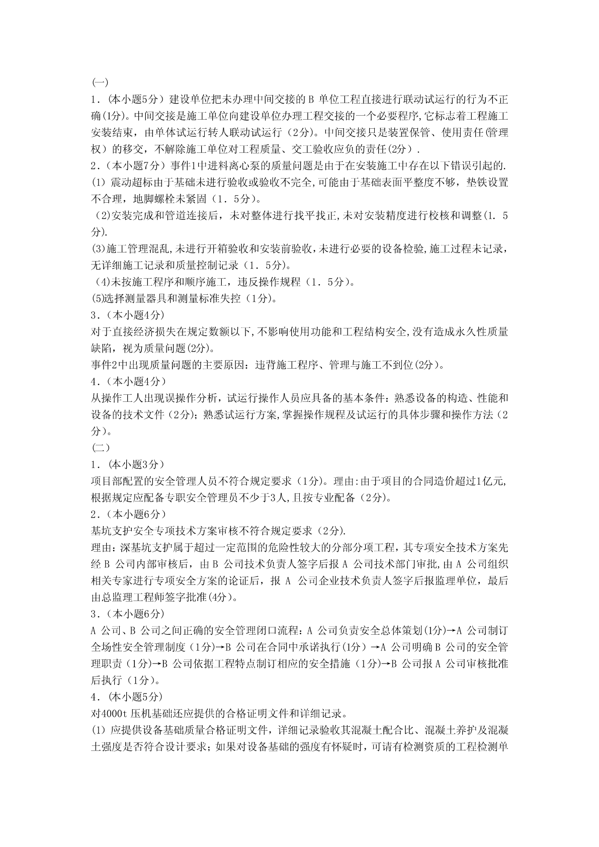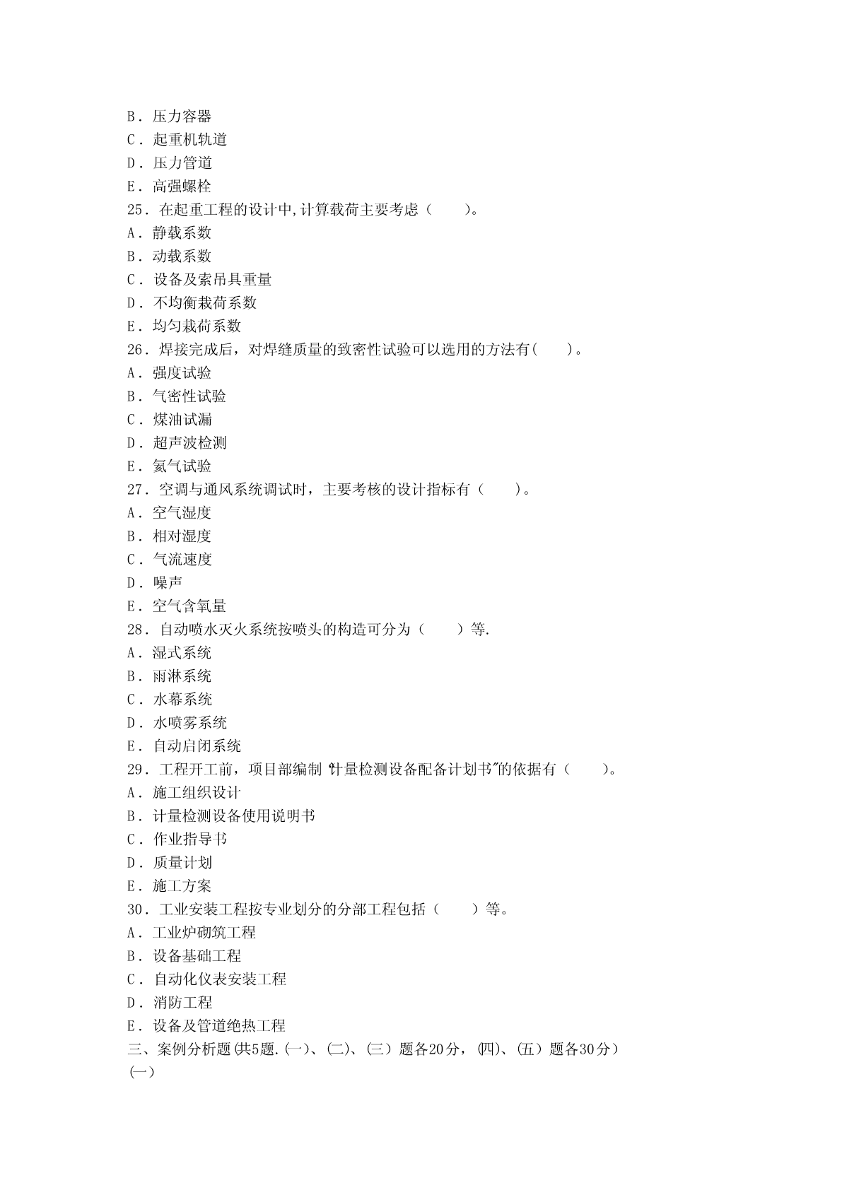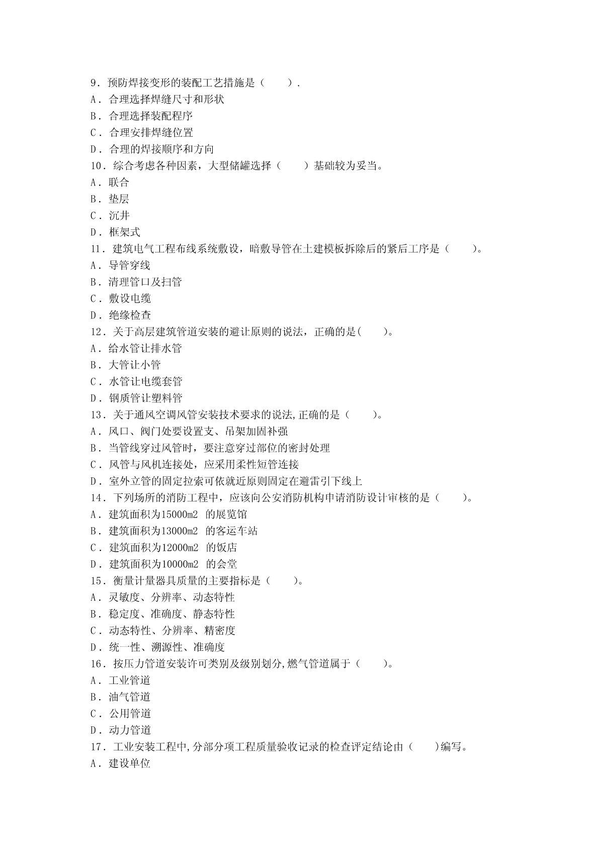 2011年一级建造师机电工程真题及答案一、单项选择题(共20题,每题1分。每题的备选项中,只有1个最符合题意)1.在输配电线路勘测定位时,要确定().A.各处杆塔型号B.杆塔组立方法C.立杆方式D.杆身调整程序2.影响机械设备安装精度的因素不包括()。A.设备测量基准的选择B.设备制造的质量C.设备基础的硬度D.设备安装环境3.金属储罐罐底的中幅板搭接接头焊接时,控制焊接变形的主要工艺措施之一是()。A.先焊长焊缝B.初层焊道采用分段退焊或跳焊法C.焊工均匀分布,对称施焊D.沿同一方向进行分段焊接4.单台仪表的校准点应在仪表全量程范围内均匀选择,一般不应少于()点。A.2B.3C.4D.55.易受化工大气、海洋大气腐蚀的石油储罐表面进行喷砂前应采用()。A.高压洁净水冲洗B.碱液清除处理C.有机溶剂清除处理D.蒸汽冲洗6.下列设备中,属于机械通用设备的是()。A.压缩机B.桥式起重机C.锅炉D.汽轮机7.玻璃纤维复合风管适用于()。A.洁净空调系统B.酸性环境空调系统C.有机溶剂空调系统D.中压以下空调系统8.机电工程厂房(车间、站)基础施工中,测量的重点是()。A.混凝土杯形基础B.混凝土柱子基础及柱身C.平台施工D.钢柱基础9.预防焊接变形的装配工艺措施是().A.合理选择焊缝尺寸和形状B.合理选择装配程序C.合理安排焊缝位置D.合理的焊接顺序和方向10.综合考虑各种因素,大型储罐选择()基础较为妥当。A.联合B.垫层C.沉井D.框架式11.建筑电气工程布线系统敷设,暗敷导管在土建模板拆除后的紧后工序是()。A.导管穿线B.清理管口及扫管C.敷设电缆D.绝缘检查12.关于高层建筑管道安装的避让原则的说法,正确的是()。A.给水管让排水管B.大管让小管C.水管让电缆套管D.钢质管让塑料管13.关于通风空调风管安装技术要求的说法,正确的是()。A.风口、阀门处要设置支、吊架加固补强B.当管线穿过风管时,要注意穿过部位的密封处理C.风管与风机连接处,应采用柔性短管连接D.室外立管的固定拉索可依就近原则固定在避雷引下线上14.下列场所的消防工程中,应该向公安消防机构申请消防设计审核的是()。A.建筑面积为15000m2的展览馆B.建筑面积为13000m2的客运车站C.建筑面积为12000m2的饭店D.建筑面积为10000m2的会堂15.衡量计量器具质量的主要指标是()。A.灵敏度、分辨率、动态特性B.稳定度、准确度、静态特性C.动态特性、分辨率、精密度D.统一性、溯源性、准确度16.按压力管道安装许可类别及级别划分,燃气管道属于()。A.工业管道B.油气管道C.公用管道D.动力管道17.工业安装工程中,分部分项工程质量验收记录的检查评定结论由()编写。A.建设单位B.监理单位C.设计单位D.施工单位18.下列电气工程验收资料中,属于安全和功能检测资料的是()。A.分项工程质量验收记录B.照明全负荷试验记录C.图纸会审记录D.隐蔽工程记录19.根据《注册建造师执业工程规模标准》的规定,工程规模按生产能力和投资额划分的是().A.冷轧工程B.冶金工程C.石油天然气管道输油工程D.火力机组工程20.《注册建造师执业管理办法》规定,下列工程中,属于机电工程注册建造师执业工程范围的是()。A.城市供水工程B.城市供热工程C.城镇燃气工程D.信息化工程二、多项选择题(共10题,每题2分。每题的备选项中,有2个或2个以上符合题意,至少有1个错项。错选,本题不得分;少选,所选的每个选项得0.5分)21.机械设备典型零部件安装包括()。A.齿轮系统装配B.轴承安装C.螺栓连接件热装配D.活动地脚螺栓连接E.设备管路的安装22.高压管道安装的要求包括().A.管道组成件必须有制造厂质量证明文件B.管道支架应按设计图纸施工C.管道安装应使用正式管架固定D.安装质量可以通过修改密封厚度来补偿E.管线安装如有间断,应及时封闭管口23.电站汽轮机主要由()等组成。A.汽轮机本体B.蒸汽系统设备C.凝结水系统设备D.送引风设备E.空气预热器24.低合金结构钢主要使用于()等制造。A.锅炉汽包B.压力容器C.起重机轨道D.压力管道E.高强螺栓25.在起重工程的设计中,计算载荷主要考虑()。A.静载系数B.动载系数C.设备及索吊具重量D.不均衡栽荷系数E.均匀栽荷系数26.焊接完成后,对焊缝质量的致密性试验可以选用的方法有()。A.强度试验B.气密性试验C.
