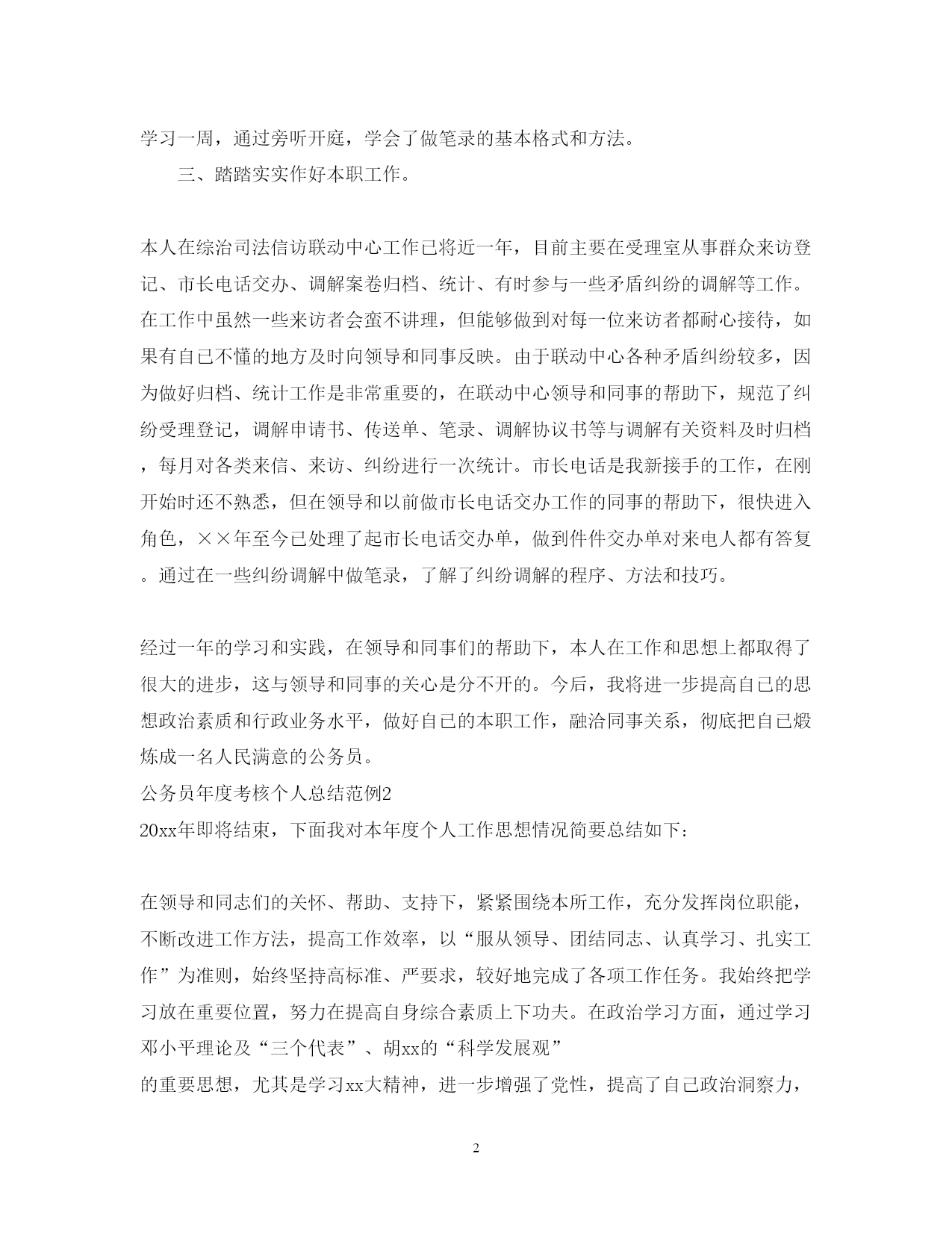 此资料由网络收集而来,如有侵权请告知上传者立即删除。资料共分享,我们负责传递知识。PAGEPAGE4公务员年度考核个人总结范例丰收的201x年已经过去了,富有挑战性的201x年已经来到了。年度考核个人总结写好了吗?下面是小编搜集整理的公务员年度考核个人总结范例,欢迎阅读。公务员年度考核个人总结范例1作为一名初初任公务员,我于××年月荣幸地来到某某街道综治司法信访联动中心工作。一年来,在各位领导的关心、支持、鼓励和各位同事的热情帮助下,我的思想认识和行政工作能力有了很大的进步,顺利地完成了从一名学生到一名公务员的角色转变。一、学习大量的政治理论知识。由于以前在学校学的是初等教育专业,因此对政治理论的学习相对较少,而现在作为一名公务员,具备良好的政治理论修养是必须的。某某街道有着浓厚的政治理论学习氛围,在这一年中,我在街道领导的带领下学习了“三个代表”重要思想,党的xx大、xx届四中全会精神,同时自学了《马克思主义哲学》、《毛泽东思想》。经过学习,我的政治理论修养有了很大的进步。二、积极学习业务知识,理论联系实际,。由于以前没有从事过综治、司法和信访之类的工作,自身对法律、政策的了解还停留在比较表面的阶段,因此我努力学习相关法律、政策方面的东西,并报了市委党校的法律专业本科班。在工作中有不懂的地方虚心地向领导和同事请教,刚开始工作时还有点生疏,对于工作的一些程序并不了解,但在他们的帮助下使我对工作程序开始慢慢熟悉。去年月份,在某某市委党校参加了为期一个月的初任公务员培训,使自已进一步了解公务员这一职业的特殊性,具备从事公务员这一职务所需的基本知识和基本技能。为更好地从事这一职业打下良好基础。今年初在某某法院民庭学习一周,通过旁听开庭,学会了做笔录的基本格式和方法。三、踏踏实实作好本职工作。本人在综治司法信访联动中心工作已将近一年,目前主要在受理室从事群众来访登记、市长电话交办、调解案卷归档、统计、有时参与一些矛盾纠纷的调解等工作。在工作中虽然一些来访者会蛮不讲理,但能够做到对每一位来访者都耐心接待,如果有自已不懂的地方及时向领导和同事反映。由于联动中心各种矛盾纠纷较多,因为做好归档、统计工作是非常重要的,在联动中心领导和同事的帮助下,规范了纠纷受理登记,调解申请书、传送单、笔录、调解协议书等与调解有关资料及时归档,每月对各类来信、来访、纠纷进行一次统计。市长电话是我新接手的工作,在刚开始时还不熟悉,但在领导和以前做市长电话交办工作的同事的帮助下,很快进入角色,××年至今已处理了起市长电话交办单,做到件件交办单对来电人都有答复。通过在一些纠纷调解中做笔录,了解了纠纷调解的程序、方法和技巧。经过一年的学习和实践,在领导和同事们的帮助下,本人在工作和思想上都取得了很大的进步,这与领导和同事的关心是分不开的。今后,我将进一步提高自已的思想政治素质和行政业务水平,做好自已的本职工作,融洽同事关系,彻底把自已煅炼成一名人民满意的公务员。公务员年度考核个人总结范例220xx年即将结束,下面我对本年度个人工作思想情况简要总结如下:在领导和同志们的关怀、帮助、支持下,紧紧围绕本所工作,充分发挥岗位职能,不断改进工作方法,提高工作效率,以“服从领导、团结同志、认真学习、扎实工作”为准则,始终坚持高标准、严要求,较好地完成了各项工作任务。我始终把学习放在重要位置,努力在提高自身综合素质上下功夫。在政治学习方面,通过学习邓小平理论及“三个代表”、胡xx的“科学发展观”的重要思想,尤其是学习xx大精神,进一步增强了党性,提高了自己政治洞察力,牢固树立了全心全意为人民服务的宗旨和正确的世界观、人生观、价值观。一、一年来的工作表现(一)强化形象,提高自身素质。为做好督查工作,我坚持严格要求自己,注重以身作则,以诚待人,一是爱岗敬业讲奉献。,我正确认识自身的工作和价值,正确处理苦与乐,得与失、个人利益和集体利益的关系,坚持甘于奉献、诚实敬业,二是锤炼业务讲提高。经过学习和锻炼,自己在文字功夫上取得一定的进步,撰写简报5篇,利用办公室学习资料,细心学习他人长处,改掉自己不足,并虚心向领导、同事请教,在不断学习和探索中使自己在文字材料上有所提高。(二)严于律已,不断加强作风建设。一年来我对自身严格要求,始终把耐得平淡、舍得付出、默默无闻作为自己的准则,始终把作风建设的重点放在严谨、细致、扎实、求实脚踏实地埋头苦干上。在工作中,以制度、纪律规范自己的一切言行,严格遵守机关各项规章制度,尊重领导,团结同志,谦虚谨慎,主动接受来自各方面的意见,不断改进工作;坚持做到不利于工商形象的事不做,不利于工商形象的话不说,积极维护工商部门的良好形象。(三)强化职能,做好服务工作。工作中,我注重把握根本,努力提高服务水平。办公室人