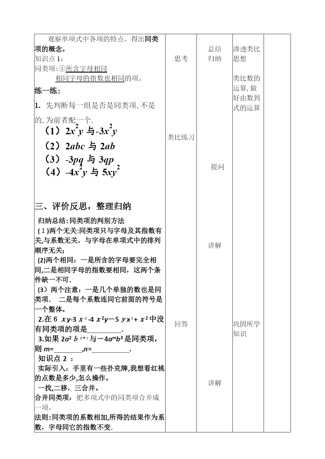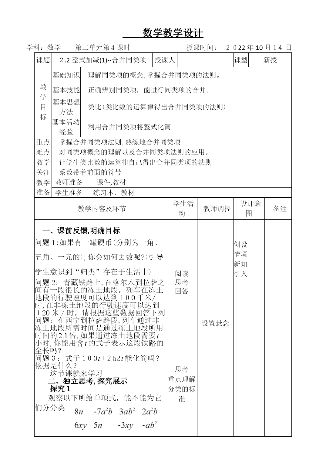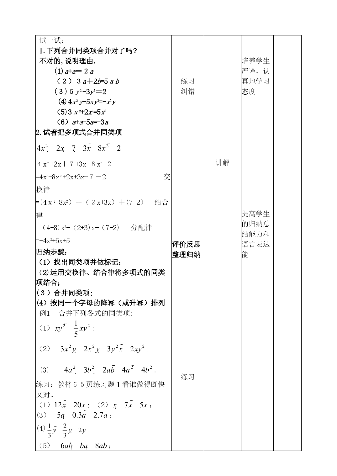 PAGE数学教学设计学科:数学第二单元第4课时授课时间:2022年10月14日课题2.2整式加减(1)--合并同类项授课人课型新授教学目标基础知识理解同类项的概念,掌握合并同类项的法则。基本技能正确辨别同类项,能进行同类项的合并。基本思想方法类比(类比数的运算律得出合并同类项的法则)基本活动经验利用合并同类项将整式化简重点掌握合并同类项法则,熟练地合并同类项难点对同类项概念的理解以及合并同类项法则的应用。教学关注让学生类比数的运算律自己得出合并同类项的法则系数带着前面的符号教学准备教师准备课件,教材学生准备练习本,教材教学内容及环节学生活动教师调控设计意图备注一、课前反馈,明确目标问题1:如果有一罐硬币(分别为一角、五角、一元的),你会如何去数呢?(引导学生意识到“归类”存在于生活中)问题2:青藏铁路上,在格尔木到拉萨之间有一段很长的冻土地段。列车在冻土地段的行驶速度可以达到100千米/时,在非冻土地段的行驶速度可以达到120米/时,请根据这些数据回答下列问题:在西宁到拉萨路段,列车通过非冻土地段所需时间是通过冻土地段所用时间的倍,如果通过冻土地段需要小时,你能用含的式子表示这段铁路的全长吗?问题3:式子100+252能化简吗?依据是什么?这节课就来学习二、独立思考,探究展示探究1观察以下所给单项式,能不能为它们分分类观察单项式中各项的特点,得出同类项的概念。知识点1:同类项:=1\*GB3①所含字母相同=2\*GB3②相同字母的指数也相同的项。练一练:(3)-3pq与3qp(1)2x2y与-3x2y(2)2abc与2ab(4)-4x2y与5xy21.先判断每一组是否是同类项,不是的,为前者配一个.三、评价反思,整理归纳归纳总结:同类项的判别方法(1)两个无关:同类项只与字母及其指数有关,与系数无关,与字母在单项式中的排列顺序无关;(2)两个相同:一是所含的字母要完全相同,二是相同字母的指数要相同,这两个条件缺一不可.(3)两个注意:一是几个单独的数也是同类项.二是每个系数连同它前面的符号是一个整体。2.在6xy-3x2-4x2y-5yx2+x2中没有同类项的项是.3.如果2a2bn+1与-4amb3是同类项,则m=,n=.知识点2:实际引入:手里有一些扑克牌,我想看红桃的点数是多少,怎么操作。一找,二移,三合并。合并同类项:把多项式中的同类项合并成一项。法则:同类项的系数相加,所得的结果作为系数,字母同它的指数不变.试一试:1.下列合并同类项合并对了吗?不对的,说明理由.(1)a+a=2a(2)3a+2b=5ab(3)5y2-3y2=2(4)4x2y-5xy2=-x2y(5)3x2+2x3=5x5(6)a+a-5a=-3a2.试着把多项式合并同类项4x2+2x+7+3x-8x2-2=4x2-8x2+2x+3x+7-2交换律=(4x2-8x2)+(2x+3x)+(7-2)结合律=(4-8)x2+(2+3)x+(7-2)分配律=-4x2+5x+5归纳步骤:(1)找出同类项并做标记;(2)运用交换律、结合律将多项式的同类项结合;(3)合并同类项;(4)按同一个字母的降幂(或升幂)排列合并下列各式的同类项:;;.练习:教材65页练习题1看谁做得既快又对。;(2);(3);(4);;.四、总结反馈,布置作业通过本节的学习,你最开心的是解决了些什么问题,又学到了什么知识?作业:《能力培养》阅读思考回答思考重点理解分类的标准思考类比练习回答练习纠错评价反思整理归纳练习学生总结设置悬念总结归纳提问讲解讲解讲解创设情境新知引入渗透类比思想类比数的运算,做好由数到式的运算巩固所学知识培养学生严谨、认真地学习态度提高学生的归纳总结能力和语言表达能板书设计2.2整式加减(1)概念例题习题课后反思围绕目标达成、教与学的方式、学校理念体现、课程资源的开发与利用等进行反思。