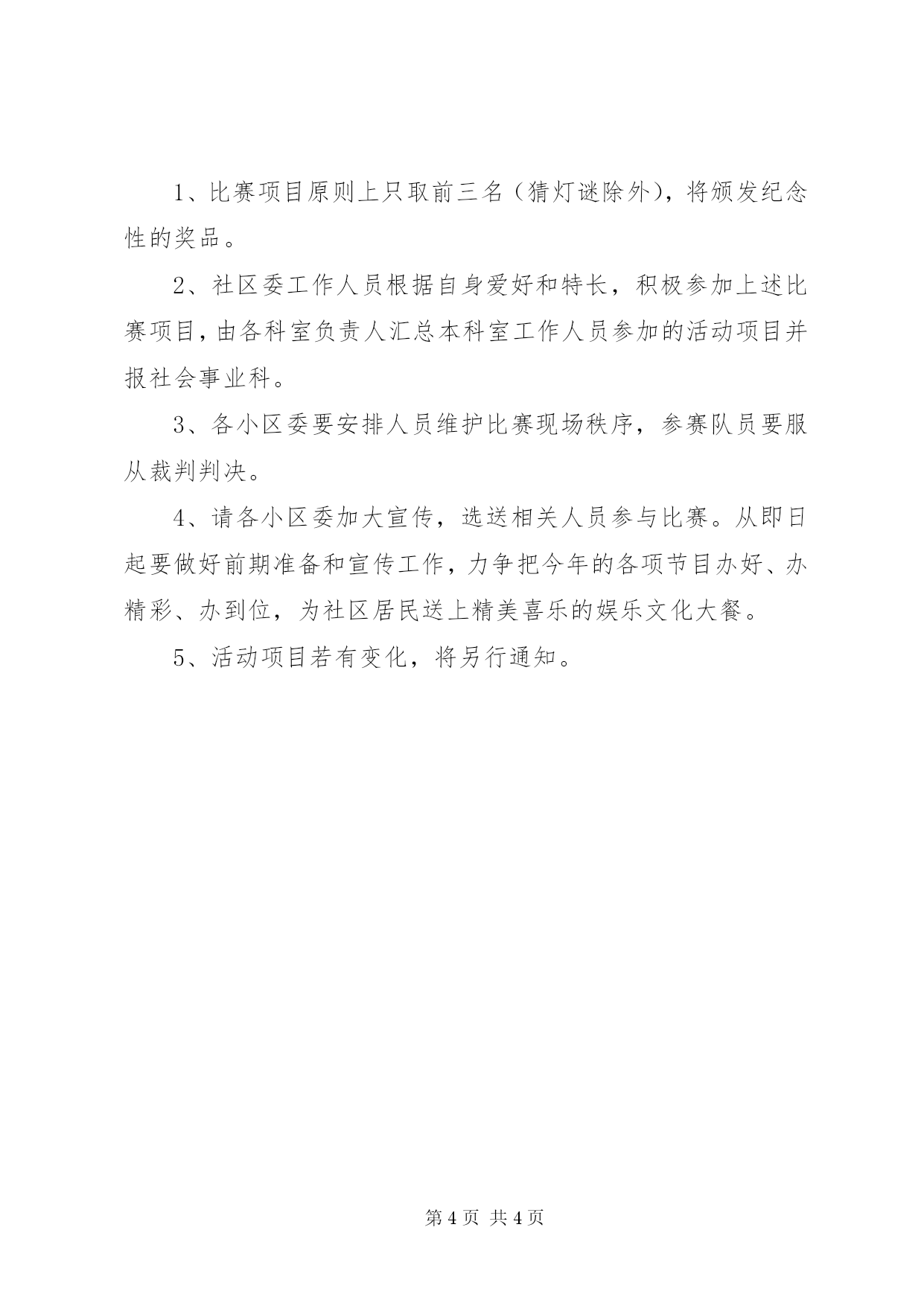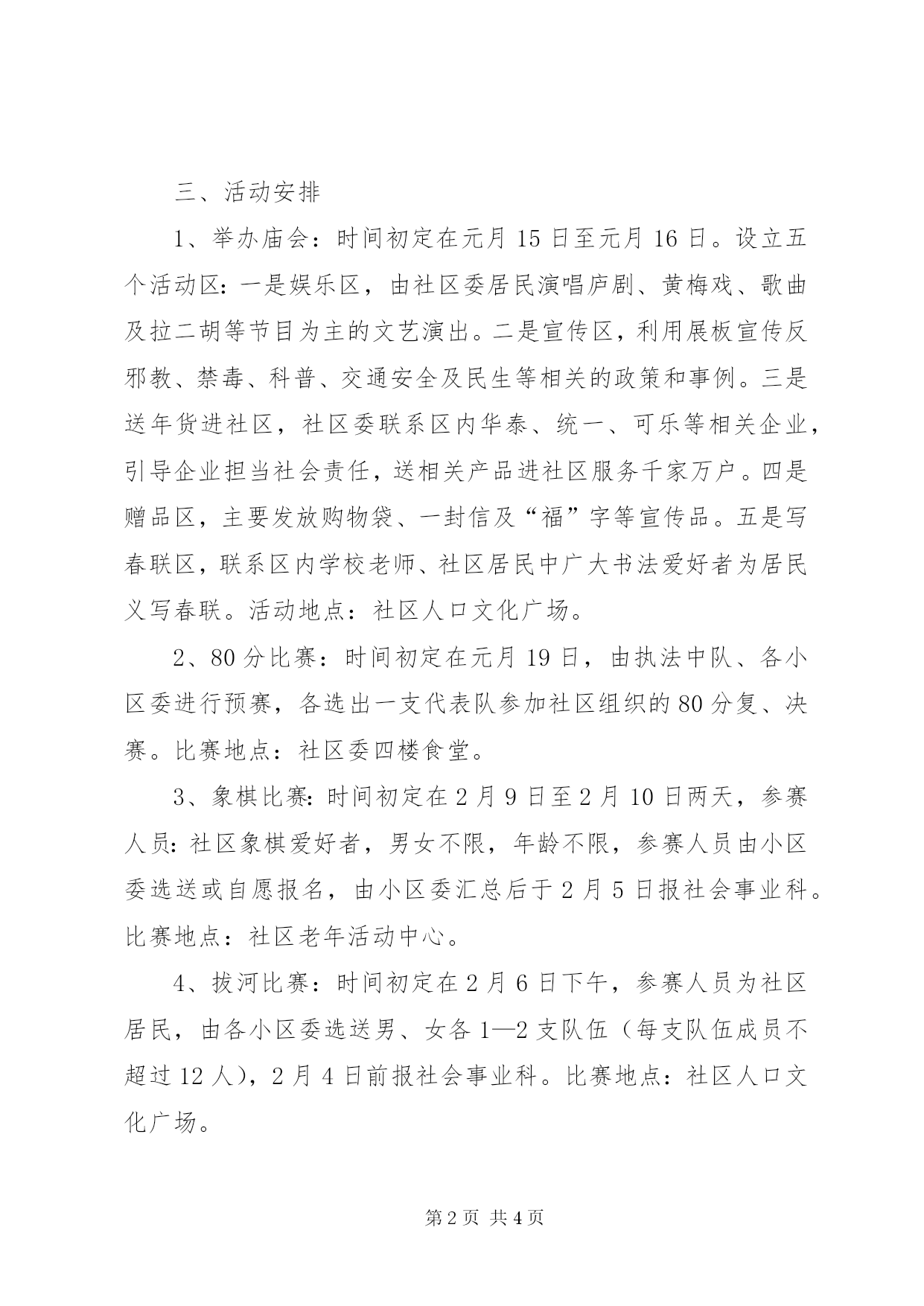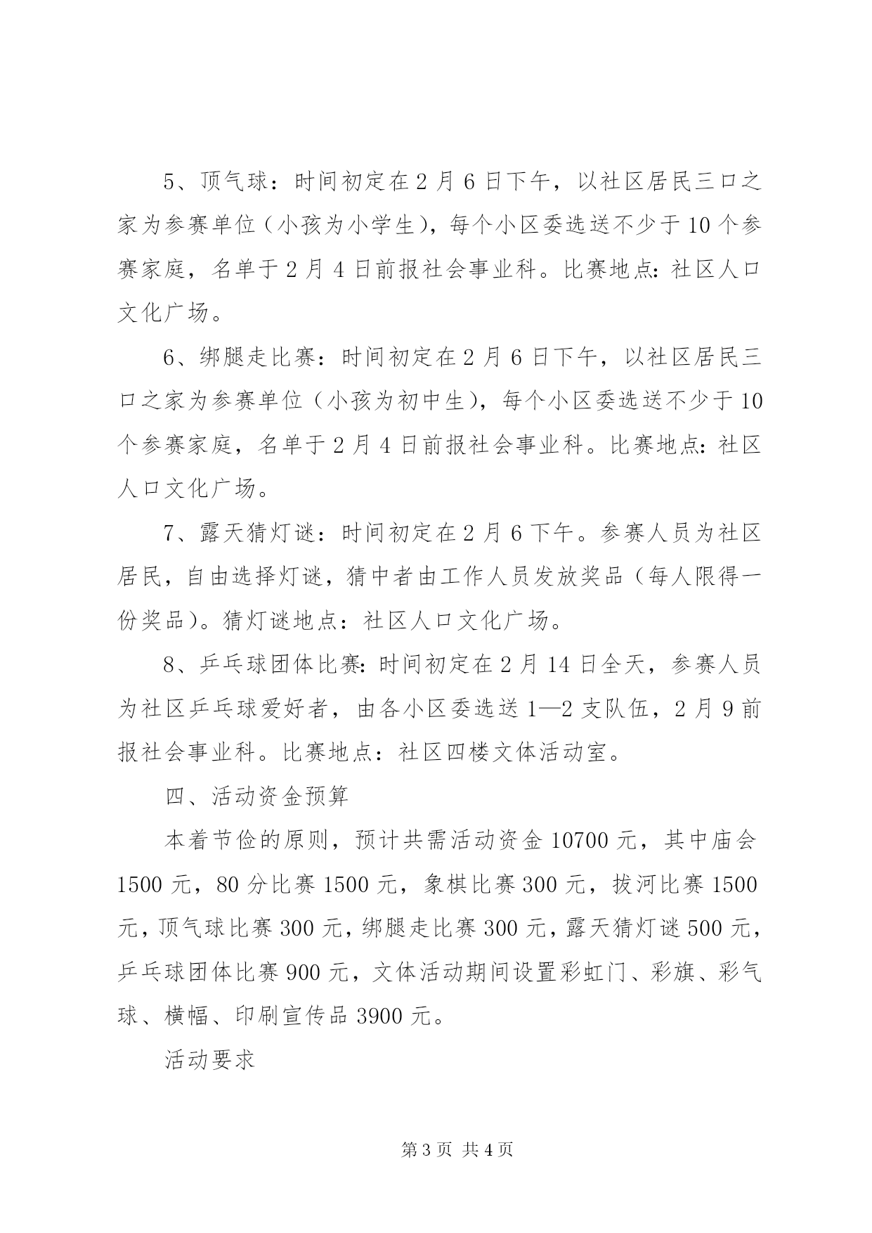 第PAGE\*Arabic\*MERGEFORMAT4页共NUMPAGES\*MERGEFORMAT4页社区春节活动方案天时人事日相催,冬至阳生春又来。为丰富社区居民的文化生活需求,愉悦身心,陶冶情操,搭建居民之间相互交流沟通平台,增进“邻里情”,增强社区的凝聚力、向心力,营造出一种团结奋进、文明和谐、喜庆祥和的浓郁氛围,按照区工委办的安排,结合社区实际,制定社区2010年春节期间文体活动方案。一、指导思想为深入践行“三个代表”重要思想,努力构建公共文化服务体系,为广大居民提供更多优质文化产品和文化服务,不断满足广大居民对文化生活的需求。全面落实科学发展观,贯彻落实党的十七大会议精神,始终把握社会主义先进文化方向,促进社区物质文明、政治文明和精神文明协调发展,全面建设和谐社区。二、组织领导为切实开展好社区的文体活动,成立社区2010年春节文体活动筹备组,组长为陈圣炜,副组长为徐祥忠、支云秀、胡正田、邹鹏,成员为聂祖国、吴君来、蔡圣法、王心友、李正保,筹备小组下设评委裁判组和后勤保障组,胡正田兼任裁判组组长,成员为吴永深、徐志军、黄寿余,支云秀兼任后勤保障组组长,成员为卫守才、孙跃华。评委裁判组负责策划、提供活动场地及制定、执行活动规则,后勤保障组负责提供比赛所用的器材及奖品等。三、活动安排1、举办庙会:时间初定在元月15日至元月16日。设立五个活动区:一是娱乐区,由社区委居民演唱庐剧、黄梅戏、歌曲及拉二胡等节目为主的文艺演出。二是宣传区,利用展板宣传反邪教、禁毒、科普、交通安全及民生等相关的政策和事例。三是送年货进社区,社区委联系区内华泰、统一、可乐等相关企业,引导企业担当社会责任,送相关产品进社区服务千家万户。四是赠品区,主要发放购物袋、一封信及“福”字等宣传品。五是写春联区,联系区内学校老师、社区居民中广大书法爱好者为居民义写春联。活动地点:社区人口文化广场。2、80分比赛:时间初定在元月19日,由执法中队、各小区委进行预赛,各选出一支代表队参加社区组织的80分复、决赛。比赛地点:社区委四楼食堂。3、象棋比赛:时间初定在2月9日至2月10日两天,参赛人员:社区象棋爱好者,男女不限,年龄不限,参赛人员由小区委选送或自愿报名,由小区委汇总后于2月5日报社会事业科。比赛地点:社区老年活动中心。4、拔河比赛:时间初定在2月6日下午,参赛人员为社区居民,由各小区委选送男、女各1—2支队伍(每支队伍成员不超过12人),2月4日前报社会事业科。比赛地点:社区人口文化广场。5、顶气球:时间初定在2月6日下午,以社区居民三口之家为参赛单位(小孩为小学生),每个小区委选送不少于10个参赛家庭,名单于2月4日前报社会事业科。比赛地点:社区人口文化广场。6、绑腿走比赛:时间初定在2月6日下午,以社区居民三口之家为参赛单位(小孩为初中生),每个小区委选送不少于10个参赛家庭,名单于2月4日前报社会事业科。比赛地点:社区人口文化广场。7、露天猜灯谜:时间初定在2月6下午。参赛人员为社区居民,自由选择灯谜,猜中者由工作人员发放奖品(每人限得一份奖品)。猜灯谜地点:社区人口文化广场。8、乒乓球团体比赛:时间初定在2月14日全天,参赛人员为社区乒乓球爱好者,由各小区委选送1—2支队伍,2月9前报社会事业科。比赛地点:社区四楼文体活动室。四、活动资金预算本着节俭的原则,预计共需活动资金10700元,其中庙会1500元,80分比赛1500元,象棋比赛300元,拔河比赛1500元,顶气球比赛300元,绑腿走比赛300元,露天猜灯谜500元,乒乓球团体比赛900元,文体活动期间设置彩虹门、彩旗、彩气球、横幅、印刷宣传品3900元。活动要求1、比赛项目原则上只取前三名(猜灯谜除外),将颁发纪念性的奖品。2、社区委工作人员根据自身爱好和特长,积极参加上述比赛项目,由各科室负责人汇总本科室工作人员参加的活动项目并报社会事业科。3、各小区委要安排人员维护比赛现场秩序,参赛队员要服从裁判判决。4、请各小区委加大宣传,选送相关人员参与比赛。从即日起要做好前期准备和宣传工作,力争把今年的各项节目办好、办精彩、办到位,为社区居民送上精美喜乐的娱乐文化大餐。5、活动项目若有变化,将另行通知。
