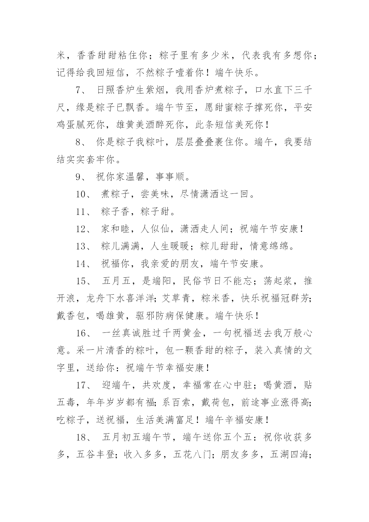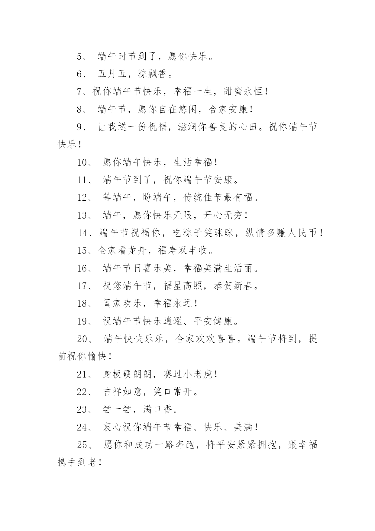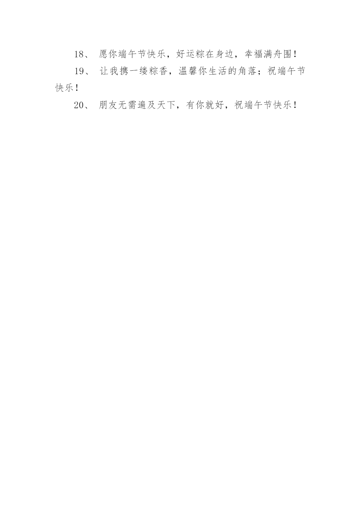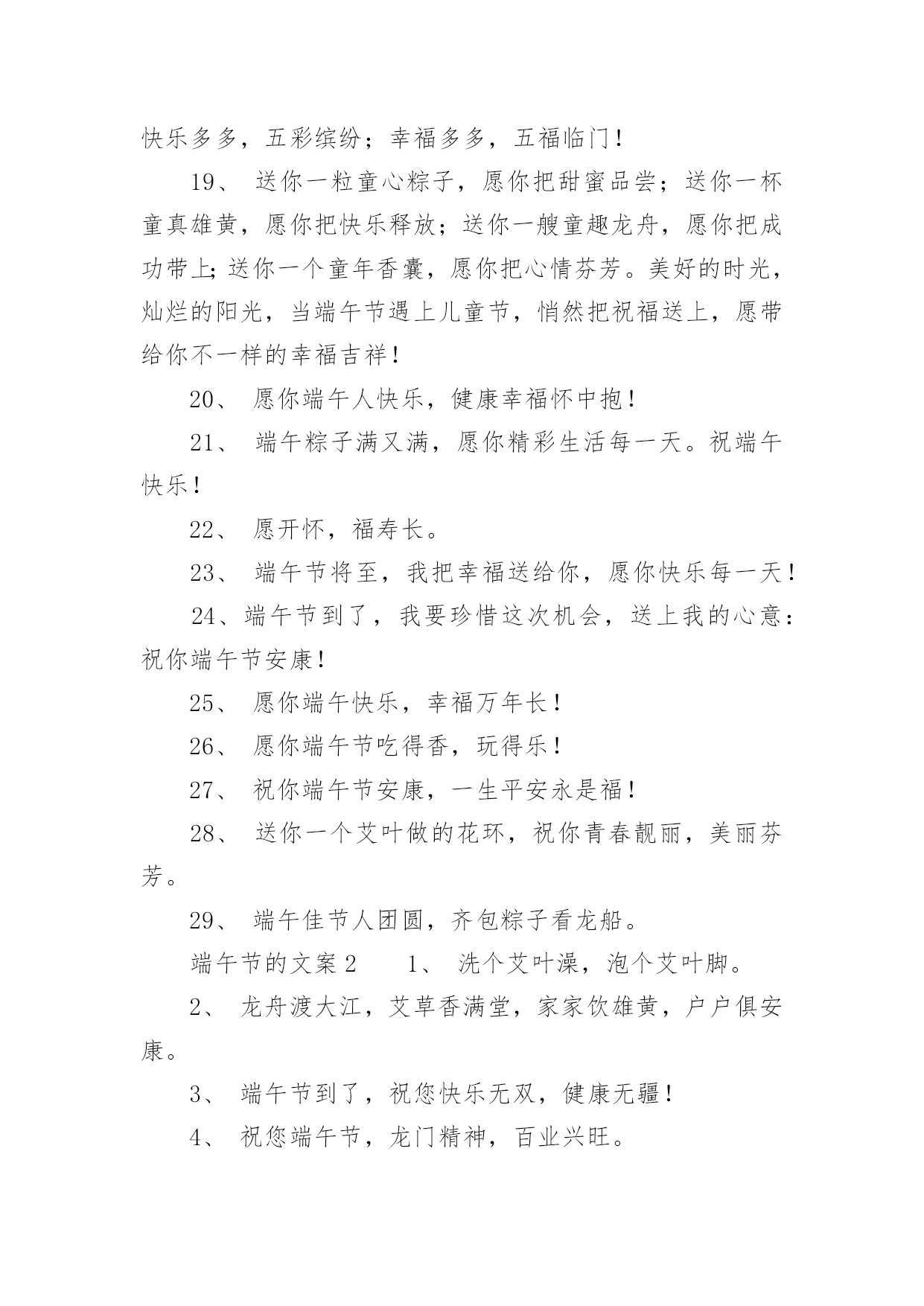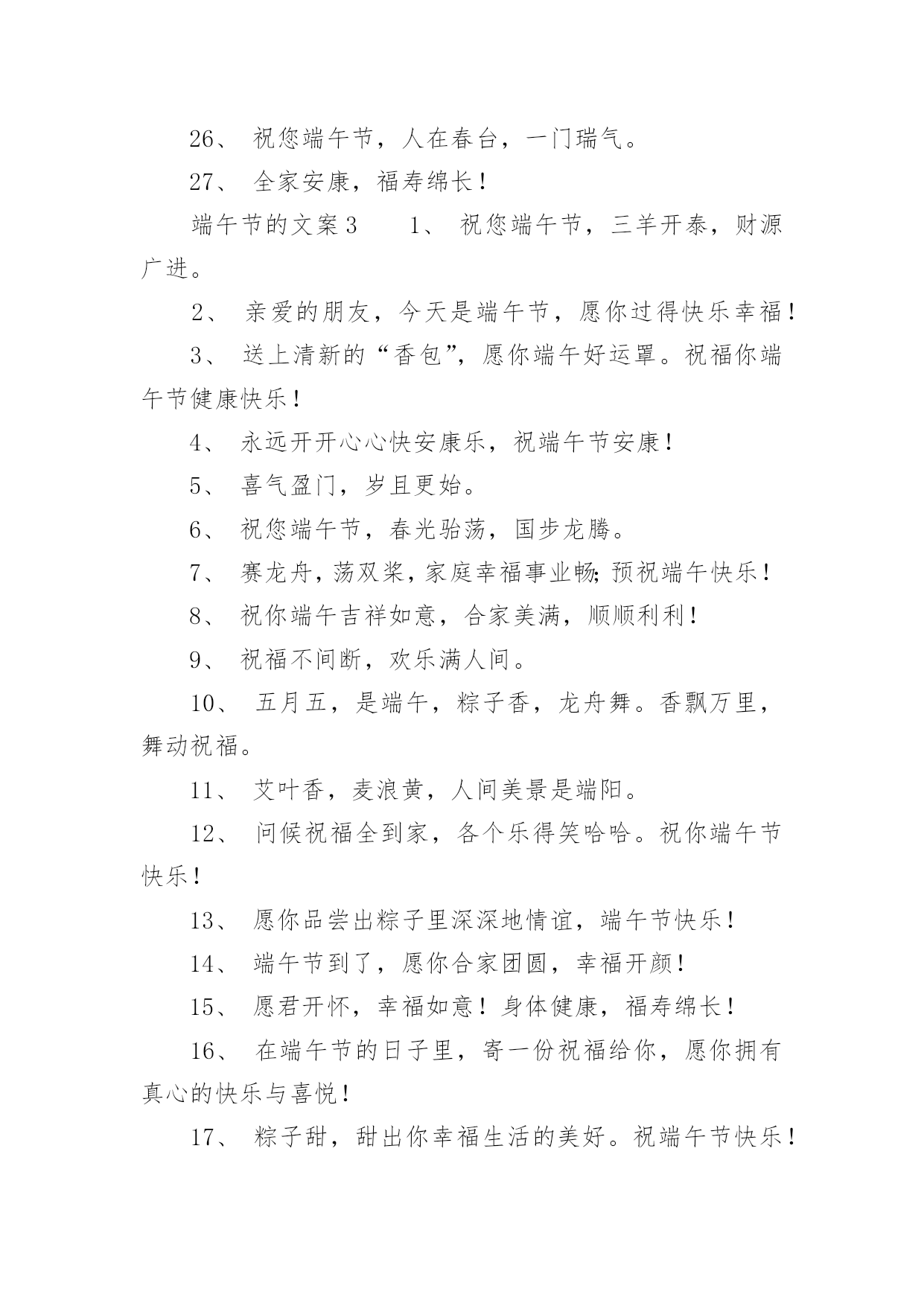 端午节的文案关于端午节的文案随着社交网络的普及,越来越多人热衷于在网上发布文案,文案用于分享自己的生活状态。你知道什么样的文案才是特别的吗?下面是小编帮大家整理的关于端午节的文案,欢迎阅读,希望大家能够喜欢。端午节的文案11、淡淡粽叶香,浓浓世间情;根根丝线连,切切情意牵。粽香千里,鹤起湖湘,衔粽而飞,用真诚的心把快乐平安幸福包成一个大粽子,送给你全家。端午快乐!2、送你一篮热气腾腾的.粽子:以温柔的叮咛做馅,宽厚的包容当叶,调以真诚的祝福,再用祈祷煮水,吃出一年好运气,一生好福气!端午节快乐!3、我的问候,没有华丽的外衣,没有甜蜜的辞藻,没有过度的包装,没有可爱的外形,但它有一颗粽子般热情的心。端午佳节,祝你节日快乐,合家欢聚!4、五月初五是端午,朋友祝福已上路。财神运财走水路,福神空降最神速,喜神报喜上大路,惊喜连连在端午,爱神变出浪漫屋,幸运之神心中驻!5、端午端午,端起了快乐,舞走了烦恼;端起了清闲,舞走了忙碌;端起了幸福,舞走了无助。我祝你,快乐在端午!6、我是粽叶你是米,一层一层裹住你;你是牙齿我是米,香香甜甜粘住你;粽子里有多少米,代表我有多想你;记得给我回短信,不然粽子噎着你!端午快乐。7、日照香炉生紫烟,我用香炉煮粽子,口水直下三千尺,缘是粽子已飘香。端午节至,愿甜蜜粽子撑死你,平安鸡蛋腻死你,雄黄美酒醉死你,此条短信美死你!8、你是粽子我粽叶,层层叠叠裹住你。端午,我要结结实实套牢你。9、祝你家温馨,事事顺。10、煮粽子,尝美味,尽情潇洒这一回。11、粽子香,粽子甜。12、家和睦,人似仙,潇洒走人间;祝端午节安康!13、粽儿满满,人生暖暖;粽儿甜甜,情意绵绵。14、祝福你,我亲爱的朋友,端午节安康。15、五月五,是端阳,民俗节日不能忘;荡起浆,推开浪,龙舟下水喜洋洋;艾草青,粽米香,快乐祝福冠群芳;戴香包,喝雄黄,驱邪防病保健康。端午快乐!16、一丝真诚胜过千两黄金,一句祝福送去我万般心意。采一片清香的粽叶,包一颗香甜的粽子,装入真情的文字里,送给你:祝端午节幸福安康!17、迎端午,共欢度,幸福常在心中驻;喝黄酒,贴五毒,年年岁岁都有福;系百索,戴荷包,前途事业涨得高;吃粽子,送祝福,生活美满富足!端午辛福安康!18、五月初五端午节,端午送你五个五:祝你收获多多,五谷丰登;收入多多,五花八门;朋友多多,五湖四海;快乐多多,五彩缤纷;幸福多多,五福临门!19、送你一粒童心粽子,愿你把甜蜜品尝;送你一杯童真雄黄,愿你把快乐释放;送你一艘童趣龙舟,愿你把成功带上;送你一个童年香囊,愿你把心情芬芳。美好的时光,灿烂的阳光,当端午节遇上儿童节,悄然把祝福送上,愿带给你不一样的幸福吉祥!20、愿你端午人快乐,健康幸福怀中抱!21、端午粽子满又满,愿你精彩生活每一天。祝端午快乐!22、愿开怀,福寿长。23、端午节将至,我把幸福送给你,愿你快乐每一天!24、端午节到了,我要珍惜这次机会,送上我的心意:祝你端午节安康!25、愿你端午快乐,幸福万年长!26、愿你端午节吃得香,玩得乐!27、祝你端午节安康,一生平安永是福!28、送你一个艾叶做的花环,祝你青春靓丽,美丽芬芳。29、端午佳节人团圆,齐包粽子看龙船。端午节的文案21、洗个艾叶澡,泡个艾叶脚。2、龙舟渡大江,艾草香满堂,家家饮雄黄,户户俱安康。3、端午节到了,祝您快乐无双,健康无疆!4、祝您端午节,龙门精神,百业兴旺。5、端午时节到了,愿你快乐。6、五月五,粽飘香。7、祝你端午节快乐,幸福一生,甜蜜永恒!8、端午节,愿你自在悠闲,合家安康!9、让我送一份祝福,滋润你善良的心田。祝你端午节快乐!10、愿你端午快乐,生活幸福!11、端午节到了,祝你端午节安康。12、等端午,盼端午,传统佳节最有福。13、端午,愿你快乐无限,开心无穷!14、端午节祝福你,吃粽子笑眯眯,纵情多赚人民币!15、全家看龙舟,福寿双丰收。16、端午节日喜乐美,幸福美满生活丽。17、祝您端午节,福星高照,恭贺新春。18、阖家欢乐,幸福永远!19、祝端午节快乐逍遥、平安健康。20、端午快快乐乐,合家欢欢喜喜。端午节将到,提前祝你愉快!21、身板硬朗朗,赛过小老虎!22、吉祥如意,笑口常开。23、尝一尝,满口香。24、衷心祝你端午节幸福、快乐、美满!25、愿你和成功一路奔跑,将平安紧紧拥抱,跟幸福携手到老!26、祝您端午节,人在春台,一门瑞气。27、全家安康,福寿绵长!端午节的文案31、祝您端午节,三羊开泰,财源广进。2、亲爱的朋友,今天是端午节,愿你过得快乐幸福!3、送上清新的“香包”,愿你端午好运罩。祝福你端午节健康快乐!4、永远开开心心快安康乐,祝端午节安康!5、喜气盈门,岁且更始。6、祝您端午节,春光骀荡,国步龙腾。7、赛龙舟,荡双桨,家庭幸福事业畅;预祝端午快乐!8、祝你端午吉祥如意,合家美满