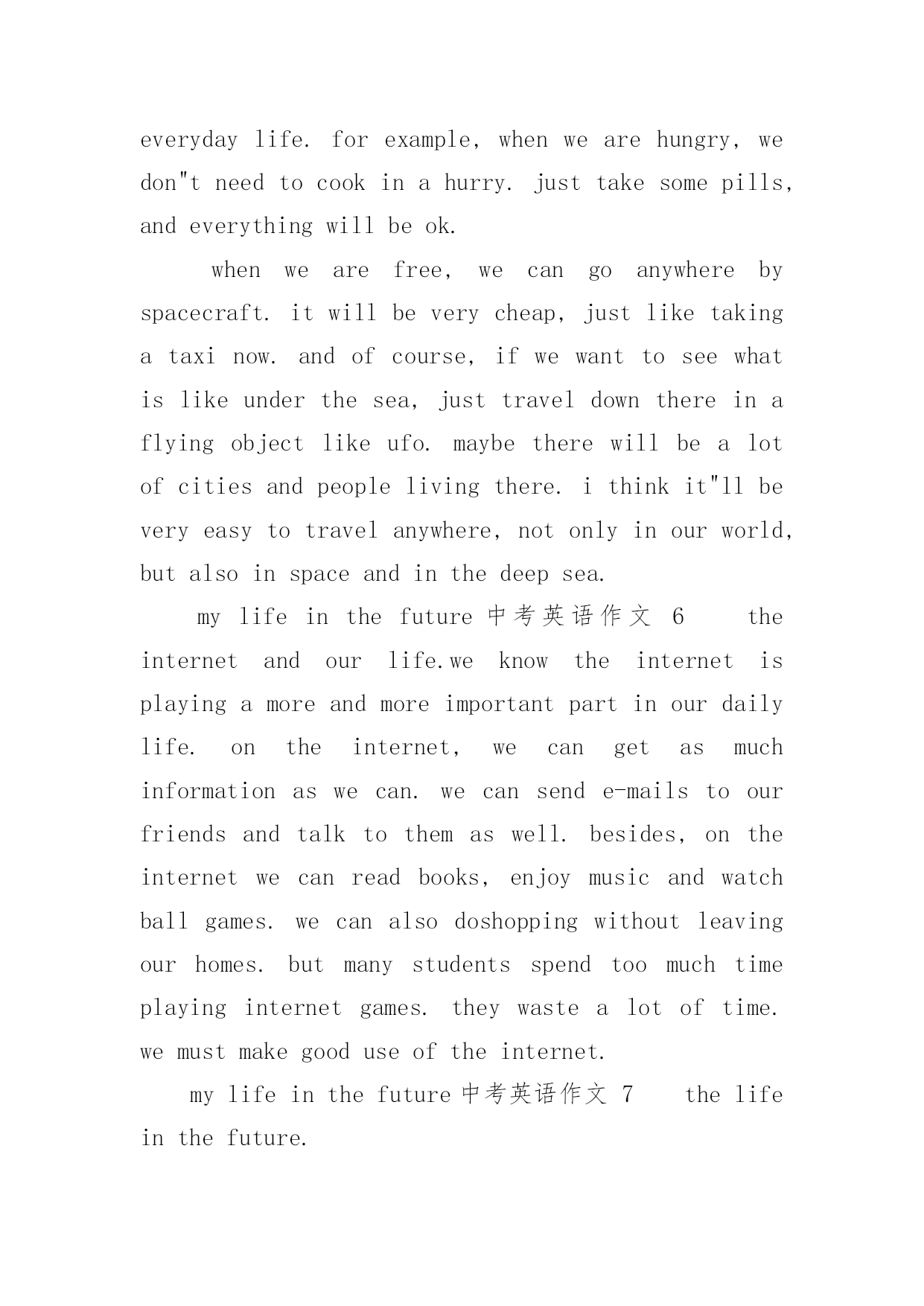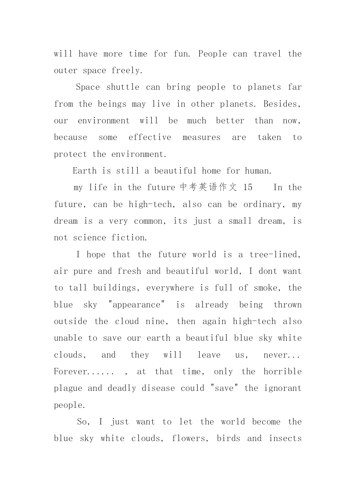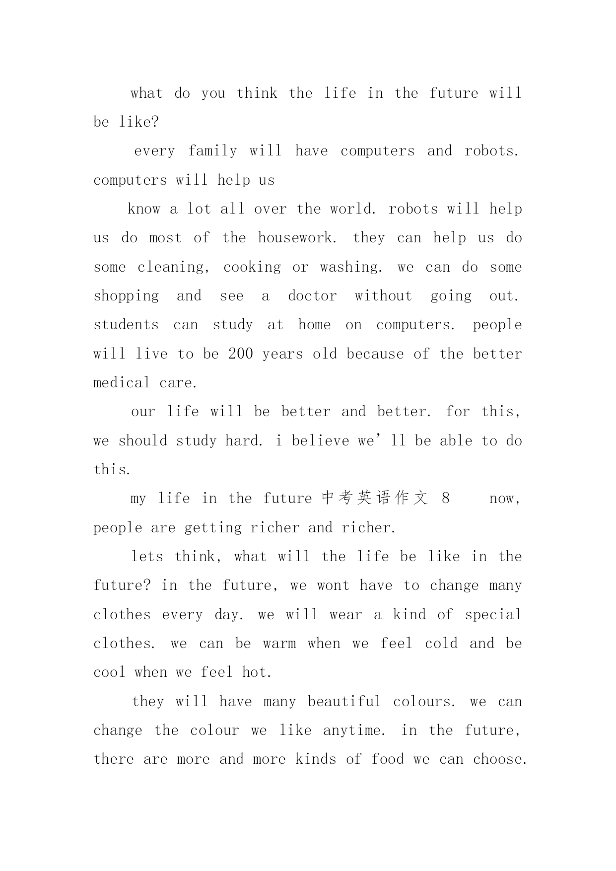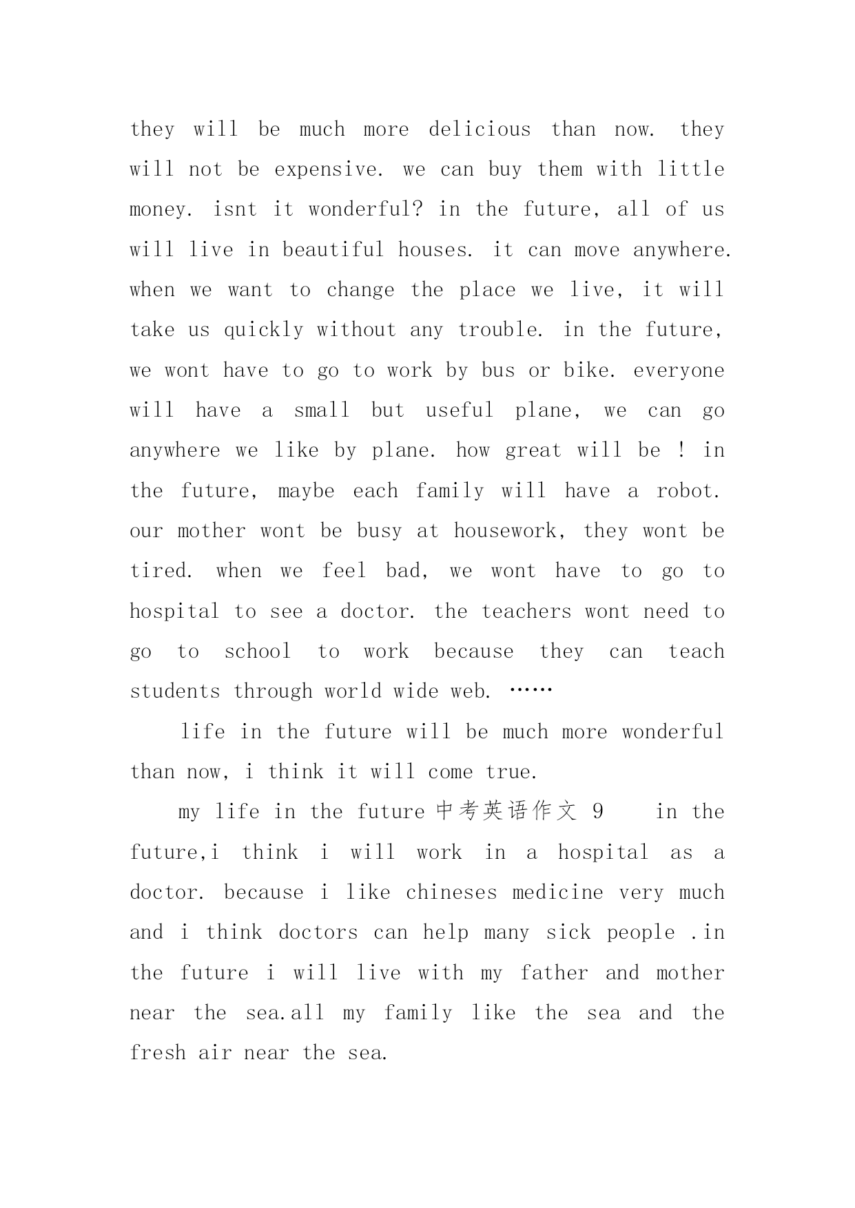 mylifeinthefuture中考英语作文mylifeinthefuture中考英语作文(通用24篇)在日常生活或是工作学习中,许多人都有过写作文的经历,对作文都不陌生吧,作文是通过文字来表达一个主题意义的记叙方法。你知道作文怎样写才规范吗?下面是小编收集整理的mylifeinthefuture中考英语作文,仅供参考,希望能够帮助到大家。mylifeinthefuture中考英语作文1Mylifeinthefuturewillbecolorfulandmeaningful.I’mgoingtobeagooddoctorafterIgraduatefromtheuniversity.IbelieveI’llbringmyparentshealthandhappiness.Inmysparetime,I’llstaywithmyfamily.We’lltravelalotanddolotsofsports.I’llalsoreadasmanybooksasIcanforIwanttoimprovemyself.EvenifIwork,Iwillnevergiveupstuding.I’msuremydreamwillcometruebecauseofmyhardworkandthelifeinthefuturewillgetbetterandbetter.mylifeinthefuture中考英语作文2withthedevelopmentofscienceandtechnology,ourliveshavechangedalotinthepastcentury.manythingsthatwouldn’thappenbeforehavecomeintorealitynow.therefore,ourliveswillchangeaswellinthefuture.ourpaceoflivewillgreatlyspeedup,becausewewillhelpmanymachinestofinishourwork.manythingscanbedoneautonomously.therefore,peoplewillhavemoretimeforfun.peoplecantraveltheouterspacefreely.spaceshuttlecanbringpeopletoplanetsfarfromtheearth.besides,ourenvironmentwillbemuchbetterthannow,becausesomeeffectivemeasuresaretakentoprotecttheenvironment.earthisstillabeautifulhomeforhuman.mylifeinthefuture中考英语作文3inthefuture,underthehelpofthecomputer,ourlifewillbemuchmoreconvinient.first,robotscanhelpuswithourhouseworkandsoon,sothatwewonthavetodothesethingsourselves.theycanalsohelpuswithourwork,causetheywilbeveryclever.second,iwonthavetogotoschoolforstudy.withtheonlinecoursesandcomputers,icanfinishmylearningeasilyathome.third,peoplewillbemorerichandlifecanbehappytoeveryone.besidesworking,everyonewillhavethechancetochoosehisownwayofliving.torealisethewonderfullifeinthefuture,wehavetostudyandworkhardnowtoimproveourenconomyandtechnologies.withtherapiddevelopmentofthem,thelifeabovemustcometruesomeday.letstryourbestforit!mylifeinthefuture中考英语作文4iwanttogrowupassoonaspossible.whenigrowup,icandomanythingsthatican’tnow.however,atthesametime,iamafraid.idon’tknowwhatmyfuturelifewouldbe.lookaroundmyself,somepeople