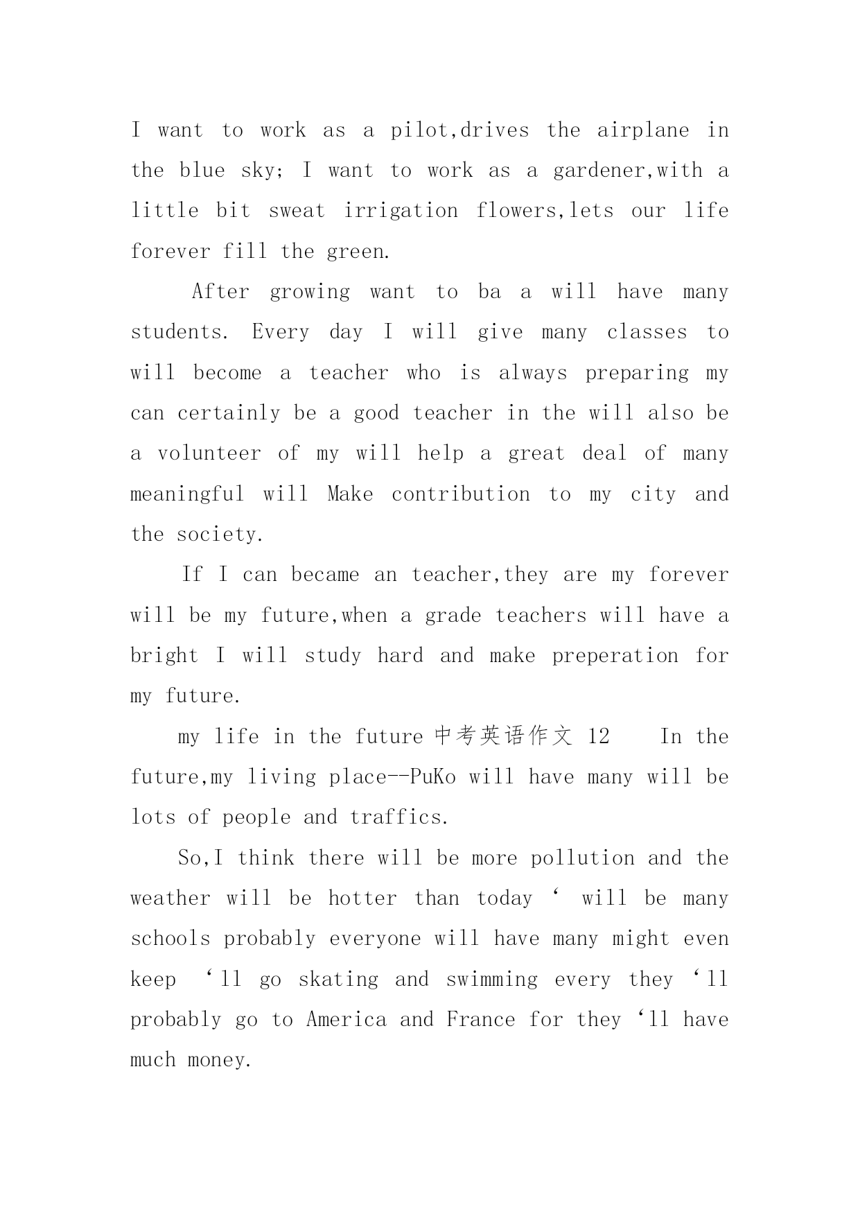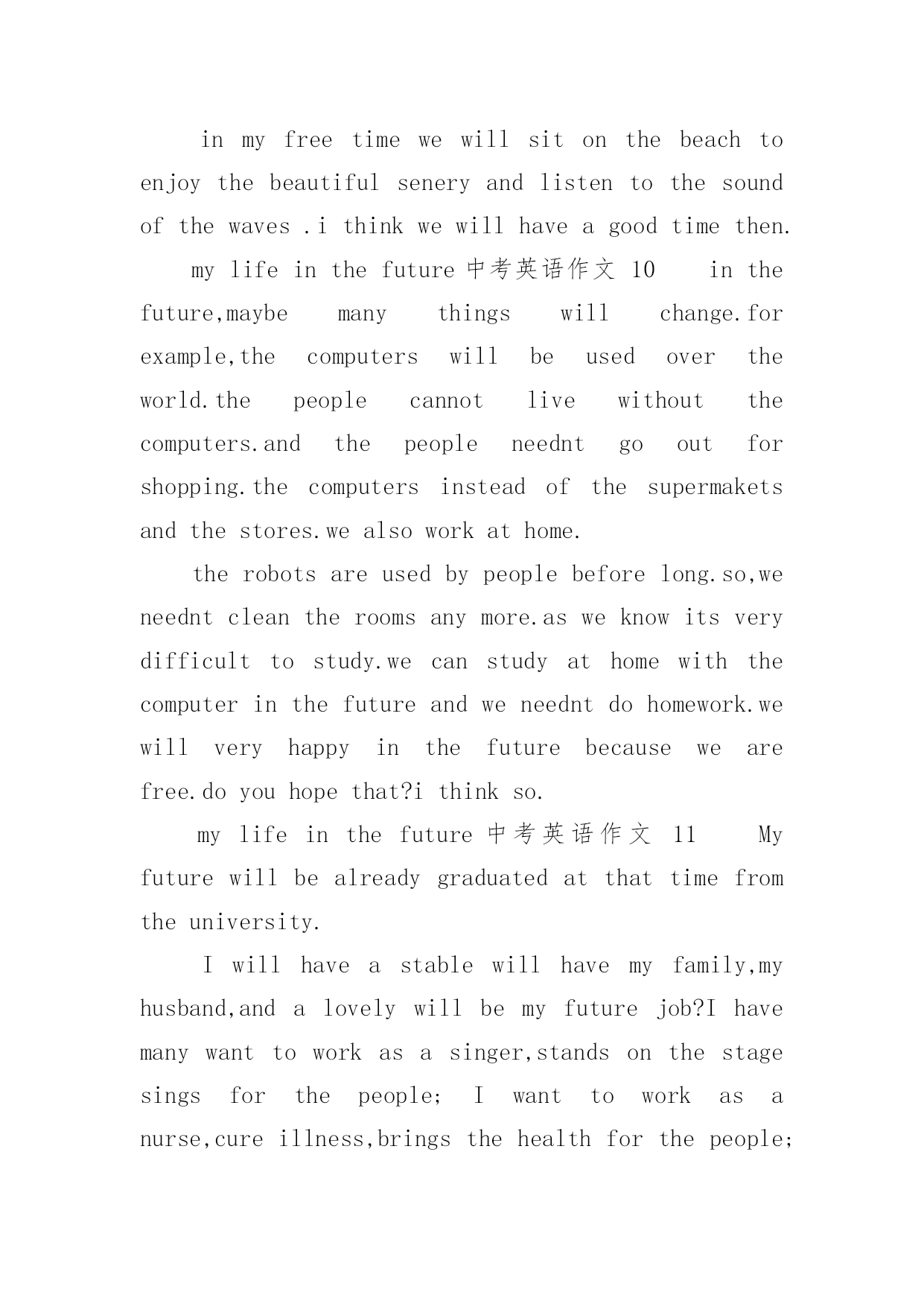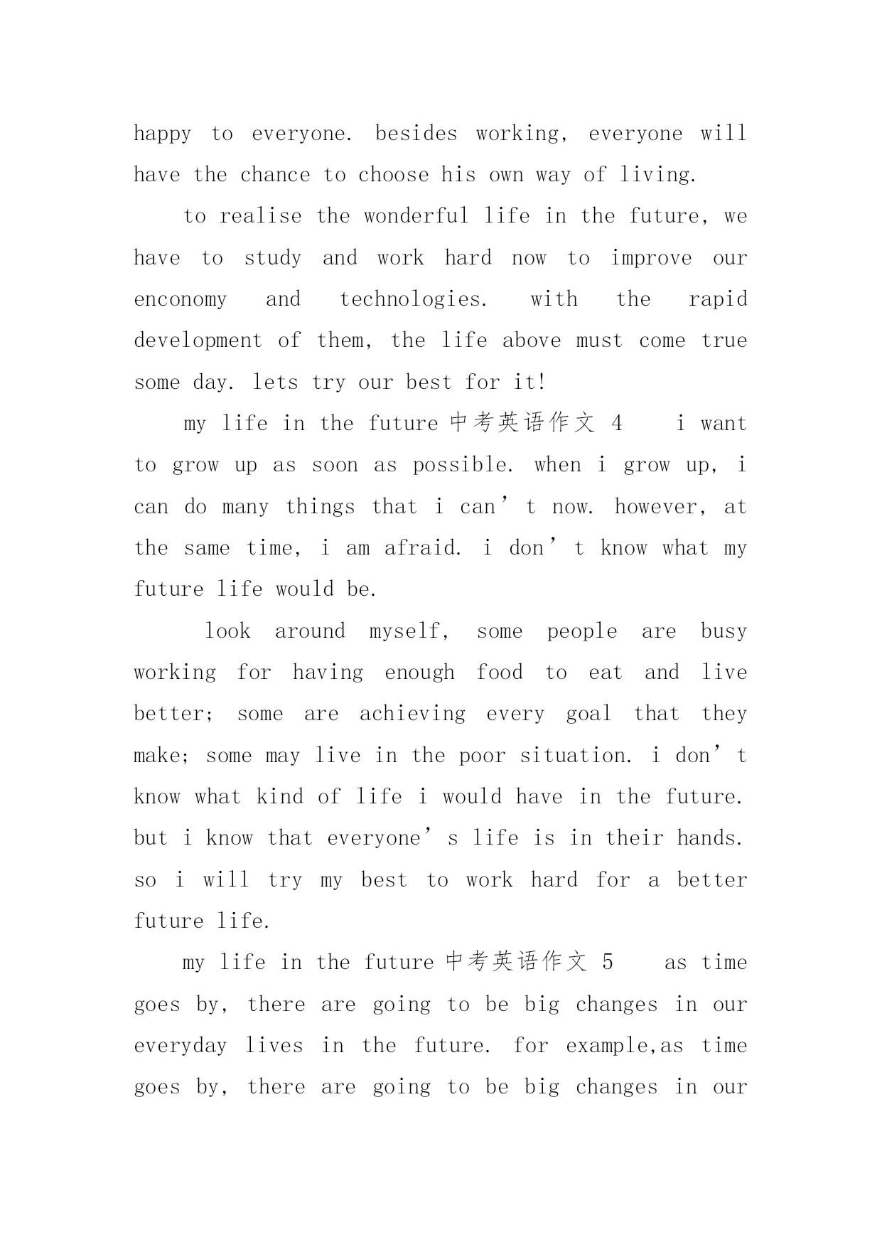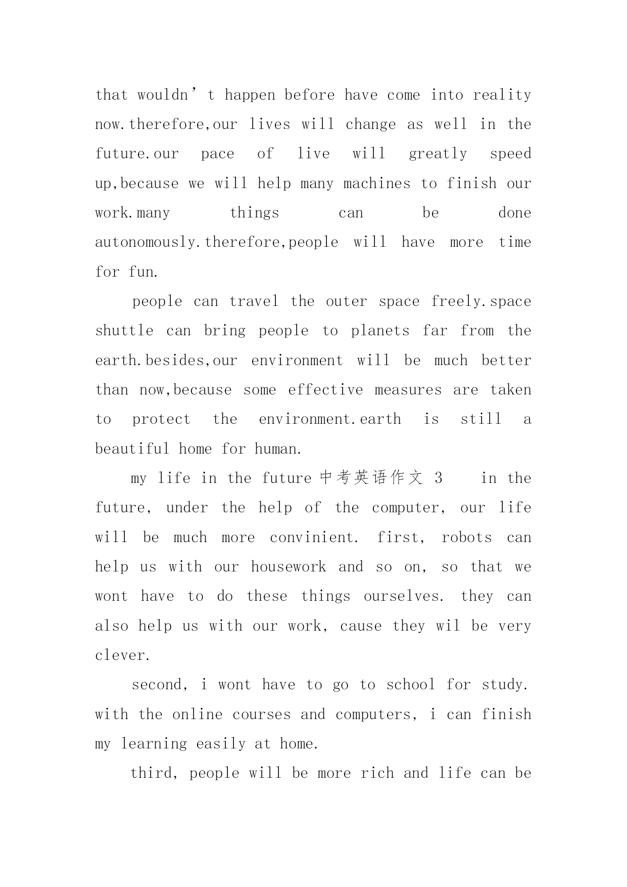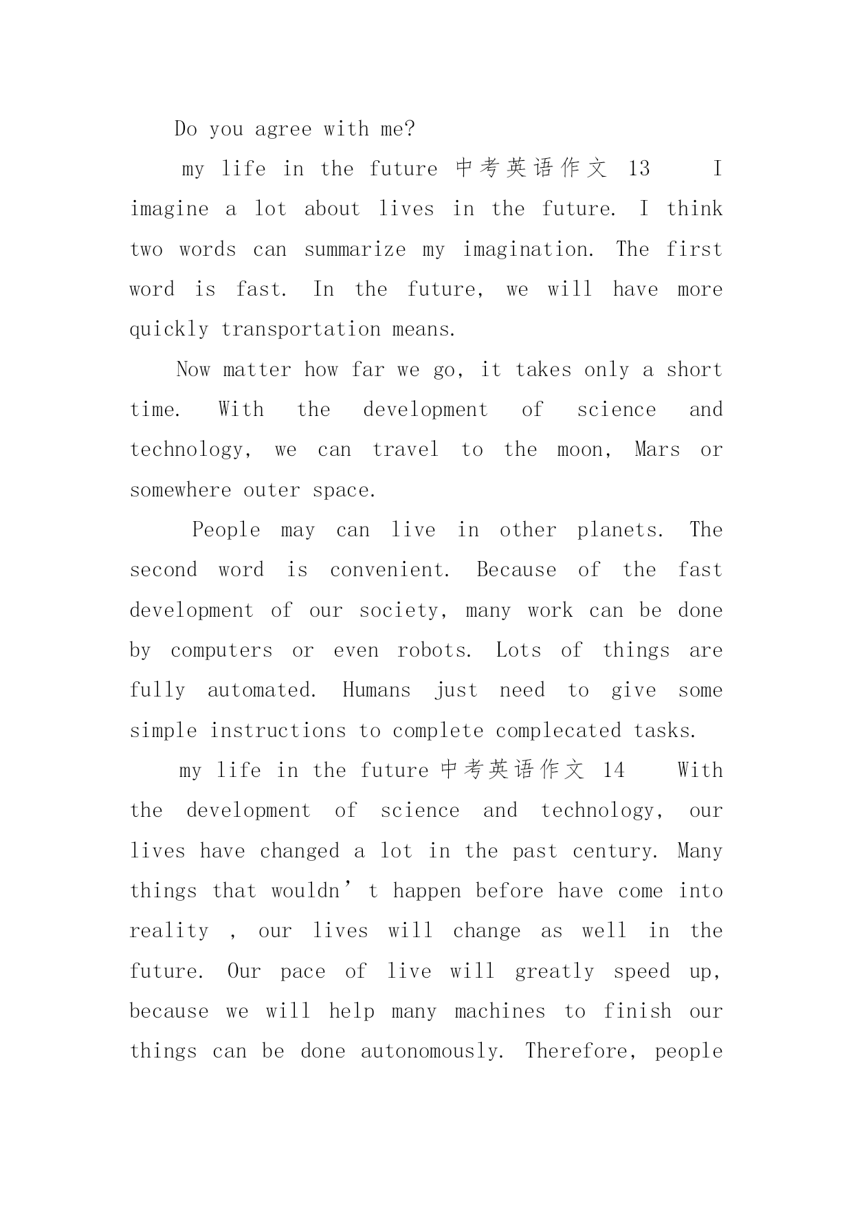 mylifeinthefuture中考英语作文mylifeinthefuture中考英语作文(通用24篇)在日常生活或是工作学习中,许多人都有过写作文的经历,对作文都不陌生吧,作文是通过文字来表达一个主题意义的记叙方法。你知道作文怎样写才规范吗?下面是小编收集整理的mylifeinthefuture中考英语作文,仅供参考,希望能够帮助到大家。mylifeinthefuture中考英语作文1Mylifeinthefuturewillbecolorfulandmeaningful.I’mgoingtobeagooddoctorafterIgraduatefromtheuniversity.IbelieveI’llbringmyparentshealthandhappiness.Inmysparetime,I’llstaywithmyfamily.We’lltravelalotanddolotsofsports.I’llalsoreadasmanybooksasIcanforIwanttoimprovemyself.EvenifIwork,Iwillnevergiveupstuding.I’msuremydreamwillcometruebecauseofmyhardworkandthelifeinthefuturewillgetbetterandbetter.mylifeinthefuture中考英语作文2withthedevelopmentofscienceandtechnology,ourliveshavechangedalotinthepastcentury.manythingsthatwouldn’thappenbeforehavecomeintorealitynow.therefore,ourliveswillchangeaswellinthefuture.ourpaceoflivewillgreatlyspeedup,becausewewillhelpmanymachinestofinishourwork.manythingscanbedoneautonomously.therefore,peoplewillhavemoretimeforfun.peoplecantraveltheouterspacefreely.spaceshuttlecanbringpeopletoplanetsfarfromtheearth.besides,ourenvironmentwillbemuchbetterthannow,becausesomeeffectivemeasuresaretakentoprotecttheenvironment.earthisstillabeautifulhomeforhuman.mylifeinthefuture中考英语作文3inthefuture,underthehelpofthecomputer,ourlifewillbemuchmoreconvinient.first,robotscanhelpuswithourhouseworkandsoon,sothatwewonthavetodothesethingsourselves.theycanalsohelpuswithourwork,causetheywilbeveryclever.second,iwonthavetogotoschoolforstudy.withtheonlinecoursesandcomputers,icanfinishmylearningeasilyathome.third,peoplewillbemorerichandlifecanbehappytoeveryone.besidesworking,everyonewillhavethechancetochoosehisownwayofliving.torealisethewonderfullifeinthefuture,wehavetostudyandworkhardnowtoimproveourenconomyandtechnologies.withtherapiddevelopmentofthem,thelifeabovemustcometruesomeday.letstryourbestforit!mylifeinthefuture中考英语作文4iwanttogrowupassoonaspossible.whenigrowup,icandomanythingsthatican’tnow.however,atthesametime,iamafraid.idon’tknowwhatmyfuturelifewouldbe.lookaroundmyself,somepeople