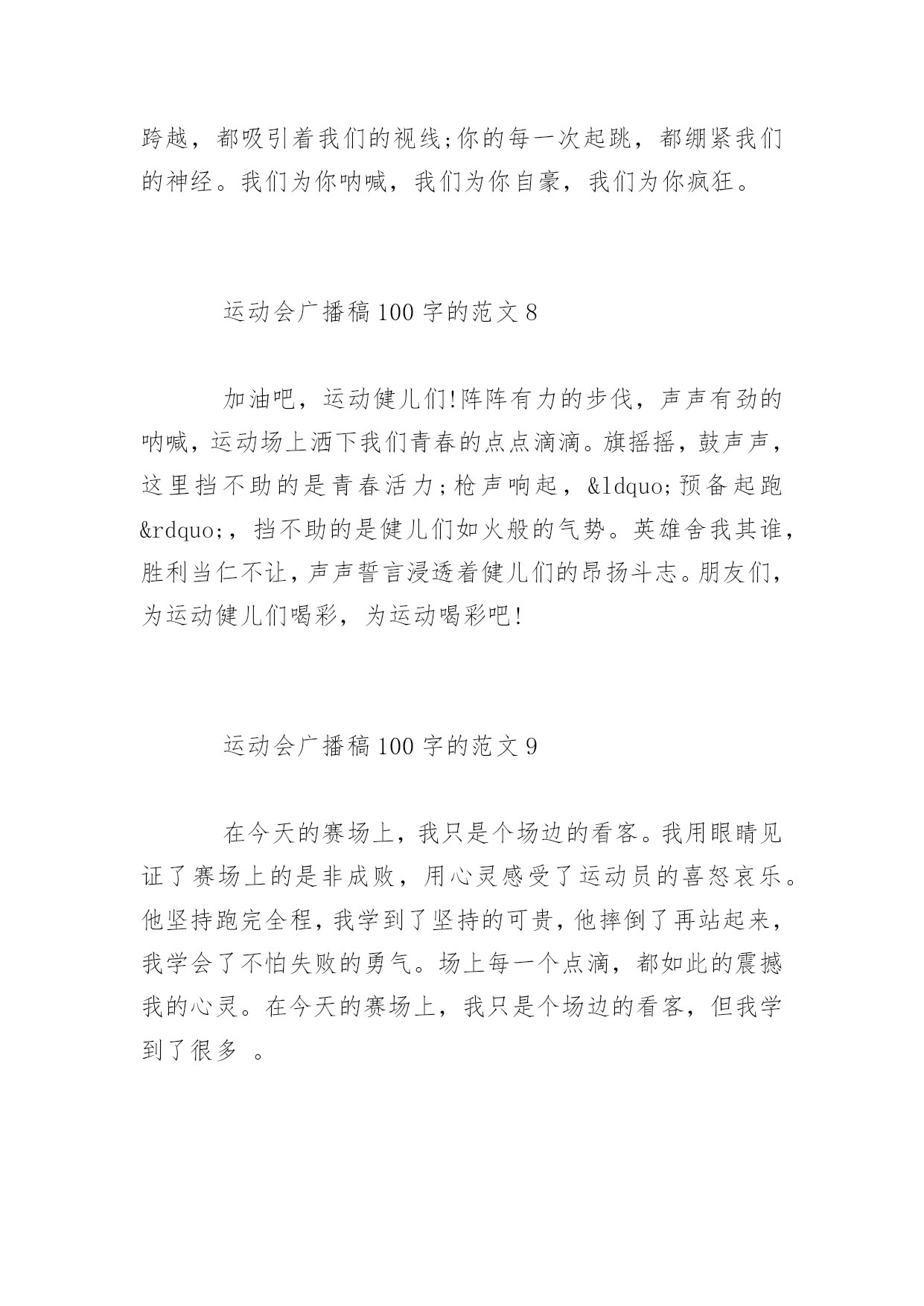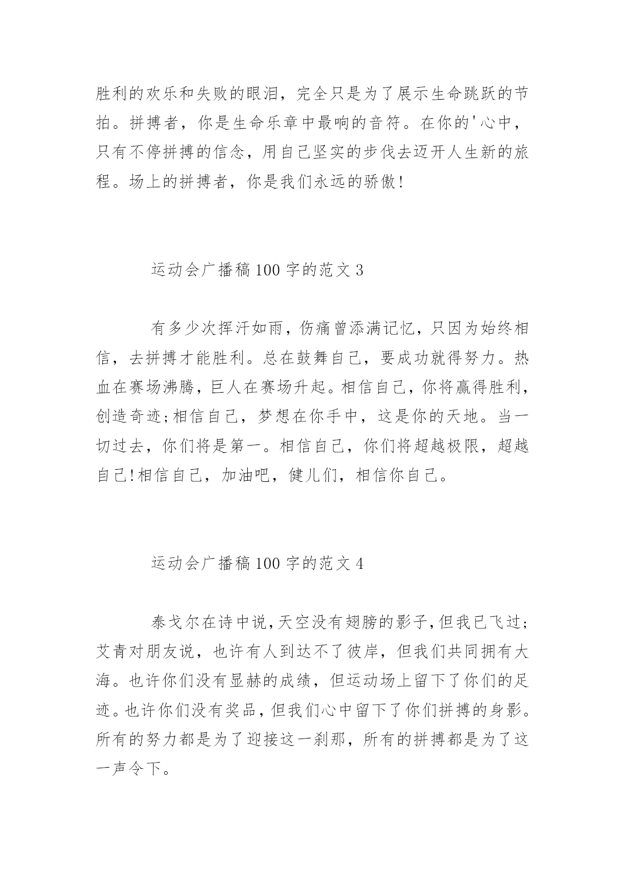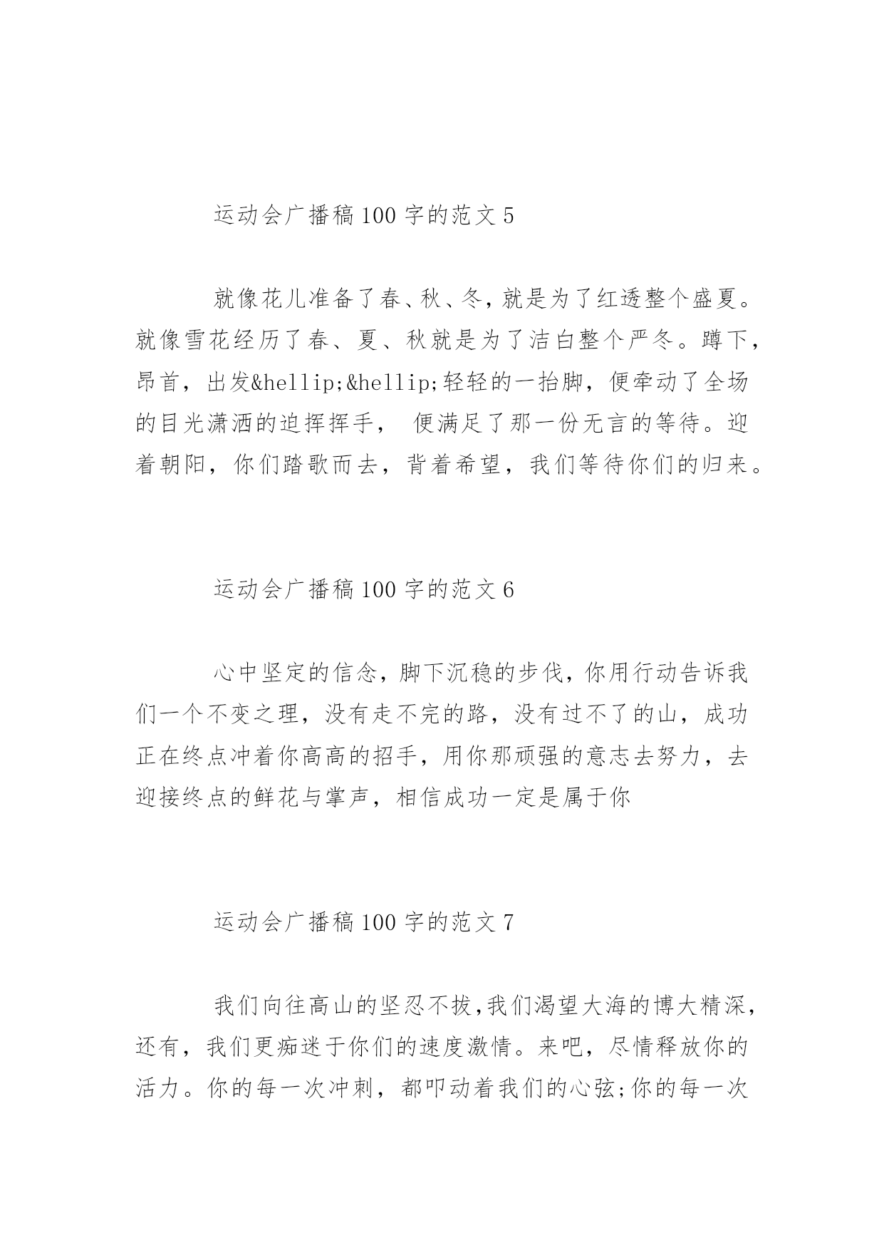 运动会广播稿的运动会广播稿100字的范文广播语言要亲切、中听,多用谈心的口气,商量的口气,少用“必须”、“应该”等命令式口气。那么运动会广播稿100字范文有哪些呢?下面是学习啦小编为你整理的运动会广播稿100字的范文,希望对您有用。运动会广播稿100字的范文1不为掌声的诠释,不为刻意的征服,只有辛勤的汗水化作追求的脚步。心中坚定的信念,脚下沉稳的步伐,你用行动诉说着一个不变的真理。没有比脚更长的路,没有比人更高的山。希望在终点向你招手。努力吧,用你坚韧不拔的毅志去迎接终点的鲜花与掌声。相信成功属于你运动会广播稿100字的范文2拼搏者,你是赛场上最亮的点。在你的眼中,不在乎胜利的欢乐和失败的眼泪,完全只是为了展示生命跳跃的节拍。拼搏者,你是生命乐章中最响的音符。在你的'心中,只有不停拼搏的信念,用自己坚实的步伐去迈开人生新的旅程。场上的拼搏者,你是我们永远的骄傲!运动会广播稿100字的范文3有多少次挥汗如雨,伤痛曾添满记忆,只因为始终相信,去拼搏才能胜利。总在鼓舞自己,要成功就得努力。热血在赛场沸腾,巨人在赛场升起。相信自己,你将赢得胜利,创造奇迹;相信自己,梦想在你手中,这是你的天地。当一切过去,你们将是第一。相信自己,你们将超越极限,超越自己!相信自己,加油吧,健儿们,相信你自己。运动会广播稿100字的范文4泰戈尔在诗中说,天空没有翅膀的影子,但我已飞过;艾青对朋友说,也许有人到达不了彼岸,但我们共同拥有大海。也许你们没有显赫的成绩,但运动场上留下了你们的足迹。也许你们没有奖品,但我们心中留下了你们拼搏的身影。所有的努力都是为了迎接这一刹那,所有的拼搏都是为了这一声令下。运动会广播稿100字的范文5就像花儿准备了春、秋、冬,就是为了红透整个盛夏。就像雪花经历了春、夏、秋就是为了洁白整个严冬。蹲下,昂首,出发……轻轻的一抬脚,便牵动了全场的目光潇洒的迫挥挥手,便满足了那一份无言的等待。迎着朝阳,你们踏歌而去,背着希望,我们等待你们的归来。运动会广播稿100字的范文6心中坚定的信念,脚下沉稳的步伐,你用行动告诉我们一个不变之理,没有走不完的路,没有过不了的山,成功正在终点冲着你高高的招手,用你那顽强的意志去努力,去迎接终点的鲜花与掌声,相信成功一定是属于你运动会广播稿100字的范文7我们向往高山的坚忍不拔,我们渴望大海的博大精深,还有,我们更痴迷于你们的速度激情。来吧,尽情释放你的活力。你的每一次冲刺,都叩动着我们的心弦;你的每一次跨越,都吸引着我们的视线;你的每一次起跳,都绷紧我们的神经。我们为你呐喊,我们为你自豪,我们为你疯狂。运动会广播稿100字的范文8加油吧,运动健儿们!阵阵有力的步伐,声声有劲的呐喊,运动场上洒下我们青春的点点滴滴。旗摇摇,鼓声声,这里挡不助的是青春活力;枪声响起,“预备起跑”,挡不助的是健儿们如火般的气势。英雄舍我其谁,胜利当仁不让,声声誓言浸透着健儿们的昂扬斗志。朋友们,为运动健儿们喝彩,为运动喝彩吧!运动会广播稿100字的范文9在今天的赛场上,我只是个场边的看客。我用眼睛见证了赛场上的是非成败,用心灵感受了运动员的喜怒哀乐。他坚持跑完全程,我学到了坚持的可贵,他摔倒了再站起来,我学会了不怕失败的勇气。场上每一个点滴,都如此的震撼我的心灵。在今天的赛场上,我只是个场边的看客,但我学到了很多。