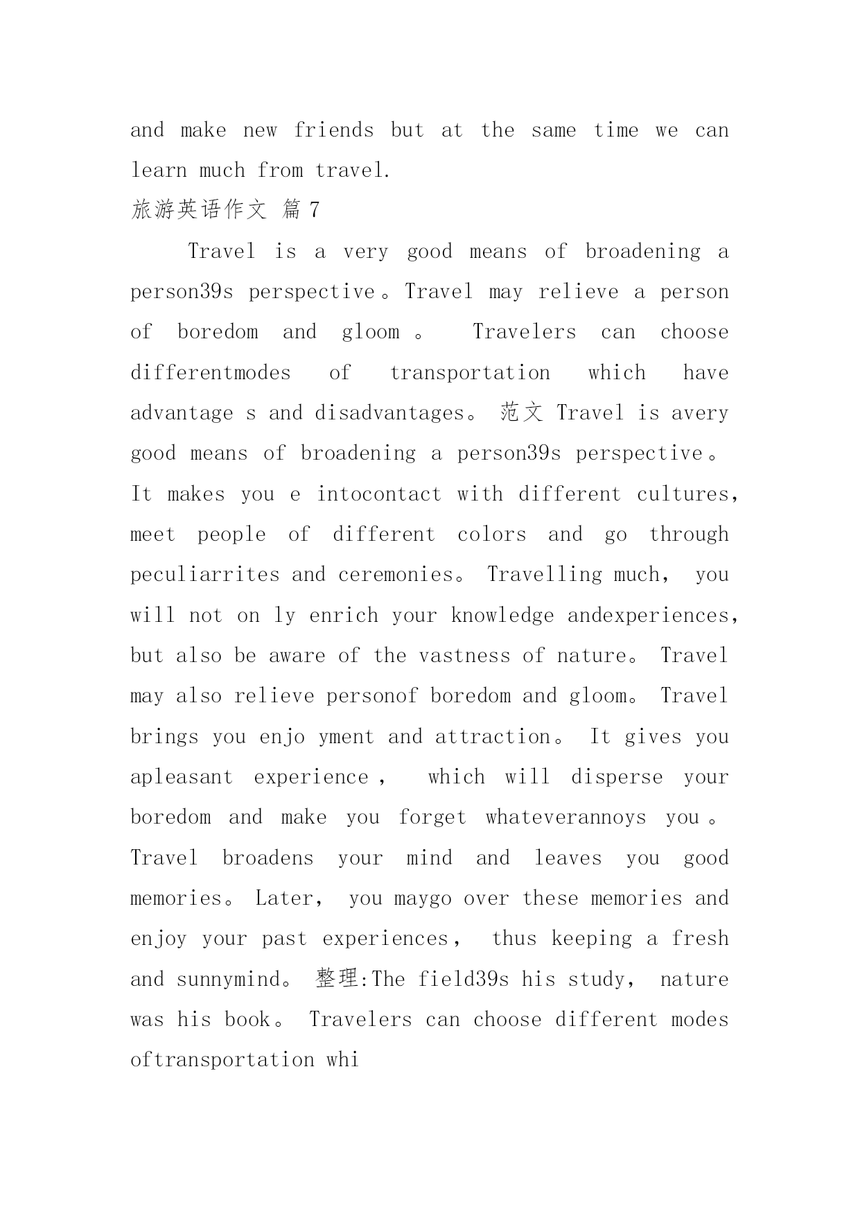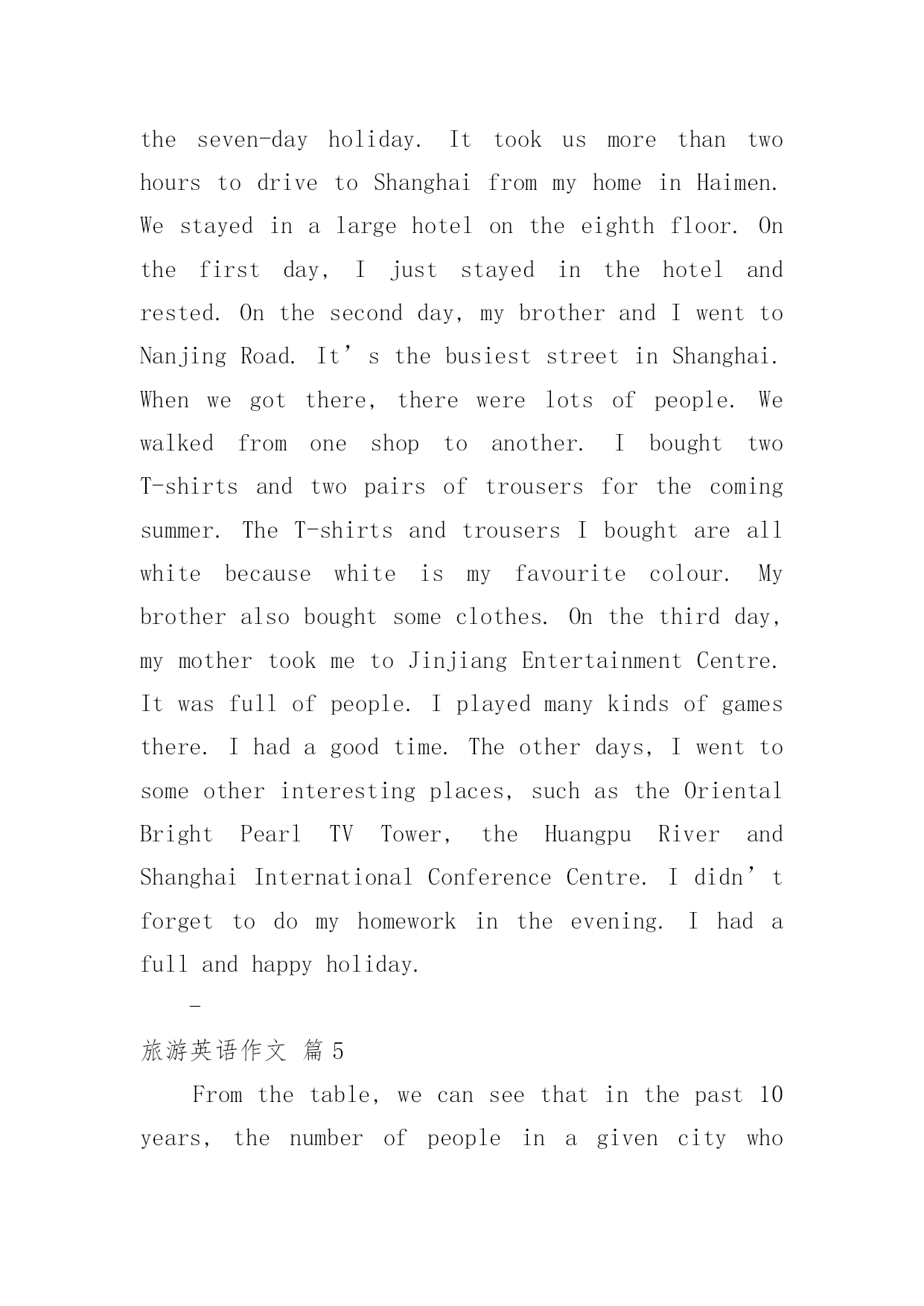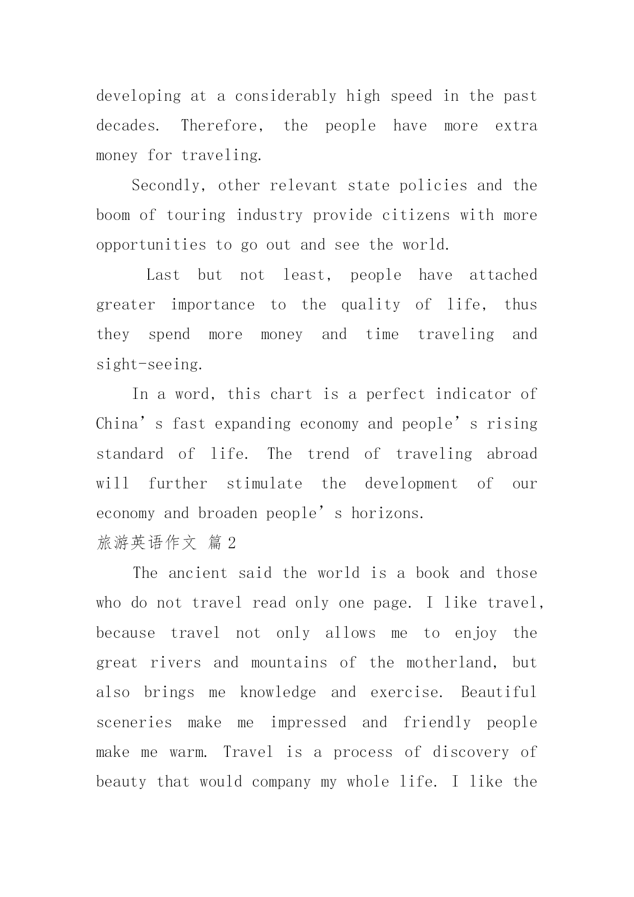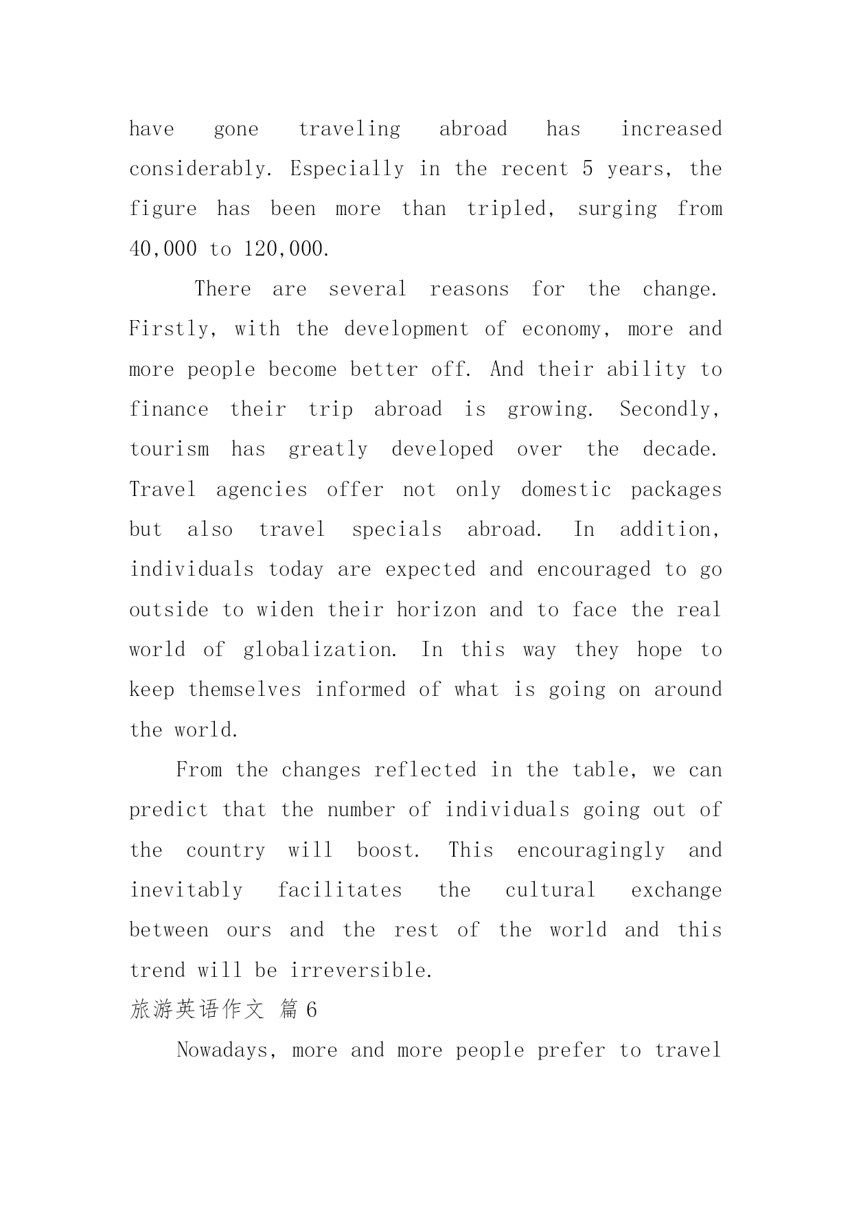 旅游英语作文【精华】旅游英语作文合集7篇在日常的学习、工作、生活中,大家对作文都再熟悉不过了吧,借助作文人们可以反映客观事物、表达思想感情、传递知识信息。为了让您在写作文时更加简单方便,以下是小编精心整理的旅游英语作文7篇,欢迎大家借鉴与参考,希望对大家有所帮助。旅游英语作文篇1TravelingAbroadItcanbeseenfromthechartthattherehavebeensharpincreasesinthenumberofpeopletravelingabroadinCityXinthepastdecade.Asthechartshows,theyear1995witnessedonlyabout10,000peoplefromthiscitytouringabroad.In20xx,thenumbersoaredtonearly40,000.Lastyear,morethan120,000peopleinthecitychosetospendtheirvacationsoutsideChina.Anumberoffactorsaccountforthechangeinthechart,butthefollowingarethemostcriticalones.First,thankstothepolicyofreformandopening-up,thenation’seconomyhasbeendevelopingataconsiderablyhighspeedinthepastdecades.Therefore,thepeoplehavemoreextramoneyfortraveling.Secondly,otherrelevantstatepoliciesandtheboomoftouringindustryprovidecitizenswithmoreopportunitiestogooutandseetheworld.Lastbutnotleast,peoplehaveattachedgreaterimportancetothequalityoflife,thustheyspendmoremoneyandtimetravelingandsight-seeing.Inaword,thischartisaperfectindicatorofChina’sfastexpandingeconomyandpeople’srisingstandardoflife.Thetrendoftravelingabroadwillfurtherstimulatethedevelopmentofoureconomyandbroadenpeople’shorizons.旅游英语作文篇2Theancientsaidtheworldisabookandthosewhodonottravelreadonlyonepage.Iliketravel,becausetravelnotonlyallowsmetoenjoythegreatriversandmountainsofthemotherland,butalsobringsmeknowledgeandexercise.Beautifulsceneriesmakemeimpressedandfriendlypeoplemakemewarm.Travelisaprocessofdiscoveryofbeautythatwouldcompanymywholelife.Ilikethefeelingontheroad,whichgreatlyenrichmylifeandfieldsofvision.Beingtodifferentplaces,seeingdifferentviewsmakesmeknowhowbigtheworldis,sothatIwon’tbothermytrifles.Ithinkabroadmindisextremelyimportanttoaperson,andtravelingisagoodwaytogetit.MaybesomepeoplewouldsaythatItraveljustbecauseIwanttorelax.There’snodoubtaboutthat.Nomatterforwhatreason,travelingisattractivetousall.古人云:读万卷书,不如行万里路。我喜欢旅行,旅行不仅让我饱览祖国的大好河山,而且在学到知识的同时还锻炼了自己。美丽的风景让我印象深刻,有好的人们也让我倍感温暖。旅行就是一个发现美的'过程,这种美的感受将会陪伴我的终生。我喜欢在路上的感觉,这极大的丰富了我的生活和视野。到不同的地方,