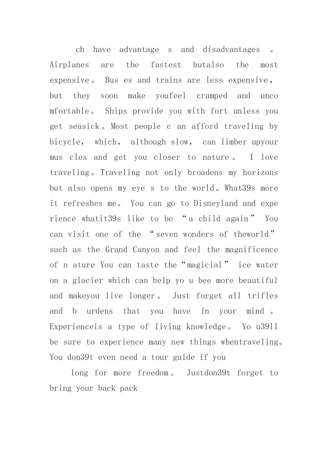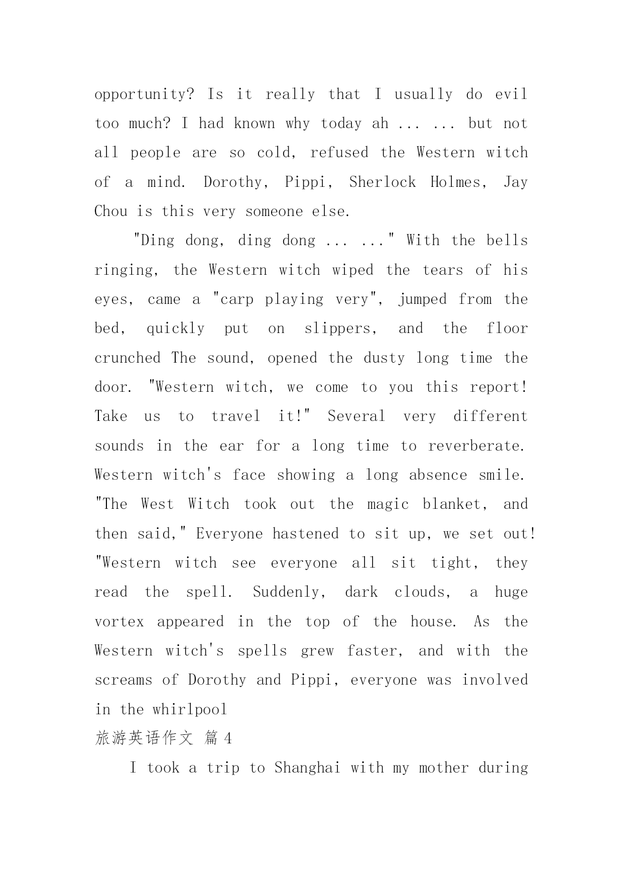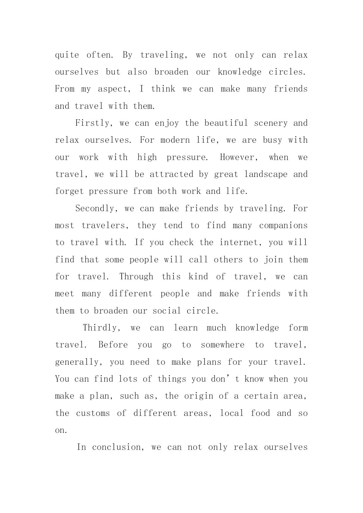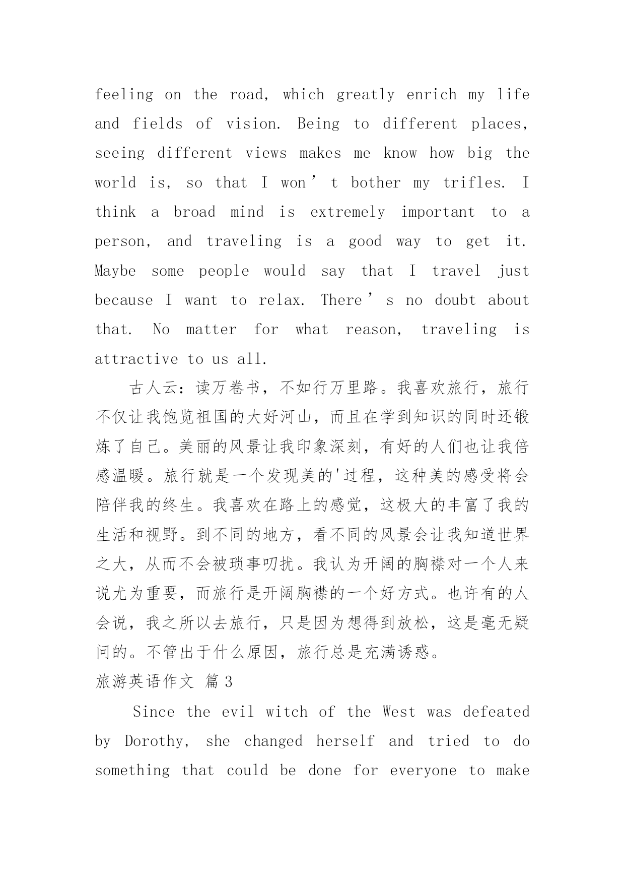 旅游英语作文【精华】旅游英语作文合集7篇在日常的学习、工作、生活中,大家对作文都再熟悉不过了吧,借助作文人们可以反映客观事物、表达思想感情、传递知识信息。为了让您在写作文时更加简单方便,以下是小编精心整理的旅游英语作文7篇,欢迎大家借鉴与参考,希望对大家有所帮助。旅游英语作文篇1TravelingAbroadItcanbeseenfromthechartthattherehavebeensharpincreasesinthenumberofpeopletravelingabroadinCityXinthepastdecade.Asthechartshows,theyear1995witnessedonlyabout10,000peoplefromthiscitytouringabroad.In20xx,thenumbersoaredtonearly40,000.Lastyear,morethan120,000peopleinthecitychosetospendtheirvacationsoutsideChina.Anumberoffactorsaccountforthechangeinthechart,butthefollowingarethemostcriticalones.First,thankstothepolicyofreformandopening-up,thenation’seconomyhasbeendevelopingataconsiderablyhighspeedinthepastdecades.Therefore,thepeoplehavemoreextramoneyfortraveling.Secondly,otherrelevantstatepoliciesandtheboomoftouringindustryprovidecitizenswithmoreopportunitiestogooutandseetheworld.Lastbutnotleast,peoplehaveattachedgreaterimportancetothequalityoflife,thustheyspendmoremoneyandtimetravelingandsight-seeing.Inaword,thischartisaperfectindicatorofChina’sfastexpandingeconomyandpeople’srisingstandardoflife.Thetrendoftravelingabroadwillfurtherstimulatethedevelopmentofoureconomyandbroadenpeople’shorizons.旅游英语作文篇2Theancientsaidtheworldisabookandthosewhodonottravelreadonlyonepage.Iliketravel,becausetravelnotonlyallowsmetoenjoythegreatriversandmountainsofthemotherland,butalsobringsmeknowledgeandexercise.Beautifulsceneriesmakemeimpressedandfriendlypeoplemakemewarm.Travelisaprocessofdiscoveryofbeautythatwouldcompanymywholelife.Ilikethefeelingontheroad,whichgreatlyenrichmylifeandfieldsofvision.Beingtodifferentplaces,seeingdifferentviewsmakesmeknowhowbigtheworldis,sothatIwon’tbothermytrifles.Ithinkabroadmindisextremelyimportanttoaperson,andtravelingisagoodwaytogetit.MaybesomepeoplewouldsaythatItraveljustbecauseIwanttorelax.There’snodoubtaboutthat.Nomatterforwhatreason,travelingisattractivetousall.古人云:读万卷书,不如行万里路。我喜欢旅行,旅行不仅让我饱览祖国的大好河山,而且在学到知识的同时还锻炼了自己。美丽的风景让我印象深刻,有好的人们也让我倍感温暖。旅行就是一个发现美的'过程,这种美的感受将会陪伴我的终生。我喜欢在路上的感觉,这极大的丰富了我的生活和视野。到不同的地方,
