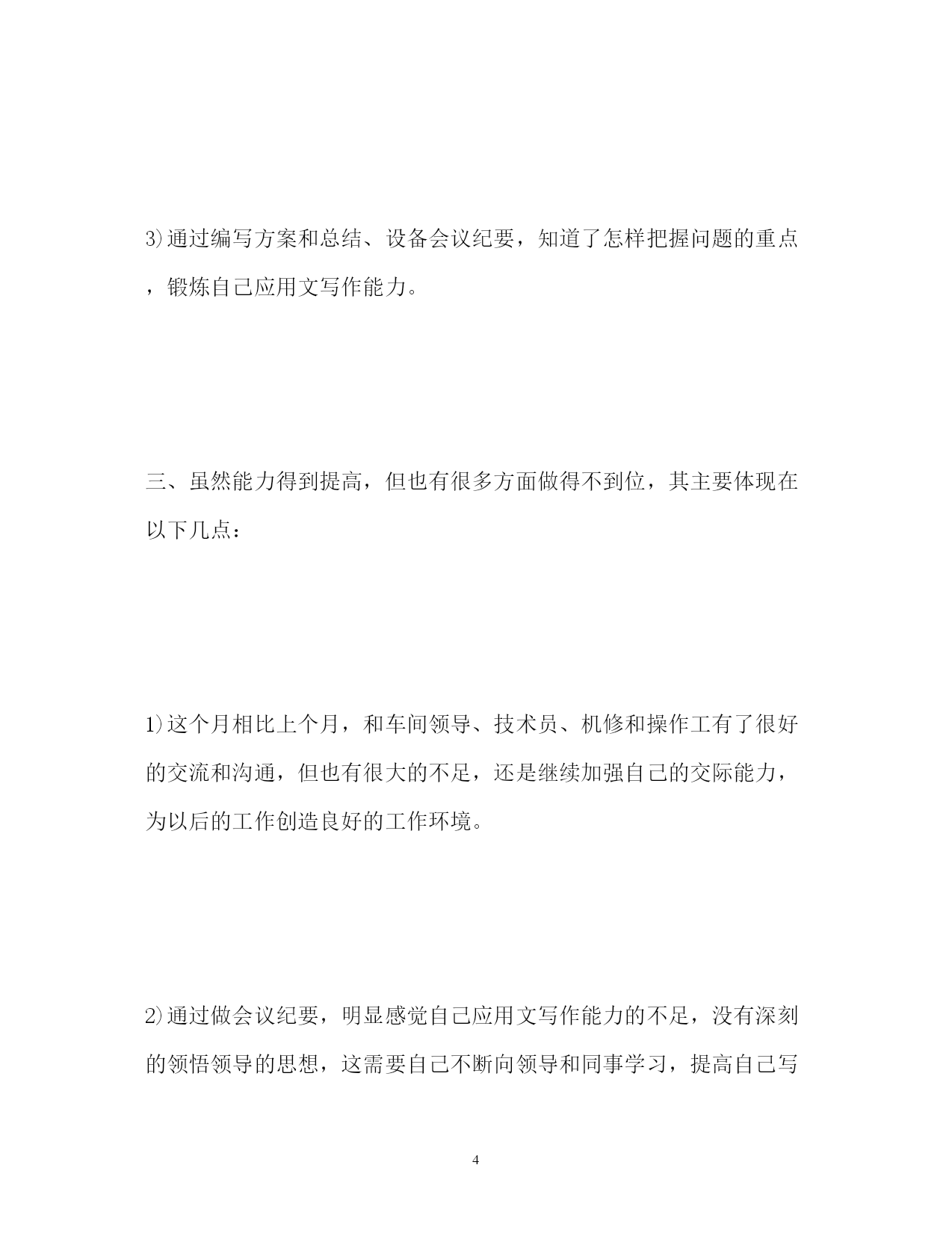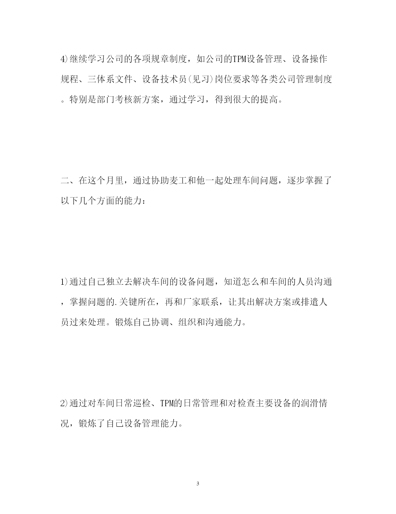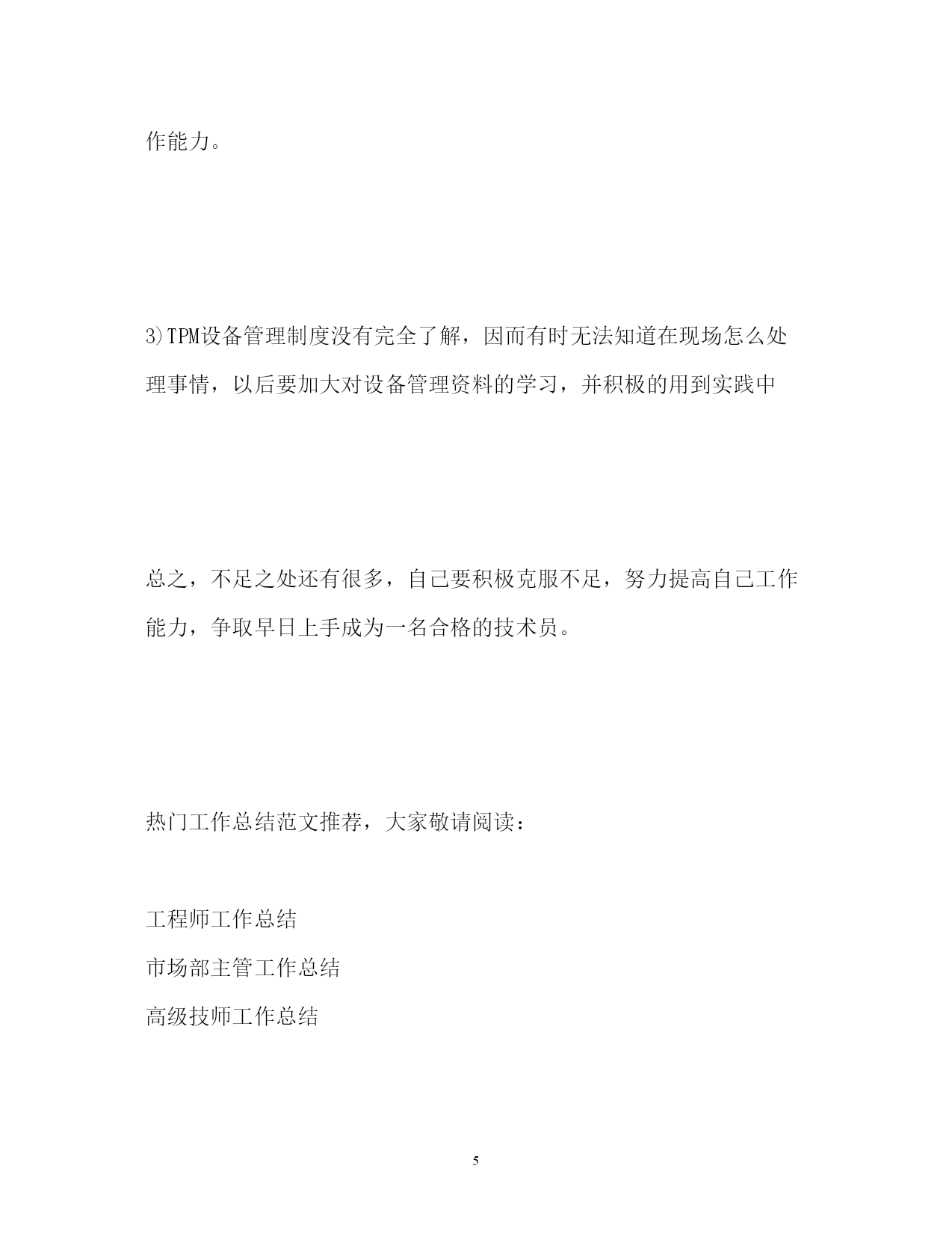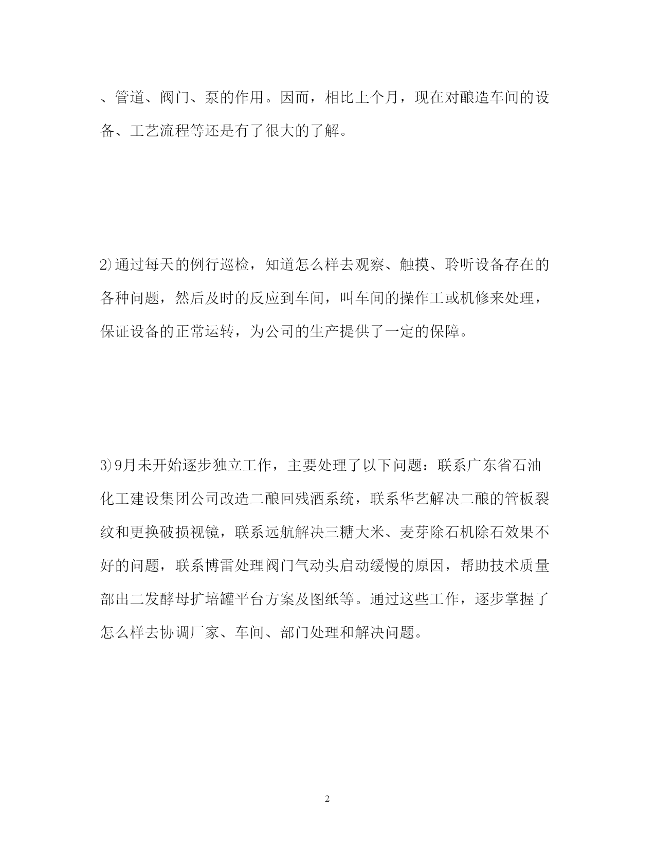 此资料由网络收集而来,如有侵权请告知上传者立即删除。资料共分享,我们负责传递知识。PAGEPAGE6技术员9月份工作总结技术员9月份工作总结回想我9月份的工作情况,个人觉得收获还是很多的,现总结如下:一、这个月来主要是协助麦工管理酿造车间,做了以下几个方面的工作:1)继续深入酿造车间,了解车间的重要设备,如振动筛、粉碎机、过滤槽槽箱绞龙、硅藻土烛式过滤机、PVPP过滤机等主要设备。同时通过看车间操作室的电脑操作流程、工艺文件及相关资料,了解各罐体、管道、阀门、泵的作用。因而,相比上个月,现在对酿造车间的设备、工艺流程等还是有了很大的了解。2)通过每天的例行巡检,知道怎么样去观察、触摸、聆听设备存在的各种问题,然后及时的反应到车间,叫车间的操作工或机修来处理,保证设备的正常运转,为公司的生产提供了一定的保障。3)9月未开始逐步独立工作,主要处理了以下问题:联系广东省石油化工建设集团公司改造二酿回残酒系统,联系华艺解决二酿的管板裂纹和更换破损视镜,联系远航解决三糖大米、麦芽除石机除石效果不好的问题,联系博雷处理阀门气动头启动缓慢的原因,帮助技术质量部出二发酵母扩培罐平台方案及图纸等。通过这些工作,逐步掌握了怎么样去协调厂家、车间、部门处理和解决问题。4)继续学习公司的各项规章制度,如公司的TPM设备管理、设备操作规程、三体系文件、设备技术员(见习)岗位要求等各类公司管理制度。特别是部门考核新方案,通过学习,得到很大的提高。二、在这个月里,通过协助麦工和他一起处理车间问题,逐步掌握了以下几个方面的能力:1)通过自己独立去解决车间的设备问题,知道怎么和车间的人员沟通,掌握问题的.关键所在,再和厂家联系,让其出解决方案或排遣人员过来处理。锻炼自己协调、组织和沟通能力。2)通过对车间日常巡检、TPM的日常管理和对检查主要设备的润滑情况,锻炼了自己设备管理能力。3)通过编写方案和总结、设备会议纪要,知道了怎样把握问题的重点,锻炼自己应用文写作能力。三、虽然能力得到提高,但也有很多方面做得不到位,其主要体现在以下几点:1)这个月相比上个月,和车间领导、技术员、机修和操作工有了很好的交流和沟通,但也有很大的不足,还是继续加强自己的交际能力,为以后的工作创造良好的工作环境。2)通过做会议纪要,明显感觉自己应用文写作能力的不足,没有深刻的领悟领导的思想,这需要自己不断向领导和同事学习,提高自己写作能力。3)TPM设备管理制度没有完全了解,因而有时无法知道在现场怎么处理事情,以后要加大对设备管理资料的学习,并积极的用到实践中总之,不足之处还有很多,自己要积极克服不足,努力提高自己工作能力,争取早日上手成为一名合格的技术员。热门工作总结范文推荐,大家敬请阅读:工程师工作总结市场部主管工作总结高级技师工作总结http://www.cnrencai.com/