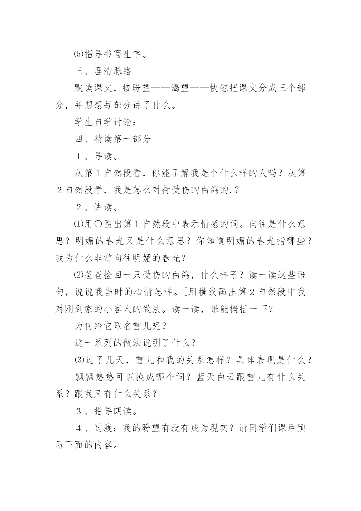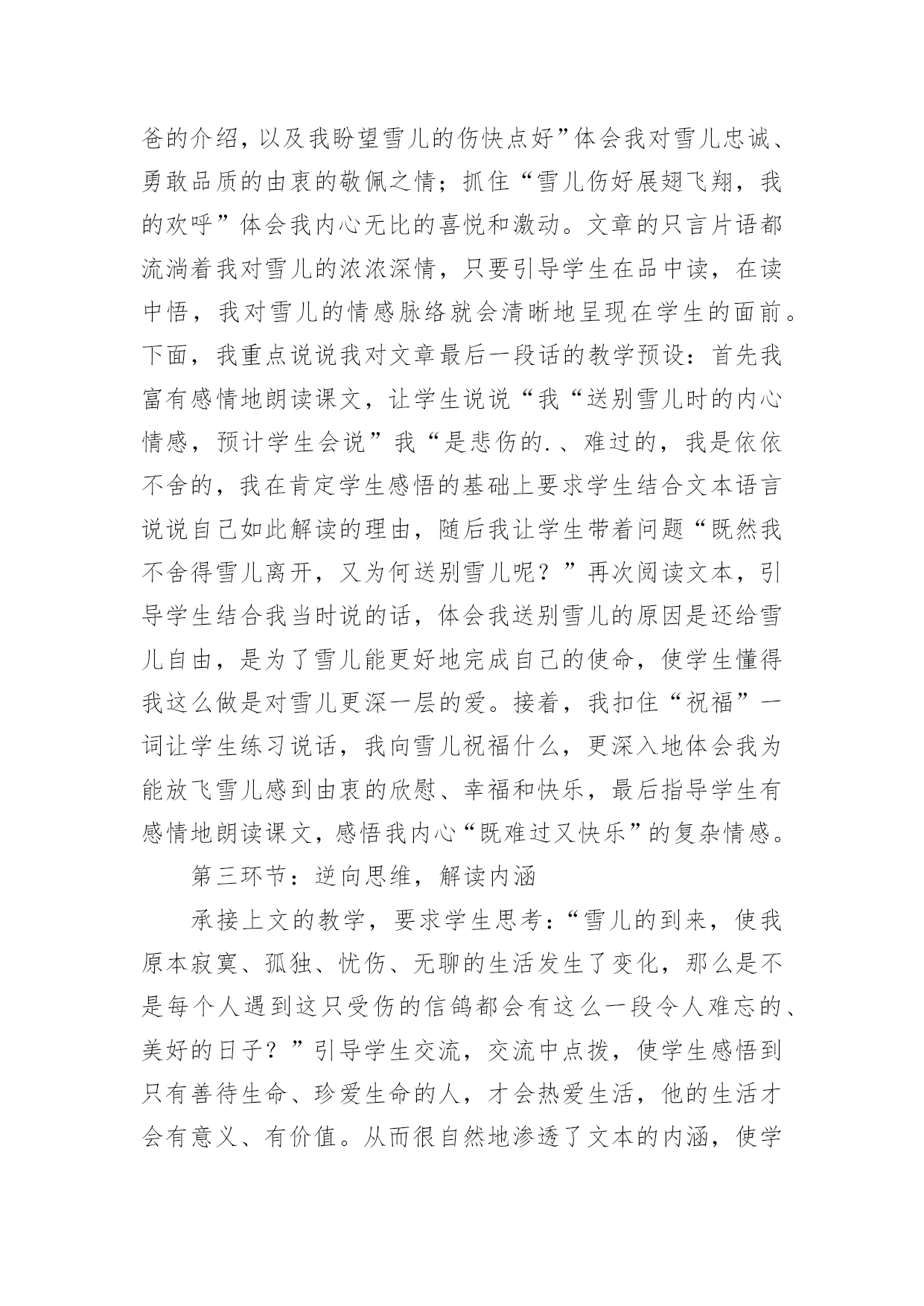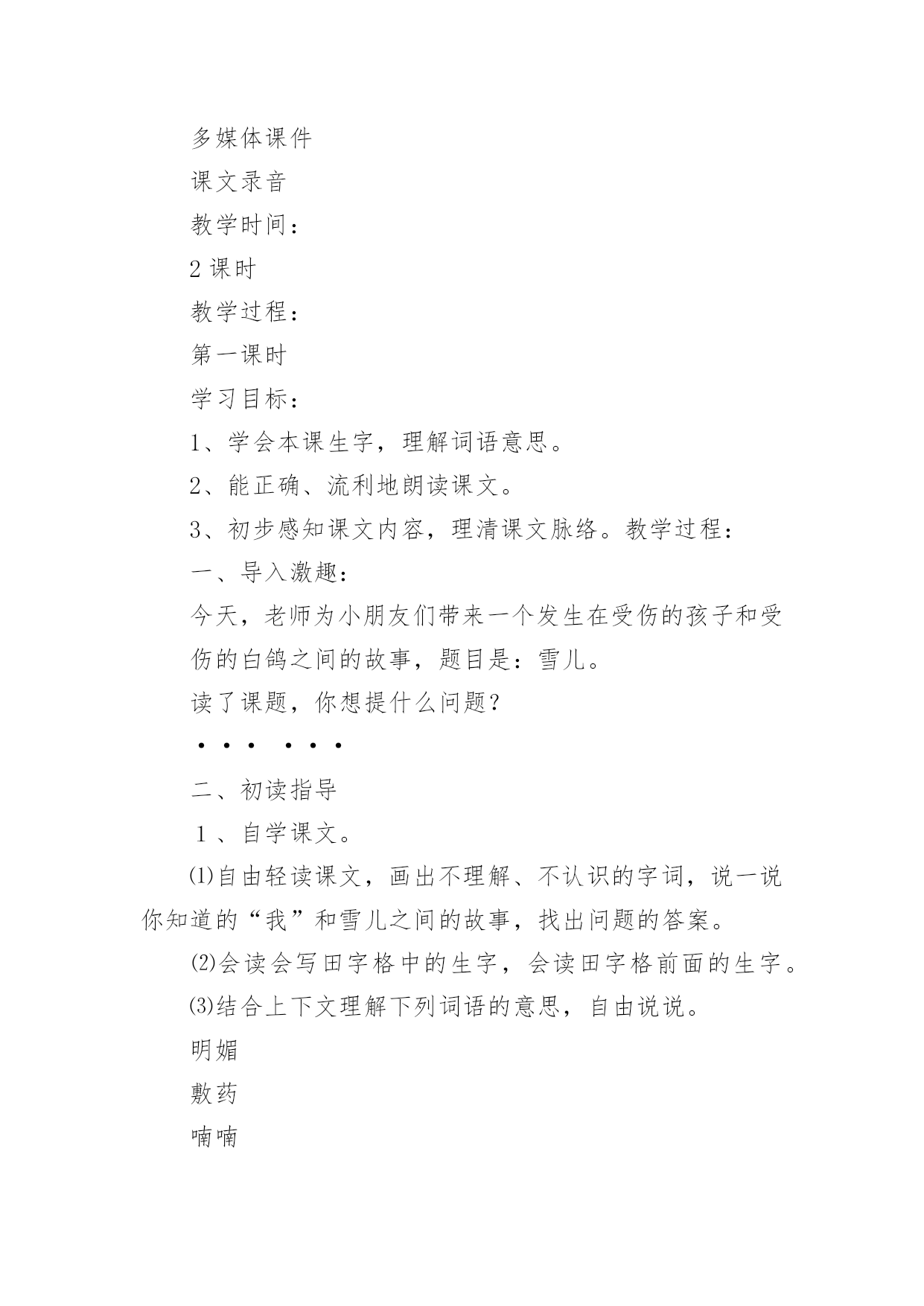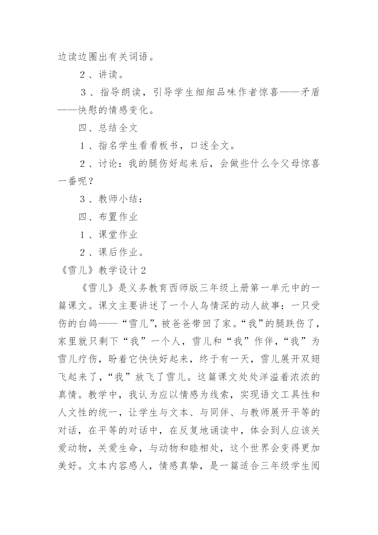 《雪儿》教学设计《雪儿》教学设计作为一名为他人授业解惑的教育工作者,很有必要精心设计一份教学设计,教学设计以计划和布局安排的形式,对怎样才能达到教学目标进行创造性的决策,以解决怎样教的问题。优秀的教学设计都具备一些什么特点呢?下面是小编精心整理的《雪儿》教学设计,欢迎阅读,希望大家能够喜欢。《雪儿》教学设计1教学要求1、学会本课生字,理解生字组成的词语。2、理解我对雪儿的感情,体会我的美好心灵和可爱形象。3、能正确、流利、有感情地朗读课文。教学时间两课时第一课时一、导入激趣今天,老师为小朋友们带来一个发生在受伤的孩子和受伤的白鸽之间的故事,题目是:雪儿。读了课题,你想提什么问题?二、初读指导1、自学课文。⑴自由轻读课文,画出不理解、不认识的字词,说一说你知道的我和雪儿之间的故事。⑵会读会写田字格中的生字,会读田字格前面的生字。⑶运用理解六法并结合上下文理解下列词语的意思。明媚敷药喃喃哀伤艰难险阻忠实盼着弧线施展2、教师检查纠正学生不良的学习习惯,帮助后进生自学。3、检查自学效果。⑴出示词语:⑵指名逐个读,指名学生从平翘舌音、前后鼻音、一字多音等方面区分,读准子音。⑶指名解词。明媚:鲜明艳丽。敷药:涂药、搽药。喃喃:小声叨唠。哀伤:非常悲伤。艰难险阻:繁重的困难和危险的阻挡。忠实:忠诚可靠。盼着:迫切地希望。弧线:圆周的一段,本文比喻白鸽飞行的轨迹。施展:发挥、显示。课文中还有一些词语在精读课文时去体会理解。⑷齐读生字词。⑸指导书写生字。三、理清脉络默读课文,按盼望——渴望——快慰把课文分成三个部分,并想想每部分讲了什么。学生自学讨论:四、精读第一部分1、导读。从第1自然段看,你能了解我是个什么样的人吗?从第2自然段看,我是怎么对待受伤的白鸽的.?2、讲读。⑴用○圈出第1自然段中表示情感的词。向往是什么意思?明媚的春光又是什么意思?你知道明媚的春光指哪些?我为什么非常向往明媚的春光?⑵爸爸捡回一只受伤的白鸽,什么样子?读一读这些语句,说说我当时的心情怎样。[用横线画出第2自然段中我对刚到家的小客人的做法。读一读,谁能概括一下?为何给它取名雪儿呢?这一系列的做法说明了什么?⑶过了几天,雪儿和我的关系怎样?具体表现是什么?飘飘悠悠可以换成哪个词?蓝天白云跟雪儿有什么关系?跟我又有什么关系?3、指导朗读。4、过渡:我的盼望有没有成为现实?请同学们课后预习下面的内容。五、布置作业1、课堂作业。⑴有钢笔描红。⑵读一读,比一比,再组词。2、课后作业第二课时一、复习导入1、听写生字词。2、指名口述故事的第一部分。3、我的盼望成为现实了吗?请看地第二部分。二、精读第二部分1、导读。我了解到雪儿有哪些本领?这使我的心情更加怎样?2、讲读。用波浪线画出并理解描写信鸽本领的词。用波浪线画出并理解表示信鸽品格的词。正因为信鸽有以上高超的本领、忠实的品格,人们称赞它是什么?也正因为如此,我的情感发生了什么变化?更盼着可以换成一个什么词?3、指导朗读。4、小结并过渡。三、精读第三部分1、导读。自由放声朗读第三部分,侃侃哪些动作能够作者的情感。边读边圈出有关词语。2、讲读。3、指导朗读,引导学生细细品味作者惊喜——矛盾——快慰的情感变化。四、总结全文1、指名学生看看板书,口述全文。2、讨论:我的腿伤好起来后,会做些什么令父母惊喜一番呢?3、教师小结:四、布置作业1、课堂作业2、课后作业。《雪儿》教学设计2《雪儿》是义务教育西师版三年级上册第一单元中的一篇课文。课文主要讲述了一个人鸟情深的动人故事:一只受伤的白鸽——“雪儿”,被爸爸带回了家。“我”的腿跌伤了,家里就只剩下“我”一个人,雪儿和“我”作伴,“我”为雪儿疗伤,盼着它快快好起来,终于有一天,雪儿展开双翅飞起来了,“我”放飞了雪儿。这篇课文处处洋溢着浓浓的真情。教学中,我认为应以情感为线索,实现语文工具性和人文性的统一,让学生与文本、与同伴、与教师展开平等的对话,在平等的对话中,在反复地诵读中,体会到人应该关爱动物,关爱生命,与动物和睦相处,这个世界会变得更加美好。文本内容感人,情感真挚,是一篇适合三年级学生阅读,并能从中感悟到人与动物和谐之美的好教材。根据教材特点和三年级学生已有的认知水平,我初定以下教学目标:1、能正确、流利、有感情地朗读课文,背诵课文第四、五自然段。2、学会本课10个生字,两条绿线内的4个字只识不写,能结合具体语境理解生字组成的词语。3、借助文本,感悟“我”对雪儿的感情,体会“我”的美好心灵和可爱形象。其中目标1和2是教学的重点,目标3既是教学的重点,又是教学的难点。为了较好的实践新课标的理念,达到教学目标完成的最优化效果,我预定两课时完成任务。第一课时,我准备安排“紧扣课题,导入新课”、“初读课文,整体感知”、“再读课文,了解内容”、“布置作业,巩固练习”四个基本环节。第一环