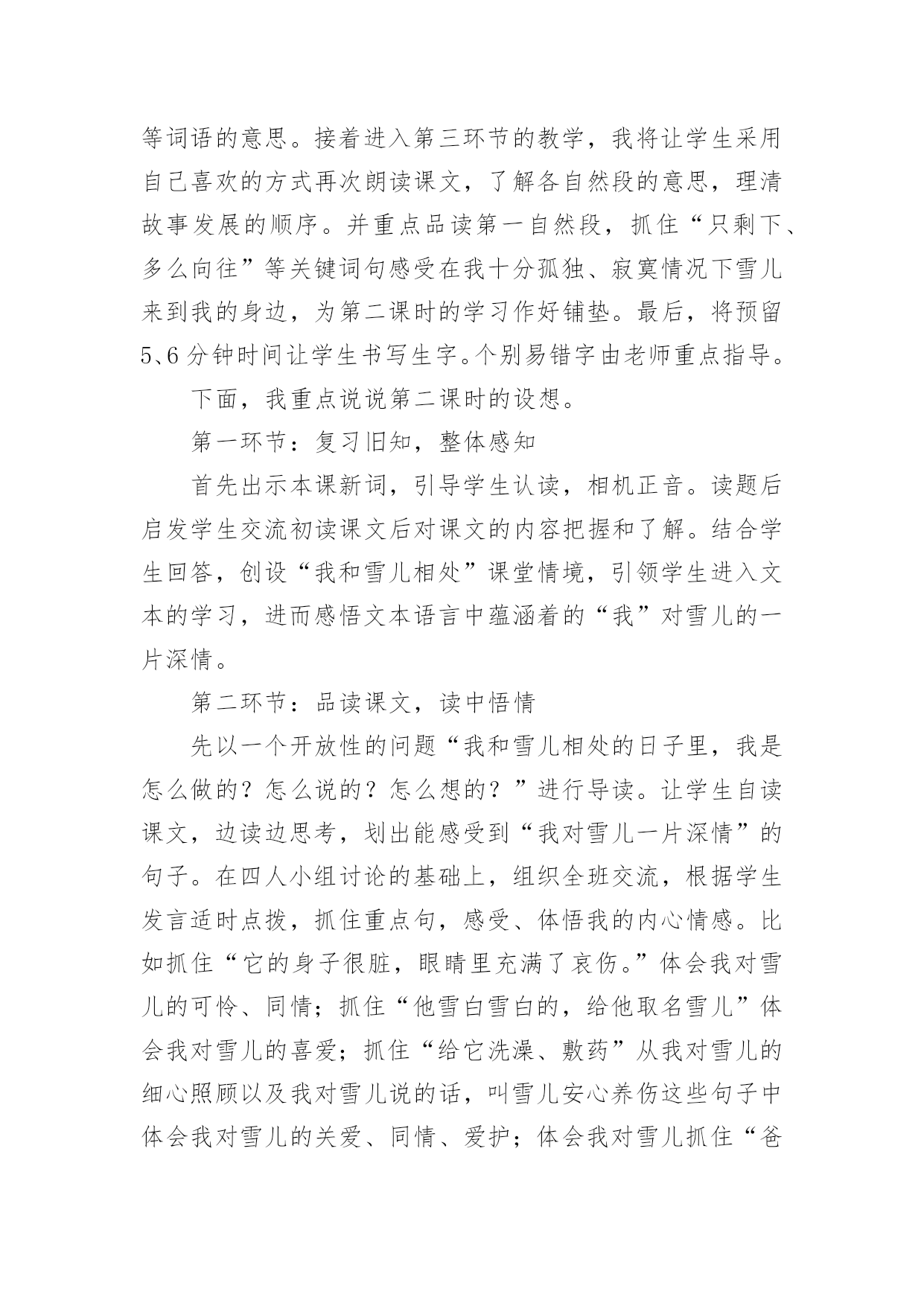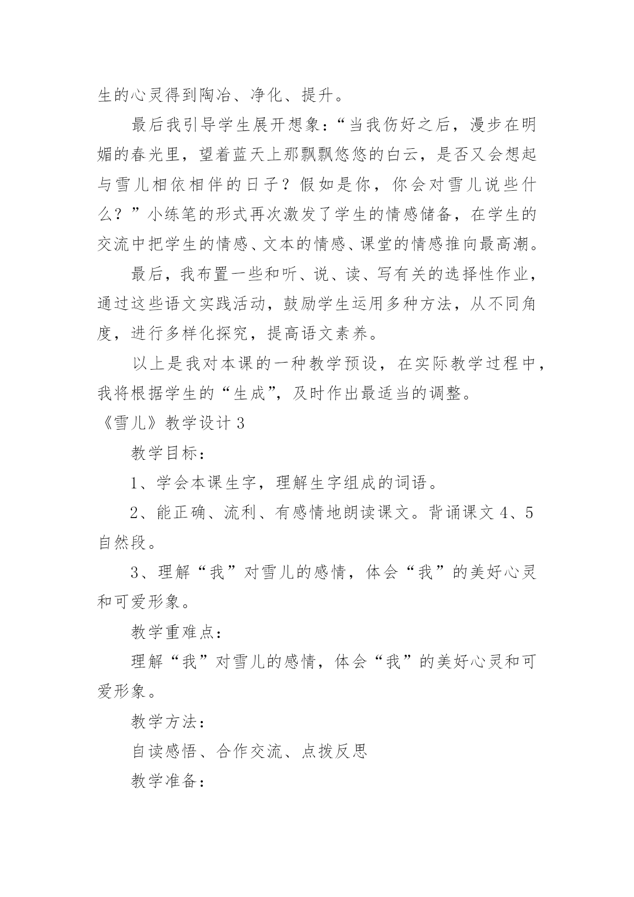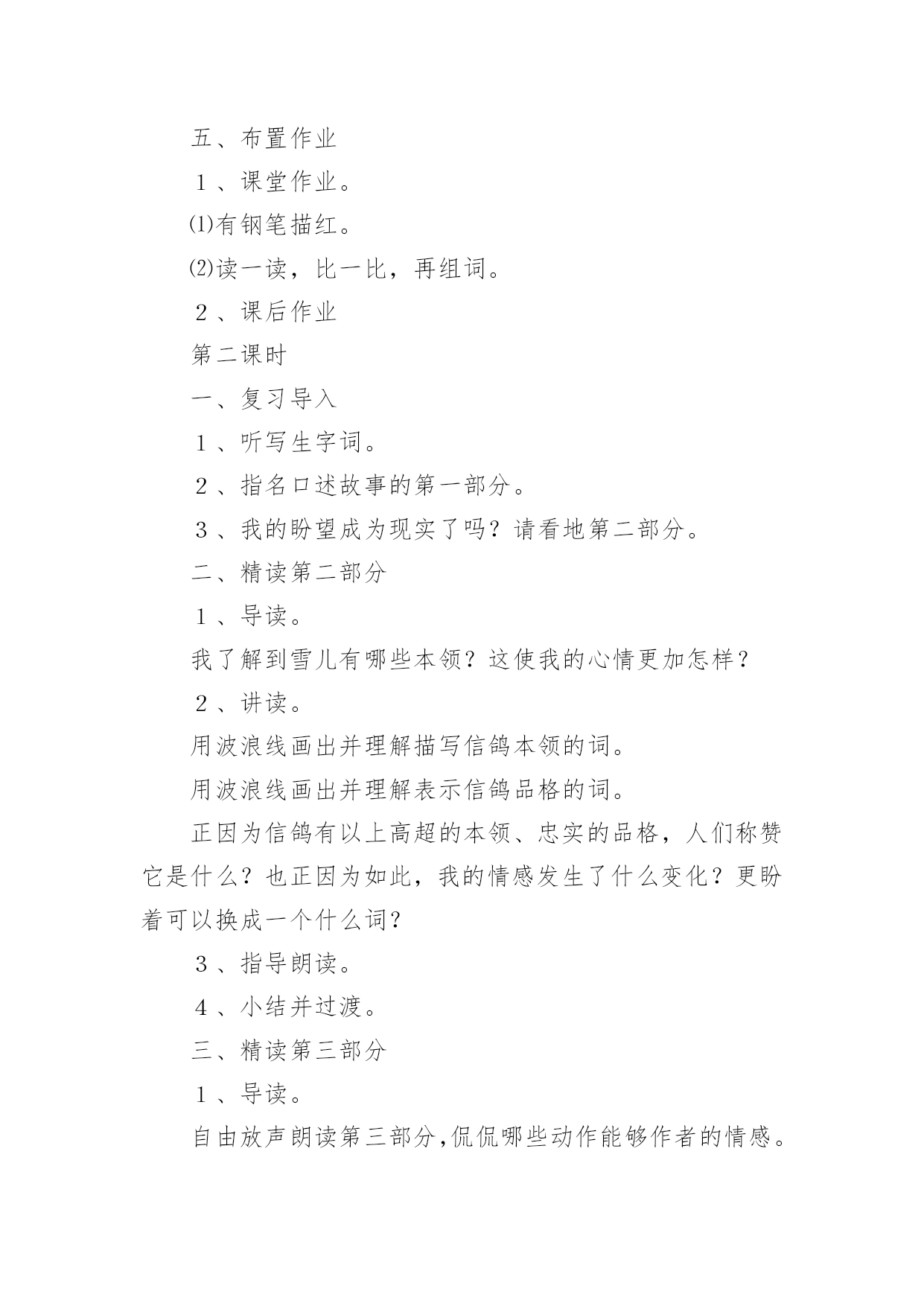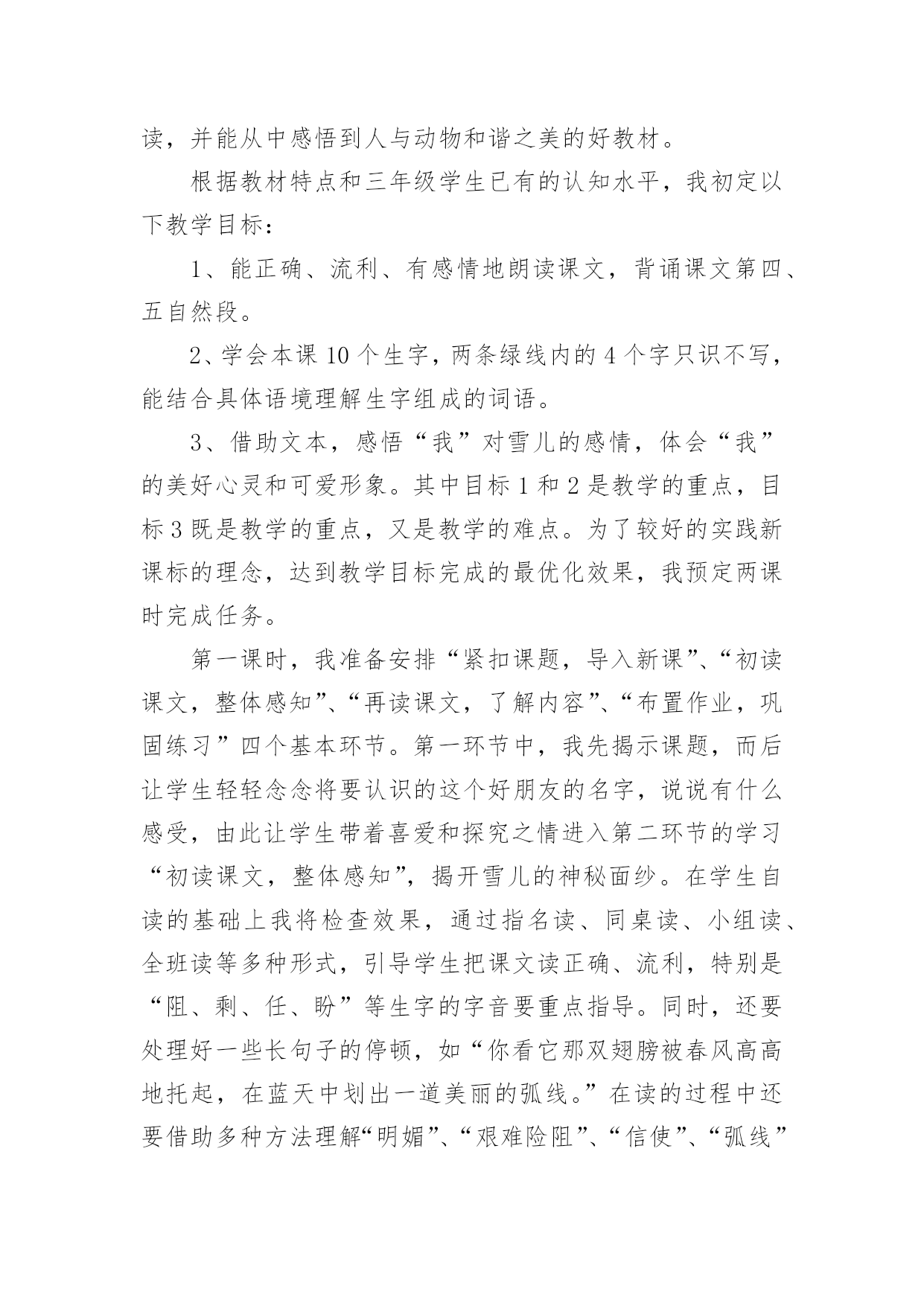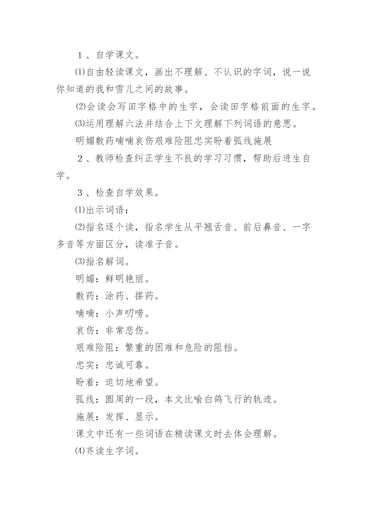 《雪儿》教学设计《雪儿》教学设计作为一名为他人授业解惑的教育工作者,很有必要精心设计一份教学设计,教学设计以计划和布局安排的形式,对怎样才能达到教学目标进行创造性的决策,以解决怎样教的问题。优秀的教学设计都具备一些什么特点呢?下面是小编精心整理的《雪儿》教学设计,欢迎阅读,希望大家能够喜欢。《雪儿》教学设计1教学要求1、学会本课生字,理解生字组成的词语。2、理解我对雪儿的感情,体会我的美好心灵和可爱形象。3、能正确、流利、有感情地朗读课文。教学时间两课时第一课时一、导入激趣今天,老师为小朋友们带来一个发生在受伤的孩子和受伤的白鸽之间的故事,题目是:雪儿。读了课题,你想提什么问题?二、初读指导1、自学课文。⑴自由轻读课文,画出不理解、不认识的字词,说一说你知道的我和雪儿之间的故事。⑵会读会写田字格中的生字,会读田字格前面的生字。⑶运用理解六法并结合上下文理解下列词语的意思。明媚敷药喃喃哀伤艰难险阻忠实盼着弧线施展2、教师检查纠正学生不良的学习习惯,帮助后进生自学。3、检查自学效果。⑴出示词语:⑵指名逐个读,指名学生从平翘舌音、前后鼻音、一字多音等方面区分,读准子音。⑶指名解词。明媚:鲜明艳丽。敷药:涂药、搽药。喃喃:小声叨唠。哀伤:非常悲伤。艰难险阻:繁重的困难和危险的阻挡。忠实:忠诚可靠。盼着:迫切地希望。弧线:圆周的一段,本文比喻白鸽飞行的轨迹。施展:发挥、显示。课文中还有一些词语在精读课文时去体会理解。⑷齐读生字词。⑸指导书写生字。三、理清脉络默读课文,按盼望——渴望——快慰把课文分成三个部分,并想想每部分讲了什么。学生自学讨论:四、精读第一部分1、导读。从第1自然段看,你能了解我是个什么样的人吗?从第2自然段看,我是怎么对待受伤的白鸽的.?2、讲读。⑴用○圈出第1自然段中表示情感的词。向往是什么意思?明媚的春光又是什么意思?你知道明媚的春光指哪些?我为什么非常向往明媚的春光?⑵爸爸捡回一只受伤的白鸽,什么样子?读一读这些语句,说说我当时的心情怎样。[用横线画出第2自然段中我对刚到家的小客人的做法。读一读,谁能概括一下?为何给它取名雪儿呢?这一系列的做法说明了什么?⑶过了几天,雪儿和我的关系怎样?具体表现是什么?飘飘悠悠可以换成哪个词?蓝天白云跟雪儿有什么关系?跟我又有什么关系?3、指导朗读。4、过渡:我的盼望有没有成为现实?请同学们课后预习下面的内容。五、布置作业1、课堂作业。⑴有钢笔描红。⑵读一读,比一比,再组词。2、课后作业第二课时一、复习导入1、听写生字词。2、指名口述故事的第一部分。3、我的盼望成为现实了吗?请看地第二部分。二、精读第二部分1、导读。我了解到雪儿有哪些本领?这使我的心情更加怎样?2、讲读。用波浪线画出并理解描写信鸽本领的词。用波浪线画出并理解表示信鸽品格的词。正因为信鸽有以上高超的本领、忠实的品格,人们称赞它是什么?也正因为如此,我的情感发生了什么变化?更盼着可以换成一个什么词?3、指导朗读。4、小结并过渡。三、精读第三部分1、导读。自由放声朗读第三部分,侃侃哪些动作能够作者的情感。边读边圈出有关词语。2、讲读。3、指导朗读,引导学生细细品味作者惊喜——矛盾——快慰的情感变化。四、总结全文1、指名学生看看板书,口述全文。2、讨论:我的腿伤好起来后,会做些什么令父母惊喜一番呢?3、教师小结:四、布置作业1、课堂作业2、课后作业。《雪儿》教学设计2《雪儿》是义务教育西师版三年级上册第一单元中的一篇课文。课文主要讲述了一个人鸟情深的动人故事:一只受伤的白鸽——“雪儿”,被爸爸带回了家。“我”的腿跌伤了,家里就只剩下“我”一个人,雪儿和“我”作伴,“我”为雪儿疗伤,盼着它快快好起来,终于有一天,雪儿展开双翅飞起来了,“我”放飞了雪儿。这篇课文处处洋溢着浓浓的真情。教学中,我认为应以情感为线索,实现语文工具性和人文性的统一,让学生与文本、与同伴、与教师展开平等的对话,在平等的对话中,在反复地诵读中,体会到人应该关爱动物,关爱生命,与动物和睦相处,这个世界会变得更加美好。文本内容感人,情感真挚,是一篇适合三年级学生阅读,并能从中感悟到人与动物和谐之美的好教材。根据教材特点和三年级学生已有的认知水平,我初定以下教学目标:1、能正确、流利、有感情地朗读课文,背诵课文第四、五自然段。2、学会本课10个生字,两条绿线内的4个字只识不写,能结合具体语境理解生字组成的词语。3、借助文本,感悟“我”对雪儿的感情,体会“我”的美好心灵和可爱形象。其中目标1和2是教学的重点,目标3既是教学的重点,又是教学的难点。为了较好的实践新课标的理念,达到教学目标完成的最优化效果,我预定两课时完成任务。第一课时,我准备安排“紧扣课题,导入新课”、“初读课文,整体感知”、“再读课文,了解内容”、“布置作业,巩固练习”四个基本环节。第一环
