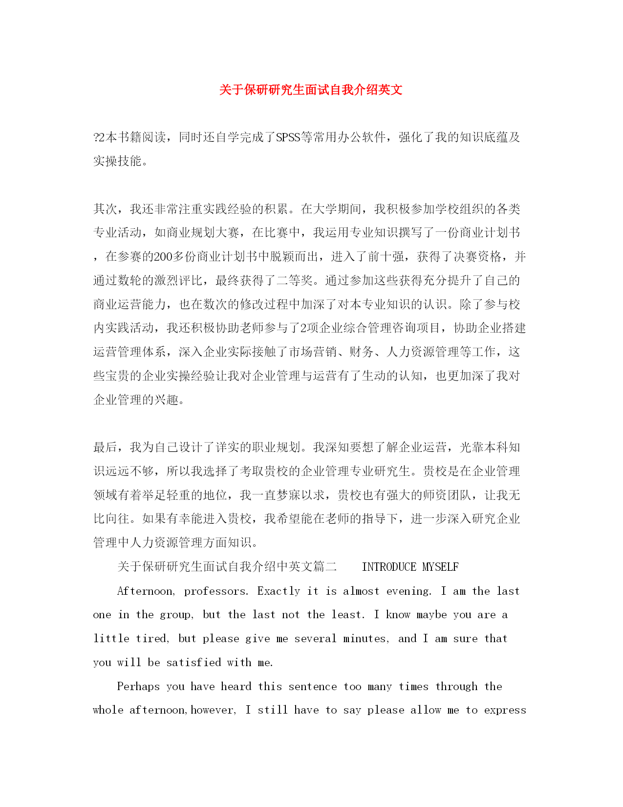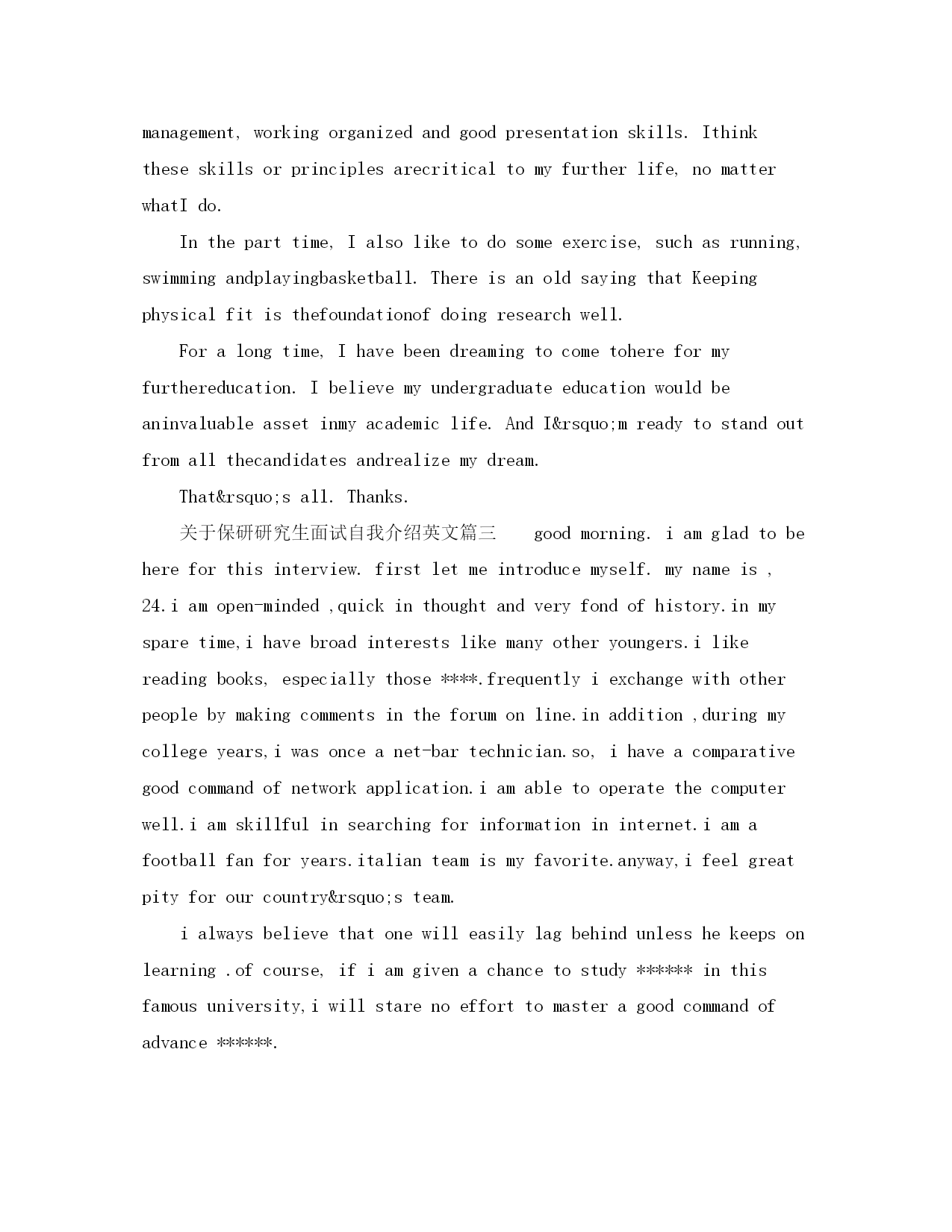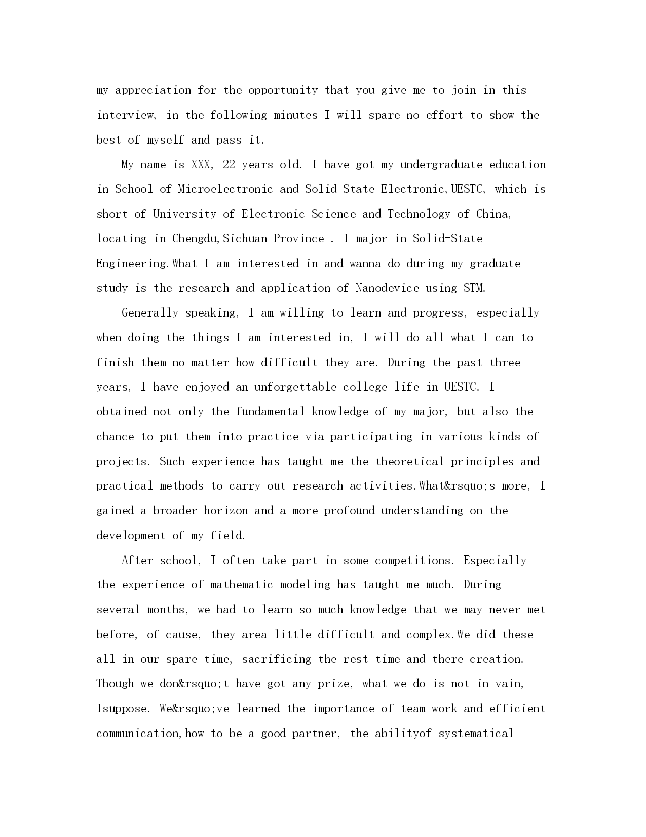 此资料由网络收集而来,如有侵权请告知上传者立即删除。资料共分享,我们负责传递知识。关于保研研究生面试自我介绍英文?2本书籍阅读,同时还自学完成了SPSS等常用办公软件,强化了我的知识底蕴及实操技能。其次,我还非常注重实践经验的积累。在大学期间,我积极参加学校组织的各类专业活动,如商业规划大赛,在比赛中,我运用专业知识撰写了一份商业计划书,在参赛的200多份商业计划书中脱颖而出,进入了前十强,获得了决赛资格,并通过数轮的激烈评比,最终获得了二等奖。通过参加这些获得充分提升了自己的商业运营能力,也在数次的修改过程中加深了对本专业知识的认识。除了参与校内实践活动,我还积极协助老师参与了2项企业综合管理咨询项目,协助企业搭建运营管理体系,深入企业实际接触了市场营销、财务、人力资源管理等工作,这些宝贵的企业实操经验让我对企业管理与运营有了生动的认知,也更加深了我对企业管理的兴趣。最后,我为自己设计了详实的职业规划。我深知要想了解企业运营,光靠本科知识远远不够,所以我选择了考取贵校的企业管理专业研究生。贵校是在企业管理领域有着举足轻重的地位,我一直梦寐以求,贵校也有强大的师资团队,让我无比向往。如果有幸能进入贵校,我希望能在老师的指导下,进一步深入研究企业管理中人力资源管理方面知识。关于保研研究生面试自我介绍中英文篇二INTRODUCEMYSELFAfternoon,professors.Exactlyitisalmostevening.Iamthelastoneinthegroup,butthelastnottheleast.Iknowmaybeyouarealittletired,butpleasegivemeseveralminutes,andIamsurethatyouwillbesatisfiedwithme.Perhapsyouhaveheardthissentencetoomanytimesthroughthewholeafternoon,however,Istillhavetosaypleaseallowmetoexpressmyappreciationfortheopportunitythatyougivemetojoininthisinterview,inthefollowingminutesIwillsparenoefforttoshowthebestofmyselfandpassit.MynameisXXX,22yearsold.IhavegotmyundergraduateeducationinSchoolofMicroelectronicandSolid-StateElectronic,UESTC,whichisshortofUniversityofElectronicScienceandTechnologyofChina,locatinginChengdu,SichuanProvince.ImajorinSolid-StateEngineering.WhatIaminterestedinandwannadoduringmygraduatestudyistheresearchandapplicationofNanodeviceusingSTM.Generallyspeaking,Iamwillingtolearnandprogress,especiallywhendoingthethingsIaminterestedin,IwilldoallwhatIcantofinishthemnomatterhowdifficulttheyare.Duringthepastthreeyears,IhaveenjoyedanunforgettablecollegelifeinUESTC.Iobtainednotonlythefundamentalknowledgeofmymajor,butalsothechancetoputthemintopracticeviaparticipatinginvariouskindsofprojects.Suchexperiencehastaughtmethetheoreticalprinciplesandpracticalmethodstocarryoutresearchactivities.What’smore,Igainedabroaderhorizonandamoreprofoundunderstandingonthedevelopmentofmyfield.Afterschool,Ioftentakepartinsomecompetitions.Especiallytheexperienceofmathematicmodelinghastaughtme