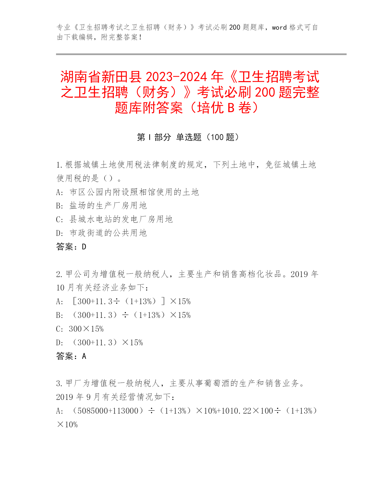湖南省新田县2023-2024年《卫生招聘考试之卫生招聘(财务)》考试必刷200题完整题库附答案(培优B卷)
