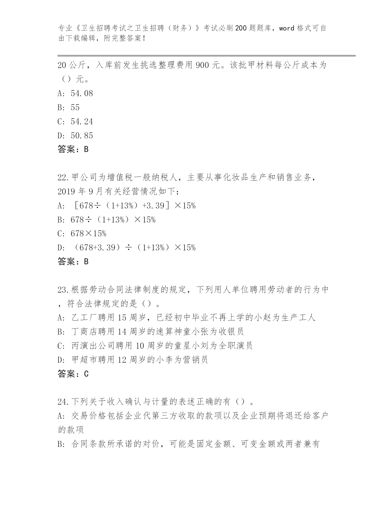2024年湖南省珠晖区《卫生招聘考试之卫生招聘(财务)》考试必刷200题题库(培优B卷)