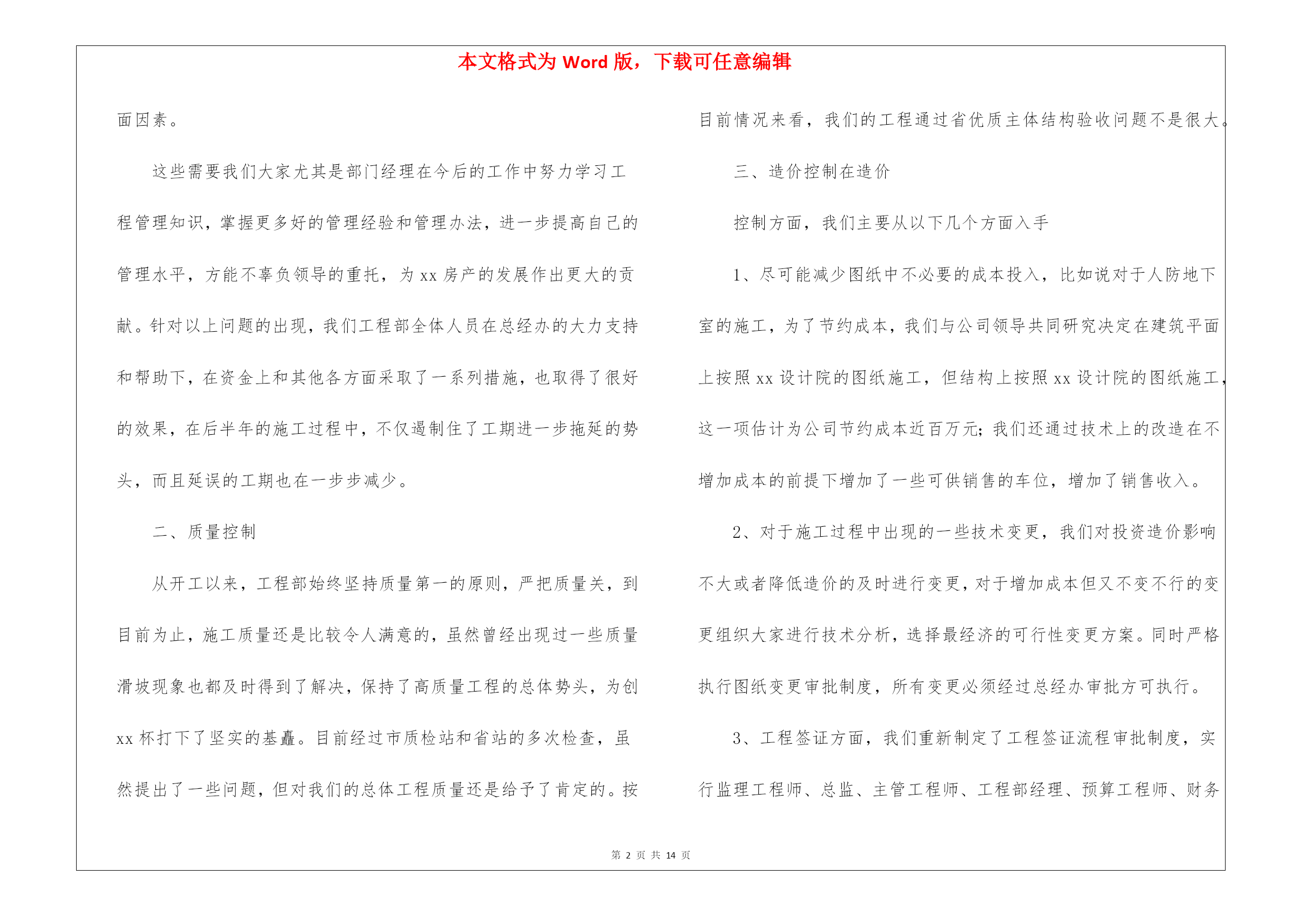 本文格式为Word版,下载可任意编辑第PAGE\*MERGEFORMAT14页共NUMPAGES\*MERGEFORMAT14页工程技术人员个人工作总结工程技术人员个人工作总结总结是对某一阶段的工作、学习或思想中的经验或情况进行分析研究的书面材料,它在我们的学习、工作中起到呈上启下的作用,不如我们来制定一份总结吧。总结一般是怎么写的呢?下面是我精心整理的工程技术人员个人工作总结,欢迎阅读与收藏。工程技术人员个人工作总结1转眼间,20xx年已经过去,现从以下几个方面将本人一年来工程部的工作情况做一总结。一、进度控制按照年初公司制定的工程进度要求,主体工程应在xx月底完成,实际截止到年底,主体工程全部完成,砌体工程完成xx%,比原预定工期平均延误xx个月。工期延误的主要原因在以下三个方面:1、我们事先对该工程的难度估计不足,合同工期过于紧张。本工程定额工期应该在xx天,但我们把工期压缩到了xx天,这个工期只有在理想化的情况下才有可能按计划完成,但该工程由于难度较大,任何一个事先未预料到的情况出现都有可能造成工期的延误并有可能产生连锁反应。2、我们事先对施工单位的实际实力估计不足。两家施工单位都属于承包责任制,施工单位收取承包人的管理费用,工程的资金投入和管理人员的配置由承包人负责,施工单位不给承包人任何资金支持和人员支持,同时也缺乏必要的管理方面的支持,存在以包代管现象。3、我们自身管理上的问题:工程部尤其是部门经理对于施工单位工期的延误,虽然采取了一系列的积极措施,但是力度不够,对于一些问题的处理尤其是施工单位人员的严重缺乏和材料的不及时供应缺乏足够有效的管理措施和应变措施,这也是导致工期拖延的一方面因素。这些需要我们大家尤其是部门经理在今后的工作中努力学习工程管理知识,掌握更多好的管理经验和管理办法,进一步提高自己的管理水平,方能不辜负领导的重托,为xx房产的发展作出更大的贡献。针对以上问题的出现,我们工程部全体人员在总经办的大力支持和帮助下,在资金上和其他各方面采取了一系列措施,也取得了很好的效果,在后半年的施工过程中,不仅遏制住了工期进一步拖延的势头,而且延误的工期也在一步步减少。二、质量控制从开工以来,工程部始终坚持质量第一的原则,严把质量关,到目前为止,施工质量还是比较令人满意的,虽然曾经出现过一些质量滑坡现象也都及时得到了解决,保持了高质量工程的总体势头,为创xx杯打下了坚实的基矗。目前经过市质检站和省站的多次检查,虽然提出了一些问题,但对我们的总体工程质量还是给予了肯定的。按目前情况来看,我们的工程通过省优质主体结构验收问题不是很大。三、造价控制在造价控制方面,我们主要从以下几个方面入手1、尽可能减少图纸中不必要的成本投入,比如说对于人防地下室的施工,为了节约成本,我们与公司领导共同研究决定在建筑平面上按照xx设计院的图纸施工,但结构上按照xx设计院的图纸施工,这一项估计为公司节约成本近百万元;我们还通过技术上的改造在不增加成本的前提下增加了一些可供销售的车位,增加了销售收入。2、对于施工过程中出现的一些技术变更,我们对投资造价影响不大或者降低造价的及时进行变更,对于增加成本但又不变不行的变更组织大家进行技术分析,选择最经济的可行性变更方案。同时严格执行图纸变更审批制度,所有变更必须经过总经办审批方可执行。3、工程签证方面,我们重新制定了工程签证流程审批制度,实行监理工程师、总监、主管工程师、工程部经理、预算工程师、财务部经理、总经办七级审批,层层把关,对于不应该支付的签证坚决退回,对于确实发生并应该支付的签证进行严格的费用审核,杜绝此项费用的不合理支出。四、现场安全文明施工由于本项目的目标是省级文明工地,所以我们对于现场的安全文明施工也给予了足够的重视,前期由于条件所限,现场的文明施工无法做得很好,后期我们针对现场文明施工下大力气抓,并取得了良好效果。目前经过盛市安检站的多次检查,近期有望通过省级文明工地的验收。五、对监理公司的管理总的来说,我们对监理公司的管理是存在一定问题的,主要是缺乏强硬的手腕,没有严格按照合同要求监理公司相关人员到岗,导致监理人员总体素质偏低,最后我们工程部不得不花很多精力去帮助监理公司完成本应由监理完成的工作,虽然在我们的共同努力下基本圆满地完成了工作,但相应的加大了工程部同志们的劳动强度。但从另一方面来讲,我们应该意识到,为什么监理单位派驻工地的人员整体素质偏低呢?究其原因我们认为还是监理费用过低,监理费用低了派过来的监理人员的工资就会很低xx/月),工资低的监理人员素质一定是偏低的。工程技术人员个人工作总结2转眼间,辞旧迎新、平凡而又不太忙碌的一年已到尽头,不知不觉时间过的真快,悄然无息、xx年的日历即将翻过去。伴随着时代前进的步伐、回首自己一年来经历的风雨路程、