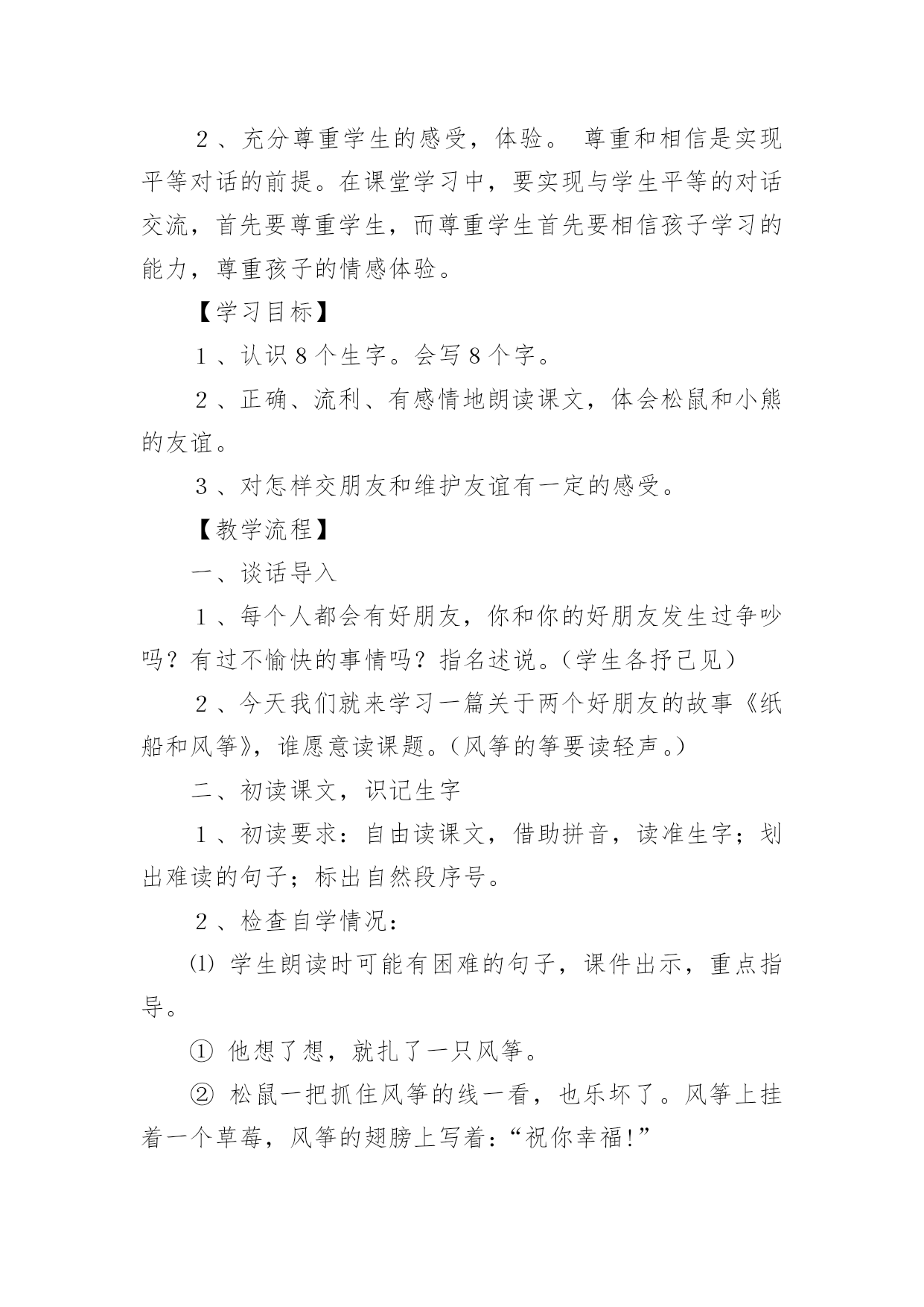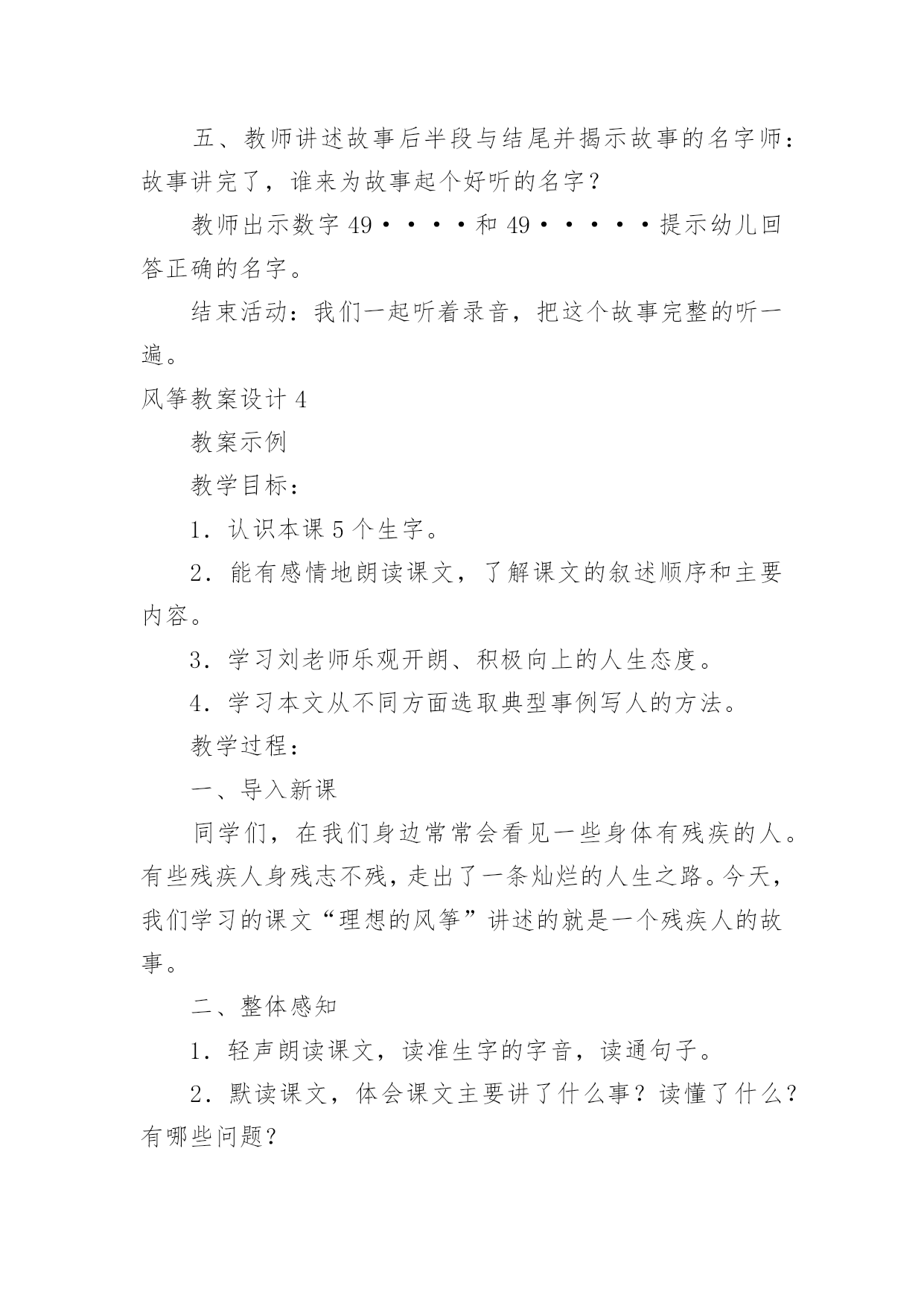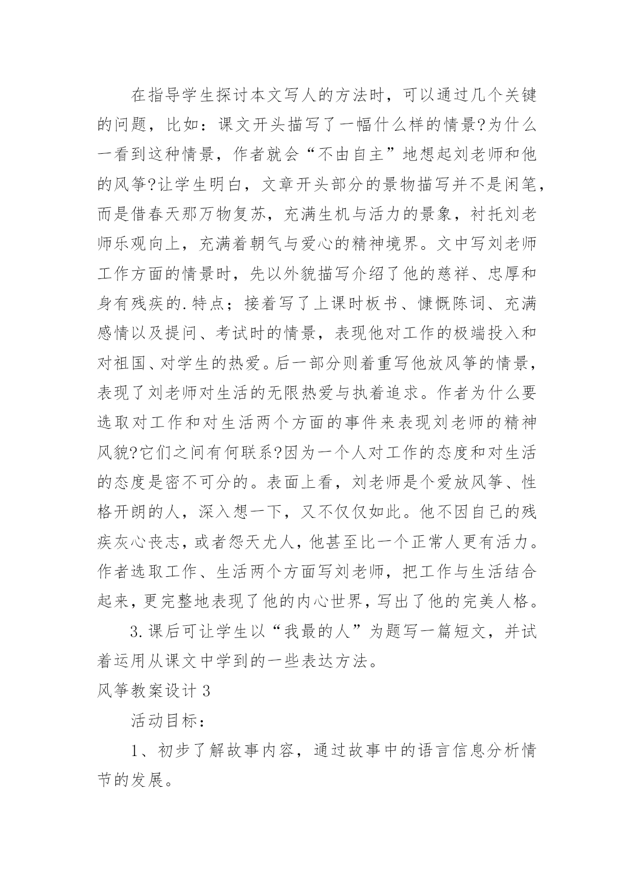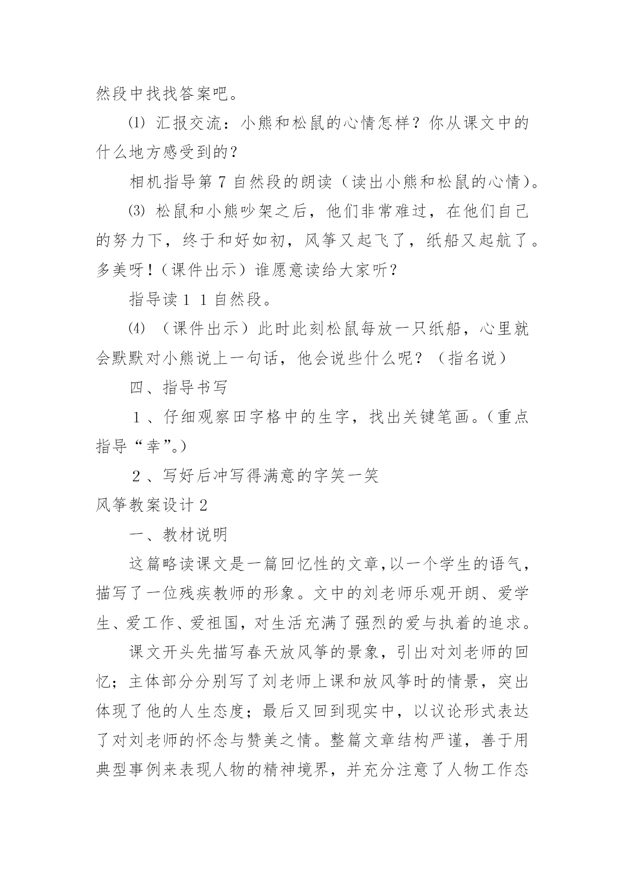 风筝教案设计风筝教案设计作为一位杰出的教职工,时常要开展教案准备工作,教案是教材及大纲与课堂教学的纽带和桥梁。那么什么样的教案才是好的呢?下面是小编精心整理的风筝教案设计,仅供参考,大家一起来看看吧。风筝教案设计1【教材简析】《纸船和风筝》是一个感人至深的故事。纸船和风筝带着问候,带着祝福,带着谅解,带着浓浓的真情,在山顶和山脚架起了一座七彩的友谊长桥。纸船和风筝让松鼠和小熊成了好朋友,成了维系、发展他们友谊的纽带。故事的动人之处在于,当松鼠和小熊因为一点小事吵了一架之后,他们表现出的内心的失落和难忍的痛苦,以及修补“裂缝”的独特的方式和感人场面。只要我们带着一颗童心,带着对真挚友情的`向往,去朗读这篇课文,就一定会受到深深的感染。【设计理念】1、《语文课程标准》指出:“阅读是学生个性化的行为,不应以教师的分析来代替学生的阅读实践。”所以本课教学以读为主,引导学生在读中悟。2、充分尊重学生的感受,体验。尊重和相信是实现平等对话的前提。在课堂学习中,要实现与学生平等的对话交流,首先要尊重学生,而尊重学生首先要相信孩子学习的能力,尊重孩子的情感体验。【学习目标】1、认识8个生字。会写8个字。2、正确、流利、有感情地朗读课文,体会松鼠和小熊的友谊。3、对怎样交朋友和维护友谊有一定的感受。【教学流程】一、谈话导入1、每个人都会有好朋友,你和你的好朋友发生过争吵吗?有过不愉快的事情吗?指名述说。(学生各抒己见)2、今天我们就来学习一篇关于两个好朋友的故事《纸船和风筝》,谁愿意读课题。(风筝的筝要读轻声。)二、初读课文,识记生字1、初读要求:自由读课文,借助拼音,读准生字;划出难读的句子;标出自然段序号。2、检查自学情况:⑴学生朗读时可能有困难的句子,课件出示,重点指导。①他想了想,就扎了一只风筝。②松鼠一把抓住风筝的线一看,也乐坏了。风筝上挂着一个草莓,风筝的翅膀上写着:“祝你幸福!”③可是有一天,他们俩为了一件小事吵了一架。④过了几天,松鼠再也受不了啦。⑵检查学生识记生字的情况。课件出示:扎、坏、抓、莓、幸福、受、吵具体操作:指名学生当小老师领读生字。三、学习课文,感悟体会1、学习1~6自然段:⑴请同学们自由读1~6自然段,然后按照——当我读到()时,我觉得很(),因为()。⑵学生交流读后的感受,随机进行第3、第5自然段的朗读指导。具体操作:借助课件让学生体会小熊和松鼠快乐的心情,再指导朗读,并理解词语“乐坏了”。⑶松鼠和小熊是怎样成为好朋友的?引导学生小结。课件演示过程。师:松鼠和小熊成了好朋友,他们乐坏了,那我们就在音乐中去体会快乐吧!挺起腰来,看谁读得最幸福、最快乐。生在音乐伴奏下齐读1~6自然段。过渡:纸船和风筝让松鼠和小熊成为好朋友,正当他们沉浸在幸福和快乐中时,这快乐却没有了,因为他们吵了一架,从此,山顶上再也看不到飘荡的风筝,小溪里在也再也看不到漂流的纸船了。2、学习7~11自然段:⑴这时,小熊和松鼠的心情是怎样的?到7~11自然段中找找答案吧。⑴汇报交流:小熊和松鼠的心情怎样?你从课文中的什么地方感受到的?相机指导第7自然段的朗读(读出小熊和松鼠的心情)。⑶松鼠和小熊吵架之后,他们非常难过,在他们自己的努力下,终于和好如初,风筝又起飞了,纸船又起航了。多美呀!(课件出示)谁愿意读给大家听?指导读11自然段。⑷(课件出示)此时此刻松鼠每放一只纸船,心里就会默默对小熊说上一句话,他会说些什么呢?(指名说)四、指导书写1、仔细观察田字格中的生字,找出关键笔画。(重点指导“幸”。)2、写好后冲写得满意的字笑一笑风筝教案设计2一、教材说明这篇略读课文是一篇回忆性的文章,以一个学生的语气,描写了一位残疾教师的形象。文中的刘老师乐观开朗、爱学生、爱工作、爱祖国,对生活充满了强烈的爱与执着的追求。课文开头先描写春天放风筝的景象,引出对刘老师的回忆;主体部分分别写了刘老师上课和放风筝时的情景,突出体现了他的人生态度;最后又回到现实中,以议论形式表达了对刘老师的怀念与赞美之情。整篇文章结构严谨,善于用典型事例来表现人物的精神境界,并充分注意了人物工作态度和生活态度之间的联系,使这两方面的典型事例能相映生辉,互为例证,共同展现人物的精神风貌。选编这篇课文,首先是要学生体会、学习刘老师对人生积极乐观的态度和顽强执着的精神,其次是学习本文运用各方面典型事例来表现人物精神境界的表达方法。本课学习的重点是了解课文通过哪两方面的典型事例来表现人物的精神境界;难点是理解两方面事例之间的关系,明白一个人的生活态度与工作态度是紧密联系的,选取了两方面的事例来写人,才能更全面地展现人物的内心世界。二、学习目标1.认识本课5个生字。2.能有感情地朗读课文,了解课文的叙述顺序和主要内容。3.学习刘老师乐观开朗、积极向上的人生态度。4.学习本文从不同方面选取典