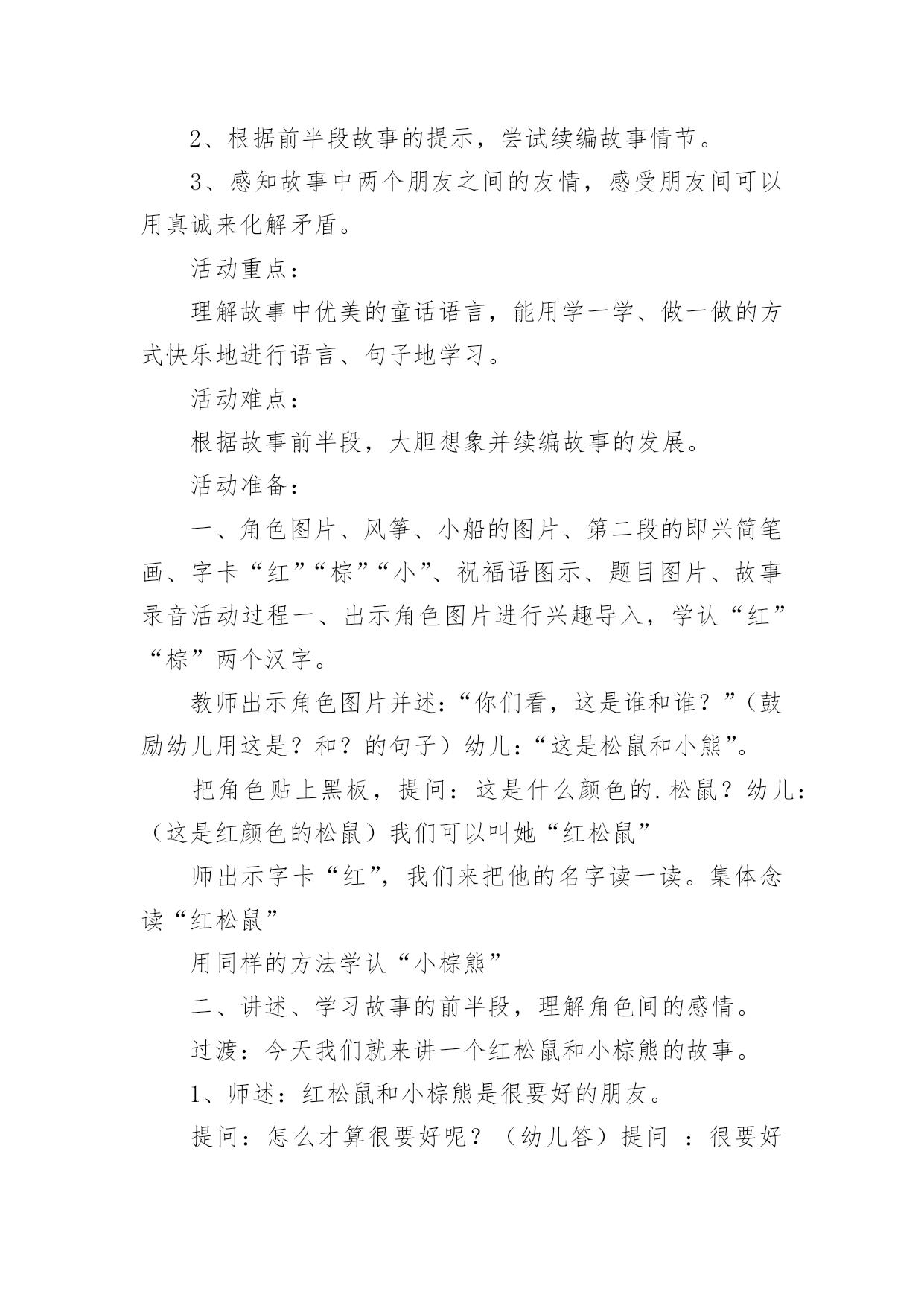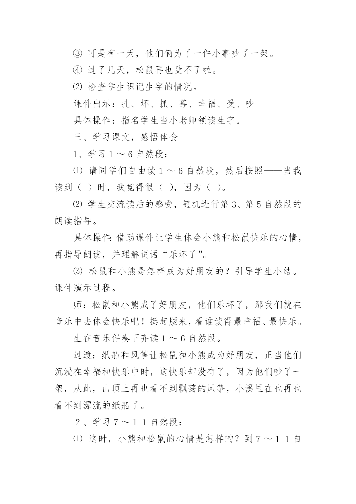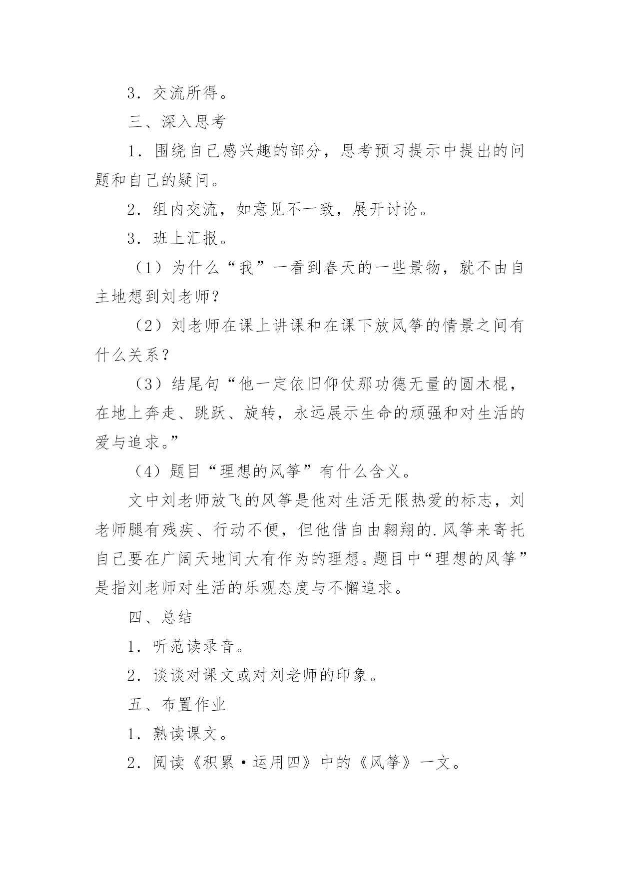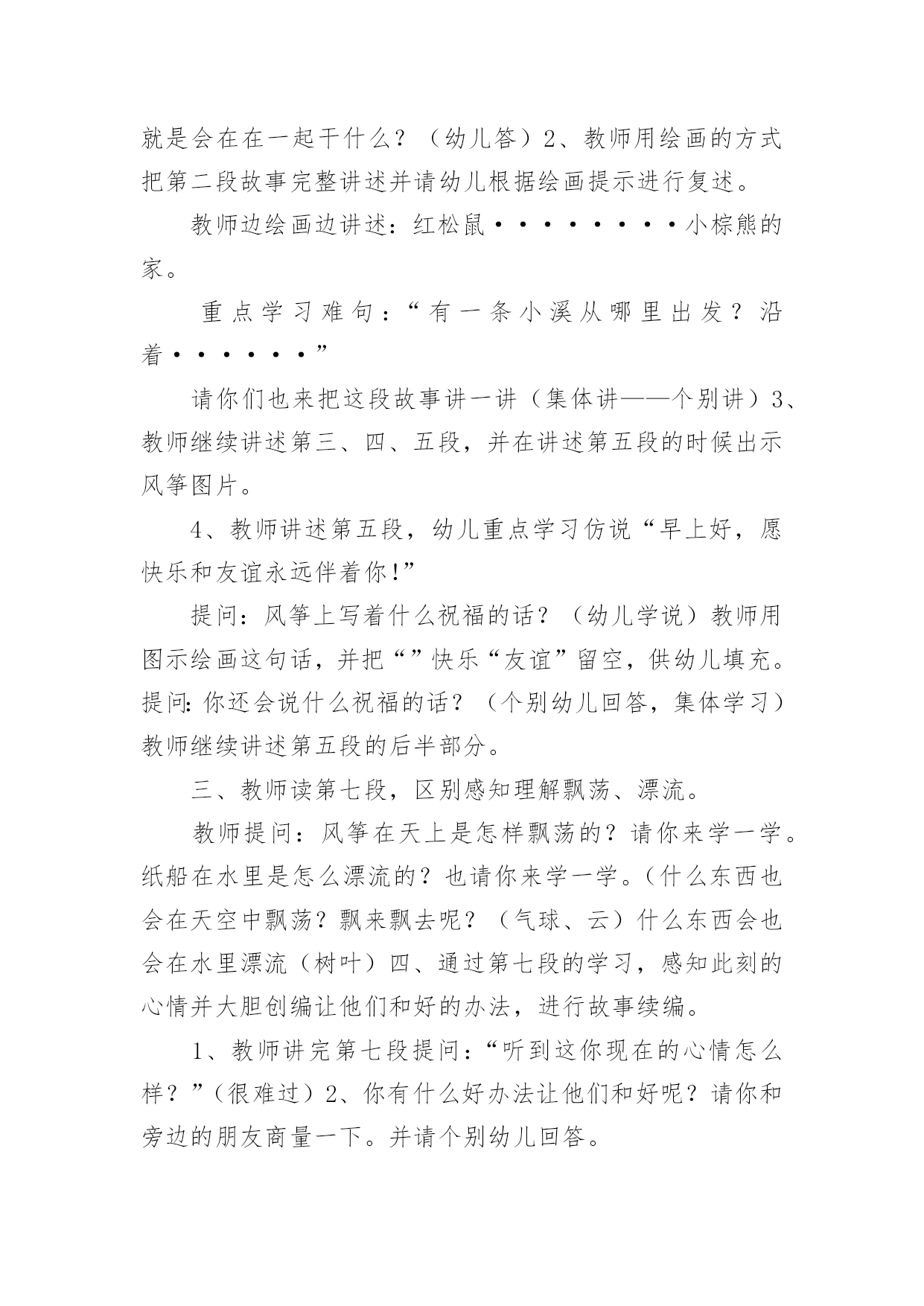 风筝教案设计风筝教案设计作为一位杰出的教职工,时常要开展教案准备工作,教案是教材及大纲与课堂教学的纽带和桥梁。那么什么样的教案才是好的呢?下面是小编精心整理的风筝教案设计,仅供参考,大家一起来看看吧。风筝教案设计1【教材简析】《纸船和风筝》是一个感人至深的故事。纸船和风筝带着问候,带着祝福,带着谅解,带着浓浓的真情,在山顶和山脚架起了一座七彩的友谊长桥。纸船和风筝让松鼠和小熊成了好朋友,成了维系、发展他们友谊的纽带。故事的动人之处在于,当松鼠和小熊因为一点小事吵了一架之后,他们表现出的内心的失落和难忍的痛苦,以及修补“裂缝”的独特的方式和感人场面。只要我们带着一颗童心,带着对真挚友情的`向往,去朗读这篇课文,就一定会受到深深的感染。【设计理念】1、《语文课程标准》指出:“阅读是学生个性化的行为,不应以教师的分析来代替学生的阅读实践。”所以本课教学以读为主,引导学生在读中悟。2、充分尊重学生的感受,体验。尊重和相信是实现平等对话的前提。在课堂学习中,要实现与学生平等的对话交流,首先要尊重学生,而尊重学生首先要相信孩子学习的能力,尊重孩子的情感体验。【学习目标】1、认识8个生字。会写8个字。2、正确、流利、有感情地朗读课文,体会松鼠和小熊的友谊。3、对怎样交朋友和维护友谊有一定的感受。【教学流程】一、谈话导入1、每个人都会有好朋友,你和你的好朋友发生过争吵吗?有过不愉快的事情吗?指名述说。(学生各抒己见)2、今天我们就来学习一篇关于两个好朋友的故事《纸船和风筝》,谁愿意读课题。(风筝的筝要读轻声。)二、初读课文,识记生字1、初读要求:自由读课文,借助拼音,读准生字;划出难读的句子;标出自然段序号。2、检查自学情况:⑴学生朗读时可能有困难的句子,课件出示,重点指导。①他想了想,就扎了一只风筝。②松鼠一把抓住风筝的线一看,也乐坏了。风筝上挂着一个草莓,风筝的翅膀上写着:“祝你幸福!”③可是有一天,他们俩为了一件小事吵了一架。④过了几天,松鼠再也受不了啦。⑵检查学生识记生字的情况。课件出示:扎、坏、抓、莓、幸福、受、吵具体操作:指名学生当小老师领读生字。三、学习课文,感悟体会1、学习1~6自然段:⑴请同学们自由读1~6自然段,然后按照——当我读到()时,我觉得很(),因为()。⑵学生交流读后的感受,随机进行第3、第5自然段的朗读指导。具体操作:借助课件让学生体会小熊和松鼠快乐的心情,再指导朗读,并理解词语“乐坏了”。⑶松鼠和小熊是怎样成为好朋友的?引导学生小结。课件演示过程。师:松鼠和小熊成了好朋友,他们乐坏了,那我们就在音乐中去体会快乐吧!挺起腰来,看谁读得最幸福、最快乐。生在音乐伴奏下齐读1~6自然段。过渡:纸船和风筝让松鼠和小熊成为好朋友,正当他们沉浸在幸福和快乐中时,这快乐却没有了,因为他们吵了一架,从此,山顶上再也看不到飘荡的风筝,小溪里在也再也看不到漂流的纸船了。2、学习7~11自然段:⑴这时,小熊和松鼠的心情是怎样的?到7~11自然段中找找答案吧。⑴汇报交流:小熊和松鼠的心情怎样?你从课文中的什么地方感受到的?相机指导第7自然段的朗读(读出小熊和松鼠的心情)。⑶松鼠和小熊吵架之后,他们非常难过,在他们自己的努力下,终于和好如初,风筝又起飞了,纸船又起航了。多美呀!(课件出示)谁愿意读给大家听?指导读11自然段。⑷(课件出示)此时此刻松鼠每放一只纸船,心里就会默默对小熊说上一句话,他会说些什么呢?(指名说)四、指导书写1、仔细观察田字格中的生字,找出关键笔画。(重点指导“幸”。)2、写好后冲写得满意的字笑一笑风筝教案设计2一、教材说明这篇略读课文是一篇回忆性的文章,以一个学生的语气,描写了一位残疾教师的形象。文中的刘老师乐观开朗、爱学生、爱工作、爱祖国,对生活充满了强烈的爱与执着的追求。课文开头先描写春天放风筝的景象,引出对刘老师的回忆;主体部分分别写了刘老师上课和放风筝时的情景,突出体现了他的人生态度;最后又回到现实中,以议论形式表达了对刘老师的怀念与赞美之情。整篇文章结构严谨,善于用典型事例来表现人物的精神境界,并充分注意了人物工作态度和生活态度之间的联系,使这两方面的典型事例能相映生辉,互为例证,共同展现人物的精神风貌。选编这篇课文,首先是要学生体会、学习刘老师对人生积极乐观的态度和顽强执着的精神,其次是学习本文运用各方面典型事例来表现人物精神境界的表达方法。本课学习的重点是了解课文通过哪两方面的典型事例来表现人物的精神境界;难点是理解两方面事例之间的关系,明白一个人的生活态度与工作态度是紧密联系的,选取了两方面的事例来写人,才能更全面地展现人物的内心世界。二、学习目标1.认识本课5个生字。2.能有感情地朗读课文,了解课文的叙述顺序和主要内容。3.学习刘老师乐观开朗、积极向上的人生态度。4.学习本文从不同方面选取典