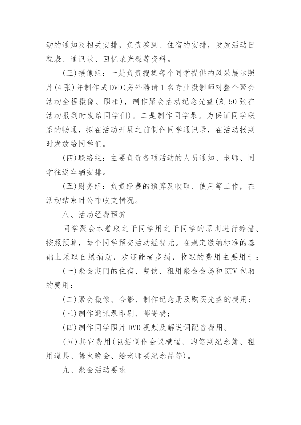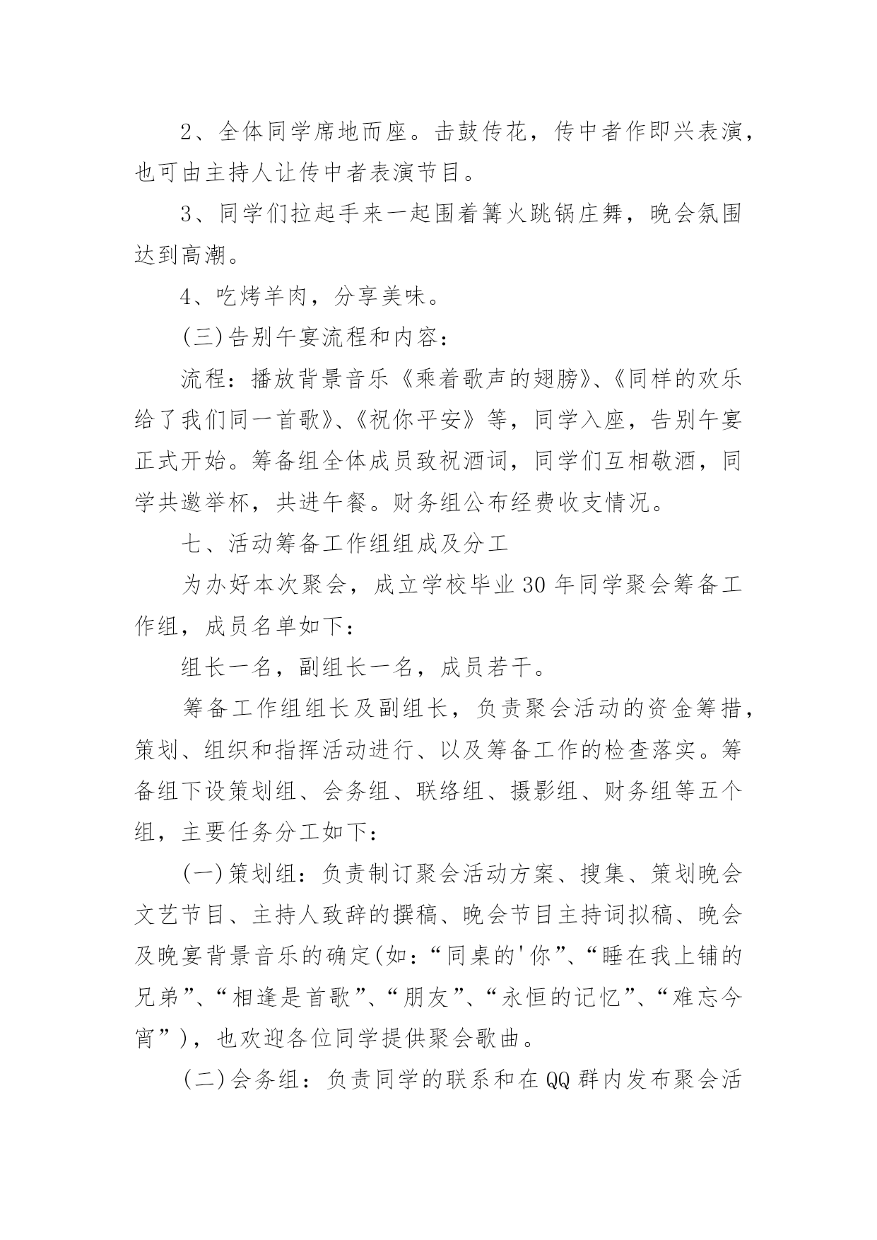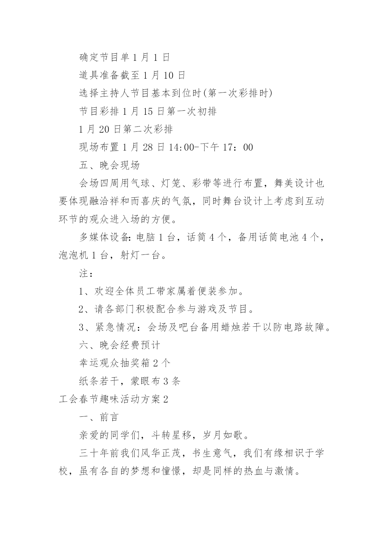 工会春节趣味活动方案工会春节趣味活动方案为了确保事情或工作科学有序进行,就常常需要事先准备方案,方案是计划中内容最为复杂的一种。方案要怎么制定呢?以下是小编为大家收集的工会春节趣味活动方案,欢迎阅读,希望大家能够喜欢。工会春节趣味活动方案1一、【晚会目的及意义】太阳每天都是新的,象征着希望的诞生;而我们X(单位)即将迎来希望的20xx年,期待着在20xx年全员成长与公司业绩百尺竿头更进一步!所谓好的开始乃成功的一半,我们将之寄于“20xx年联欢晚会”,唤起X(单位)挑战来年,奋发向上,开拓进取,的更大决心!二、【晚会主题】联欢晚会的主题是“中华全家福,祥龙贺新春”。通过在本次晚会。在和谐的,快乐的氛围中表达企业对员工的关怀与问候,使员工开开心心、快快乐乐的过好20xx年春节。增强员工的归属感,期待着员工们能积极地愉快地在新的一年里爱岗敬业。三、【晚会形式及内容】节目设置上总体迎合各年龄层次观众的口味,以年轻化为主,并要求节目形式以及总体设计上的新颖,这是本次晚会筹备的首要任务。同时要采用一些传统的节目,丰富本次晚会的节目形式,使本次晚会定位于流行、参与、互动结心都强的公司员工。主持人数量在4个以下,组成风格和组成方式不限。主持人用语必须在晚会前二周经过晚会策划组的审查。于1月14到位4、现场布置负责人:餐饮部做好晚会的场地布置工作,场地布置人员须参加当晚的发放小礼品,记录获奖名单,拿道具等一切有关晚会的服务性工作。于1月27日到位5、活动物品采购负责人:由计划财务部负责本次晚会的食品,礼品,道具等物品的采购于1月25日到位5、节目编排负责:联欢晚会的节目编排,并要保证节目的高质量。节目单要在1月1日上报到晚会节目策划组。彩排时,各节目带上与节目的CD配音。6、通知晚会贵宾负责人:7、演员化妆由人事部现购买化妆品,请人/有经验的公司员工自行化妆,节目主持人专业化妆。8、DV拍摄由酒店DJ人员负责:主要控制当晚DV拍摄的内容、方式,确保晚会现场的整个过程不漏拍,拍摄角度多样,保证录像带制作出来的质量。9、晚会现场拍照负责:负责晚会前后整个过程的拍摄记录,用相机从不同角度和时间拍照,反映晚会的各方面工作,拍完后交由综合办进行整理。10、协调工作负责人:负责晚会的'人员调动,节目出场的传达及道具的摆放。人员调动要合理,保证晚会每一项工作都要有人管,都要按要求完成。11、音响音乐播放负责人:(3名)主要负责本次晚会的音响调试话筒及音乐的播放工作。保证本次晚会能保质保量的圆满进行。12、保安部负责整个晚会的安保及秩序,保证本次晚会有秩序的进行。四、【晚会筹备日程安排】前期宣传12月1日左右策划书12月4日开始跟踪节目12月20日、30日、5日、14日确定节目单1月1日道具准备截至1月10日选择主持人节目基本到位时(第一次彩排时)节目彩排1月15日第一次初排1月20日第二次彩排现场布置1月28日14:00-下午17:00五、晚会现场会场四周用气球、灯笼、彩带等进行布置,舞美设计也要体现融洽祥和而喜庆的气氛,同时舞台设计上考虑到互动环节的观众进入场的方便。多媒体设备:电脑1台,话筒4个,备用话筒电池4个,泡泡机1台,射灯一台。注:1、欢迎全体员工带家属着便装参加。2、请各部门积极配合参与游戏及节目。3、紧急情况:会场及吧台备用蜡烛若干以防电路故障。六、晚会经费预计幸运观众抽奖箱2个纸条若干,蒙眼布3条工会春节趣味活动方案2一、前言亲爱的同学们,斗转星移,岁月如歌。三十年前我们风华正茂,书生意气,我们有缘相识于学校,虽有各自的梦想和憧憬,却是同样的热血与激情。三十年前,我们相逢相知,虽不识人生真谛,却共同经历了人生最纯洁、最美好的大学时光。三十年后,同窗友谊、同学情义已如江水长流,浩然成海。三十年后,人到中年的我们,魂牵梦绕、难以割舍、不能忘怀的仍是那美好的青春岁月;仍是那布满尘土的操场、交流切磋的课堂、种满果树的校园;仍是那时的阳光、月亮、细雨、春花和秋叶。转眼间三十年的分别,三十年的牵念,如今给了我们相约相聚的足够理由!无论你是容颜已老,还是保持青春依旧;无论你是飞黄腾达,还是依然甘于平淡;无论你是咫尺之间,还是游走天涯海角;只要不是万不得已,只要尚存同学情谊;请来这里,参加学校同学毕业30周年聚会活动,一起见证属于我们的这一时刻。30年了,多少次梦里相聚,多少次心驰神往,就让我们一起相约,到往事里走走,听听久违的声音,看看久违的面孔,说说离别的思绪…就让我们抛却尘世的喧嚣,丢弃身边的烦恼,走到一起来,尽情享受老同学相聚的温馨——说说知心话,叙叙同学情!回来吧,亲爱的同学们!一双双一如当年热切又深情的眼睛在期盼,一颗颗一如当年火热又年轻的心灵在呼唤……二、聚会主题重温同学梦,再叙同窗情。三、聚会时间、地点时间:20xx年x月x日-20x