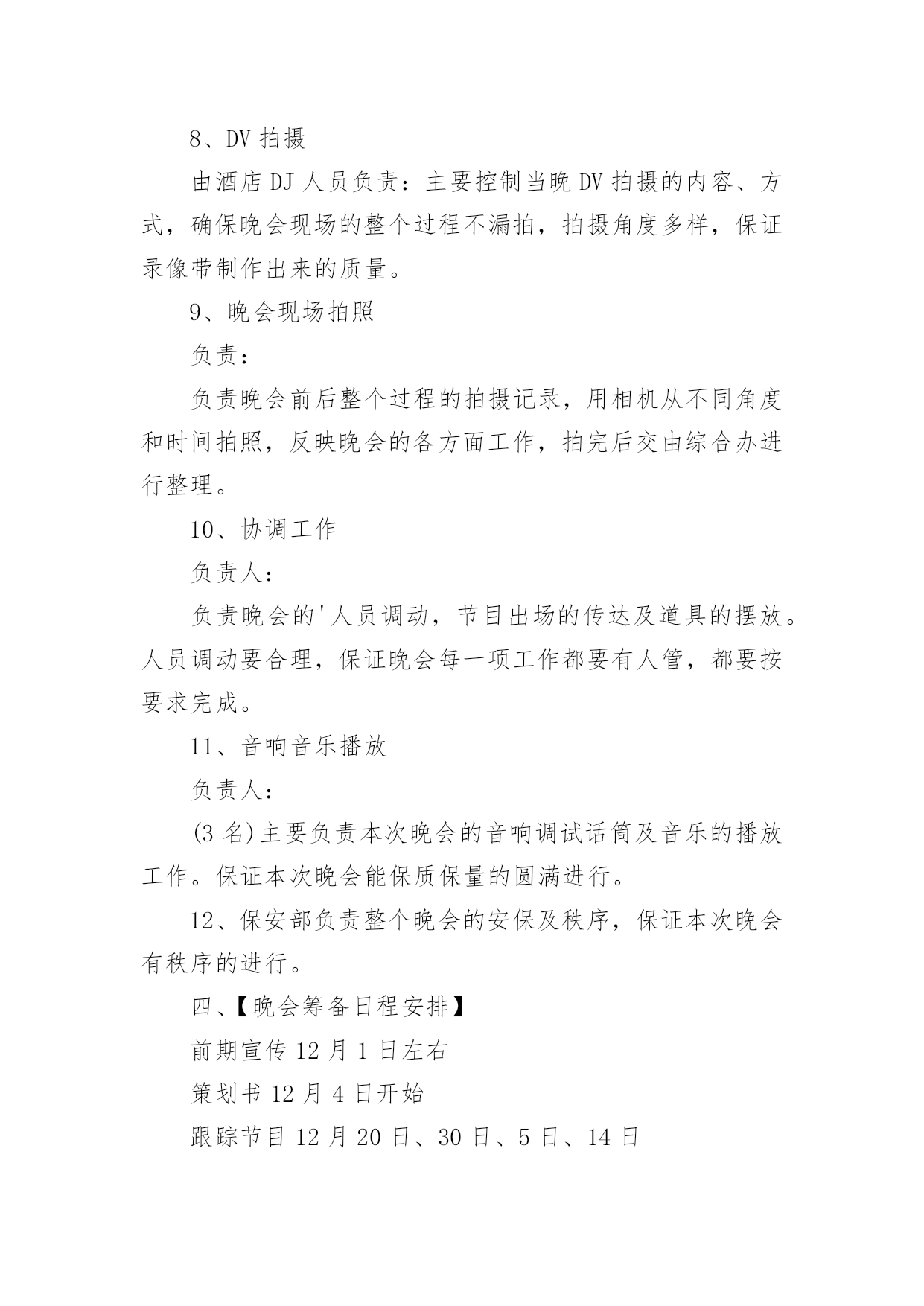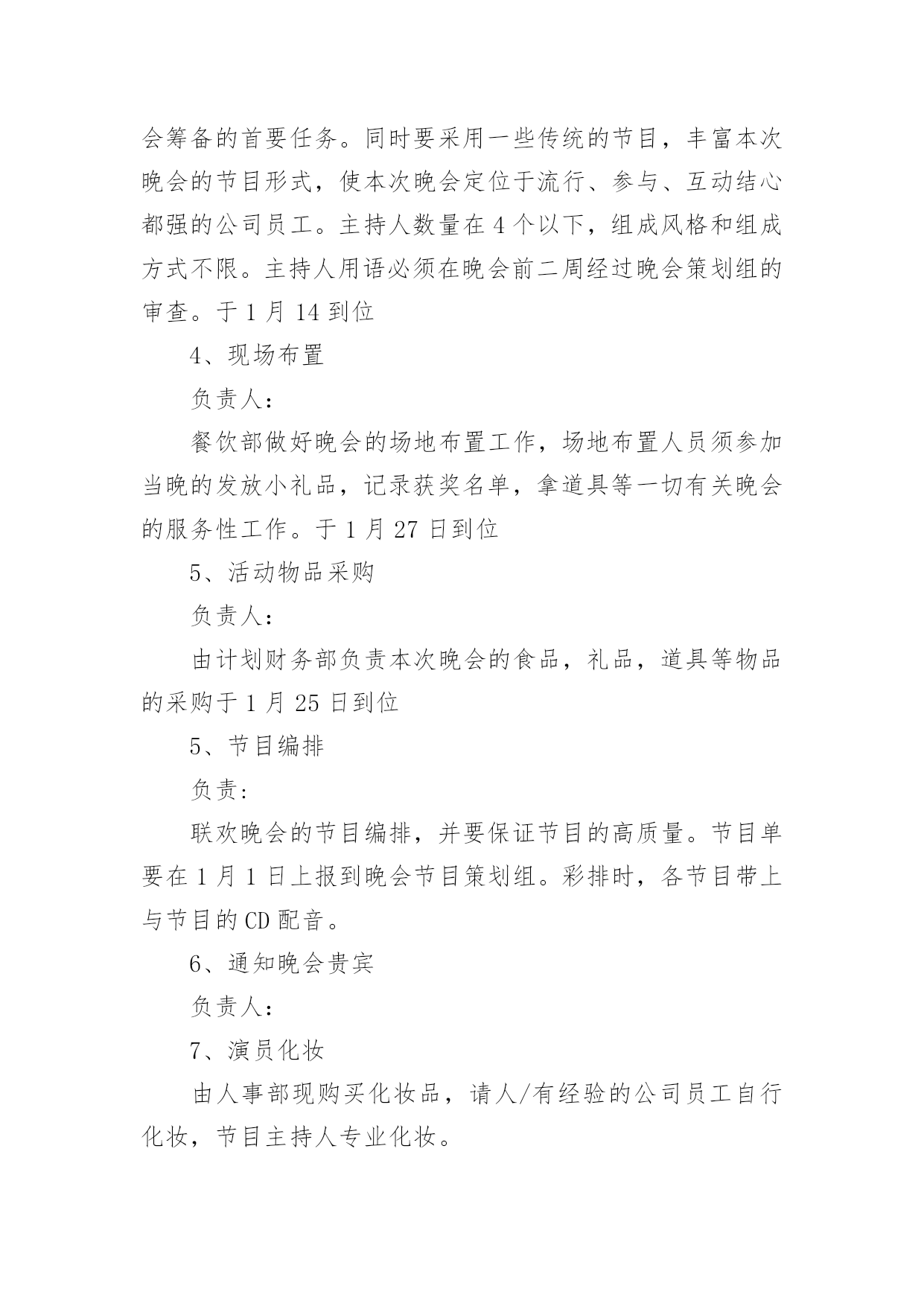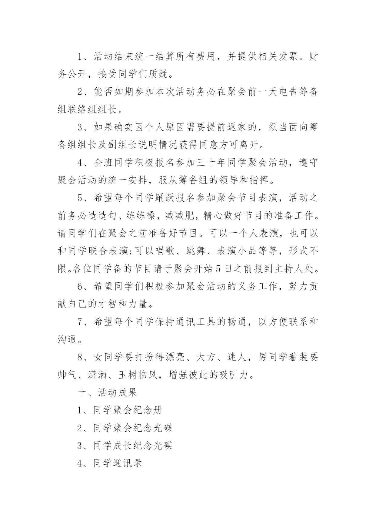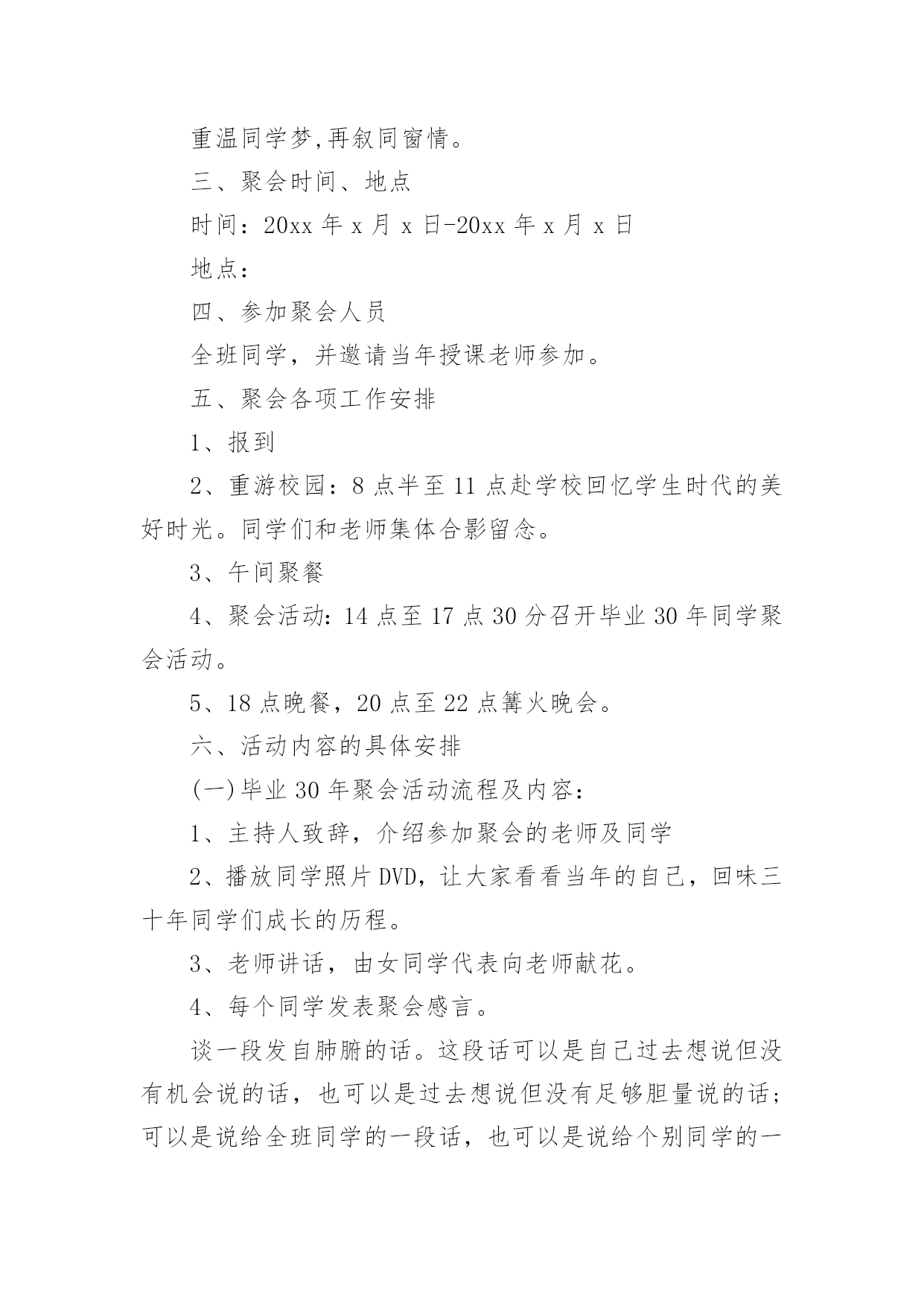 工会春节趣味活动方案工会春节趣味活动方案为了确保事情或工作科学有序进行,就常常需要事先准备方案,方案是计划中内容最为复杂的一种。方案要怎么制定呢?以下是小编为大家收集的工会春节趣味活动方案,欢迎阅读,希望大家能够喜欢。工会春节趣味活动方案1一、【晚会目的及意义】太阳每天都是新的,象征着希望的诞生;而我们X(单位)即将迎来希望的20xx年,期待着在20xx年全员成长与公司业绩百尺竿头更进一步!所谓好的开始乃成功的一半,我们将之寄于“20xx年联欢晚会”,唤起X(单位)挑战来年,奋发向上,开拓进取,的更大决心!二、【晚会主题】联欢晚会的主题是“中华全家福,祥龙贺新春”。通过在本次晚会。在和谐的,快乐的氛围中表达企业对员工的关怀与问候,使员工开开心心、快快乐乐的过好20xx年春节。增强员工的归属感,期待着员工们能积极地愉快地在新的一年里爱岗敬业。三、【晚会形式及内容】节目设置上总体迎合各年龄层次观众的口味,以年轻化为主,并要求节目形式以及总体设计上的新颖,这是本次晚会筹备的首要任务。同时要采用一些传统的节目,丰富本次晚会的节目形式,使本次晚会定位于流行、参与、互动结心都强的公司员工。主持人数量在4个以下,组成风格和组成方式不限。主持人用语必须在晚会前二周经过晚会策划组的审查。于1月14到位4、现场布置负责人:餐饮部做好晚会的场地布置工作,场地布置人员须参加当晚的发放小礼品,记录获奖名单,拿道具等一切有关晚会的服务性工作。于1月27日到位5、活动物品采购负责人:由计划财务部负责本次晚会的食品,礼品,道具等物品的采购于1月25日到位5、节目编排负责:联欢晚会的节目编排,并要保证节目的高质量。节目单要在1月1日上报到晚会节目策划组。彩排时,各节目带上与节目的CD配音。6、通知晚会贵宾负责人:7、演员化妆由人事部现购买化妆品,请人/有经验的公司员工自行化妆,节目主持人专业化妆。8、DV拍摄由酒店DJ人员负责:主要控制当晚DV拍摄的内容、方式,确保晚会现场的整个过程不漏拍,拍摄角度多样,保证录像带制作出来的质量。9、晚会现场拍照负责:负责晚会前后整个过程的拍摄记录,用相机从不同角度和时间拍照,反映晚会的各方面工作,拍完后交由综合办进行整理。10、协调工作负责人:负责晚会的'人员调动,节目出场的传达及道具的摆放。人员调动要合理,保证晚会每一项工作都要有人管,都要按要求完成。11、音响音乐播放负责人:(3名)主要负责本次晚会的音响调试话筒及音乐的播放工作。保证本次晚会能保质保量的圆满进行。12、保安部负责整个晚会的安保及秩序,保证本次晚会有秩序的进行。四、【晚会筹备日程安排】前期宣传12月1日左右策划书12月4日开始跟踪节目12月20日、30日、5日、14日确定节目单1月1日道具准备截至1月10日选择主持人节目基本到位时(第一次彩排时)节目彩排1月15日第一次初排1月20日第二次彩排现场布置1月28日14:00-下午17:00五、晚会现场会场四周用气球、灯笼、彩带等进行布置,舞美设计也要体现融洽祥和而喜庆的气氛,同时舞台设计上考虑到互动环节的观众进入场的方便。多媒体设备:电脑1台,话筒4个,备用话筒电池4个,泡泡机1台,射灯一台。注:1、欢迎全体员工带家属着便装参加。2、请各部门积极配合参与游戏及节目。3、紧急情况:会场及吧台备用蜡烛若干以防电路故障。六、晚会经费预计幸运观众抽奖箱2个纸条若干,蒙眼布3条工会春节趣味活动方案2一、前言亲爱的同学们,斗转星移,岁月如歌。三十年前我们风华正茂,书生意气,我们有缘相识于学校,虽有各自的梦想和憧憬,却是同样的热血与激情。三十年前,我们相逢相知,虽不识人生真谛,却共同经历了人生最纯洁、最美好的大学时光。三十年后,同窗友谊、同学情义已如江水长流,浩然成海。三十年后,人到中年的我们,魂牵梦绕、难以割舍、不能忘怀的仍是那美好的青春岁月;仍是那布满尘土的操场、交流切磋的课堂、种满果树的校园;仍是那时的阳光、月亮、细雨、春花和秋叶。转眼间三十年的分别,三十年的牵念,如今给了我们相约相聚的足够理由!无论你是容颜已老,还是保持青春依旧;无论你是飞黄腾达,还是依然甘于平淡;无论你是咫尺之间,还是游走天涯海角;只要不是万不得已,只要尚存同学情谊;请来这里,参加学校同学毕业30周年聚会活动,一起见证属于我们的这一时刻。30年了,多少次梦里相聚,多少次心驰神往,就让我们一起相约,到往事里走走,听听久违的声音,看看久违的面孔,说说离别的思绪…就让我们抛却尘世的喧嚣,丢弃身边的烦恼,走到一起来,尽情享受老同学相聚的温馨——说说知心话,叙叙同学情!回来吧,亲爱的同学们!一双双一如当年热切又深情的眼睛在期盼,一颗颗一如当年火热又年轻的心灵在呼唤……二、聚会主题重温同学梦,再叙同窗情。三、聚会时间、地点时间:20xx年x月x日-20x