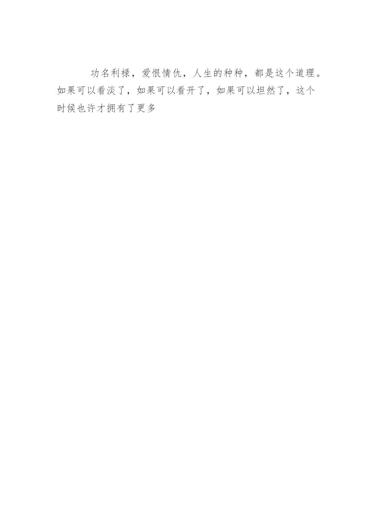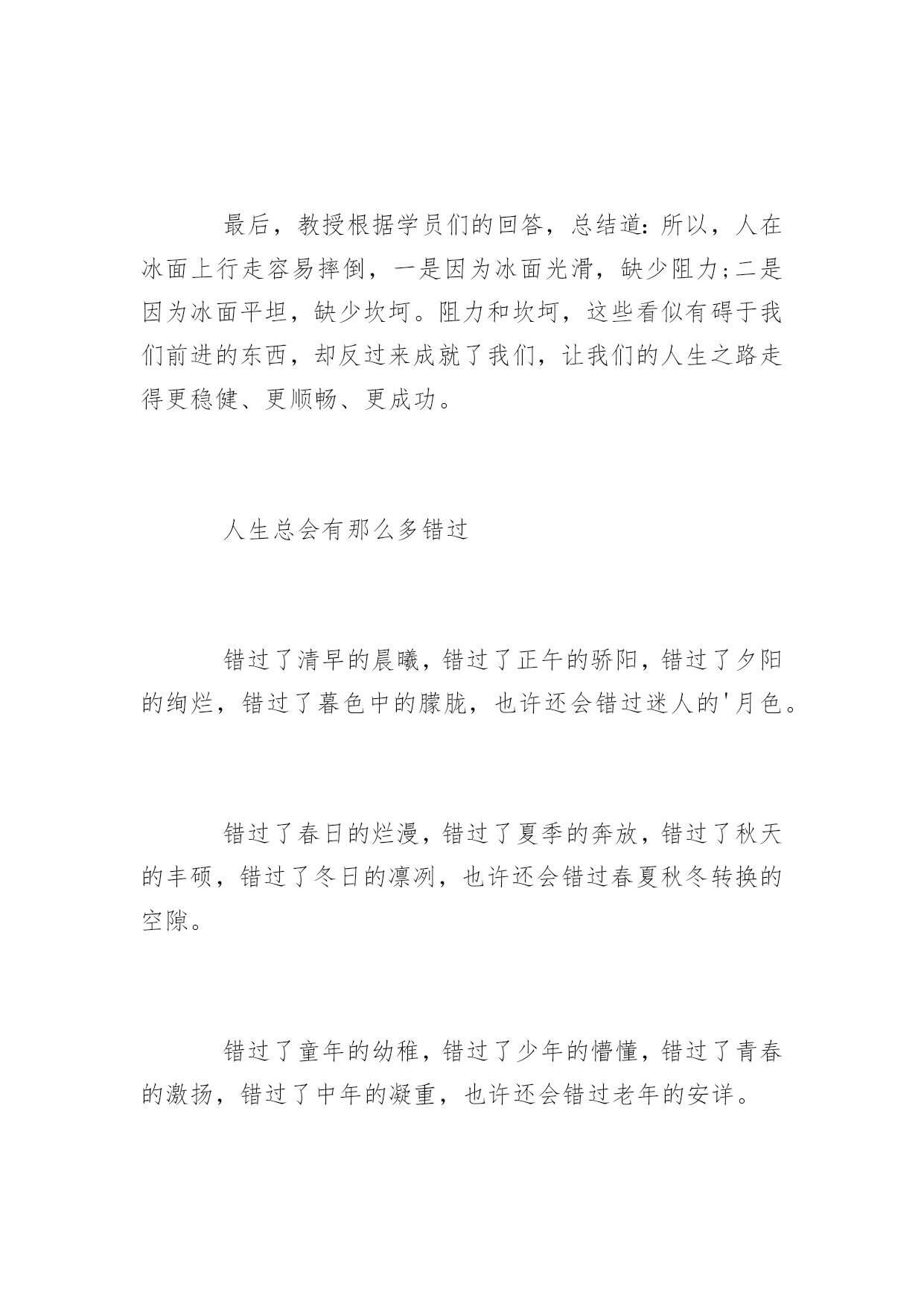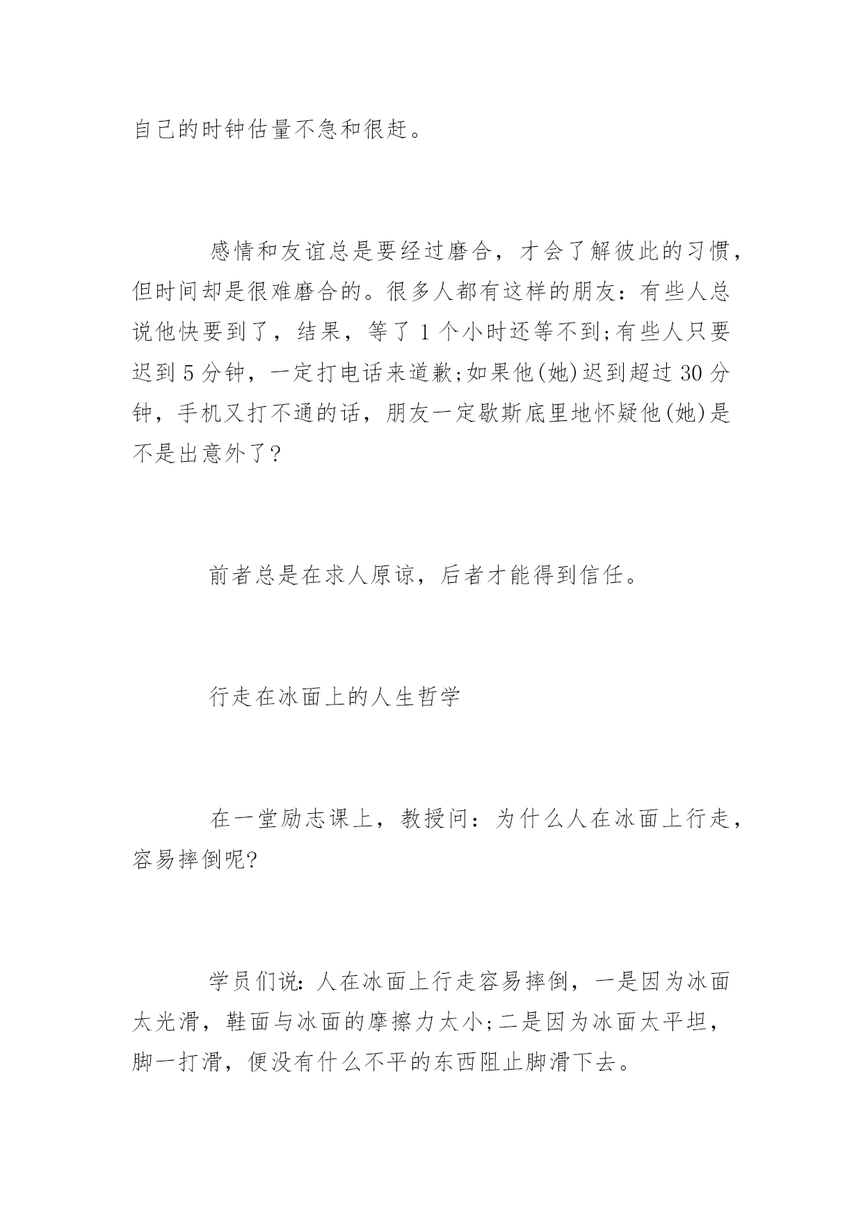 生活中的人生感悟.生活是一位睿智的长者,生活是一位博学的老师,它常常春风化雨,润物无声地为我们指点迷津,给我们人生的启迪。下面有YJBYS小编整理的生活中的人生感悟,欢迎阅读!你不急,我很赶每个人心里都有一个虚拟的时钟,分针、秒针的快慢,走得都不一样,或者时间用词相同,时间概念却大不相同。一位大公司的高级主管说,她刚任主管时,负责带一群出校门不久的下属。有一天她跟一名下属说:这份企划书很急,请赶快完成。那人满口答应,没想到,再三催促,明示加暗示,过了3天,才把企划书交上来。不是说很赶吗?为什么现在才交?是啊,很赶啊,所以我3天就交出来了。原来那人来自淳朴的乡下,很赶对他来说就是3天。我本人以为自己的性子已经够急了,没想到在时间观念上,和我的老板也出现过沟通上的误差。她说,有一天早上,老板把我叫到办公室。他拿了一沓报告给我,对我说,这不赶,请你处理一下。没想到,下午不到两点,他就很着急地打电话来问我处理好了没有?她才知道,原来老板说不赶,就是3个小时内要做好。不用说,如果老板吩咐这件事很赶,半个小时内她非得办好不可。同样的名词,在每个人脑海里出现的定义也不同。这让我想到,有次要出差旅行时,我那好心的爸爸帮我买皮箱,问我:要小皮箱、中皮箱还是大皮箱?我说要中型的。没想到我爸买回来的中皮箱,比我想象中的大上两倍,简直是移民时才用得到的,对他来说中型就这么大啊。后来,我那主管朋友每次交代事情,都会给出明确的时间指令,几小时或是几天,要把这件事完成,而不再按照自己的时钟估量不急和很赶。感情和友谊总是要经过磨合,才会了解彼此的习惯,但时间却是很难磨合的。很多人都有这样的朋友:有些人总说他快要到了,结果,等了1个小时还等不到;有些人只要迟到5分钟,一定打电话来道歉;如果他(她)迟到超过30分钟,手机又打不通的话,朋友一定歇斯底里地怀疑他(她)是不是出意外了?前者总是在求人原谅,后者才能得到信任。行走在冰面上的人生哲学在一堂励志课上,教授问:为什么人在冰面上行走,容易摔倒呢?学员们说:人在冰面上行走容易摔倒,一是因为冰面太光滑,鞋面与冰面的摩擦力太小;二是因为冰面太平坦,脚一打滑,便没有什么不平的东西阻止脚滑下去。最后,教授根据学员们的回答,总结道:所以,人在冰面上行走容易摔倒,一是因为冰面光滑,缺少阻力;二是因为冰面平坦,缺少坎坷。阻力和坎坷,这些看似有碍于我们前进的东西,却反过来成就了我们,让我们的人生之路走得更稳健、更顺畅、更成功。人生总会有那么多错过错过了清早的晨曦,错过了正午的骄阳,错过了夕阳的绚烂,错过了暮色中的朦胧,也许还会错过迷人的'月色。错过了春日的烂漫,错过了夏季的奔放,错过了秋天的丰硕,错过了冬日的凛冽,也许还会错过春夏秋冬转换的空隙。错过了童年的幼稚,错过了少年的懵懂,错过了青春的激扬,错过了中年的凝重,也许还会错过老年的安详。错过了青梅竹马的两小无猜,错过了卿卿我我的初恋情怀,错过了海誓山盟的相亲相爱,错过了耳鬓厮磨的相依相偎,也许还要错过超脱于现实之外、凌驾于精神之上的相遇相知。跨越万水千山,抹去昨日背景,在一个特定的时空里,邂逅了你,偶遇了他,成就了你们的相知。茫茫人海中,你们能够相遇、相识、相知,可谓是缘分不浅了。但即使如此有缘,也许在你们之间还要上演一幕幕的错过。也许你会感慨:为什么不在花开的季节与你相遇?为什么不在青春激扬的日子里与你相逢?为什么不在心无负重、口无遮拦的时候与你相知?为什么不在最美丽的时刻与你相爱?也许你会设法挽救这份错过,试图牢牢把握瞬间的缘分。可是你要明白,缘分宛如手中沙,攥得愈紧,失去愈多;或许你们曾经的错过,不是彼此心灵的退缩,而是宿命的安排。人生中总会有那么多的错过,错过有时会让云流泪,让风止步,让春夏秋冬停滞,让生命轮回有情。承受过错过之痛的人都明白:一时的错过,也许就会成就一世的落寞。但又有什么办法呢?人不能让自己生活在感慨里。错过了上世的相遇,错过了前世的相知,错过了今世的相爱。别人是三生的缘分,有缘无分的你们就把希望寄托于第四世吧,你们可以约定好第四世的重逢。生活中的错过实在是太多,几多愁思,几多无奈。不经意间,许多美好的记忆和我们擦肩而过,随风流逝。其实也正是因为错过,那一切才显得如此令人为之动情、难以忘怀、弥足珍贵。假使你使之成为现实的永恒,回头看看,也许一切都显得那样的平淡了。因此,错过在某种意义上其实也是一种新生,是一种别样的美丽。如果不是曾经的错过,尘封的心里怎么会有思念在日夜疯长?情感的荒原怎么会有蓓蕾在悄悄绽放?一生一世,我们错过的永远比得到的要多无数倍,滚滚红尘中,我们有多少机遇与可能把所有美好的东西都据为己有呢?所谓弱水三千,只取一瓢饮就是这个道理。知道错过了,其实根本就没有错过,因为我们最起码还知道有