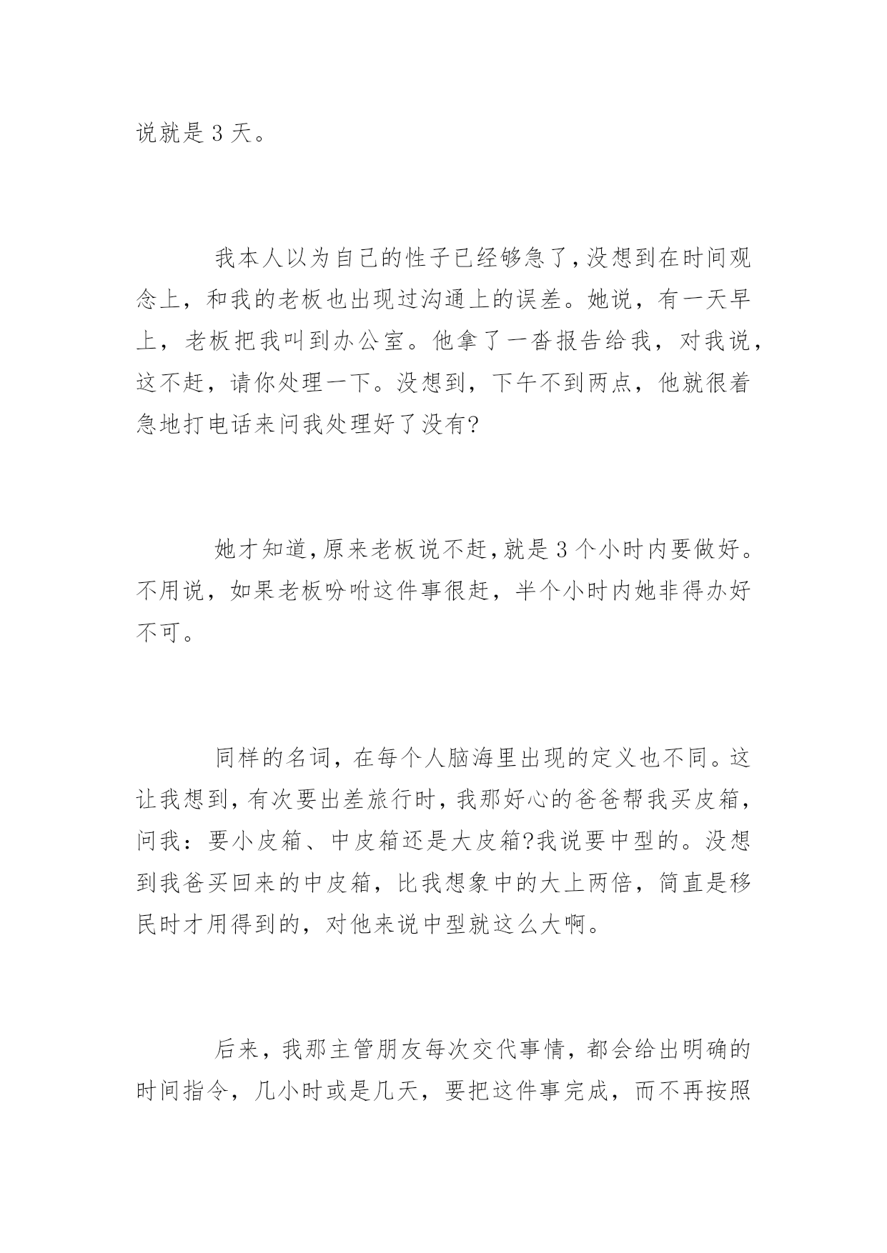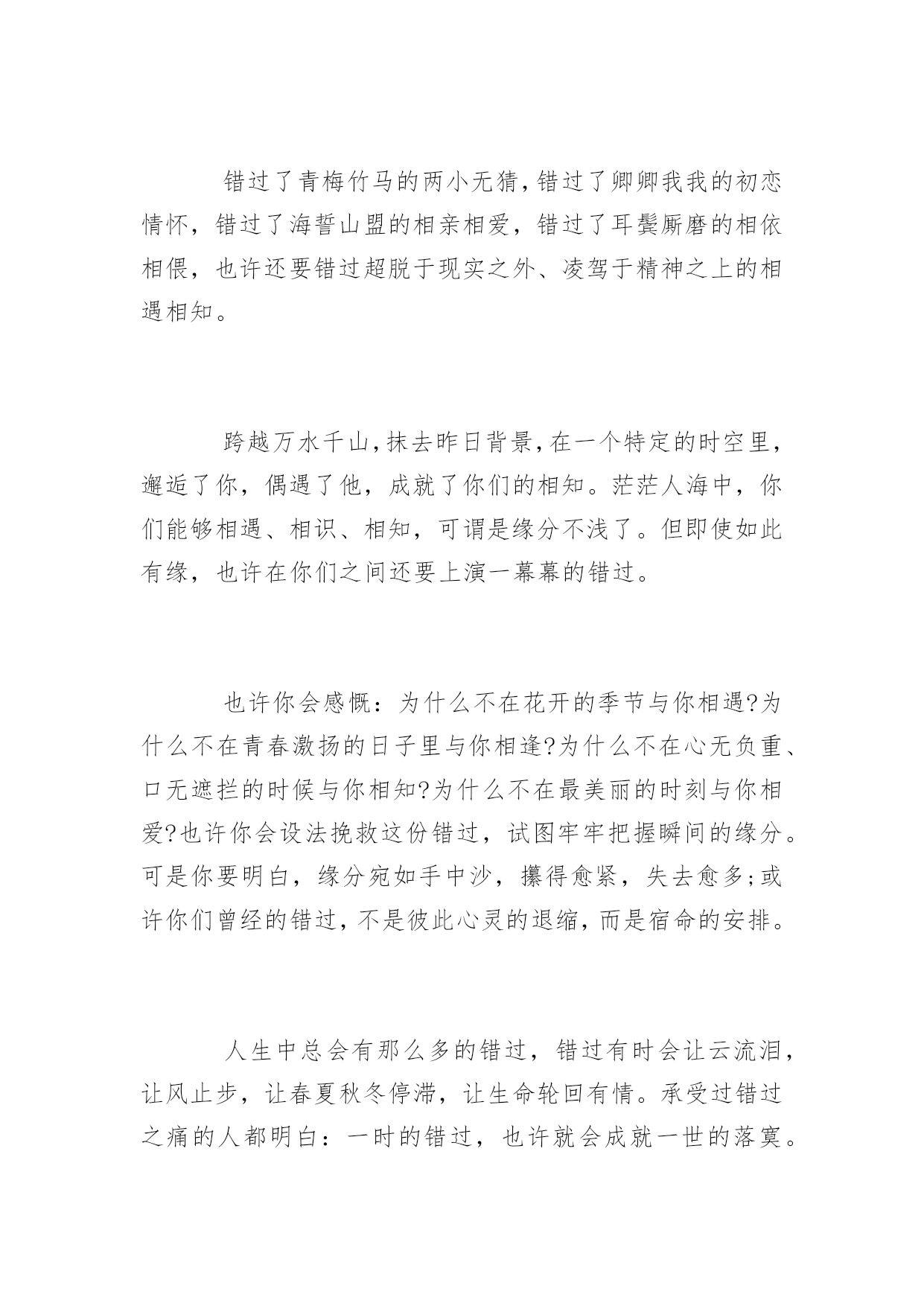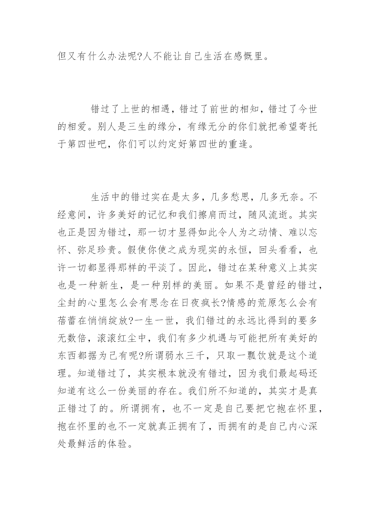 生活中的人生感悟.生活是一位睿智的长者,生活是一位博学的老师,它常常春风化雨,润物无声地为我们指点迷津,给我们人生的启迪。下面有YJBYS小编整理的生活中的人生感悟,欢迎阅读!你不急,我很赶每个人心里都有一个虚拟的时钟,分针、秒针的快慢,走得都不一样,或者时间用词相同,时间概念却大不相同。一位大公司的高级主管说,她刚任主管时,负责带一群出校门不久的下属。有一天她跟一名下属说:这份企划书很急,请赶快完成。那人满口答应,没想到,再三催促,明示加暗示,过了3天,才把企划书交上来。不是说很赶吗?为什么现在才交?是啊,很赶啊,所以我3天就交出来了。原来那人来自淳朴的乡下,很赶对他来说就是3天。我本人以为自己的性子已经够急了,没想到在时间观念上,和我的老板也出现过沟通上的误差。她说,有一天早上,老板把我叫到办公室。他拿了一沓报告给我,对我说,这不赶,请你处理一下。没想到,下午不到两点,他就很着急地打电话来问我处理好了没有?她才知道,原来老板说不赶,就是3个小时内要做好。不用说,如果老板吩咐这件事很赶,半个小时内她非得办好不可。同样的名词,在每个人脑海里出现的定义也不同。这让我想到,有次要出差旅行时,我那好心的爸爸帮我买皮箱,问我:要小皮箱、中皮箱还是大皮箱?我说要中型的。没想到我爸买回来的中皮箱,比我想象中的大上两倍,简直是移民时才用得到的,对他来说中型就这么大啊。后来,我那主管朋友每次交代事情,都会给出明确的时间指令,几小时或是几天,要把这件事完成,而不再按照自己的时钟估量不急和很赶。感情和友谊总是要经过磨合,才会了解彼此的习惯,但时间却是很难磨合的。很多人都有这样的朋友:有些人总说他快要到了,结果,等了1个小时还等不到;有些人只要迟到5分钟,一定打电话来道歉;如果他(她)迟到超过30分钟,手机又打不通的话,朋友一定歇斯底里地怀疑他(她)是不是出意外了?前者总是在求人原谅,后者才能得到信任。行走在冰面上的人生哲学在一堂励志课上,教授问:为什么人在冰面上行走,容易摔倒呢?学员们说:人在冰面上行走容易摔倒,一是因为冰面太光滑,鞋面与冰面的摩擦力太小;二是因为冰面太平坦,脚一打滑,便没有什么不平的东西阻止脚滑下去。最后,教授根据学员们的回答,总结道:所以,人在冰面上行走容易摔倒,一是因为冰面光滑,缺少阻力;二是因为冰面平坦,缺少坎坷。阻力和坎坷,这些看似有碍于我们前进的东西,却反过来成就了我们,让我们的人生之路走得更稳健、更顺畅、更成功。人生总会有那么多错过错过了清早的晨曦,错过了正午的骄阳,错过了夕阳的绚烂,错过了暮色中的朦胧,也许还会错过迷人的'月色。错过了春日的烂漫,错过了夏季的奔放,错过了秋天的丰硕,错过了冬日的凛冽,也许还会错过春夏秋冬转换的空隙。错过了童年的幼稚,错过了少年的懵懂,错过了青春的激扬,错过了中年的凝重,也许还会错过老年的安详。错过了青梅竹马的两小无猜,错过了卿卿我我的初恋情怀,错过了海誓山盟的相亲相爱,错过了耳鬓厮磨的相依相偎,也许还要错过超脱于现实之外、凌驾于精神之上的相遇相知。跨越万水千山,抹去昨日背景,在一个特定的时空里,邂逅了你,偶遇了他,成就了你们的相知。茫茫人海中,你们能够相遇、相识、相知,可谓是缘分不浅了。但即使如此有缘,也许在你们之间还要上演一幕幕的错过。也许你会感慨:为什么不在花开的季节与你相遇?为什么不在青春激扬的日子里与你相逢?为什么不在心无负重、口无遮拦的时候与你相知?为什么不在最美丽的时刻与你相爱?也许你会设法挽救这份错过,试图牢牢把握瞬间的缘分。可是你要明白,缘分宛如手中沙,攥得愈紧,失去愈多;或许你们曾经的错过,不是彼此心灵的退缩,而是宿命的安排。人生中总会有那么多的错过,错过有时会让云流泪,让风止步,让春夏秋冬停滞,让生命轮回有情。承受过错过之痛的人都明白:一时的错过,也许就会成就一世的落寞。但又有什么办法呢?人不能让自己生活在感慨里。错过了上世的相遇,错过了前世的相知,错过了今世的相爱。别人是三生的缘分,有缘无分的你们就把希望寄托于第四世吧,你们可以约定好第四世的重逢。生活中的错过实在是太多,几多愁思,几多无奈。不经意间,许多美好的记忆和我们擦肩而过,随风流逝。其实也正是因为错过,那一切才显得如此令人为之动情、难以忘怀、弥足珍贵。假使你使之成为现实的永恒,回头看看,也许一切都显得那样的平淡了。因此,错过在某种意义上其实也是一种新生,是一种别样的美丽。如果不是曾经的错过,尘封的心里怎么会有思念在日夜疯长?情感的荒原怎么会有蓓蕾在悄悄绽放?一生一世,我们错过的永远比得到的要多无数倍,滚滚红尘中,我们有多少机遇与可能把所有美好的东西都据为己有呢?所谓弱水三千,只取一瓢饮就是这个道理。知道错过了,其实根本就没有错过,因为我们最起码还知道有