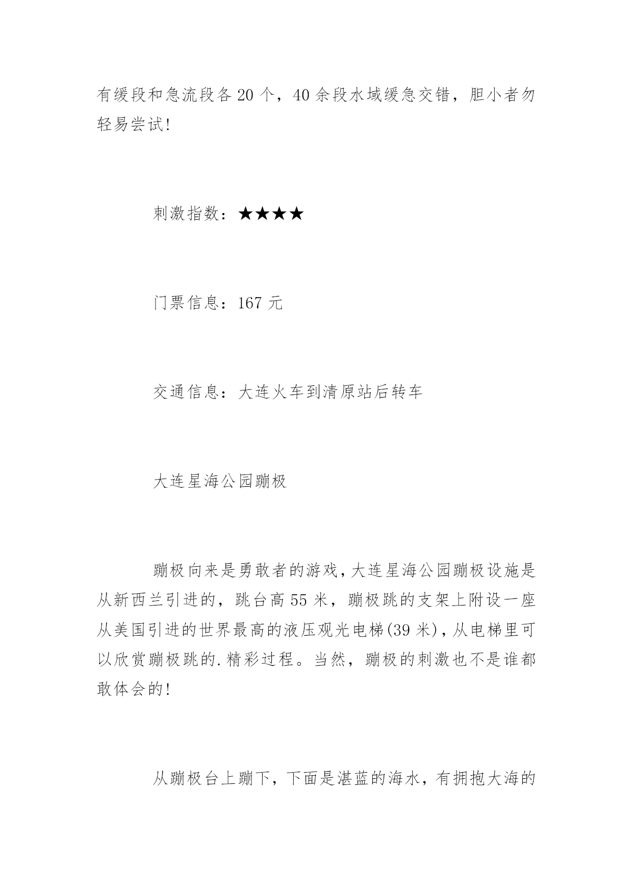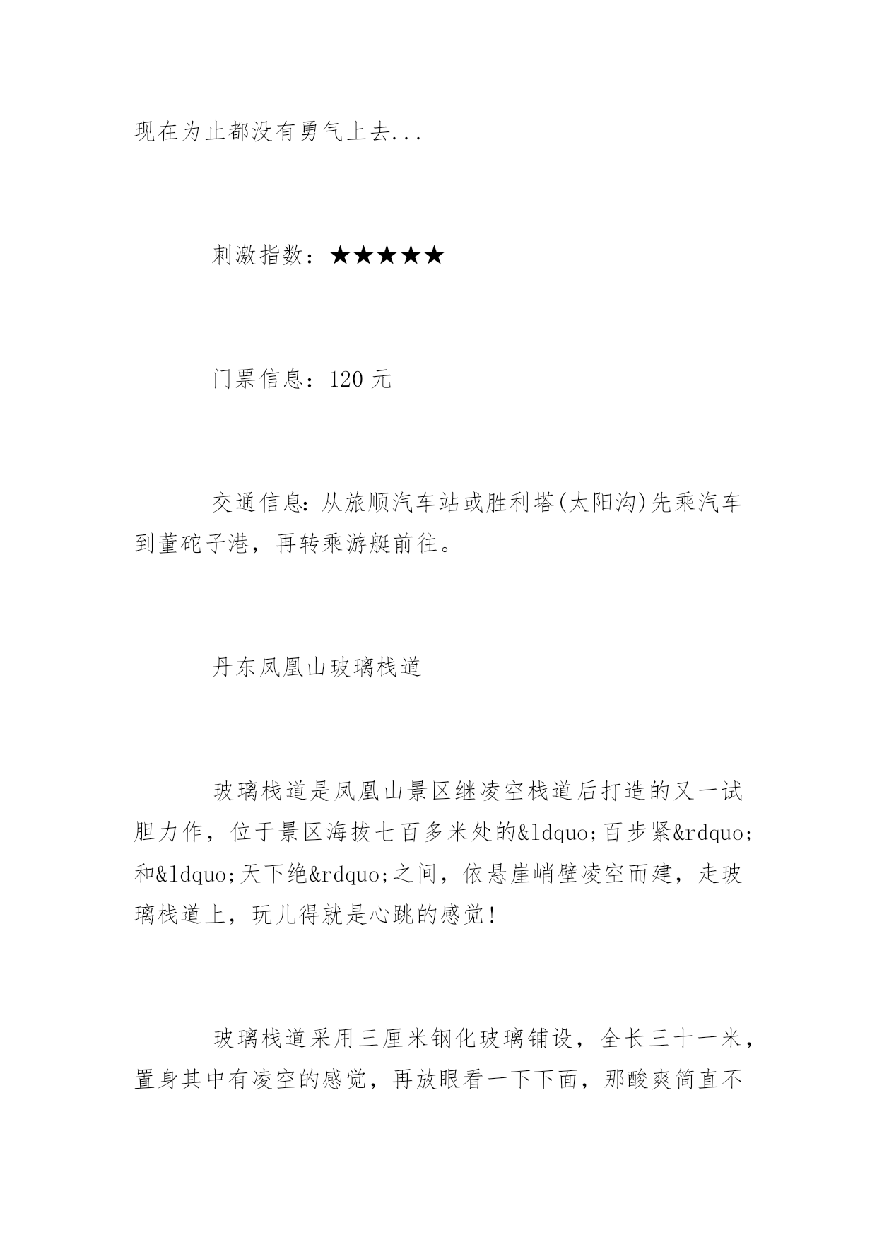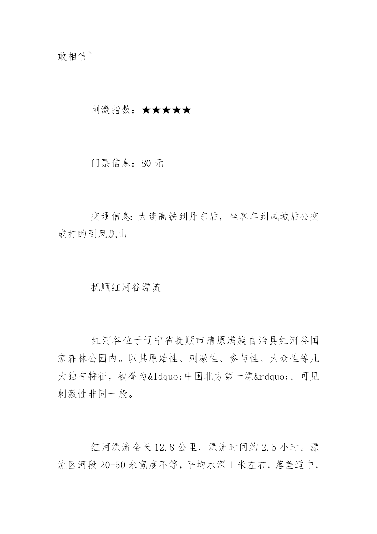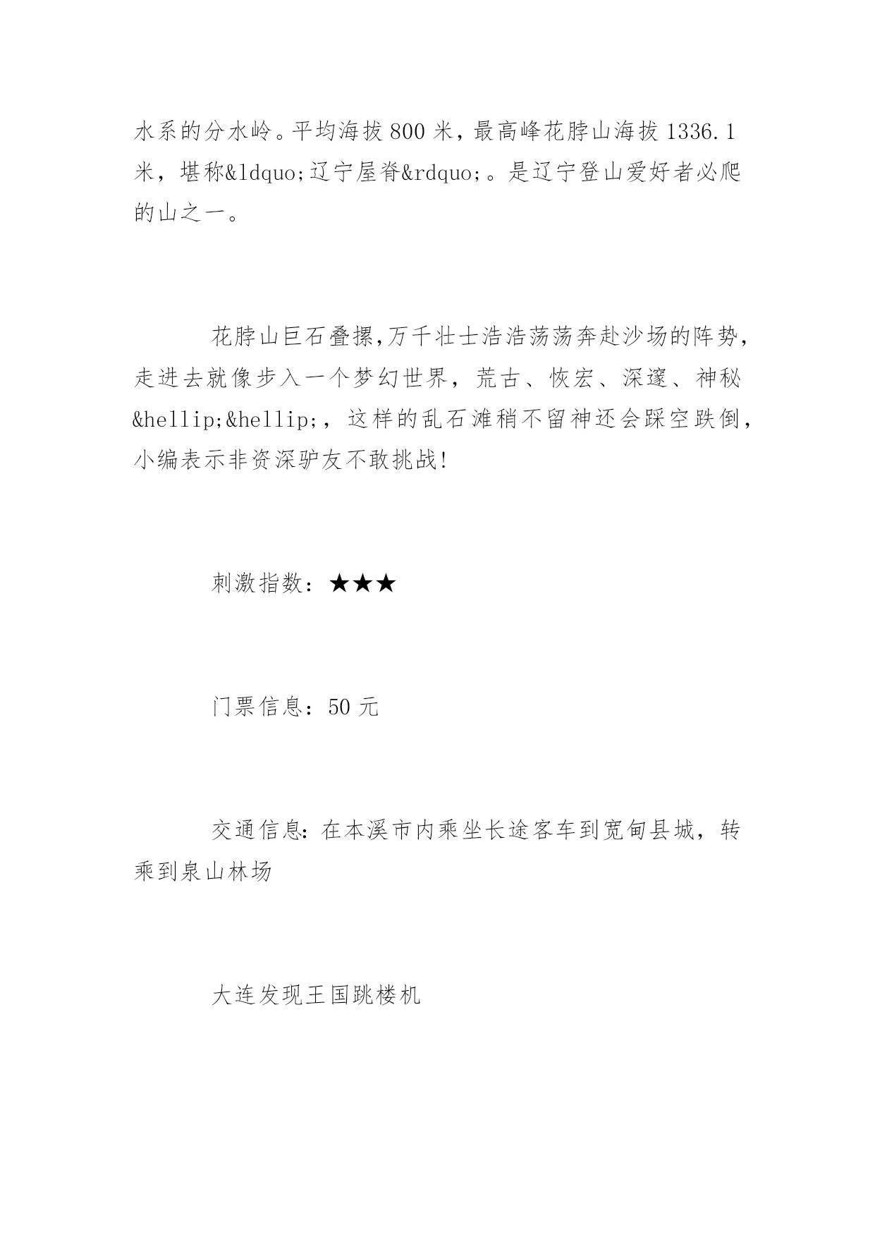 辽宁旅游景点辽宁旅游景点大全秋天到了,何不趁着阳光明媚,带着爸妈一起去秋游呢?以下是为大家分享的辽宁旅游景点大全,供大家参考借鉴,欢迎浏览!大连旅顺蛇岛据说全世界有七大神秘蛇岛,旅顺蛇岛就是其中之一。蛇岛位于辽宁省辽东半岛最南端的渤海中,隶属于大连市旅顺口区。从外表上看,蛇岛同其他海岛相比没有特别之处,但在这里却生存着2万余条蛇岛蝮蛇,而且只有蛇岛蝮蛇这一种蛇。这种“蛇岛垄断”也许就是大连蛇岛的神秘之处。蛇岛在成立保护区以前,几乎是没人上去的,当然,有极少数大胆的猎蛇者除外。小编最怕的就是蛇了,到现在为止都没有勇气上去...刺激指数:★★★★★门票信息:120元交通信息:从旅顺汽车站或胜利塔(太阳沟)先乘汽车到董砣子港,再转乘游艇前往。丹东凤凰山玻璃栈道玻璃栈道是凤凰山景区继凌空栈道后打造的又一试胆力作,位于景区海拔七百多米处的“百步紧”和“天下绝”之间,依悬崖峭壁凌空而建,走玻璃栈道上,玩儿得就是心跳的感觉!玻璃栈道采用三厘米钢化玻璃铺设,全长三十一米,置身其中有凌空的感觉,再放眼看一下下面,那酸爽简直不敢相信~刺激指数:★★★★★门票信息:80元交通信息:大连高铁到丹东后,坐客车到凤城后公交或打的到凤凰山抚顺红河谷漂流红河谷位于辽宁省抚顺市清原满族自治县红河谷国家森林公园内。以其原始性、刺激性、参与性、大众性等几大独有特征,被誉为“中国北方第一漂”。可见刺激性非同一般。红河漂流全长12.8公里,漂流时间约2.5小时。漂流区河段20-50米宽度不等,平均水深1米左右,落差适中,有缓段和急流段各20个,40余段水域缓急交错,胆小者勿轻易尝试!刺激指数:★★★★门票信息:167元交通信息:大连火车到清原站后转车大连星海公园蹦极蹦极向来是勇敢者的游戏,大连星海公园蹦极设施是从新西兰引进的,跳台高55米,蹦极跳的支架上附设一座从美国引进的世界最高的液压观光电梯(39米),从电梯里可以欣赏蹦极跳的.精彩过程。当然,蹦极的刺激也不是谁都敢体会的!从蹦极台上蹦下,下面是湛蓝的海水,有拥抱大海的感觉,很是惊险刺激。蹦极作为一项极限运动,对身体素质和心理素质要求很高,有心、脑病史的人和深度近视者最好不要尝试这项运动哦!刺激指数:★★★★门票信息:245元交通信息:乘22路、23路、28路、406路公交汽车、202路有轨电车星海公园或星海浴场站下车。本溪水洞本溪水洞是数百万年前形成的大型石灰岩充水溶洞,洞内深邃宽阔,现开发地下暗河长三千米,水流终年不竭,清澈见底,洞顶和岩壁钟乳石发育较好,千姿百态,泛舟游览,使人流连忘返。以上文字都是网络上的介绍,看过《盗墓笔记》中过水洞情节的亲,一定对水洞心有余悸吧~本溪的水洞丝毫不逊色于《盗墓笔记》中的场景设置。早知道《盗墓笔记》应该来这拍啊!刺激指数:★★★门票信息:135元交通信息:在本溪东芬客运站乘坐到小市的客车,在水洞下车即可。辽宁屋脊花脖山花脖山位于宽甸满族自治县东北部,属长白山系龙岗支脉花脖山山脉的核心和精华部分,是鸭绿江水系和太子河水系的分水岭。平均海拔800米,最高峰花脖山海拔1336.1米,堪称“辽宁屋脊”。是辽宁登山爱好者必爬的山之一。花脖山巨石叠摞,万千壮士浩浩荡荡奔赴沙场的阵势,走进去就像步入一个梦幻世界,荒古、恢宏、深邃、神秘……,这样的乱石滩稍不留神还会踩空跌倒,小编表示非资深驴友不敢挑战!刺激指数:★★★门票信息:50元交通信息:在本溪市内乘坐长途客车到宽甸县城,转乘到泉山林场大连发现王国跳楼机发现王国里的太空梭其实就是大家所熟知的跳楼机,利用重力加速度原理,瞬间把人弹射到50米的高空,然后再自由落体,让你感受急速失重,特别是悬停在空中不知接下来会做出什么疯狂行为的感觉,让喜欢刺激的人更是欲罢不能。准备玩跳楼机的人,在身体素质和心理素质方面都需要有一定的条件,否则,玩的人会容易出现一些意外、玩过后会增大心理阴影。刺激指数:★★★★门票信息:成人日票190,成人夜票100交通信息:大连城市快轨列车始发于大连火车站。早6:30始发运营,每整点10分、30分、50分发车;50分钟到达终点换乘王国专线2分钟抵达公园。在大连市内乘坐旅游巴士,大约40分钟可以到达发现王国。盘锦红海滩直升机观景红海滩国家风景廊道全长18公里,被誉为独一无二的“世界红色海岸线”“中国最浪漫的户外游憩海岸线”。空中赏美景,在高空中欣赏美丽湿地,真是既刺激又美妙!刺激指数:★★★门票信息:80元,直升机:600元交通信