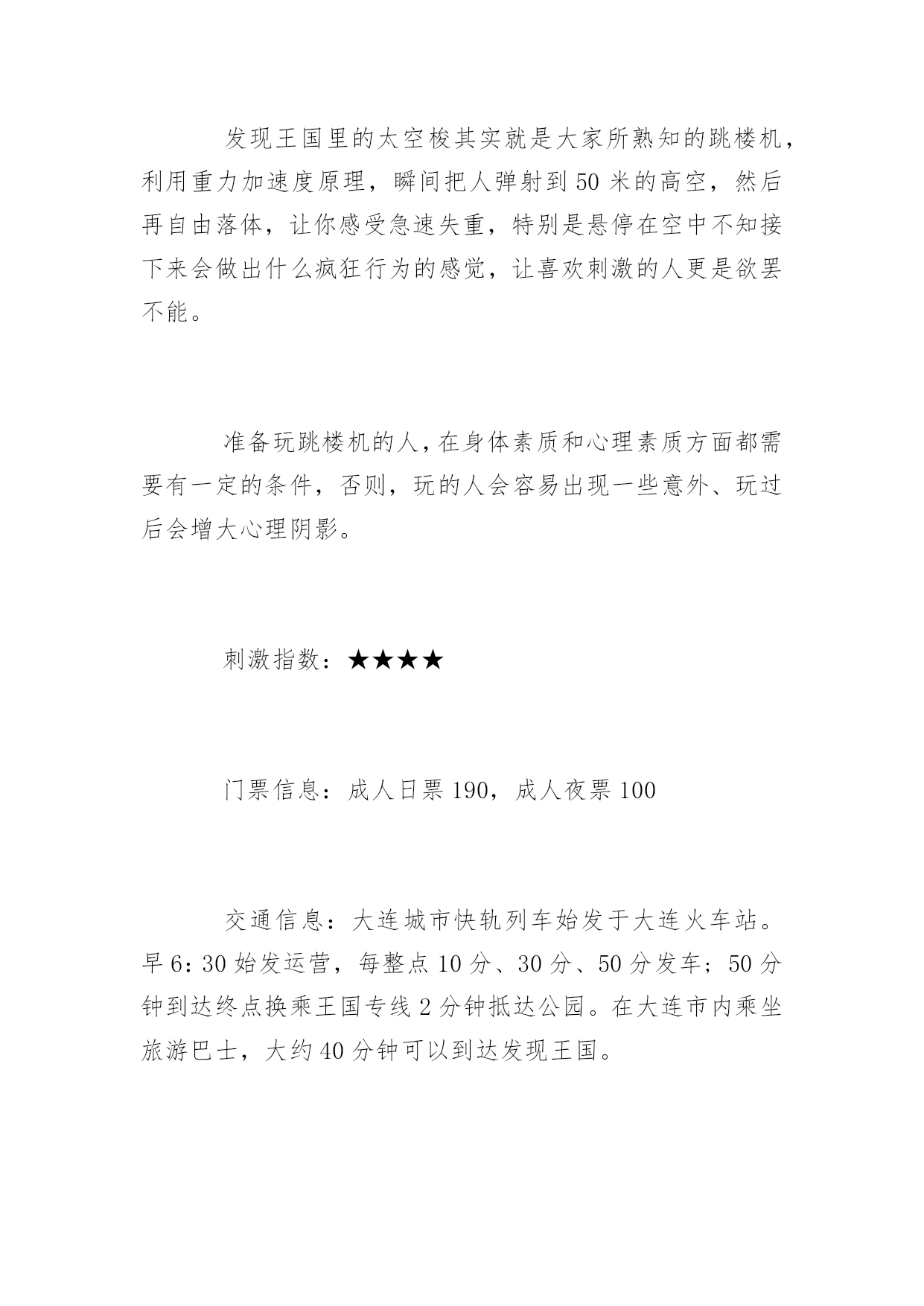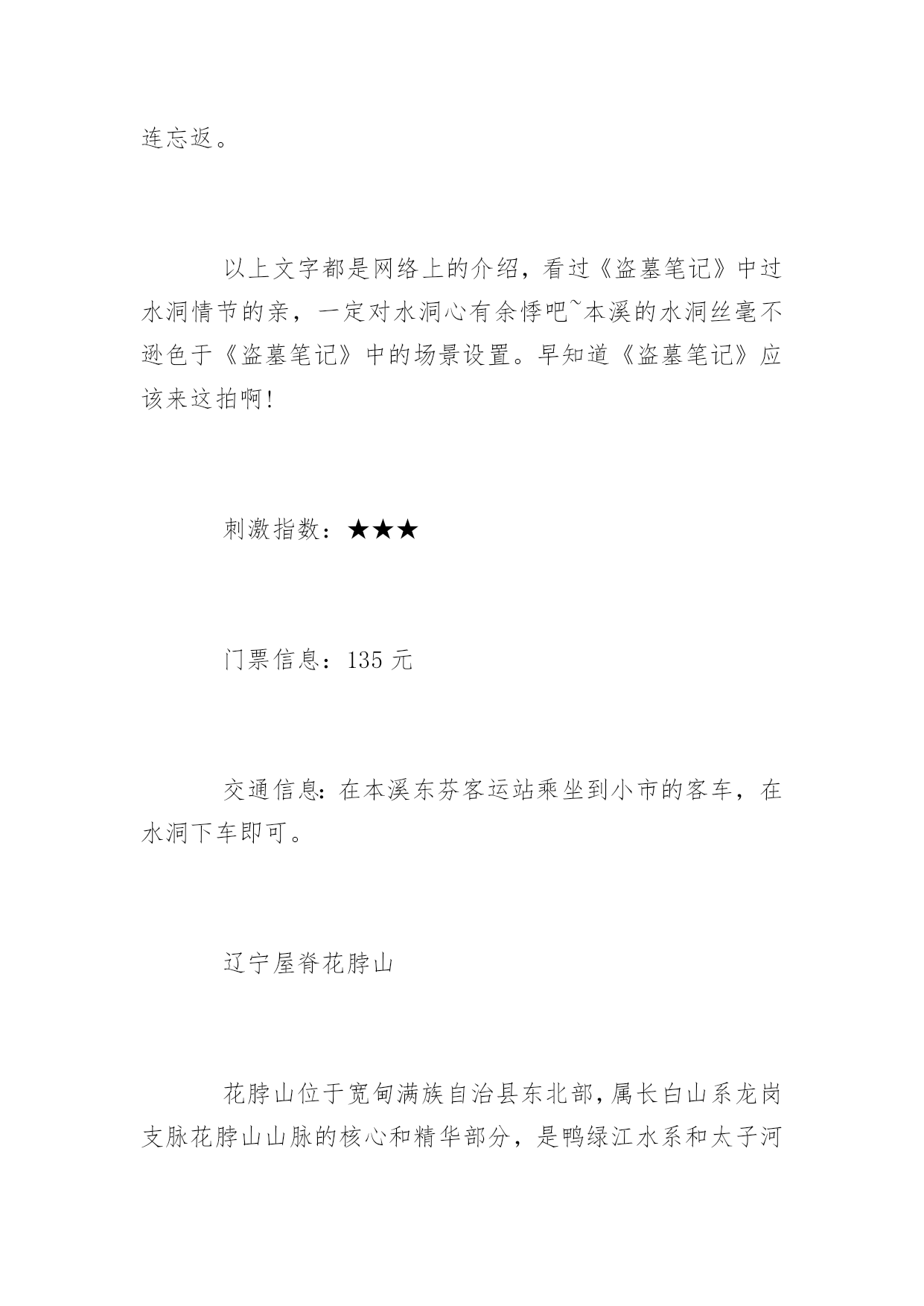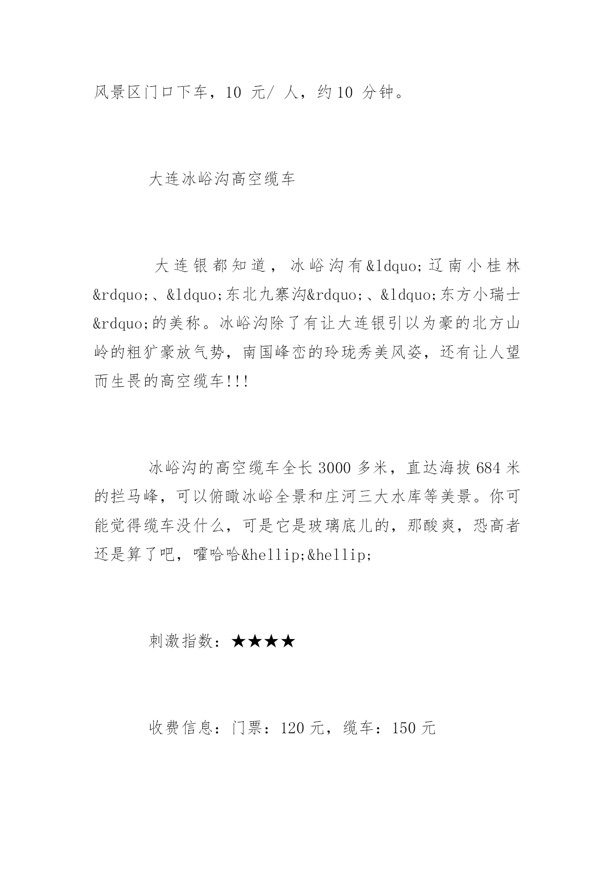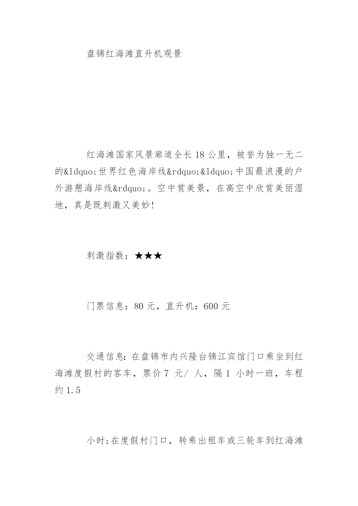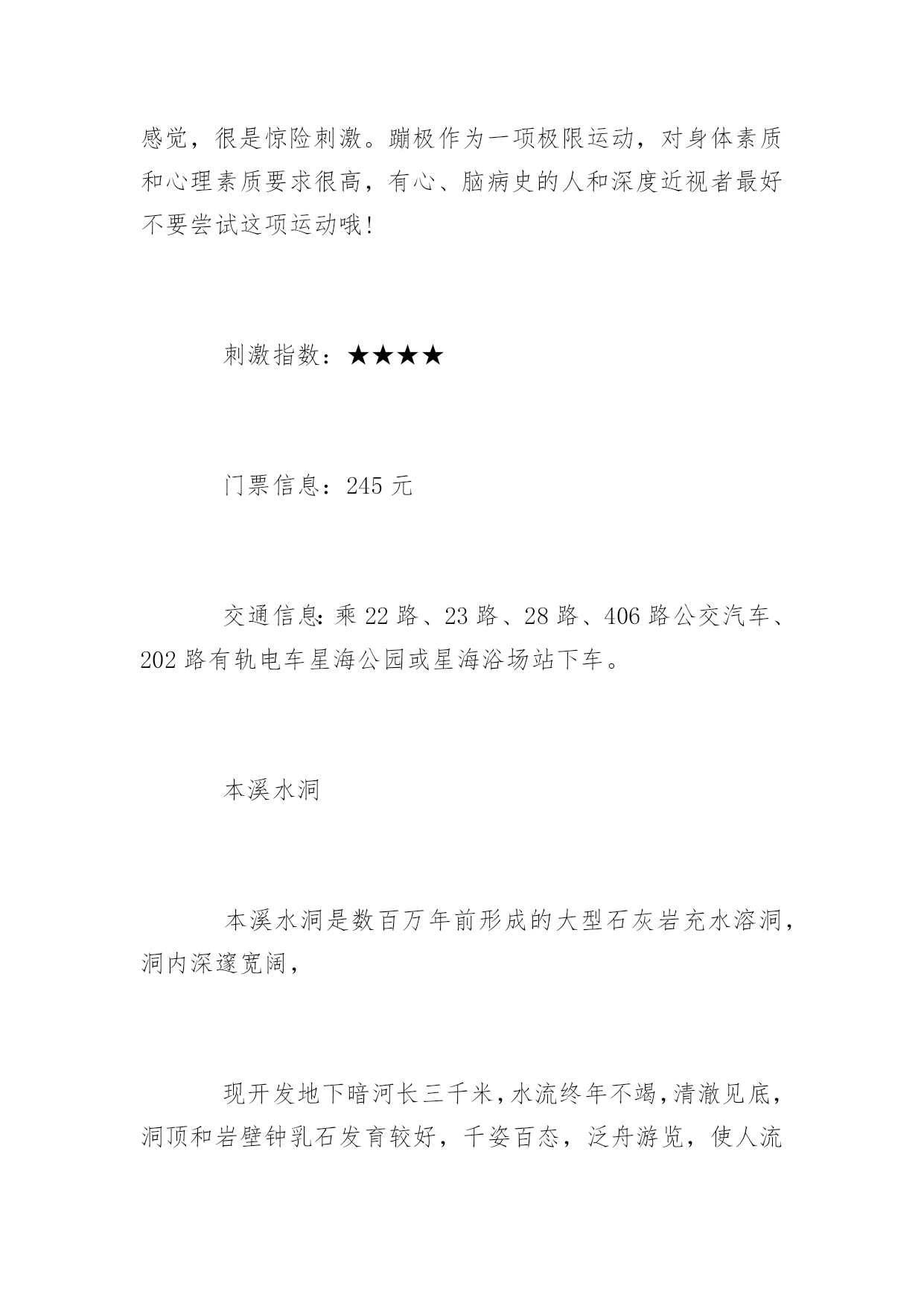 辽宁旅游景点辽宁旅游景点大全秋天到了,何不趁着阳光明媚,带着爸妈一起去秋游呢?以下是为大家分享的辽宁旅游景点大全,供大家参考借鉴,欢迎浏览!大连旅顺蛇岛据说全世界有七大神秘蛇岛,旅顺蛇岛就是其中之一。蛇岛位于辽宁省辽东半岛最南端的渤海中,隶属于大连市旅顺口区。从外表上看,蛇岛同其他海岛相比没有特别之处,但在这里却生存着2万余条蛇岛蝮蛇,而且只有蛇岛蝮蛇这一种蛇。这种“蛇岛垄断”也许就是大连蛇岛的神秘之处。蛇岛在成立保护区以前,几乎是没人上去的,当然,有极少数大胆的猎蛇者除外。小编最怕的就是蛇了,到现在为止都没有勇气上去...刺激指数:★★★★★门票信息:120元交通信息:从旅顺汽车站或胜利塔(太阳沟)先乘汽车到董砣子港,再转乘游艇前往。丹东凤凰山玻璃栈道玻璃栈道是凤凰山景区继凌空栈道后打造的又一试胆力作,位于景区海拔七百多米处的“百步紧”和“天下绝”之间,依悬崖峭壁凌空而建,走玻璃栈道上,玩儿得就是心跳的感觉!玻璃栈道采用三厘米钢化玻璃铺设,全长三十一米,置身其中有凌空的感觉,再放眼看一下下面,那酸爽简直不敢相信~刺激指数:★★★★★门票信息:80元交通信息:大连高铁到丹东后,坐客车到凤城后公交或打的到凤凰山抚顺红河谷漂流红河谷位于辽宁省抚顺市清原满族自治县红河谷国家森林公园内。以其原始性、刺激性、参与性、大众性等几大独有特征,被誉为“中国北方第一漂”。可见刺激性非同一般。红河漂流全长12.8公里,漂流时间约2.5小时。漂流区河段20-50米宽度不等,平均水深1米左右,落差适中,有缓段和急流段各20个,40余段水域缓急交错,胆小者勿轻易尝试!刺激指数:★★★★门票信息:167元交通信息:大连火车到清原站后转车大连星海公园蹦极蹦极向来是勇敢者的游戏,大连星海公园蹦极设施是从新西兰引进的,跳台高55米,蹦极跳的支架上附设一座从美国引进的世界最高的液压观光电梯(39米),从电梯里可以欣赏蹦极跳的.精彩过程。当然,蹦极的刺激也不是谁都敢体会的!从蹦极台上蹦下,下面是湛蓝的海水,有拥抱大海的感觉,很是惊险刺激。蹦极作为一项极限运动,对身体素质和心理素质要求很高,有心、脑病史的人和深度近视者最好不要尝试这项运动哦!刺激指数:★★★★门票信息:245元交通信息:乘22路、23路、28路、406路公交汽车、202路有轨电车星海公园或星海浴场站下车。本溪水洞本溪水洞是数百万年前形成的大型石灰岩充水溶洞,洞内深邃宽阔,现开发地下暗河长三千米,水流终年不竭,清澈见底,洞顶和岩壁钟乳石发育较好,千姿百态,泛舟游览,使人流连忘返。以上文字都是网络上的介绍,看过《盗墓笔记》中过水洞情节的亲,一定对水洞心有余悸吧~本溪的水洞丝毫不逊色于《盗墓笔记》中的场景设置。早知道《盗墓笔记》应该来这拍啊!刺激指数:★★★门票信息:135元交通信息:在本溪东芬客运站乘坐到小市的客车,在水洞下车即可。辽宁屋脊花脖山花脖山位于宽甸满族自治县东北部,属长白山系龙岗支脉花脖山山脉的核心和精华部分,是鸭绿江水系和太子河水系的分水岭。平均海拔800米,最高峰花脖山海拔1336.1米,堪称“辽宁屋脊”。是辽宁登山爱好者必爬的山之一。花脖山巨石叠摞,万千壮士浩浩荡荡奔赴沙场的阵势,走进去就像步入一个梦幻世界,荒古、恢宏、深邃、神秘……,这样的乱石滩稍不留神还会踩空跌倒,小编表示非资深驴友不敢挑战!刺激指数:★★★门票信息:50元交通信息:在本溪市内乘坐长途客车到宽甸县城,转乘到泉山林场大连发现王国跳楼机发现王国里的太空梭其实就是大家所熟知的跳楼机,利用重力加速度原理,瞬间把人弹射到50米的高空,然后再自由落体,让你感受急速失重,特别是悬停在空中不知接下来会做出什么疯狂行为的感觉,让喜欢刺激的人更是欲罢不能。准备玩跳楼机的人,在身体素质和心理素质方面都需要有一定的条件,否则,玩的人会容易出现一些意外、玩过后会增大心理阴影。刺激指数:★★★★门票信息:成人日票190,成人夜票100交通信息:大连城市快轨列车始发于大连火车站。早6:30始发运营,每整点10分、30分、50分发车;50分钟到达终点换乘王国专线2分钟抵达公园。在大连市内乘坐旅游巴士,大约40分钟可以到达发现王国。盘锦红海滩直升机观景红海滩国家风景廊道全长18公里,被誉为独一无二的“世界红色海岸线”“中国最浪漫的户外游憩海岸线”。空中赏美景,在高空中欣赏美丽湿地,真是既刺激又美妙!刺激指数:★★★门票信息:80元,直升机:600元交通信