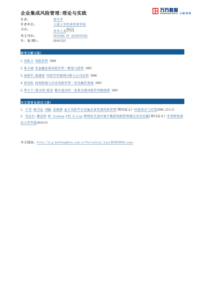 万方数据嘲风险与内控企业集成风险管理:理论与实践舢“皿舢.址龇舢舢““舢舢皿舢舢姒舢舢舢舢舢龇舢姒姒舢掣舢4_L“舢皿舢扯4_L舢舢扯舢掣.址皿舢—址.大连大学经济管理学院郑雪平【籀耍】进入20世纪90年代以来,集成风险管理成为企业风险管理的新趋势。文章对集成风险管理的内涵进行了重新界定,分析了集成风险管理的理论依据,并详细阐述了企业集成风险管理的实施要素以及具体的实施路线。【关键词】企业;风险;集成风险管理进入20世纪90年代以来。随着经济全球化、金融自由化的推进。传统的、分离式的风险管理模式或存在管理成本高、效率低等缺陷,或已不能适应新的、多变的市场环境。在这样的背景下,集成风险管理作为一种全新的管理理念应运而生,并被公认为风险管理领域的一次重要革命。一、集成风险管理的内涵风险源自客观事件的不确定性。根据风险造成的后果分类,可以将风险分为纯粹风险和投机风险。纯粹风险是指不能带来机会、无获利可能的风险,如火灾、地震、交通事故、洪灾、违约、犯罪、操作失误等等。纯粹风险只有两种可能的后果:造成损失或不造成损失。而且,一旦造成损失就是绝对的损失,没有人会从中获利。投机风险是指既可能带来机会、获得利益,又隐含威胁、造成损失的风险.如利率、汇率、金融产品和商品价格的波动等等。投机风险有三种可能的后果:造成损失、不造成损失和获得利益。11一纯粹风险与投机风险特点上的差异使得传统的风险管理特别倚重于纯粹风险。由于风险更多地被看作是遭受损失的可能性,因此,传统风险管理的主要目的是降低损失大小以及降低损失发生的可能性。并且,风险管理只在少数部门(如财务、法律、安全部门等)孤立进行,缺乏系统性、全局性。但是,到了20世纪90年代,人们开始意识到纯粹风险和投机风险往往交织在一起,相互关联、相互影响,甚至相互抵消。于是,现代风险管理的目标已不仅是降低损失发生的可能性及大小,而且要培育获利的能力,增加获利的可能性和大小,这便是集成风险管理或全面风险管理(IntegratedManagement。IRM)的思想渊源。集成风险管理包含两层意思:一是风险管理要覆盖来自不同风险种类、不同地理区域、不同业务部门和不同管理层的所有风险,包括纯粹风险和投机风险;二是要借助风险识别、+2011年度上海市教育委员会科研创新项目,编号:llZSl6;名称:用集成经营理论探索上海企业“走出去”的新路。m参见李社环:《企业风险管理的国际新趋势——整体风险管理》,《当代财经》,2003(11).财政部按照企业会计准则和应用指南等制定了《基于企业会计准则的可拓展商业报告语言(XBRL)通用分类标准(征求意见稿)》,要求将财务报表中列示和附注披露等相关要求,转化为XBRL形式的电子文档。在企业外部竞争日益严峻的情形下,企业内部控制不断出现新的需求,内控机制被不断地细化,对数据的采集、编辑使用也不再有固定的格式可以套用,而是需要随时进行迅速的重新组合,XBRL能符合系统的要求,是财务的“变形金刚”,它将有利于会计与企业内部控制的融合,为会计人员提供新思路,提高了他们对会计信息的综合与分析能力,从而帮助改善企业内部控制质量。所以,XBRL也将为内部控制相关研究提供机遇。●【主要参考文献】[1]李亨.美国内部控制实证研究:回顾与启示[1].审计研究,2009(1).[2]陈汉文,董望.财务报告内部控制研究述评:基于信息经济学的研究范式[.I].厦门大学学报(哲社版),[3]蔡吉埔.中国上市公司内部控制信息披露的实证研究[J].审计与经济研究,2005(5).[4]张颖,郑洪涛.我国企业内部控制有效性及其影响因素的调查与分析[J].审计研究,2010(1).[5]张川,沈红波,高新梓.内部控制的有效性、审计师评价与企业绩效[1].审计研究,2009(6).[6]张龙平,王军只,张军.内部控制鉴证对会计盈余质量的影响研究一基于沪市A股公司的经验证据[.I].审计研究,2010(2).[7]财政部等五部委.企业内部控制配套指引[S].2010.[8]财政部.基于企业会计准则的可拓展商业报告语言(xBRL)通用分类标准(征求意见稿)[z].2010.2010f3).Risk’+”●RJE~fJ^of’ACC0t.4N1ING万方数据风险与内控黔圈理论——基础、发展和应用》奠定了其在系统论研究领域的学风险评估、风险预警、风险应对、风险监控与管理改进等一套科学的风险管理方法和过程,及时、有效地发现和控制那些对企业价值有负面影响的风险,挖掘和利用那些有利于企业潜在发展并可能获得盈利的风险,最终实现企业价值和股东财富的最大化。与传统的风险管理模式相比,集成风险管理具有以下特征:(1)管理对象由过去的纯粹风险扩展为纯粹风险和投机风险并存;(2)管理目的由单一的降低或消除损失发生的可能性及大小