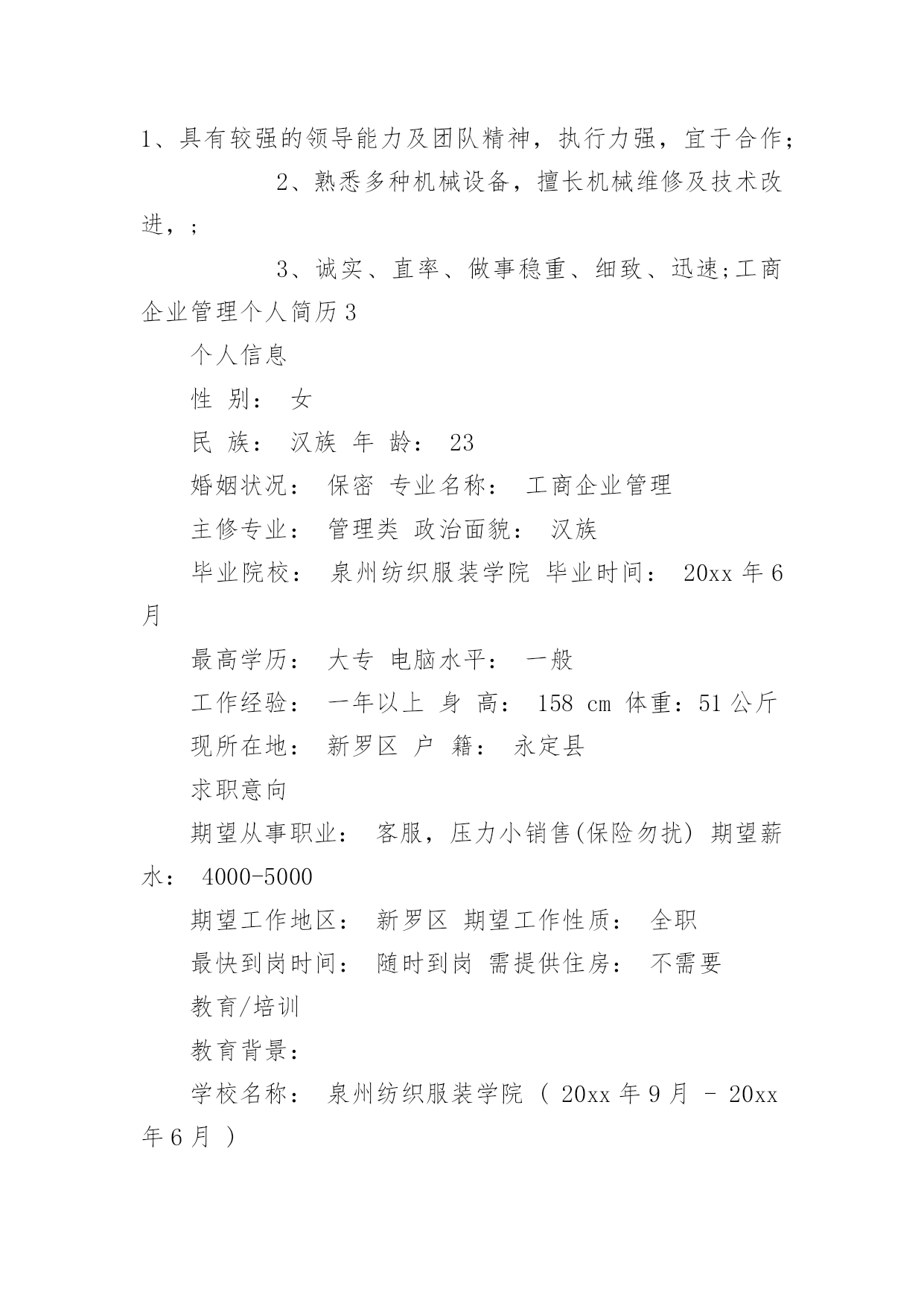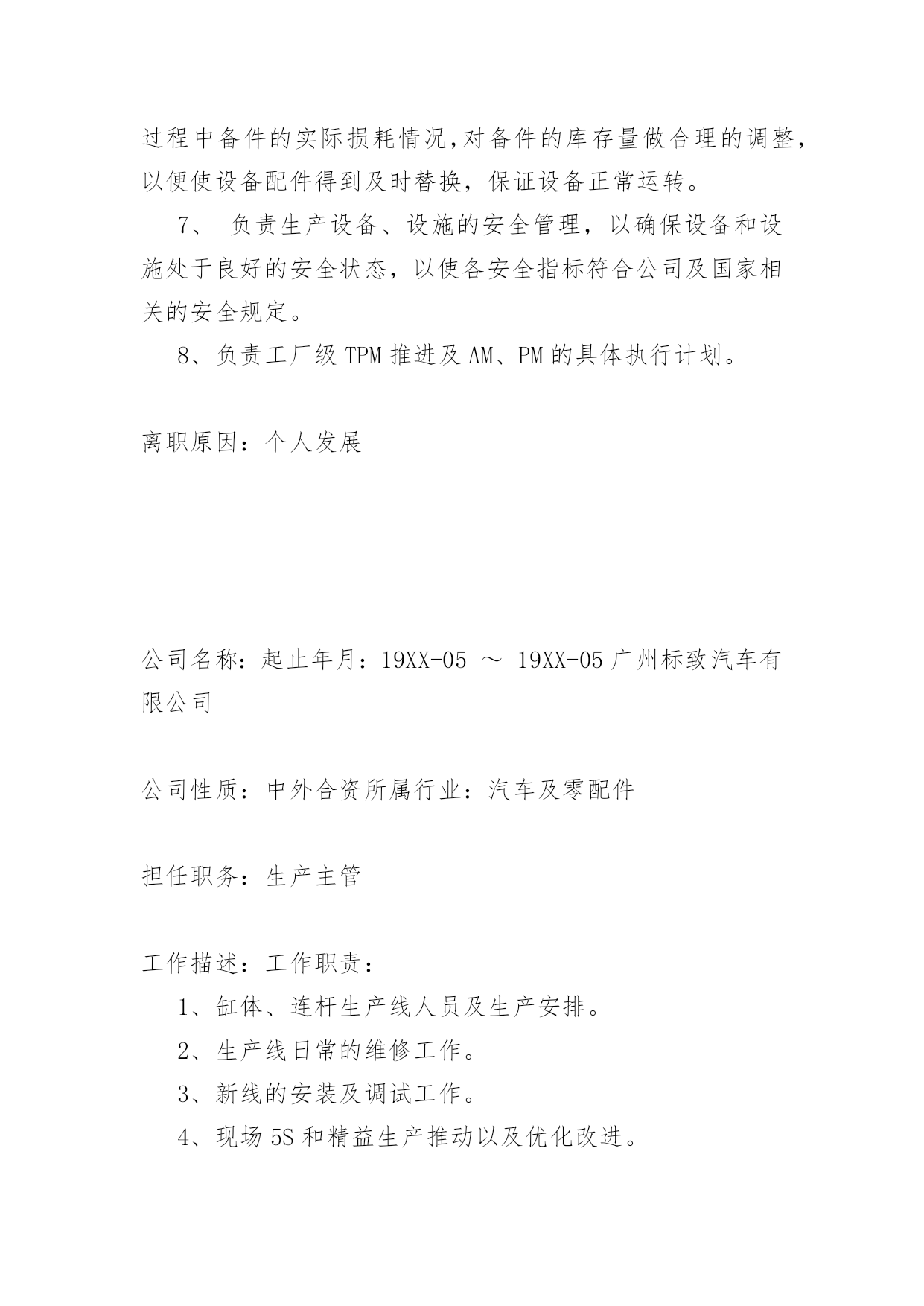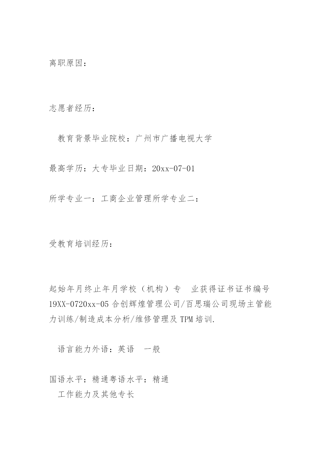 工商企业管理个人简历工商企业管理个人简历光阴迅速,一眨眼就过去了,相信很多朋友又忙着找工作呢吧,这时候可别把简历给忘了哦。但是怎么写才更能吸引眼球呢?以下是小编收集整理的工商企业管理个人简历,欢迎大家借鉴与参考,希望对大家有所帮助。工商企业管理个人简历1个人概况:姓名:性别:女出生年月:1992年6月7日毕业院校:中南财经政法大学专业:工商企业管理联系电话:×××××××××××电子邮箱:×××@***.com英语水平:能熟练的进行听、说、读、写。并通过国家英语四级考试。尤其擅长撰写和回复英文商业信函,熟练运用网络查阅相关英文资料并能及时予以翻译。计算机水平:计算机等级考试二级,熟悉网络和电子商务。熟练办公自动化,熟练操作Wordexcel能独立操作并及时高效的完成日常办公文档的编辑工作。实习经历总结:20xx年7月某化工网站电子商务实习。实习期间主要职责是1、协助网站编辑在互联网查阅国内以及国外的化工信息。2、搜集,整理相关的中英文资料。20xx年7月某信息咨询公司专职话务咨询工作认真负责有效、及时、准确的服务于客户敬业的工作态度和超额的业绩,赢得了同事和主管的认可。教育背景:20xx年9月——20xx年7月中南财经政法大学主修课程:法律基础,审计学,统计学,会计学,管理学,人力资源管理,物流管理,企业战略管理,企业管理案例分析,广告学,市场营销学。专业选修课:企业产品的市场定位企业员工的绩效考核职位说明书与岗位报告获奖情况:三次校三等奖学金一次校单项奖学金自我评价:本人性格开朗、思维活跃,易于沟通,具有较好团队的意识,善于与同事相处。做事塌实,自觉服从公司纪律,对公司忠诚。工商企业管理个人简历2简历编号:更新日期:姓名:国籍:中国目前所在地:萝岗区民族:汉族户口所在地:广州身材:180cm85kg婚姻状况:年龄:诚信徽章:通讯地址:联系电话:家庭电话:手机:QQ号码:电子邮件:个人主页:求职意向及工作经历人才类型:普通求职应聘职位:化工、食品/饮料工程、工作年限:18职称:求职类型:全职可到职日期:随时月薪要求:12000--20000希望工作地区:广州个人工作经历:公司名称:起止年月:1996-07~20xx-03吉百利糖果(广州)有限公司公司性质:外商独资所属行业:快速消费品(食品,饮料,化妆品)担任职务:工程/设备经理工作描述:主要工作职责:1、负责全厂生产区域设备---主要包括GD5000、20xx条形包装机、K-H、BOSCH糖果生产线等设备的的预防性计划制定、执行监控及OEE、Downtime跟踪与异常原因分析等。2、负责全厂蒸汽、空调及电力、厂房等公共设施的日常、定期维护计划制定和异常问题解决。3、负责全厂生产设备及费用节省改造项目及新设备、设施安装调试。具体的工作职责如下:1、开发国产化机械零部件;负责对生产设备(工艺)的改良改进工作的评估和审核。3、根据年度保养计划设定设备维护保养的年度预算,及确保预算的制定在合理的范围内。4、制定年度的人员发展培训计划,及相关的评估考核制度。5、组织协调内部资源实施设备和设施的维修保养,负责重大设备的维护,指导解决问题,以确保充分利用内部资源实施设备、设施的维修保养。6、负责生产设备的备件进行跟踪和优化管理,根据生产过程中备件的实际损耗情况,对备件的库存量做合理的调整,以便使设备配件得到及时替换,保证设备正常运转。7、负责生产设备、设施的安全管理,以确保设备和设施处于良好的安全状态,以使各安全指标符合公司及国家相关的安全规定。8、负责工厂级TPM推进及AM、PM的具体执行计划。离职原因:个人发展公司名称:起止年月:19XX-05~19XX-05广州标致汽车有限公司公司性质:中外合资所属行业:汽车及零配件担任职务:生产主管工作描述:工作职责:1、缸体、连杆生产线人员及生产安排。2、生产线日常的维修工作。3、新线的安装及调试工作。4、现场5S和精益生产推动以及优化改进。离职原因:志愿者经历:教育背景毕业院校:广州市广播电视大学最高学历:大专毕业日期:20xx-07-01所学专业一:工商企业管理所学专业二:受教育培训经历:起始年月终止年月学校(机构)专业获得证书证书编号19XX-0720xx-05合创辉煌管理公司/百思瑞公司现场主管能力训练/制造成本分析/维修管理及TPM培训.语言能力外语:英语一般国语水平:精通粤语水平:精通工作能力及其他专长1、具有较强的领导能力及团队精神,执行力强,宜于合作;2、熟悉多种机械设备,擅长机械维修及技术改进,;3、诚实、直率、做事稳重、细致、迅速;工商企业管理个人简历3个人信息性别:女民族:汉族年龄:23婚姻状况:保密专业名称:工商企业管理主修专业:管理类政治面貌:汉族毕业院校:泉州纺织服装学院毕业时间:20xx年6月最高学历:大专电脑水