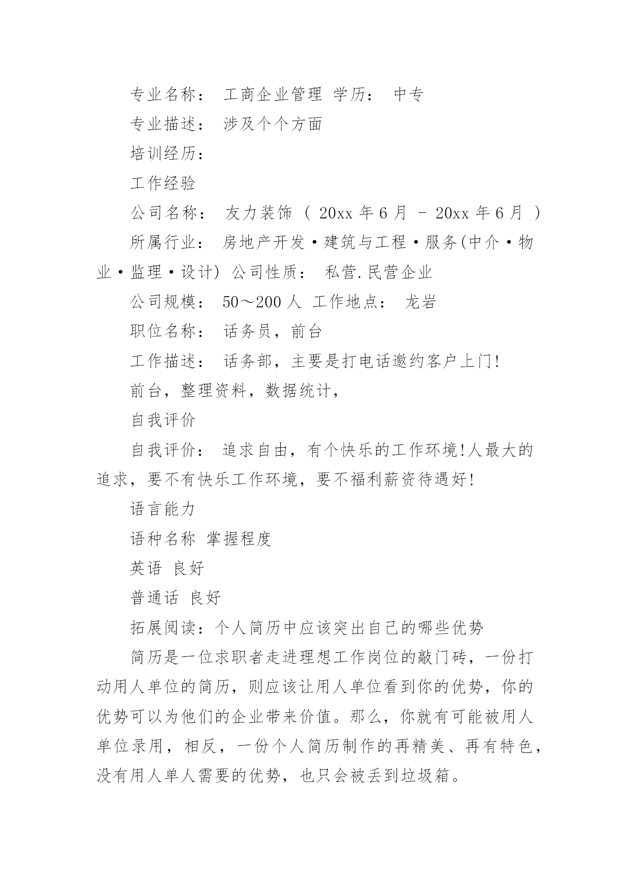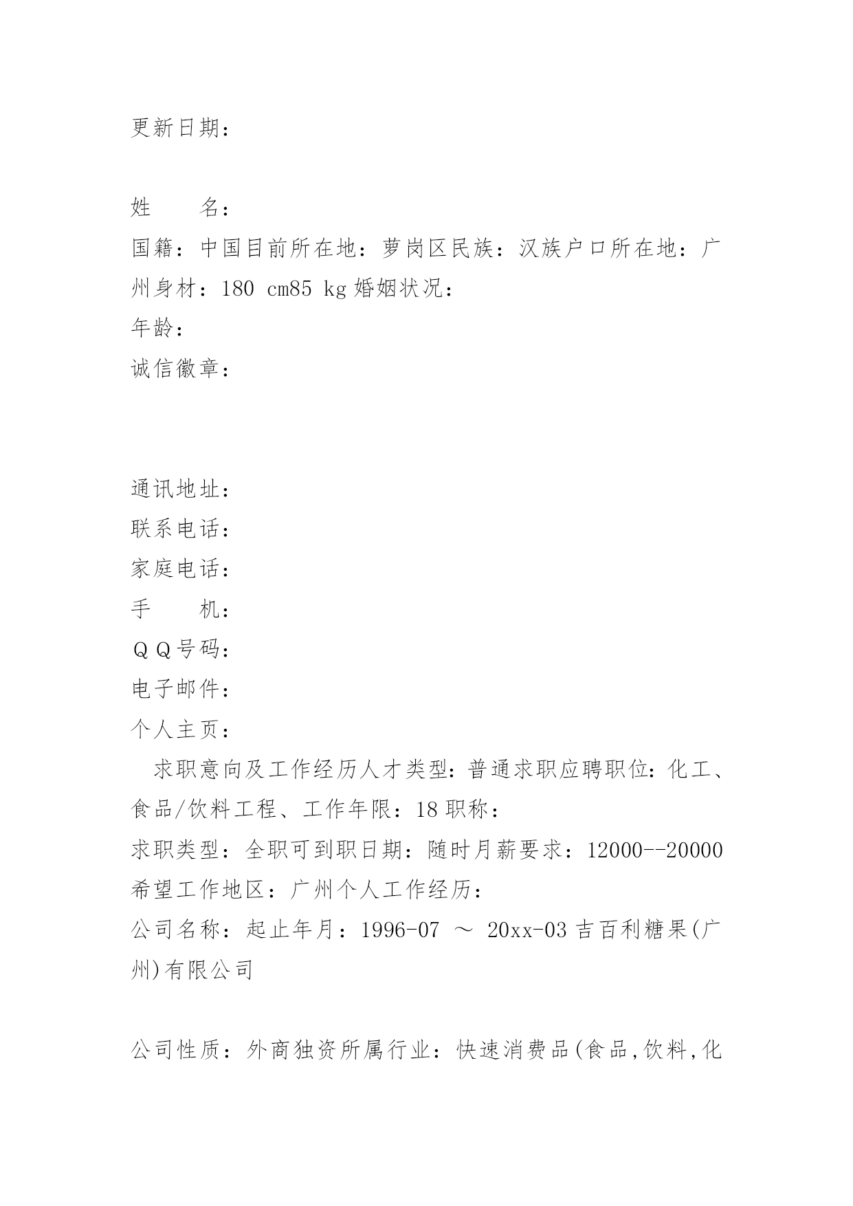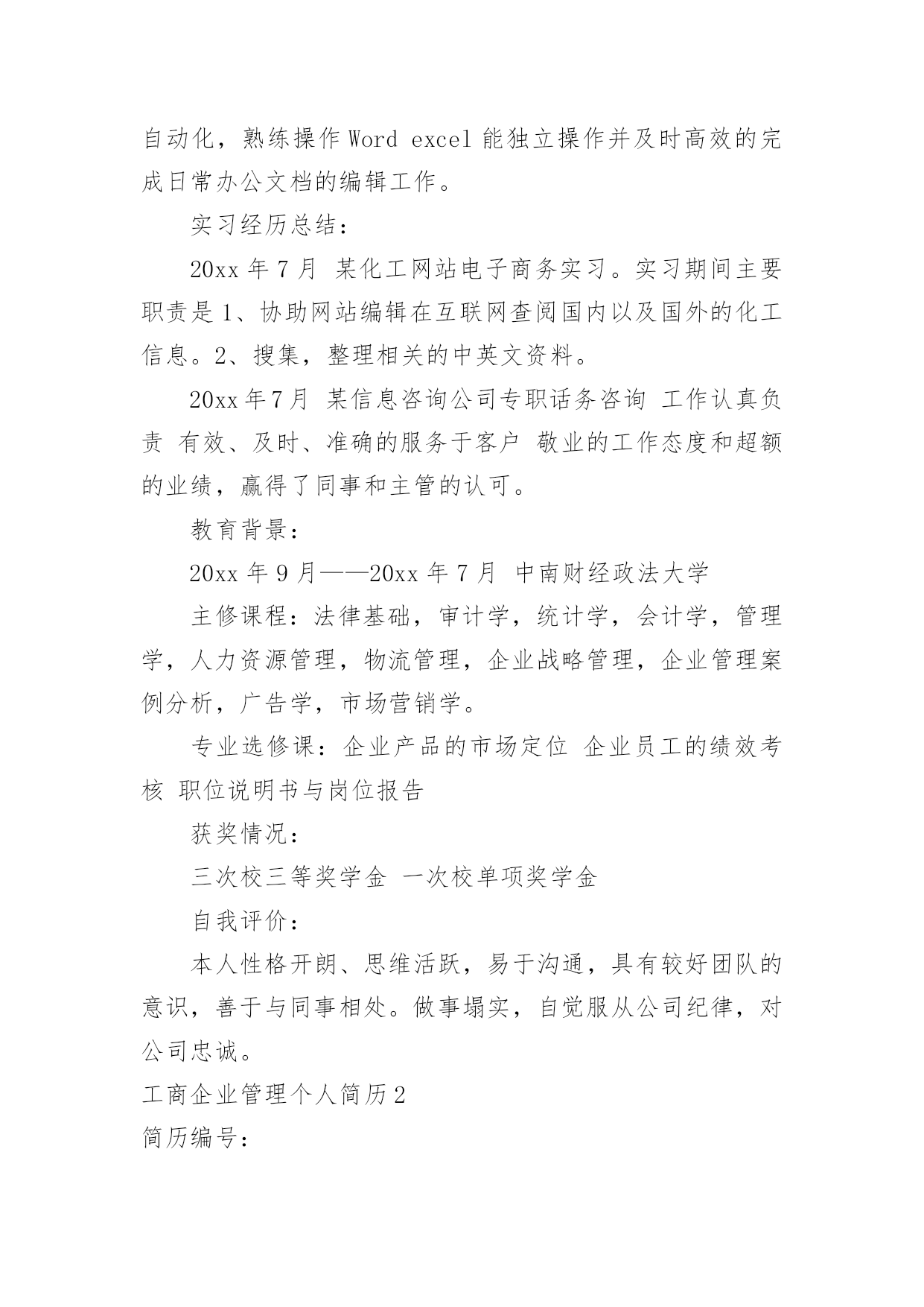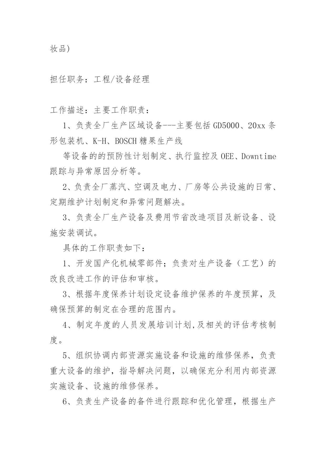 工商企业管理个人简历工商企业管理个人简历光阴迅速,一眨眼就过去了,相信很多朋友又忙着找工作呢吧,这时候可别把简历给忘了哦。但是怎么写才更能吸引眼球呢?以下是小编收集整理的工商企业管理个人简历,欢迎大家借鉴与参考,希望对大家有所帮助。工商企业管理个人简历1个人概况:姓名:性别:女出生年月:1992年6月7日毕业院校:中南财经政法大学专业:工商企业管理联系电话:×××××××××××电子邮箱:×××@***.com英语水平:能熟练的进行听、说、读、写。并通过国家英语四级考试。尤其擅长撰写和回复英文商业信函,熟练运用网络查阅相关英文资料并能及时予以翻译。计算机水平:计算机等级考试二级,熟悉网络和电子商务。熟练办公自动化,熟练操作Wordexcel能独立操作并及时高效的完成日常办公文档的编辑工作。实习经历总结:20xx年7月某化工网站电子商务实习。实习期间主要职责是1、协助网站编辑在互联网查阅国内以及国外的化工信息。2、搜集,整理相关的中英文资料。20xx年7月某信息咨询公司专职话务咨询工作认真负责有效、及时、准确的服务于客户敬业的工作态度和超额的业绩,赢得了同事和主管的认可。教育背景:20xx年9月——20xx年7月中南财经政法大学主修课程:法律基础,审计学,统计学,会计学,管理学,人力资源管理,物流管理,企业战略管理,企业管理案例分析,广告学,市场营销学。专业选修课:企业产品的市场定位企业员工的绩效考核职位说明书与岗位报告获奖情况:三次校三等奖学金一次校单项奖学金自我评价:本人性格开朗、思维活跃,易于沟通,具有较好团队的意识,善于与同事相处。做事塌实,自觉服从公司纪律,对公司忠诚。工商企业管理个人简历2简历编号:更新日期:姓名:国籍:中国目前所在地:萝岗区民族:汉族户口所在地:广州身材:180cm85kg婚姻状况:年龄:诚信徽章:通讯地址:联系电话:家庭电话:手机:QQ号码:电子邮件:个人主页:求职意向及工作经历人才类型:普通求职应聘职位:化工、食品/饮料工程、工作年限:18职称:求职类型:全职可到职日期:随时月薪要求:12000--20000希望工作地区:广州个人工作经历:公司名称:起止年月:1996-07~20xx-03吉百利糖果(广州)有限公司公司性质:外商独资所属行业:快速消费品(食品,饮料,化妆品)担任职务:工程/设备经理工作描述:主要工作职责:1、负责全厂生产区域设备---主要包括GD5000、20xx条形包装机、K-H、BOSCH糖果生产线等设备的的预防性计划制定、执行监控及OEE、Downtime跟踪与异常原因分析等。2、负责全厂蒸汽、空调及电力、厂房等公共设施的日常、定期维护计划制定和异常问题解决。3、负责全厂生产设备及费用节省改造项目及新设备、设施安装调试。具体的工作职责如下:1、开发国产化机械零部件;负责对生产设备(工艺)的改良改进工作的评估和审核。3、根据年度保养计划设定设备维护保养的年度预算,及确保预算的制定在合理的范围内。4、制定年度的人员发展培训计划,及相关的评估考核制度。5、组织协调内部资源实施设备和设施的维修保养,负责重大设备的维护,指导解决问题,以确保充分利用内部资源实施设备、设施的维修保养。6、负责生产设备的备件进行跟踪和优化管理,根据生产过程中备件的实际损耗情况,对备件的库存量做合理的调整,以便使设备配件得到及时替换,保证设备正常运转。7、负责生产设备、设施的安全管理,以确保设备和设施处于良好的安全状态,以使各安全指标符合公司及国家相关的安全规定。8、负责工厂级TPM推进及AM、PM的具体执行计划。离职原因:个人发展公司名称:起止年月:19XX-05~19XX-05广州标致汽车有限公司公司性质:中外合资所属行业:汽车及零配件担任职务:生产主管工作描述:工作职责:1、缸体、连杆生产线人员及生产安排。2、生产线日常的维修工作。3、新线的安装及调试工作。4、现场5S和精益生产推动以及优化改进。离职原因:志愿者经历:教育背景毕业院校:广州市广播电视大学最高学历:大专毕业日期:20xx-07-01所学专业一:工商企业管理所学专业二:受教育培训经历:起始年月终止年月学校(机构)专业获得证书证书编号19XX-0720xx-05合创辉煌管理公司/百思瑞公司现场主管能力训练/制造成本分析/维修管理及TPM培训.语言能力外语:英语一般国语水平:精通粤语水平:精通工作能力及其他专长1、具有较强的领导能力及团队精神,执行力强,宜于合作;2、熟悉多种机械设备,擅长机械维修及技术改进,;3、诚实、直率、做事稳重、细致、迅速;工商企业管理个人简历3个人信息性别:女民族:汉族年龄:23婚姻状况:保密专业名称:工商企业管理主修专业:管理类政治面貌:汉族毕业院校:泉州纺织服装学院毕业时间:20xx年6月最高学历:大专电脑水