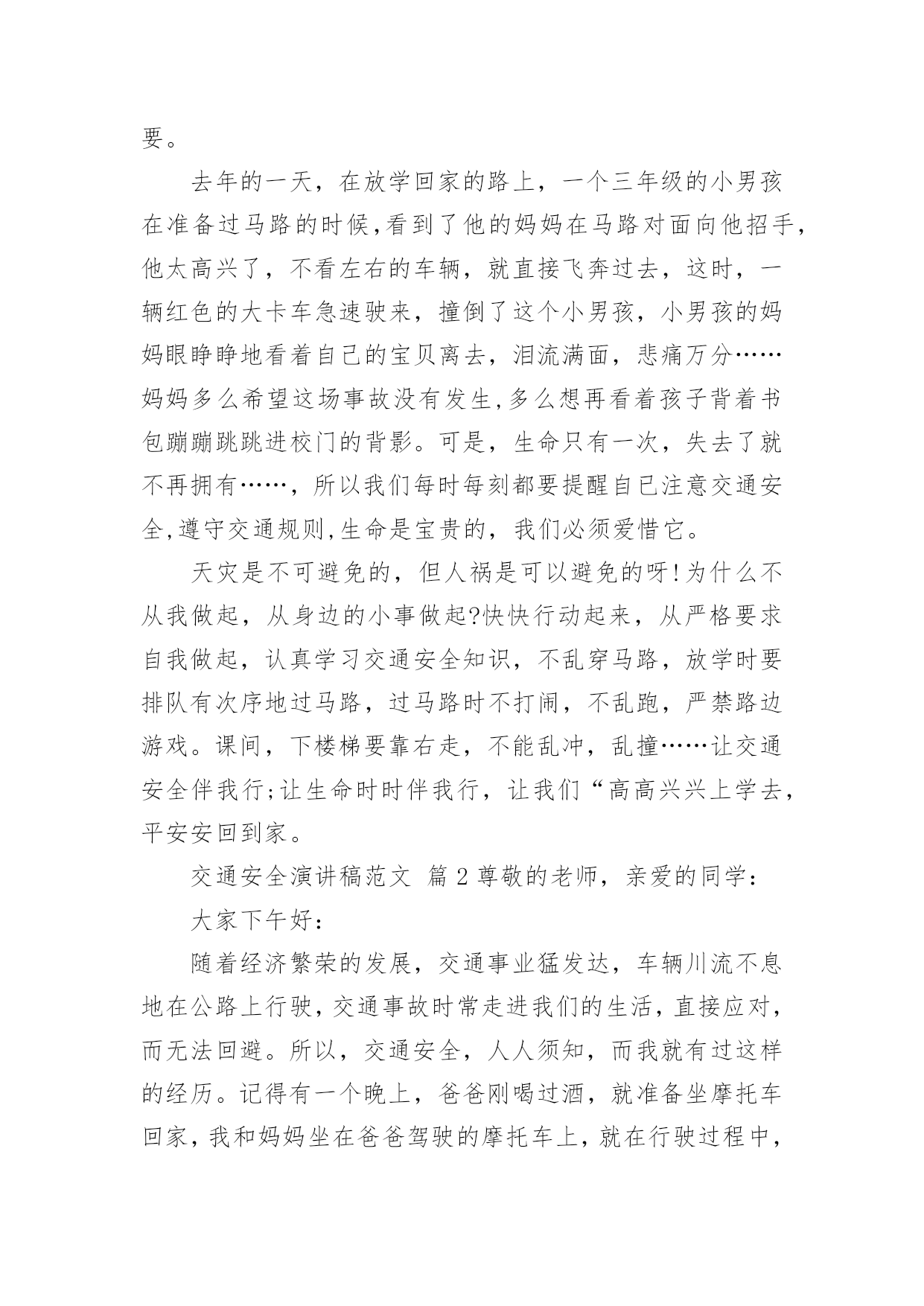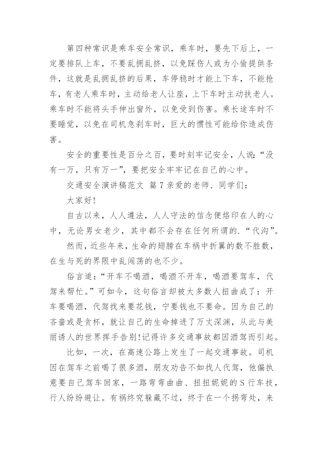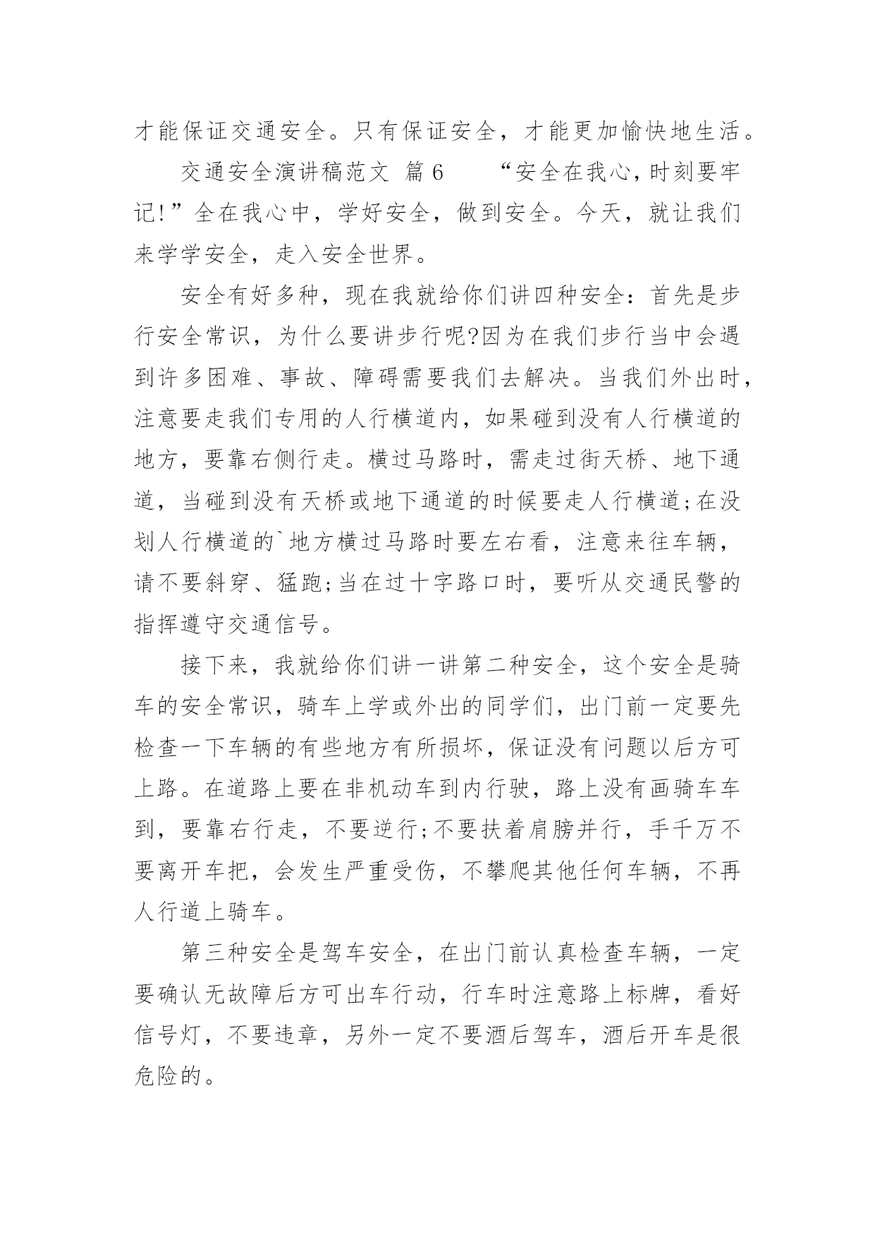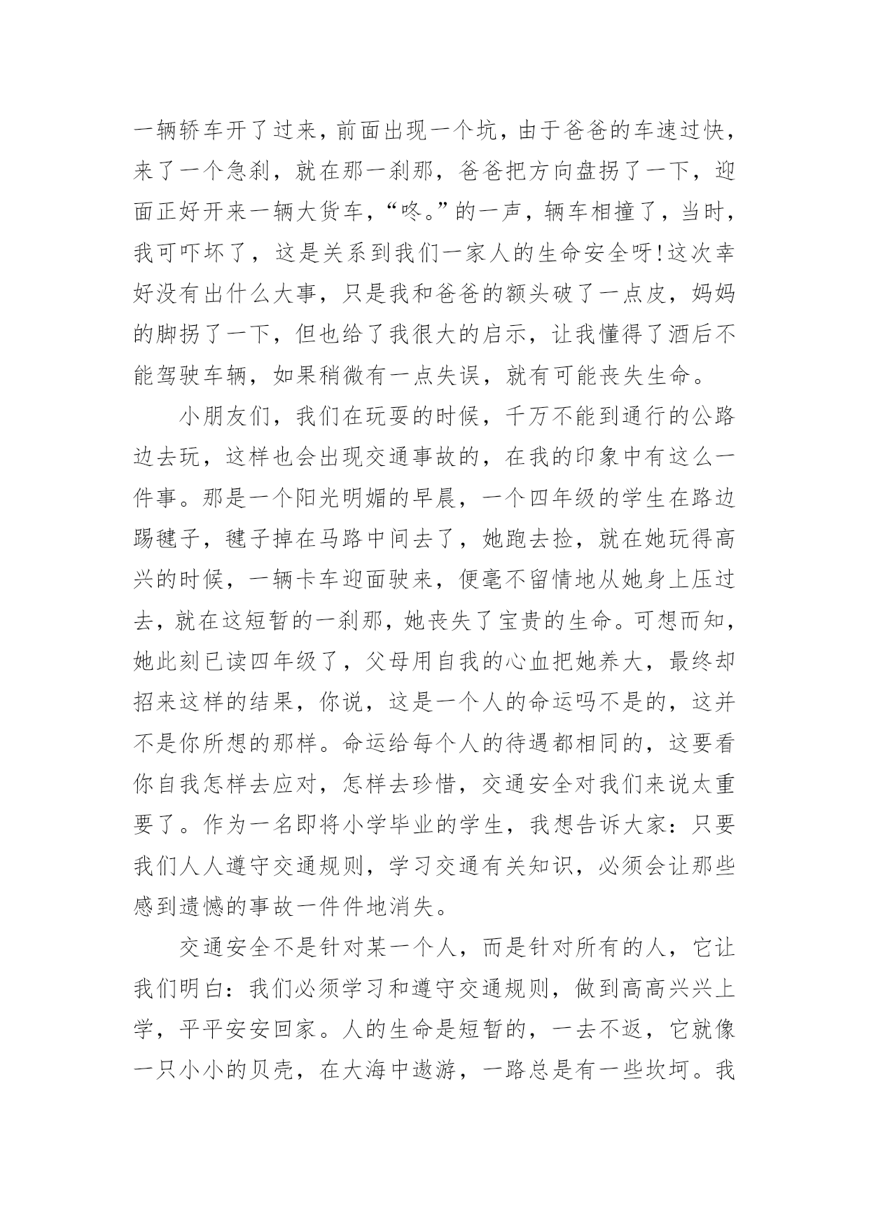 交通安全演讲稿交通安全演讲稿范文[集合14篇]演讲稿的内容要根据具体情境、具体场合来确定,要求情感真实,尊重观众。在我们平凡的日常里,我们使用上演讲稿的情况与日俱增,如何写一份恰当的演讲稿呢?下面是小编整理的交通安全演讲稿范文,欢迎阅读,希望大家能够喜欢。交通安全演讲稿范文篇1亲爱的老师、同学们:大家好!随着科学技术的不断发展,现在家家都开起了小轿车,过起了“高大上”的生活。我们时时刻刻无不在享受着交通发展带来的便利,而交通也在用它独特的方式时刻提醒着它那令人不寒而栗的弊端,时刻让人类付出血的代价。生命只有一次,每当我们驾着车打电话时、闯红绿灯时、酒驾时,你可曾想过,死神每时每刻都有可能降临。自从1886年,德国人本茨发明了汽车后,全球因交通事故而死亡的人数高达4000万人。这可比第一次世界大战和第二次世界大战加起来死的人还要多。据计算,20xx年至20xx年我国共发生交通事故219万起,每一分钟就有一个人因交通事故而伤亡。这是多么可怕的数字啊!看到这些惊人的`数字时,你的内心有没有很大的触动呢?也许这些对交通事故的统计数据,还并不能触动你的内心。但是,接下的这例鲜活的事例,会让我们真正的明白,交通安全是多么的重要。去年的一天,在放学回家的路上,一个三年级的小男孩在准备过马路的时候,看到了他的妈妈在马路对面向他招手,他太高兴了,不看左右的车辆,就直接飞奔过去,这时,一辆红色的大卡车急速驶来,撞倒了这个小男孩,小男孩的妈妈眼睁睁地看着自己的宝贝离去,泪流满面,悲痛万分……妈妈多么希望这场事故没有发生,多么想再看着孩子背着书包蹦蹦跳跳进校门的背影。可是,生命只有一次,失去了就不再拥有……,所以我们每时每刻都要提醒自已注意交通安全,遵守交通规则,生命是宝贵的,我们必须爱惜它。天灾是不可避免的,但人祸是可以避免的呀!为什么不从我做起,从身边的小事做起?快快行动起来,从严格要求自我做起,认真学习交通安全知识,不乱穿马路,放学时要排队有次序地过马路,过马路时不打闹,不乱跑,严禁路边游戏。课间,下楼梯要靠右走,不能乱冲,乱撞……让交通安全伴我行;让生命时时伴我行,让我们“高高兴兴上学去,平安安回到家。交通安全演讲稿范文篇2尊敬的老师,亲爱的同学:大家下午好:随着经济繁荣的发展,交通事业猛发达,车辆川流不息地在公路上行驶,交通事故时常走进我们的生活,直接应对,而无法回避。所以,交通安全,人人须知,而我就有过这样的经历。记得有一个晚上,爸爸刚喝过酒,就准备坐摩托车回家,我和妈妈坐在爸爸驾驶的摩托车上,就在行驶过程中,一辆轿车开了过来,前面出现一个坑,由于爸爸的车速过快,来了一个急刹,就在那一刹那,爸爸把方向盘拐了一下,迎面正好开来一辆大货车,“咚。”的一声,辆车相撞了,当时,我可吓坏了,这是关系到我们一家人的生命安全呀!这次幸好没有出什么大事,只是我和爸爸的额头破了一点皮,妈妈的脚拐了一下,但也给了我很大的启示,让我懂得了酒后不能驾驶车辆,如果稍微有一点失误,就有可能丧失生命。小朋友们,我们在玩耍的时候,千万不能到通行的公路边去玩,这样也会出现交通事故的,在我的印象中有这么一件事。那是一个阳光明媚的早晨,一个四年级的学生在路边踢毽子,毽子掉在马路中间去了,她跑去捡,就在她玩得高兴的时候,一辆卡车迎面驶来,便毫不留情地从她身上压过去,就在这短暂的一刹那,她丧失了宝贵的生命。可想而知,她此刻已读四年级了,父母用自我的心血把她养大,最终却招来这样的结果,你说,这是一个人的命运吗不是的,这并不是你所想的那样。命运给每个人的待遇都相同的,这要看你自我怎样去应对,怎样去珍惜,交通安全对我们来说太重要了。作为一名即将小学毕业的学生,我想告诉大家:只要我们人人遵守交通规则,学习交通有关知识,必须会让那些感到遗憾的事故一件件地消失。交通安全不是针对某一个人,而是针对所有的人,它让我们明白:我们必须学习和遵守交通规则,做到高高兴兴上学,平平安安回家。人的生命是短暂的,一去不返,它就像一只小小的贝壳,在大海中遨游,一路总是有一些坎坷。我们要敲响交通安全的警钟,永远铭记血的教训,学习交通全知识,遵守交通规则,提高交通安全意识,让生命之树矗立挺拔。亲爱的同学们:为使同学们进一步的熟悉和掌握相应的交通安全法律常识,增强交通安全意识,提高自我保护能力,维护道路交通秩序,确保道路交通安全,下面我讲二个方面的问题:一、怎样走路1、在道路划有机动车道、非机动车道和人行道的道路上,行人应当在人行道内走,在没有划分上述车道的道路上,行人要靠道路的右侧通行。2、在通过有交通信号灯、班马线等交通设施的路口时,要按信号指示走人行横道线。3、在通过没有交通设施路口时,要注意过往车辆,在确定安全后方可通过。4、不许在公路上、街路上和机动车道上坐卧、停留、打闹、来回奔跑、相互追逐,随意突然横