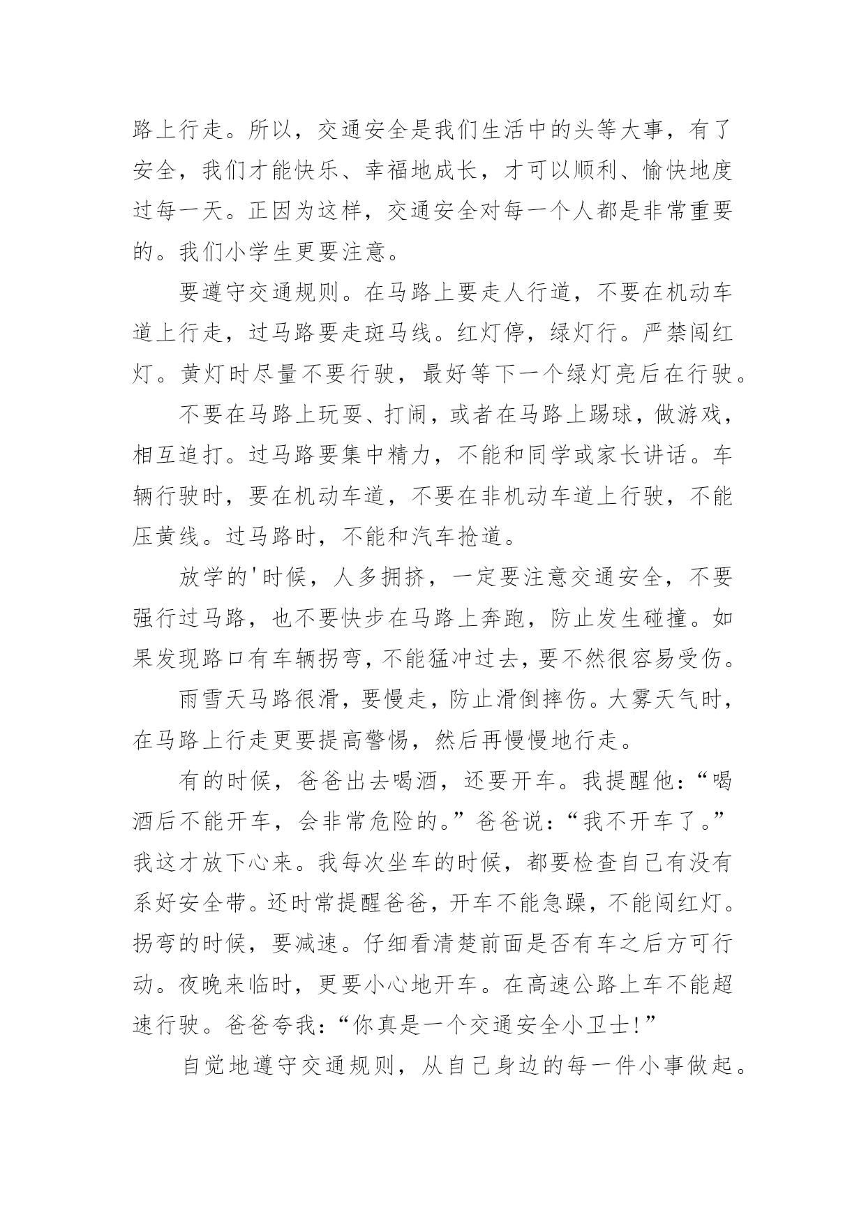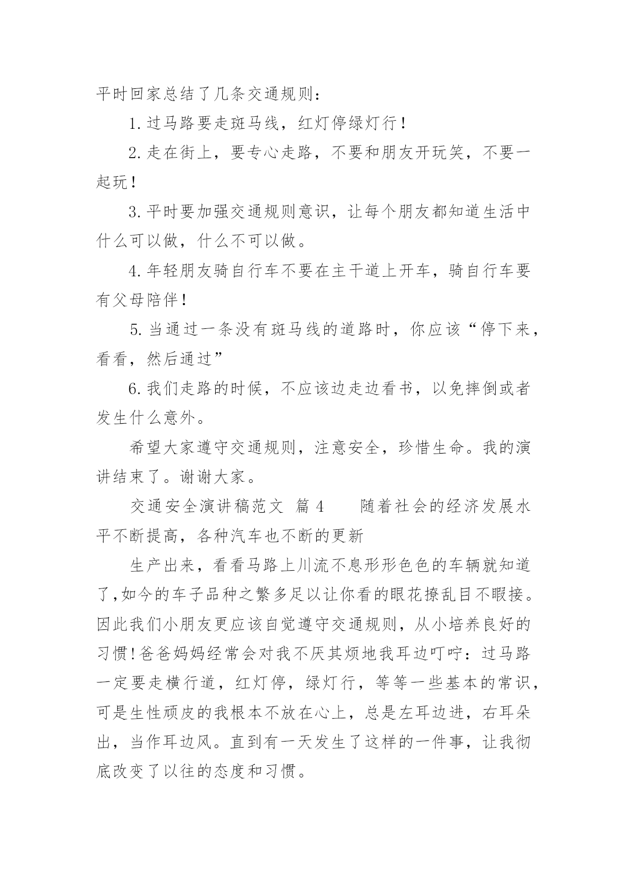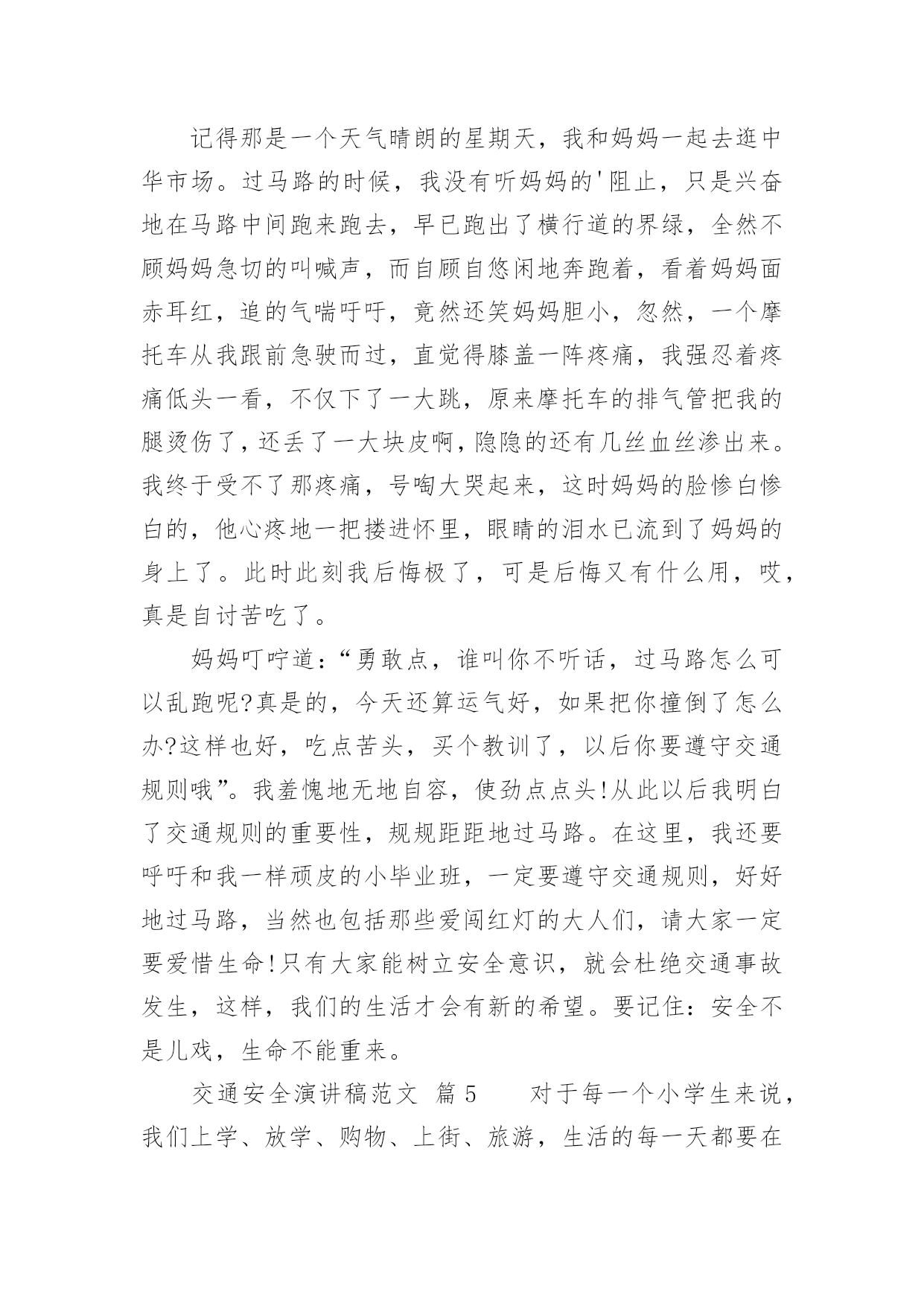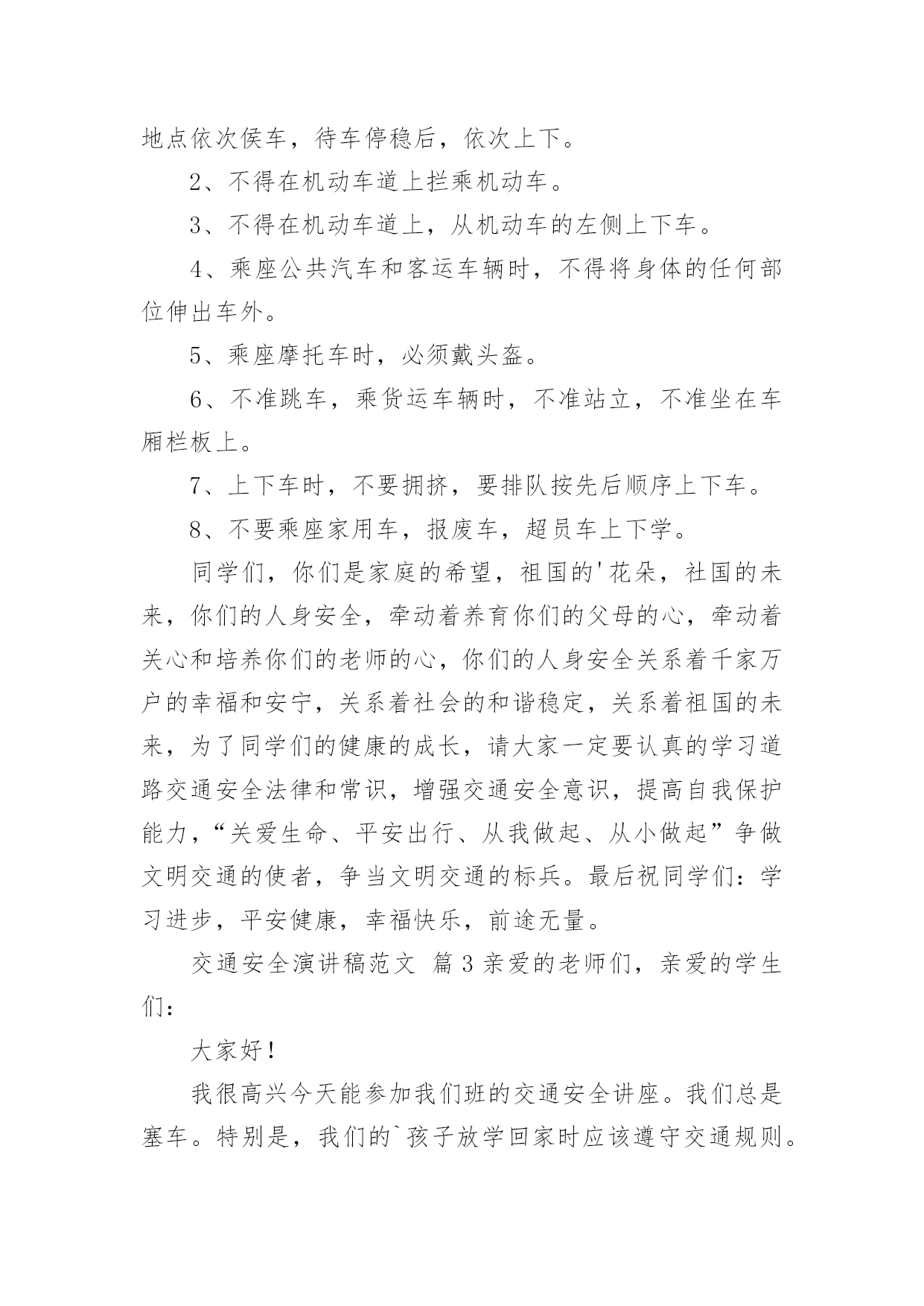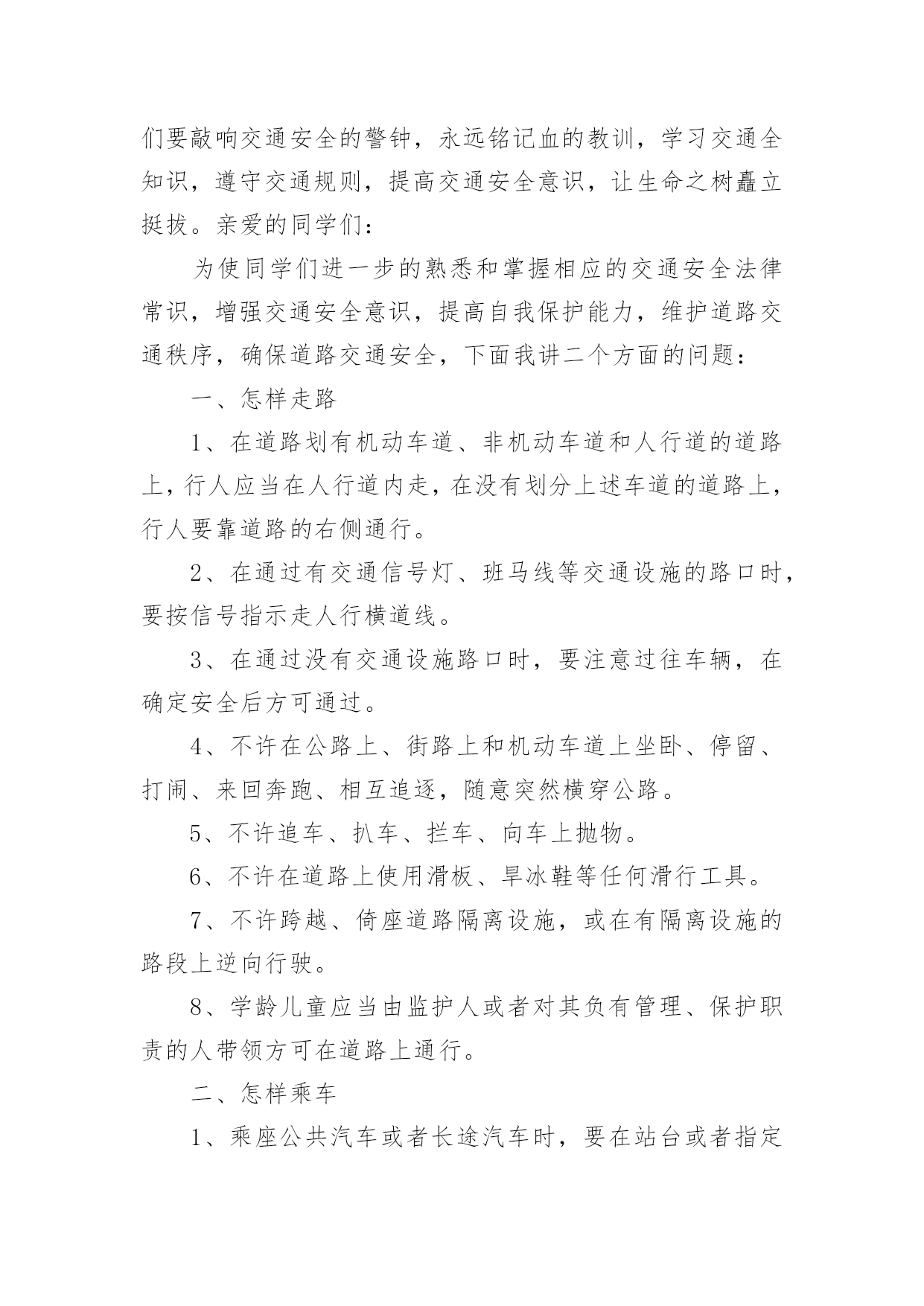 交通安全演讲稿交通安全演讲稿范文[集合14篇]演讲稿的内容要根据具体情境、具体场合来确定,要求情感真实,尊重观众。在我们平凡的日常里,我们使用上演讲稿的情况与日俱增,如何写一份恰当的演讲稿呢?下面是小编整理的交通安全演讲稿范文,欢迎阅读,希望大家能够喜欢。交通安全演讲稿范文篇1亲爱的老师、同学们:大家好!随着科学技术的不断发展,现在家家都开起了小轿车,过起了“高大上”的生活。我们时时刻刻无不在享受着交通发展带来的便利,而交通也在用它独特的方式时刻提醒着它那令人不寒而栗的弊端,时刻让人类付出血的代价。生命只有一次,每当我们驾着车打电话时、闯红绿灯时、酒驾时,你可曾想过,死神每时每刻都有可能降临。自从1886年,德国人本茨发明了汽车后,全球因交通事故而死亡的人数高达4000万人。这可比第一次世界大战和第二次世界大战加起来死的人还要多。据计算,20xx年至20xx年我国共发生交通事故219万起,每一分钟就有一个人因交通事故而伤亡。这是多么可怕的数字啊!看到这些惊人的`数字时,你的内心有没有很大的触动呢?也许这些对交通事故的统计数据,还并不能触动你的内心。但是,接下的这例鲜活的事例,会让我们真正的明白,交通安全是多么的重要。去年的一天,在放学回家的路上,一个三年级的小男孩在准备过马路的时候,看到了他的妈妈在马路对面向他招手,他太高兴了,不看左右的车辆,就直接飞奔过去,这时,一辆红色的大卡车急速驶来,撞倒了这个小男孩,小男孩的妈妈眼睁睁地看着自己的宝贝离去,泪流满面,悲痛万分……妈妈多么希望这场事故没有发生,多么想再看着孩子背着书包蹦蹦跳跳进校门的背影。可是,生命只有一次,失去了就不再拥有……,所以我们每时每刻都要提醒自已注意交通安全,遵守交通规则,生命是宝贵的,我们必须爱惜它。天灾是不可避免的,但人祸是可以避免的呀!为什么不从我做起,从身边的小事做起?快快行动起来,从严格要求自我做起,认真学习交通安全知识,不乱穿马路,放学时要排队有次序地过马路,过马路时不打闹,不乱跑,严禁路边游戏。课间,下楼梯要靠右走,不能乱冲,乱撞……让交通安全伴我行;让生命时时伴我行,让我们“高高兴兴上学去,平安安回到家。交通安全演讲稿范文篇2尊敬的老师,亲爱的同学:大家下午好:随着经济繁荣的发展,交通事业猛发达,车辆川流不息地在公路上行驶,交通事故时常走进我们的生活,直接应对,而无法回避。所以,交通安全,人人须知,而我就有过这样的经历。记得有一个晚上,爸爸刚喝过酒,就准备坐摩托车回家,我和妈妈坐在爸爸驾驶的摩托车上,就在行驶过程中,一辆轿车开了过来,前面出现一个坑,由于爸爸的车速过快,来了一个急刹,就在那一刹那,爸爸把方向盘拐了一下,迎面正好开来一辆大货车,“咚。”的一声,辆车相撞了,当时,我可吓坏了,这是关系到我们一家人的生命安全呀!这次幸好没有出什么大事,只是我和爸爸的额头破了一点皮,妈妈的脚拐了一下,但也给了我很大的启示,让我懂得了酒后不能驾驶车辆,如果稍微有一点失误,就有可能丧失生命。小朋友们,我们在玩耍的时候,千万不能到通行的公路边去玩,这样也会出现交通事故的,在我的印象中有这么一件事。那是一个阳光明媚的早晨,一个四年级的学生在路边踢毽子,毽子掉在马路中间去了,她跑去捡,就在她玩得高兴的时候,一辆卡车迎面驶来,便毫不留情地从她身上压过去,就在这短暂的一刹那,她丧失了宝贵的生命。可想而知,她此刻已读四年级了,父母用自我的心血把她养大,最终却招来这样的结果,你说,这是一个人的命运吗不是的,这并不是你所想的那样。命运给每个人的待遇都相同的,这要看你自我怎样去应对,怎样去珍惜,交通安全对我们来说太重要了。作为一名即将小学毕业的学生,我想告诉大家:只要我们人人遵守交通规则,学习交通有关知识,必须会让那些感到遗憾的事故一件件地消失。交通安全不是针对某一个人,而是针对所有的人,它让我们明白:我们必须学习和遵守交通规则,做到高高兴兴上学,平平安安回家。人的生命是短暂的,一去不返,它就像一只小小的贝壳,在大海中遨游,一路总是有一些坎坷。我们要敲响交通安全的警钟,永远铭记血的教训,学习交通全知识,遵守交通规则,提高交通安全意识,让生命之树矗立挺拔。亲爱的同学们:为使同学们进一步的熟悉和掌握相应的交通安全法律常识,增强交通安全意识,提高自我保护能力,维护道路交通秩序,确保道路交通安全,下面我讲二个方面的问题:一、怎样走路1、在道路划有机动车道、非机动车道和人行道的道路上,行人应当在人行道内走,在没有划分上述车道的道路上,行人要靠道路的右侧通行。2、在通过有交通信号灯、班马线等交通设施的路口时,要按信号指示走人行横道线。3、在通过没有交通设施路口时,要注意过往车辆,在确定安全后方可通过。4、不许在公路上、街路上和机动车道上坐卧、停留、打闹、来回奔跑、相互追逐,随意突然横