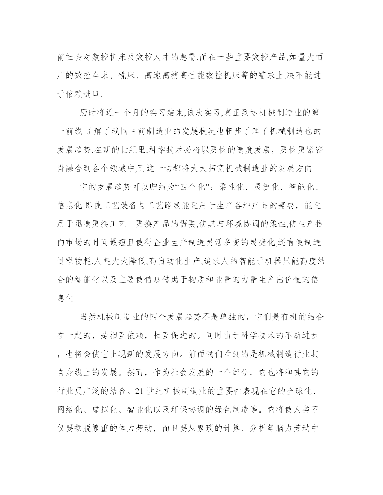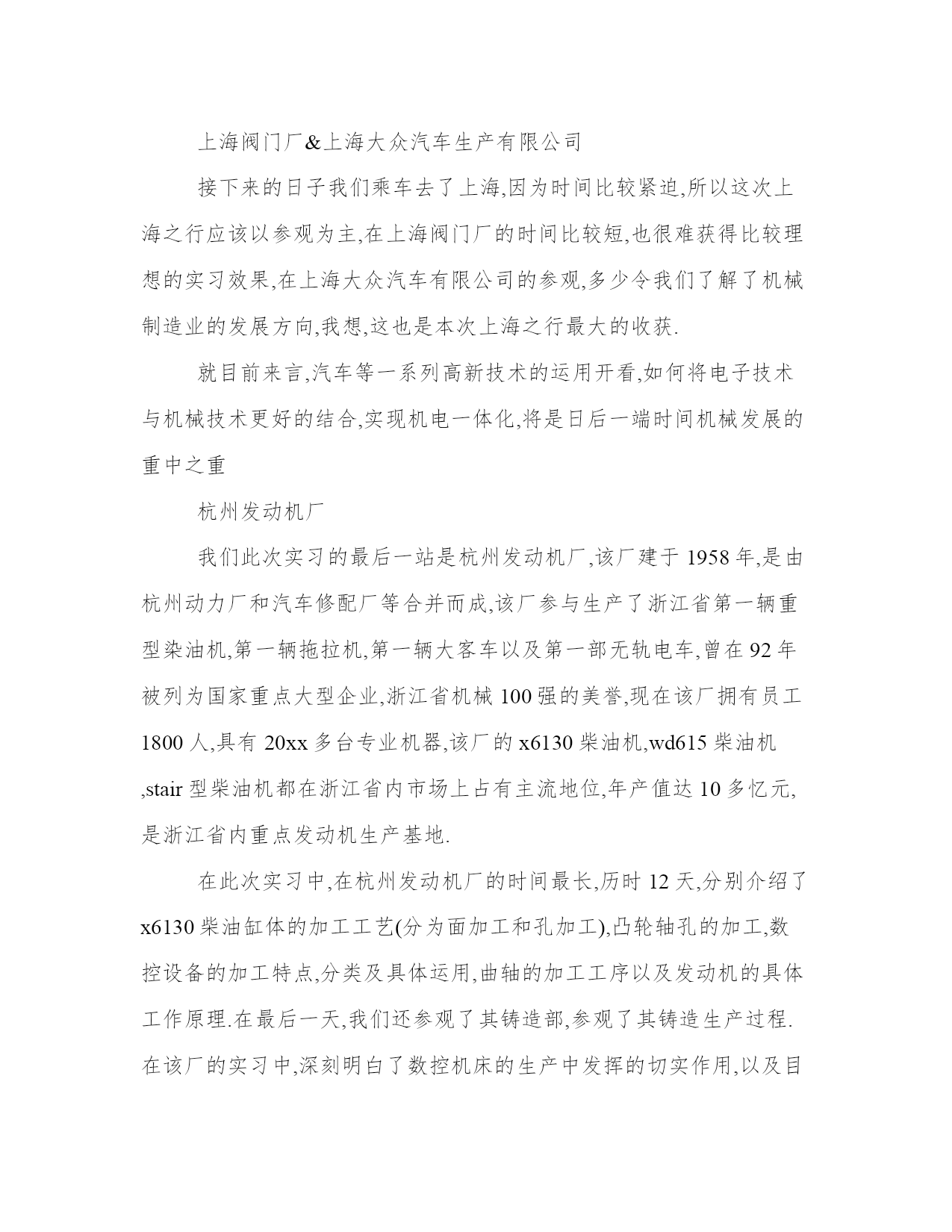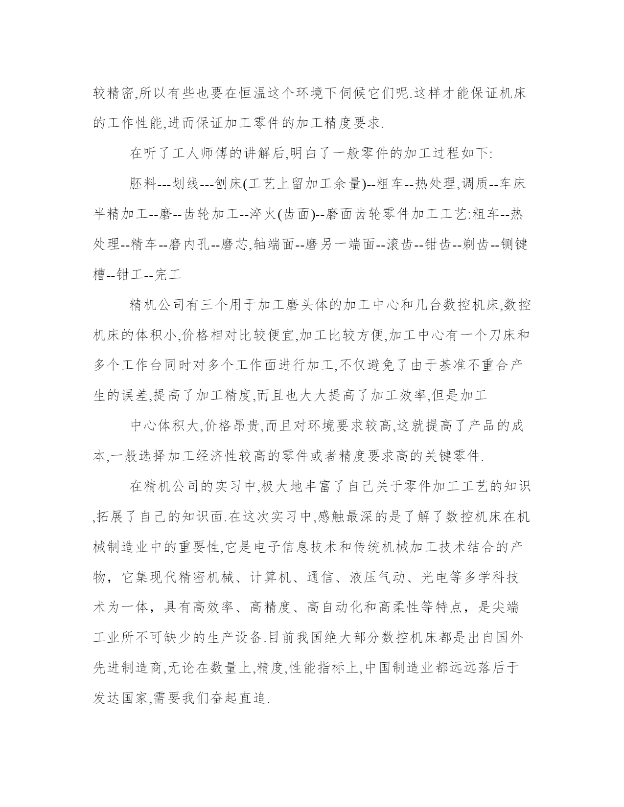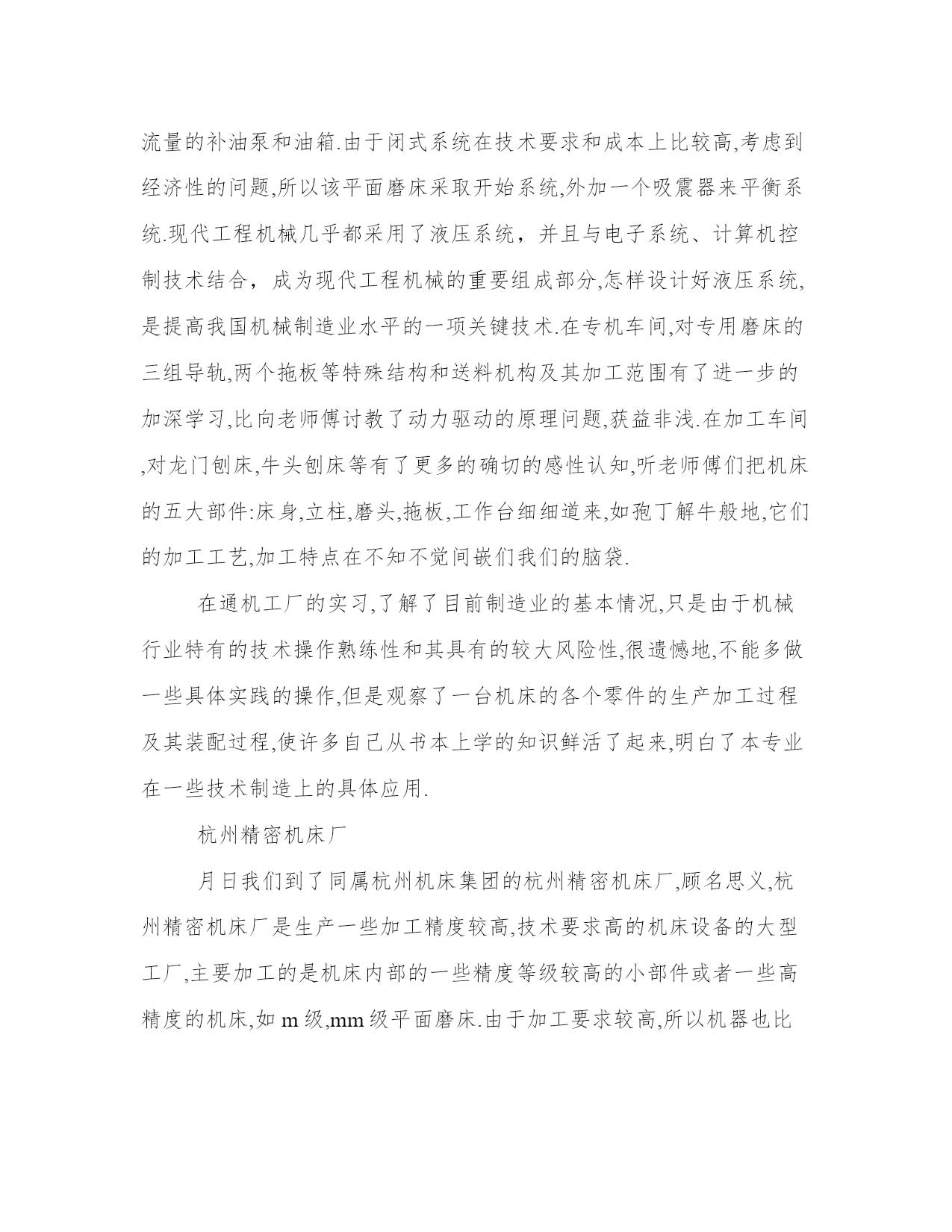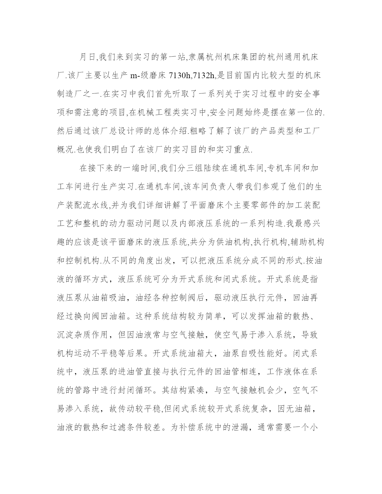 机电专业生机床厂社会实践报告总结读了三年的大学,然而大多数人对本专业的认识还是不够,在大二期末学院曾为我们组织了两个星期的见习,但由于当时所学知识涉及本专业知识不多,所看到的东西与本专业很难联系起来,所以对本专业掌握并不是很理想.今年暑假,学院为了使我们更多了解机电产品、设备,提高对机电工程制造技术的认识,加深机电在工业各领域应用的感性认识,开阔视野,了解相关设备及技术资料,熟悉典型零件的加工工艺,特意安排了我们到几个拥有较多类型的机电一体化设备,生产技术较先进的工厂进行生产操作实习.为期23天的生产实习,我们先后去过了杭州通用机床厂,杭州机密机床加工工厂,上海阀门加工工厂,上海大众汽车厂以及杭州发动机厂等大型工厂,了解这些工厂的生产情况,与本专业有关的各种知识,各厂工人的工作情况等等。第一次亲身感受了所学知识与实际的应用,传感器在空调设备的应用了,电子技术在机械制造工业的应用了,精密机械制造在机器制造的应用了,等等理论与实际的相结合,让我们大开眼界,也是对以前所学知识的一个初审.通过这次生产实习,进一步巩固和深化所学的理论知识,弥补以前单一理论教学的不足,为后续专业课学习和毕业设计打好基础.杭州通用机床厂月日,我们来到实习的第一站,隶属杭州机床集团的杭州通用机床厂.该厂主要以生产m-级磨床7130h,7132h,是目前国内比较大型的机床制造厂之一.在实习中我们首先听取了一系列关于实习过程中的安全事项和需注意的项目,在机械工程类实习中,安全问题始终是摆在第一位的.然后通过该厂总设计师的总体介绍.粗略了解了该厂的产品类型和工厂概况.也使我们明白了在该厂的实习目的和实习重点.在接下来的一端时间,我们分三组陆续在通机车间,专机车间和加工车间进行生产实习.在通机车间,该车间负责人带我们参观了他们的生产装配流水线,并为我们详细讲解了平面磨床个主要零部件的加工装配工艺和整机的动力驱动问题以及内部液压系统的一系列构造.我最感兴趣的应该是该平面磨床的液压系统,共分为供油机构,执行机构,辅助机构和控制机构.从不同的角度出发,可以把液压系统分成不同的形式.按油液的循环方式,液压系统可分为开式系统和闭式系统。开式系统是指液压泵从油箱吸油,油经各种控制阀后,驱动液压执行元件,回油再经过换向阀回油箱。这种系统结构较为简单,可以发挥油箱的散热、沉淀杂质作用,但因油液常与空气接触,使空气易于渗入系统,导致机构运动不平稳等后果。开式系统油箱大,油泵自吸性能好。闭式系统中,液压泵的进油管直接与执行元件的回油管相连,工作液体在系统的管路中进行封闭循环。其结构紧凑,与空气接触机会少,空气不易渗入系统,故传动较平稳,但闭式系统较开式系统复杂,因无油箱,油液的散热和过滤条件较差。为补偿系统中的泄漏,通常需要一个小流量的补油泵和油箱.由于闭式系统在技术要求和成本上比较高,考虑到经济性的问题,所以该平面磨床采取开始系统,外加一个吸震器来平衡系统.现代工程机械几乎都采用了液压系统,并且与电子系统、计算机控制技术结合,成为现代工程机械的重要组成部分,怎样设计好液压系统,是提高我国机械制造业水平的一项关键技术.在专机车间,对专用磨床的三组导轨,两个拖板等特殊结构和送料机构及其加工范围有了进一步的加深学习,比向老师傅讨教了动力驱动的原理问题,获益非浅.在加工车间,对龙门刨床,牛头刨床等有了更多的确切的感性认知,听老师傅们把机床的五大部件:床身,立柱,磨头,拖板,工作台细细道来,如孢丁解牛般地,它们的加工工艺,加工特点在不知不觉间嵌们我们的脑袋.在通机工厂的实习,了解了目前制造业的基本情况,只是由于机械行业特有的技术操作熟练性和其具有的较大风险性,很遗憾地,不能多做一些具体实践的操作,但是观察了一台机床的各个零件的生产加工过程及其装配过程,使许多自己从书本上学的知识鲜活了起来,明白了本专业在一些技术制造上的具体应用.杭州精密机床厂月日我们到了同属杭州机床集团的杭州精密机床厂,顾名思义,杭州精密机床厂是生产一些加工精度较高,技术要求高的机床设备的大型工厂,主要加工的是机床内部的一些精度等级较高的小部件或者一些高精度的机床,如m级,mm级平面磨床.由于加工要求较高,所以机器也比较精密,所以有些也要在恒温这个环境下伺候它们呢.这样才能保证机床的工作性能,进而保证加工零件的加工精度要求.在听了工人师傅的讲解后,明白了一般零件的加工过程如下:胚料---划线---刨床(工艺上留加工余量)--粗车--热处理,调质--车床半精加工--磨--齿轮加工--淬火(齿面)--磨面齿轮零件加工工艺:粗车--热处理--精车--磨内孔--磨芯,轴端面--磨另一端面--滚齿--钳齿--剃齿--铡键槽--钳工--完工精机公司有三个用于加工磨头体的加工中心和几台数控机床,数控机床的体积小,价