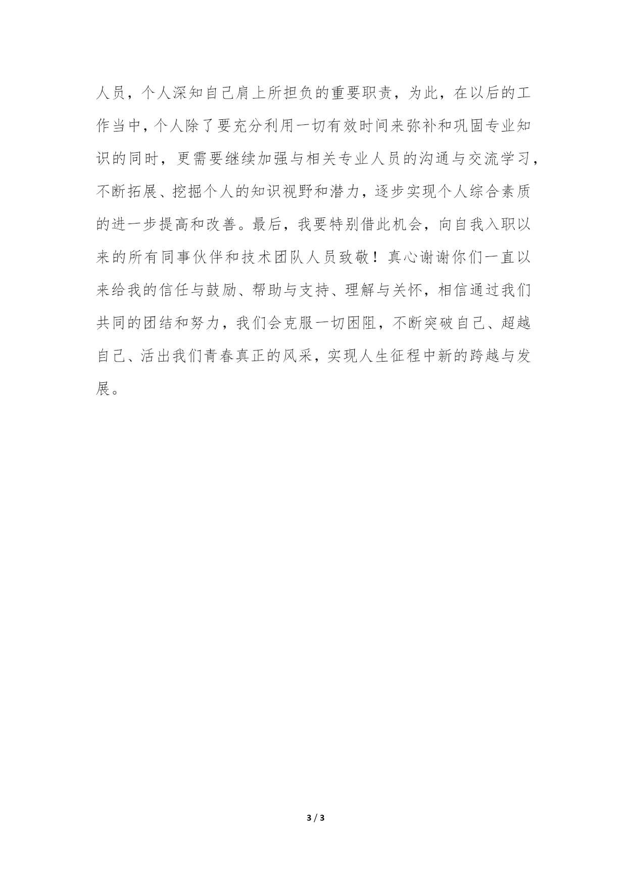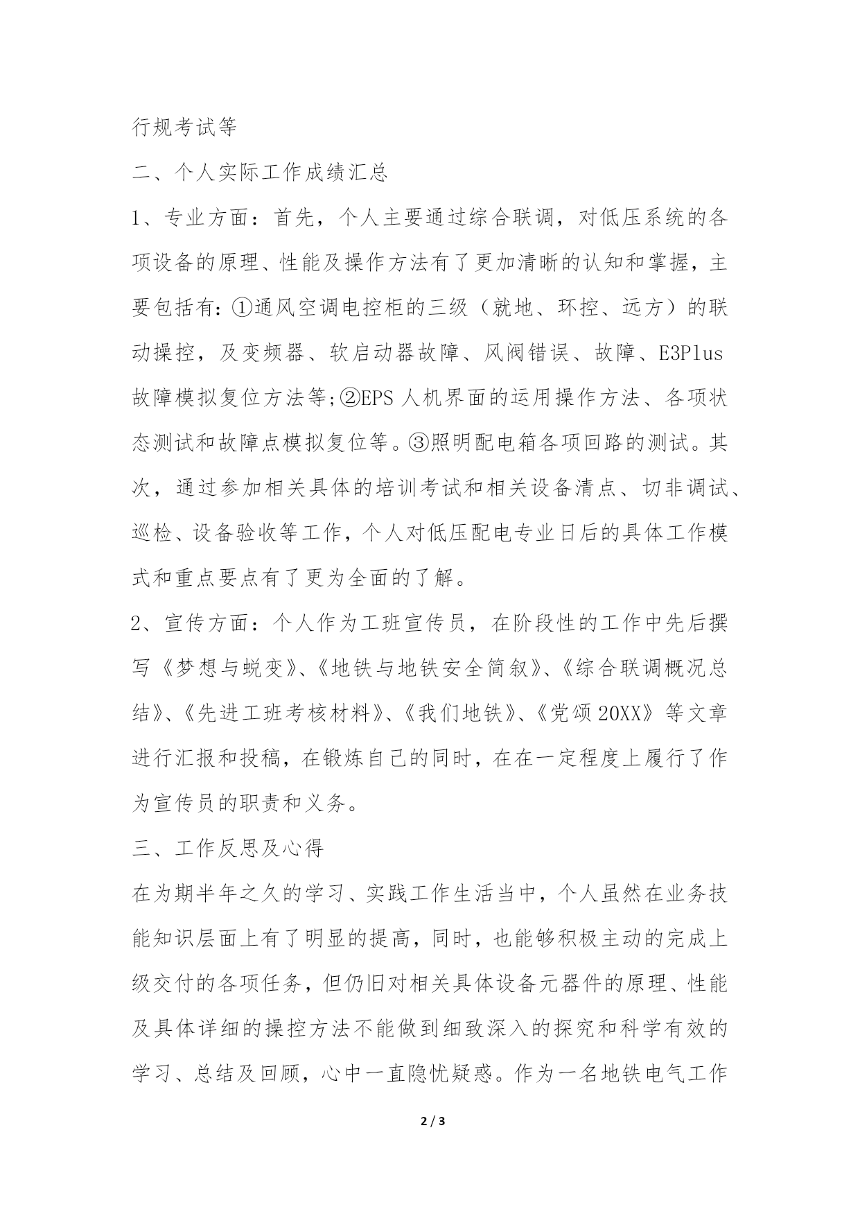 PAGE3/NUMPAGES3机电车间员工个人上半年总结机电车间员工个人上半年总结正式进驻运营分公司参加工作已经有半年之久,很幸运的,我进入了一个充满青春朝气,斗志昂扬,团结奋发的部门团队——设施部机电车间。在这半年里,个人收获颇多,感触匪浅,现将这半年个人的相关情况作以简要总结,具体情况如下:一、重要工作事项2、全线设备巡检。根据车间领导安排,在相关技术人员的一致协商与指导下,车间各大专业分别组织成立巡检小组,对全线17个站各专业设备,实行循环制不间断的检查工作,并详细记录设备的具体运行情况,并将发现问题作以详细汇总上报。我低压专业主要负责通风空调电控柜、EPS应急照明装置、照明配电箱三大部分。3、设备资产清点移交。按照计划任务安排,个人主要参加了南稍门站、凤城五路站的资产清点接收。期间,主要由厂家人员、施工单位人员共同协助,针对站内所有电气设备进行逐一清点核查。4、参加部门车间相关培训及考试。①相关培训:升降机理论实操培训,工器具使用方法培训,综合联调相关专业理论知识培训等。②相关考试:安全月度考试、技术月度考试,临时上岗证考试,行规考试等二、个人实际工作成绩汇总1、专业方面:首先,个人主要通过综合联调,对低压系统的各项设备的原理、性能及操作方法有了更加清晰的认知和掌握,主要包括有:①通风空调电控柜的三级(就地、环控、远方)的联动操控,及变频器、软启动器故障、风阀错误、故障、E3Plus故障模拟复位方法等;②EPS人机界面的运用操作方法、各项状态测试和故障点模拟复位等。③照明配电箱各项回路的测试。其次,通过参加相关具体的培训考试和相关设备清点、切非调试、巡检、设备验收等工作,个人对低压配电专业日后的具体工作模式和重点要点有了更为全面的了解。2、宣传方面:个人作为工班宣传员,在阶段性的工作中先后撰写《梦想与蜕变》、《地铁与地铁安全简叙》、《综合联调概况总结》、《先进工班考核材料》、《我们地铁》、《党颂20XX》等文章进行汇报和投稿,在锻炼自己的同时,在在一定程度上履行了作为宣传员的职责和义务。三、工作反思及心得在为期半年之久的学习、实践工作生活当中,个人虽然在业务技能知识层面上有了明显的提高,同时,也能够积极主动的完成上级交付的各项任务,但仍旧对相关具体设备元器件的原理、性能及具体详细的操控方法不能做到细致深入的探究和科学有效的学习、总结及回顾,心中一直隐忧疑惑。作为一名地铁电气工作人员,个人深知自己肩上所担负的重要职责,为此,在以后的工作当中,个人除了要充分利用一切有效时间来弥补和巩固专业知识的同时,更需要继续加强与相关专业人员的沟通与交流学习,不断拓展、挖掘个人的知识视野和潜力,逐步实现个人综合素质的进一步提高和改善。最后,我要特别借此机会,向自我入职以来的所有同事伙伴和技术团队人员致敬!真心谢谢你们一直以来给我的信任与鼓励、帮助与支持、理解与关怀,相信通过我们共同的团结和努力,我们会克服一切困阻,不断突破自己、超越自己、活出我们青春真正的风采,实现人生征程中新的跨越与发展。