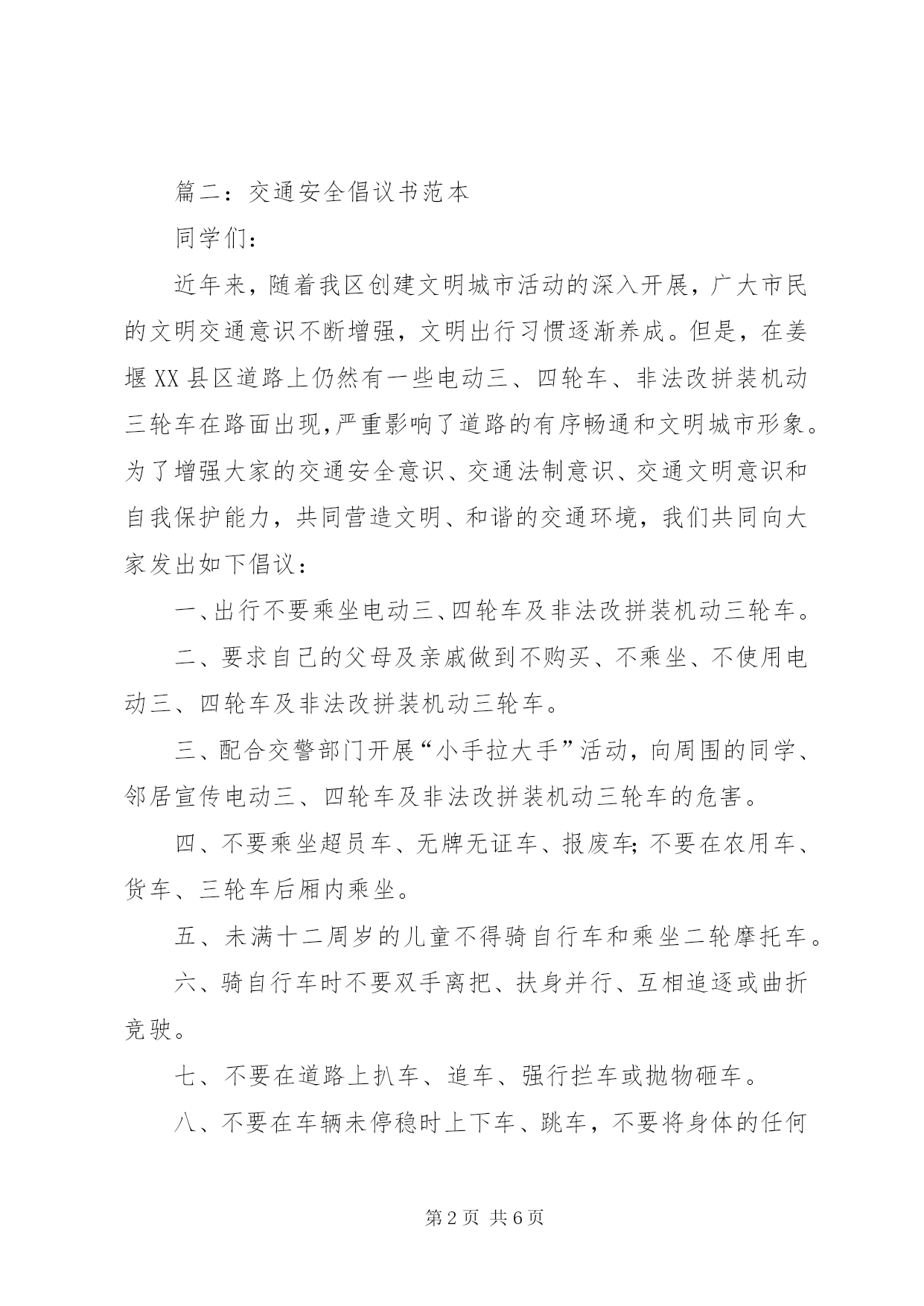第PAGE\*Arabic\*MERGEFORMAT6页共NUMPAGES\*MERGEFORMAT6页交通安全倡议书范本篇一:交通安全倡议书范本同学们:俗话说:“没有规矩不成方圆”。遵守交通规则是我们应尽的责任和义务。为了增强同学们的交通安全意识、交通法制意识、交通文明意识和自我保护能力,共同营造文明、和谐的交通环境,为了你我的生命安全,郑重地向全体同学提出以下几点倡议:一、认真学习、宣传和自觉遵守交通安全法律法规,增强社会公德意识和交通安全意识,树立文明交通新风。自觉遵守交通信号、交通标志、交通标线,服从交通警察的指挥;通过路口要遵守“红灯停、绿灯行”。二、文明走路。必须在人行道行走,没有人行道的靠路右边行走。不闯红灯,不三五成群并肩走,不贪图方便翻越、钻跨交通隔离护栏,不在马路上追逐打闹嬉戏,不在马路上使用划板,旱冰鞋,不要穿越、倚坐在马路边的护栏、花台上;三、文明骑车。未满12周岁、未经家长及学校同意不准骑自行车;做到不闯红灯,不走快车道,不扶身并行、猛拐、互相追逐;不牵引、攀扶车辆,不双手离把;骑自行车横过机动车道时,应下车推行;不骑车带人,不违章载物;不打伞骑车;步行或骑自行车过马路时要做到“一停、二看、三通过”。倡议人:四年级六班全体师生篇二:交通安全倡议书范本同学们:近年来,随着我区创建文明城市活动的深入开展,广大市民的文明交通意识不断增强,文明出行习惯逐渐养成。但是,在姜堰XX县区道路上仍然有一些电动三、四轮车、非法改拼装机动三轮车在路面出现,严重影响了道路的有序畅通和文明城市形象。为了增强大家的交通安全意识、交通法制意识、交通文明意识和自我保护能力,共同营造文明、和谐的交通环境,我们共同向大家发出如下倡议:一、出行不要乘坐电动三、四轮车及非法改拼装机动三轮车。二、要求自己的父母及亲戚做到不购买、不乘坐、不使用电动三、四轮车及非法改拼装机动三轮车。三、配合交警部门开展“小手拉大手”活动,向周围的同学、邻居宣传电动三、四轮车及非法改拼装机动三轮车的危害。四、不要乘坐超员车、无牌无证车、报废车;不要在农用车、货车、三轮车后厢内乘坐。五、未满十二周岁的儿童不得骑自行车和乘坐二轮摩托车。六、骑自行车时不要双手离把、扶身并行、互相追逐或曲折竞驶。七、不要在道路上扒车、追车、强行拦车或抛物砸车。八、不要在车辆未停稳时上下车、跳车,不要将身体的任何部位伸出车外;乘坐二轮摩托车时要戴安全头盔,不得侧坐。九、骑车经交叉路口,应按交通信号及交通标志、标线所指示的方向行驶停车。停车时要按指定场地有序停放。十、横穿公路时要走人行横道(斑马线),无人行横道的,须在确认安全后直行通过;不得在车辆临近时突然加速横穿或中途倒退、折返。十一、上街应走人行道,不成群集队,不边走路边看书,不在道路上嬉闹、玩耍、斜穿、强行拦车;横过道路时按红绿灯指示行走,左右观察,不闯红灯,确认安全后方可通过;不翻越交通隔离护栏和穿越绿化带。十二、遇到交通事故时应及时就近告诉老师或父母,叔叔和阿姨,并要求他(她)们打电话报警,千万不要在事故现场围观。同学们,交通安全进万家,幸福全靠你我他。学习和遵守交通安全法律法规是我们义不容辞的义务和责任,让我们从自己做起,从现在做起,自觉养成文明交通的良好习惯,为创造安全、畅通、有序的交通环境作出我们应有的贡献。xxx篇三:交通安全倡议书范本尊敬的各位家长、老师,你们好:当前接送孩子上下学车辆乱停乱放、人车抢道、随意横穿道路等引发道路拥堵现象,带来了极大的交通安全隐患。为了孩子和您的生命财产安全,xx市教育局、xx市公安局真诚发出如下倡议:1、自觉将接送孩子车辆离校门口远一点两侧排队、有序停放,不乱掉头,不抢道,不逆行,不乱穿马路,不跨越隔离护栏。非机动车不在机动车道内行走,不妨碍机动车正常通行,车辆礼让行人。2、尽量让初中以上孩子自己步行进校区,尽早培养孩子的独立意识和自理能力,这样对孩子的安全成长更加有利。3、根据交通法规。成年人驾驶电动车、自行车载人不得超过一人;驾驶其他车辆按照核定人数载人,坚决杜绝拼车接送孩子。4、请不要驾乘农用车、载货车、拖拉机、报废车和无牌、无证、无保险的“三无”车辆接送学生。另外超员或者酒后驾驶接送学生都是严重的交通违法行为,违者将会受到法律的严惩。5、教育孩子上下学不要在公路上玩耍、追逐打闹,随意穿行,横过马路或街道要左看右看,注意躲避车辆。6、xx公安恳请大家,从每一位家长、老师做起,以身作则,言传身教,自觉遵守交通法规,向孩子传授文明交通理念,给孩子树立一个良好的榜样。xx市教育局xx市公安局xx年一月一日篇四:交通安全倡议书范本亲爱的老师,同学们:随着社会的飞快发展,我们的国家进入了高科技信息时代。现代科技越来越发达,人们都过上了小康生活。可是,现在社会上也存在