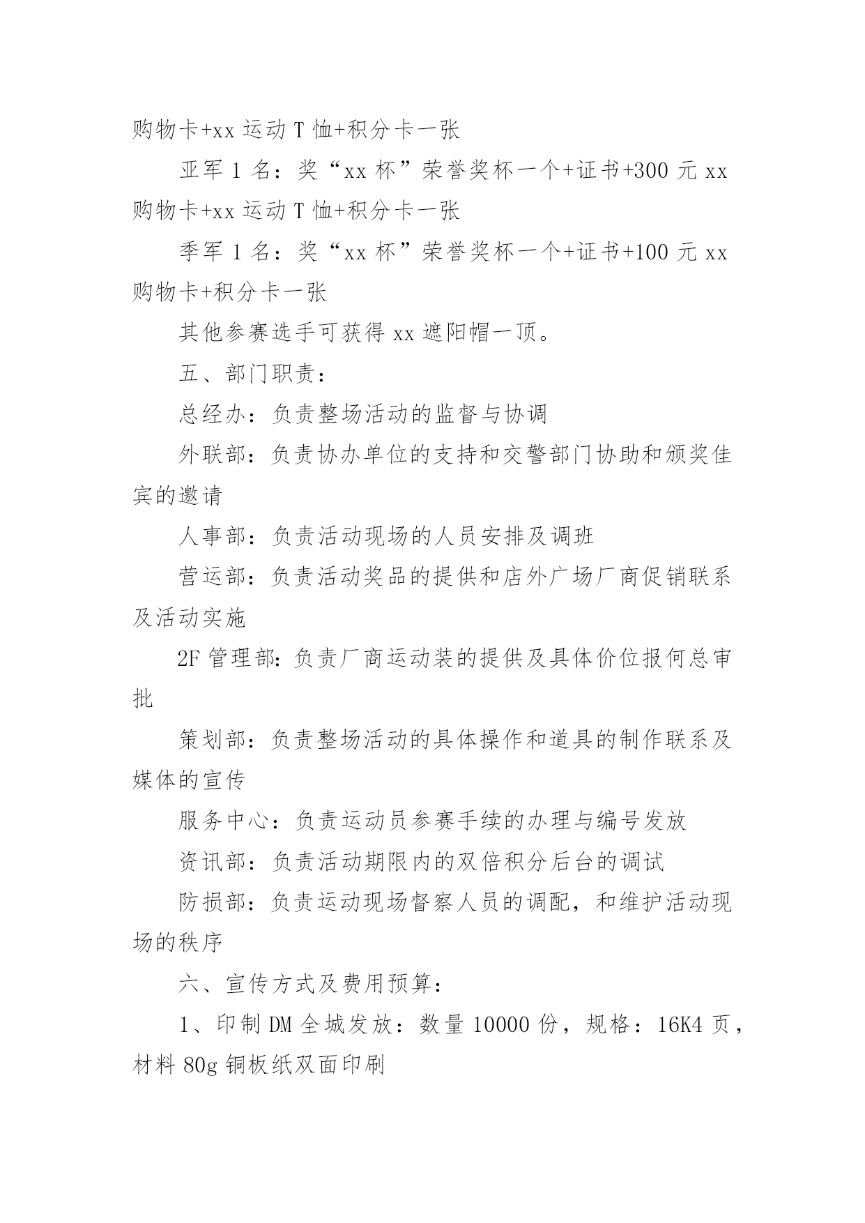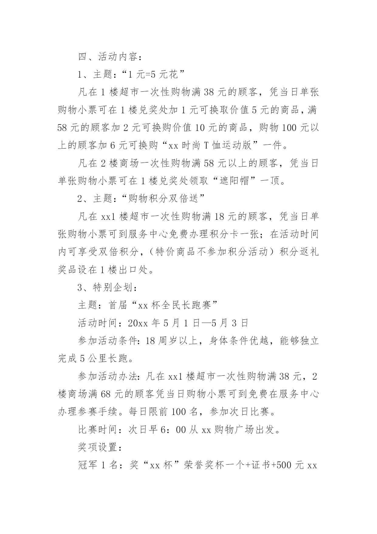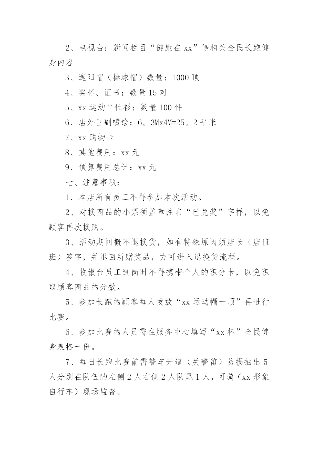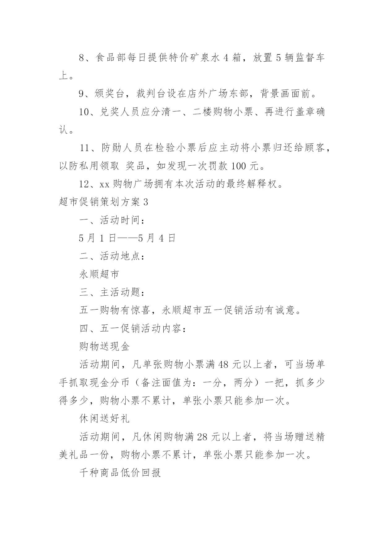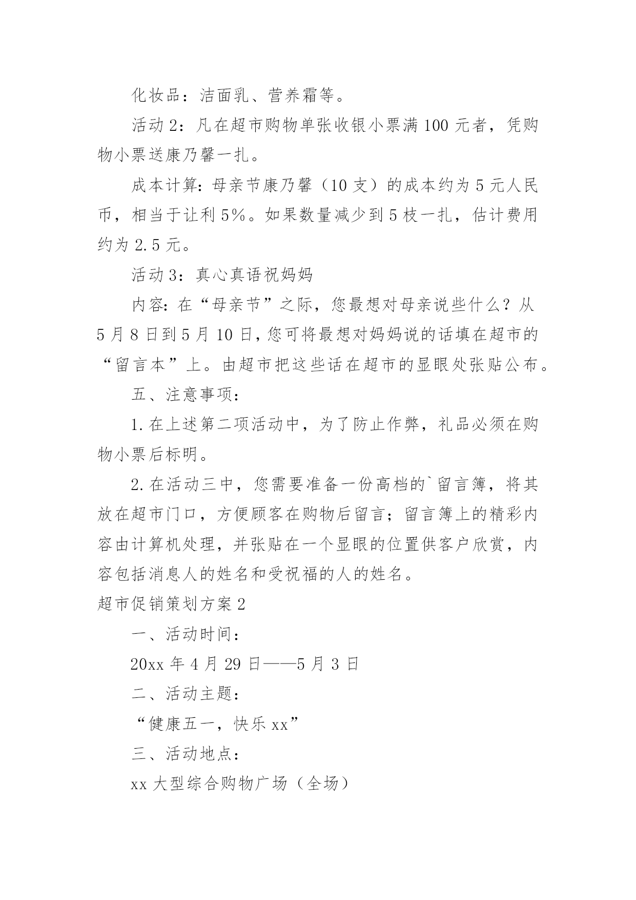 超市促销策划方案超市促销策划方案为了确保事情或工作有序有效开展,预先制定方案是必不可少的,方案是从目的、要求、方式、方法、进度等方面进行安排的书面计划。怎样写方案才更能起到其作用呢?下面是小编收集整理的超市促销策划方案,希望对大家有所帮助。超市促销策划方案1一、活动每年五月的第二个星期天,这是传统的“母亲节”。这个节日是为为母亲设计的,是一个温暖的节日。超市,家庭主妇经常光顾的,我们可以在这一天经营“亲情”,并做一些有助于超市形象的公关促销活动。二、活动时间:5月8日至5月10日三、活动主题:超市康乃馨节,或温暖母亲节四、推广内容:活动1:母亲节特价商品食物:蛋糕、巧克力、牛奶、生鲜等等。日用品:纸制品、卫生巾等。化妆品:洁面乳、营养霜等。活动2:凡在超市购物单张收银小票满100元者,凭购物小票送康乃馨一扎。成本计算:母亲节康乃馨(10支)的成本约为5元人民币,相当于让利5%。如果数量减少到5枝一扎,估计费用约为2.5元。活动3:真心真语祝妈妈内容:在“母亲节”之际,您最想对母亲说些什么?从5月8日到5月10日,您可将最想对妈妈说的话填在超市的“留言本”上。由超市把这些话在超市的显眼处张贴公布。五、注意事项:1.在上述第二项活动中,为了防止作弊,礼品必须在购物小票后标明。2.在活动三中,您需要准备一份高档的`留言簿,将其放在超市门口,方便顾客在购物后留言;留言簿上的精彩内容由计算机处理,并张贴在一个显眼的位置供客户欣赏,内容包括消息人的姓名和受祝福的人的姓名。超市促销策划方案2一、活动时间:20xx年4月29日——5月3日二、活动主题:“健康五一,快乐xx”三、活动地点:xx大型综合购物广场(全场)四、活动内容:1、主题:“1元=5元花”凡在1楼超市一次性购物满38元的顾客,凭当日单张购物小票可在1楼兑奖处加1元可换取价值5元的商品,满58元的顾客加2元可换购价值10元的商品,购物100元以上的顾客加6元可换购“xx时尚T恤运动版”一件。凡在2楼商场一次性购物满58元以上的顾客,凭当日单张购物小票可在1楼兑奖处领取“遮阳帽”一顶。2、主题:“购物积分双倍送”凡在xx1楼超市一次性购物满18元的顾客,凭当日单张购物小票可到服务中心免费办理积分卡一张;在活动时间内可享受双倍积分,(特价商品不参加积分活动)积分返礼奖品设在1楼出口处。3、特别企划:主题:首届“xx杯全民长跑赛”活动时间:20xx年5月1日—5月3日参加活动条件:18周岁以上,身体条件优越,能够独立完成5公里长跑。参加活动办法:凡在xx1楼超市一次性购物满38元,2楼商场满68元的顾客凭当日购物小票可到免费在服务中心办理参赛手续。每日限前100名,参加次日比赛。比赛时间:次日早6:00从xx购物广场出发。奖项设置:冠军1名:奖“xx杯”荣誉奖杯一个+证书+500元xx购物卡+xx运动T恤+积分卡一张亚军1名:奖“xx杯”荣誉奖杯一个+证书+300元xx购物卡+xx运动T恤+积分卡一张季军1名:奖“xx杯”荣誉奖杯一个+证书+100元xx购物卡+积分卡一张其他参赛选手可获得xx遮阳帽一顶。五、部门职责:总经办:负责整场活动的监督与协调外联部:负责协办单位的支持和交警部门协助和颁奖佳宾的邀请人事部:负责活动现场的人员安排及调班营运部:负责活动奖品的提供和店外广场厂商促销联系及活动实施2F管理部:负责厂商运动装的提供及具体价位报何总审批策划部:负责整场活动的具体操作和道具的制作联系及媒体的宣传服务中心:负责运动员参赛手续的办理与编号发放资讯部:负责活动期限内的双倍积分后台的调试防损部:负责运动现场督察人员的调配,和维护活动现场的秩序六、宣传方式及费用预算:1、印制DM全城发放:数量10000份,规格:16K4页,材料80g铜板纸双面印刷2、电视台:新闻栏目“健康在xx”等相关全民长跑健身内容3、遮阳帽(棒球帽)数量:1000顶4、奖杯、证书:数量15对5、xx运动T恤衫:数量100件6、店外巨副喷绘:6。3Mx4M=25。2平米7、xx购物卡8、其他费用:xx元9、预算费用总计:xx元七、注意事项:1、本店所有员工不得参加本次活动。2、对换商品的小票须盖章注名“已兑奖”字样,以免顾客再次换购。3、活动期间概不退换货,如有特殊原因须店长(店值班)签字,并退回所赠奖品,方可进入退换货流程。4、收银台员工到岗时不得携带个人的积分卡,以免积取顾客商品的分数。5、参加长跑的顾客每人发放“xx运动帽一顶”再进行比赛。6、参加比赛的人员需在服务中心填写“xx杯”全民健身表格一份。7、每日长跑比赛前需警车开道(关警笛)防损抽出5人分别在队伍的左侧2人右侧2人队尾1人,可骑(xx形象自行车)现场监督。8、食品部每日提供特价矿泉水4箱,放置5辆监督车上。9、颁奖台,裁判台设在店外广场东部,