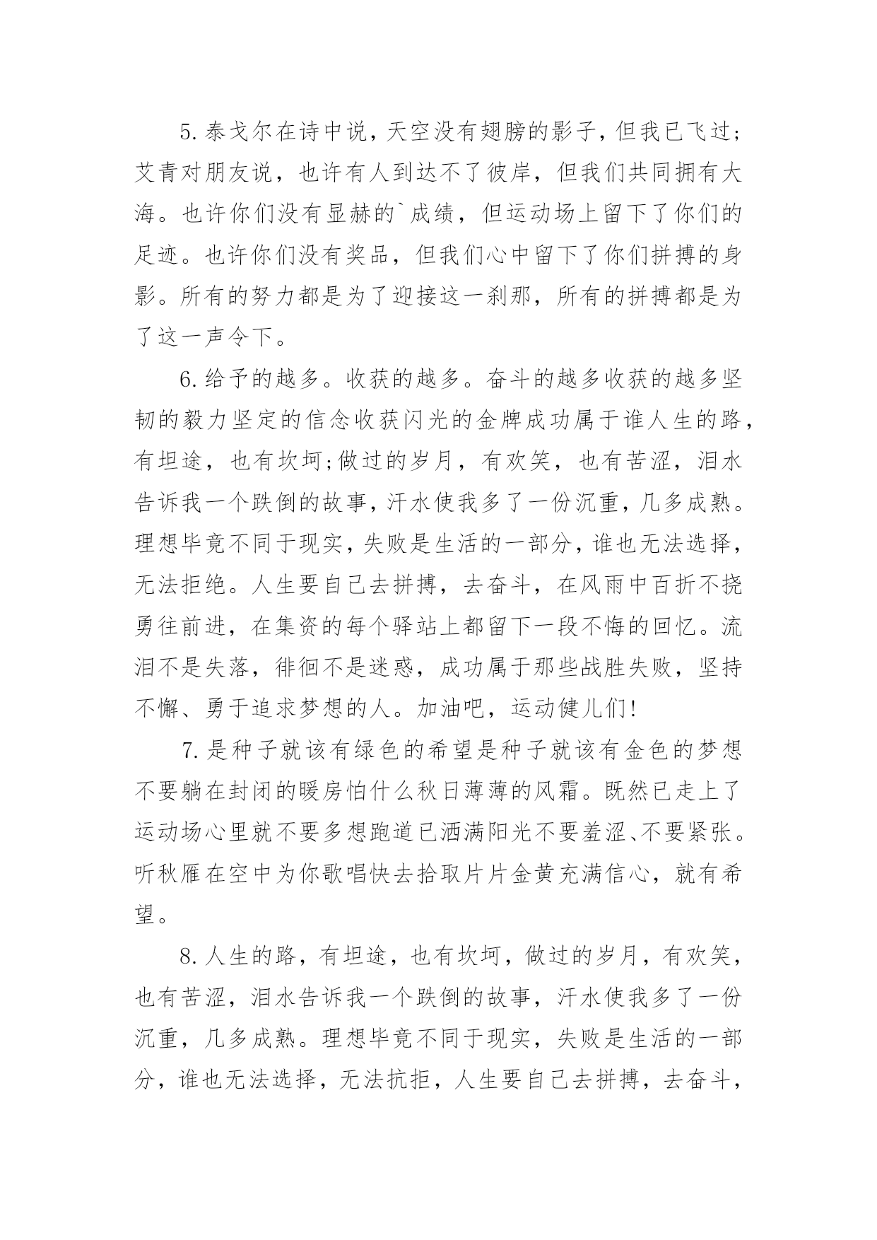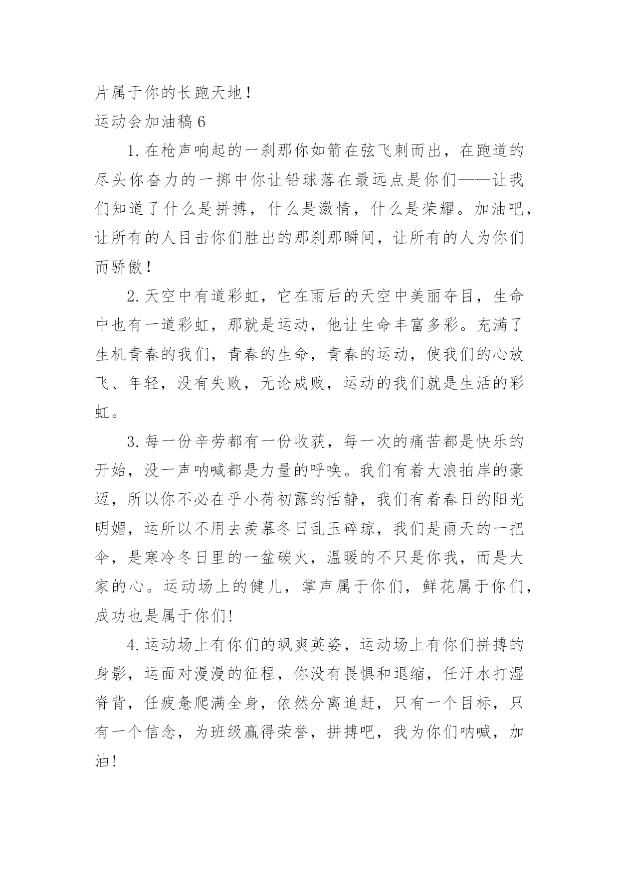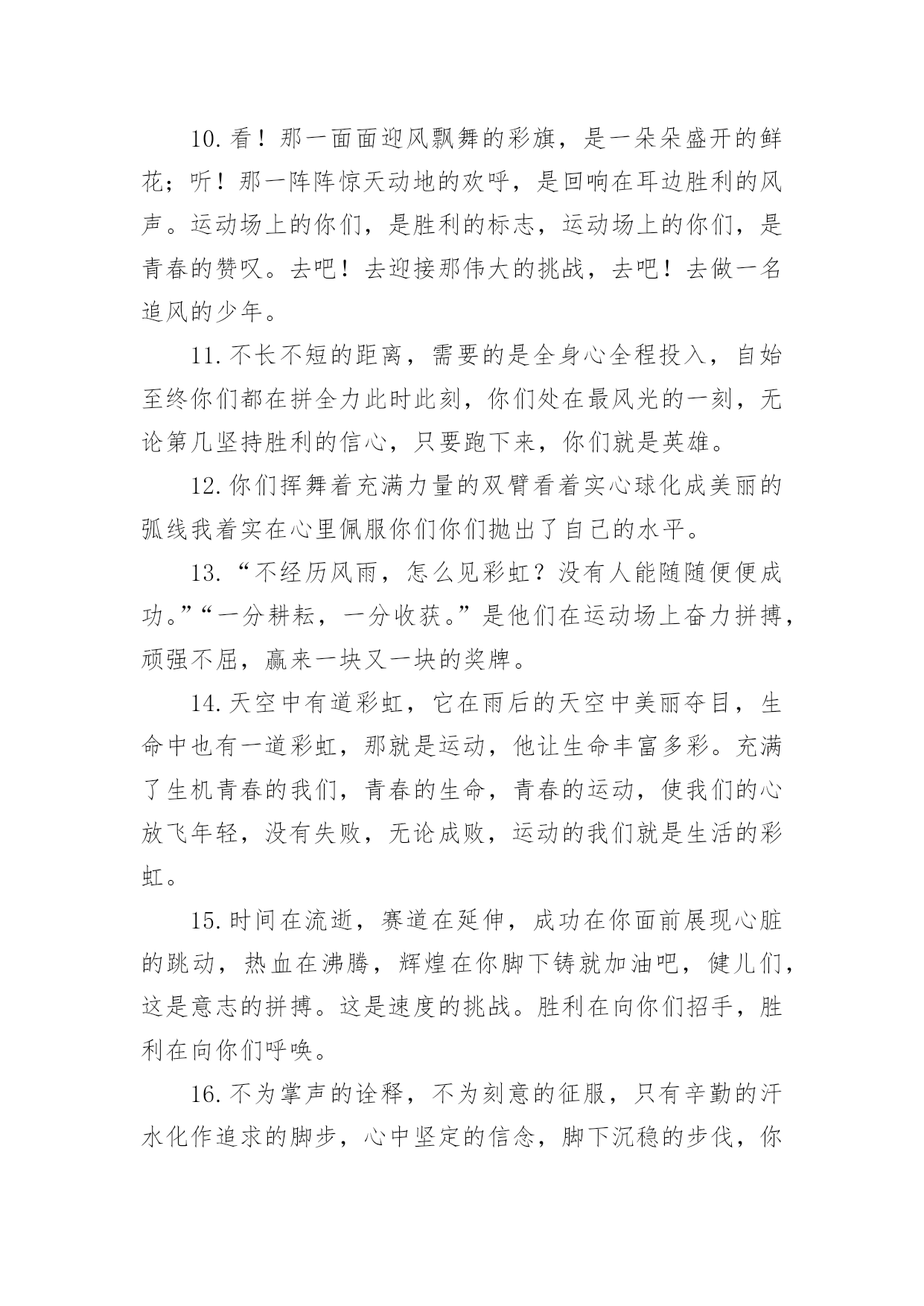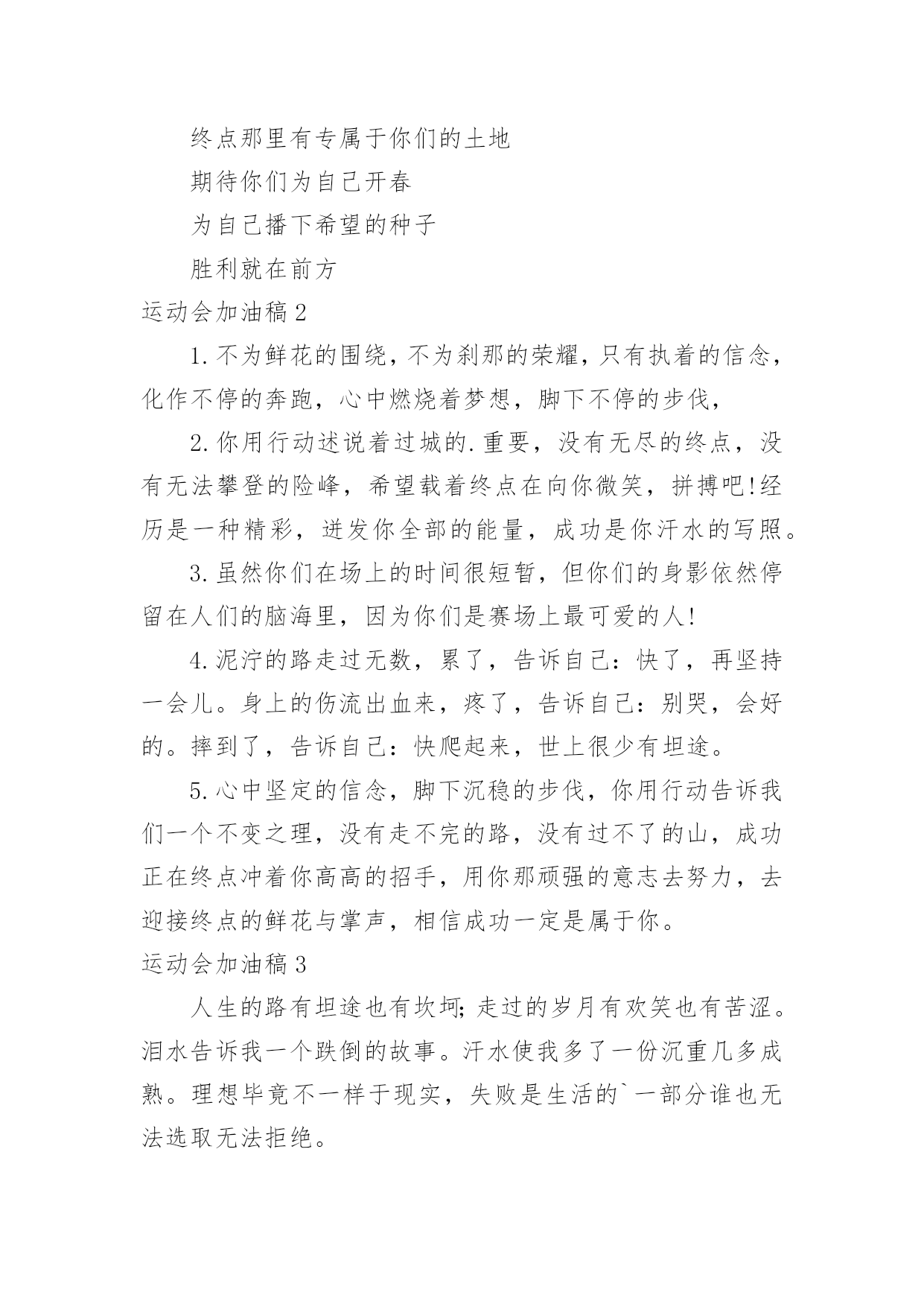 运动会加油稿运动会加油稿(经典)在充满活力,日益开放的今天,我们都可能会用到加油稿,借助加油稿可以点燃对方的激情,激发对方的斗志。你知道加油稿怎样才能写的好吗?以下是小编为大家整理的运动会加油稿,欢迎大家借鉴与参考,希望对大家有所帮助。运动会加油稿1漫漫长路,的确令人忐忑然而我们知道,你们早已跑过多次早已在这红色的跑道上挥汗如雨劳累没有使你们退缩酸痛没有使你们放弃你们用毅力证明内心的渴望天气转凉,秋叶泛黄而你们便是那生生不息的希望用倔强和坚持,用顽强的拼劲展现春的`生气冬天快到了,春天还会远吗在起点焦灼等待的人儿啊扬帆起航吧,驶向春天驶向渴望,驶向美好的明天终点那里有专属于你们的土地期待你们为自己开春为自己播下希望的种子胜利就在前方运动会加油稿21.不为鲜花的围绕,不为刹那的荣耀,只有执着的信念,化作不停的奔跑,心中燃烧着梦想,脚下不停的步伐,2.你用行动述说着过城的.重要,没有无尽的终点,没有无法攀登的险峰,希望载着终点在向你微笑,拼搏吧!经历是一种精彩,迸发你全部的能量,成功是你汗水的写照。3.虽然你们在场上的时间很短暂,但你们的身影依然停留在人们的脑海里,因为你们是赛场上最可爱的人!4.泥泞的路走过无数,累了,告诉自己:快了,再坚持一会儿。身上的伤流出血来,疼了,告诉自己:别哭,会好的。摔到了,告诉自己:快爬起来,世上很少有坦途。5.心中坚定的信念,脚下沉稳的步伐,你用行动告诉我们一个不变之理,没有走不完的路,没有过不了的山,成功正在终点冲着你高高的招手,用你那顽强的意志去努力,去迎接终点的鲜花与掌声,相信成功一定是属于你。运动会加油稿3人生的路有坦途也有坎坷;走过的岁月有欢笑也有苦涩。泪水告诉我一个跌倒的故事。汗水使我多了一份沉重几多成熟。理想毕竟不一样于现实,失败是生活的`一部分谁也无法选取无法拒绝。人生要自我去拼搏去奋斗,在风雨中百屈不挠、勇往直前,在自我的每个驿站都留下一段无悔的回忆。流泪不是失落徘徊不是迷惑,成功属于那些战胜失败坚持不懈勇于追求梦想的人。白色的跑道是你运动的轨迹台上的呐喊是对你拼搏的肯定。这是耐力与意志的检验超载自我挑战自我是你的目标,当你体验过从他人身边攸勿而过时你将再次获得新的感悟,那是自我人生价值的体现更是为班级争夺荣誉的自豪拼搏吧!努力吧!运动健儿们胜利就在眼前是男儿我们不言放下。运动会加油稿41.年轻的我们自信飞扬,青春的气息如同出生的朝阳,蓬勃的力量如同阳光的挥洒。此时此刻,跑道便是我们精彩的舞台,声声加油便是我们最高的奖项!论何成功,谈何荣辱,心中的信念只有一个:拼搏!萧瑟的秋风,挡不住你们破竹的锐气。2.就像花儿准备了春秋冬,就是为了红透整个盛夏。就像雪花经历了春夏秋就是为了洁白整个严冬。蹲下,昂首,出发……轻轻的一抬脚,便牵动了全场的目光潇洒的迫挥挥手,便满足了那一份无言的等待。迎着朝阳,你们踏歌而去,背着期望,我们等待你们的归来。3.踏着春天的气息,迈着轻盈的脚步,我们迎来了心仪已久的运动会。那里就是展示自我的舞台。我们向往高山的坚忍不拔,我们渴望大海的博大精深,还有,我们更痴迷于你们的速度激情。来吧,尽情释放你的活力。你的每一次冲刺,都叩动着我们的心弦;你的每一次跨越,都吸引着我们的视线;你的每一次起跳,都绷紧我们的神经。我们为你呐喊,我们为你自豪,我们为你疯狂。4.也许流星并不少见,但它燃烧的刹那,留给人间最美丽的回忆!也许笑脸并不少见,但胜利的喜悦,总会留给世界精彩的一瞬!是的,那些以前美妙的东西只有短短的一瞬间,但那却把最辉煌的一刻留给了人间。胜利,是每个人所追求的,胜利的喜悦,是胜利与重新开始的`转折,胜利是新的开始!5.虽然你们在场上的时间很短暂,但你们的身影依然停留在人们的脑海里,因为你们是赛场上最可爱的人,不为掌声的注释,不为刻意的征服,不为失败的痛苦,只有辛勤的汗水化作成功的脚步。6.坚定,执着,耐力与期望,在延伸的白色跑道中点点凝聚!力量,信念,拼搏与奋斗,在遥远的终点线上渐渐明亮!时代的强音正在你的脚下踏响。运动会加油稿5一位名人说过:“风采来源于精神。”那么运动真正的风采理应来源于拼搏,不断超越自我的精神和那种“友谊第一,比赛第二”的运动品质。生命需要运动,世界需要自动。你们挥舞着充满力量的双臂,看着实心球化成美丽的`弧线,我着实在心里佩服你们,你们抛出了自我的水平!运动健将们,用你的实力,用你的精神,去开拓出,一片属于你的长跑天地!运动会加油稿61.在枪声响起的一刹那你如箭在弦飞刺而出,在跑道的尽头你奋力的一掷中你让铅球落在最远点是你们——让我们知道了什么是拼搏,什么是激情,什么是荣耀。加油吧,让所有的人目击你们胜出的那刹那瞬间,让所有的人为你们而骄傲!2.天空中有道彩虹,它在雨后的天空中美丽夺目,生命中也有一道彩虹,那就是运动,他让生命丰富多彩