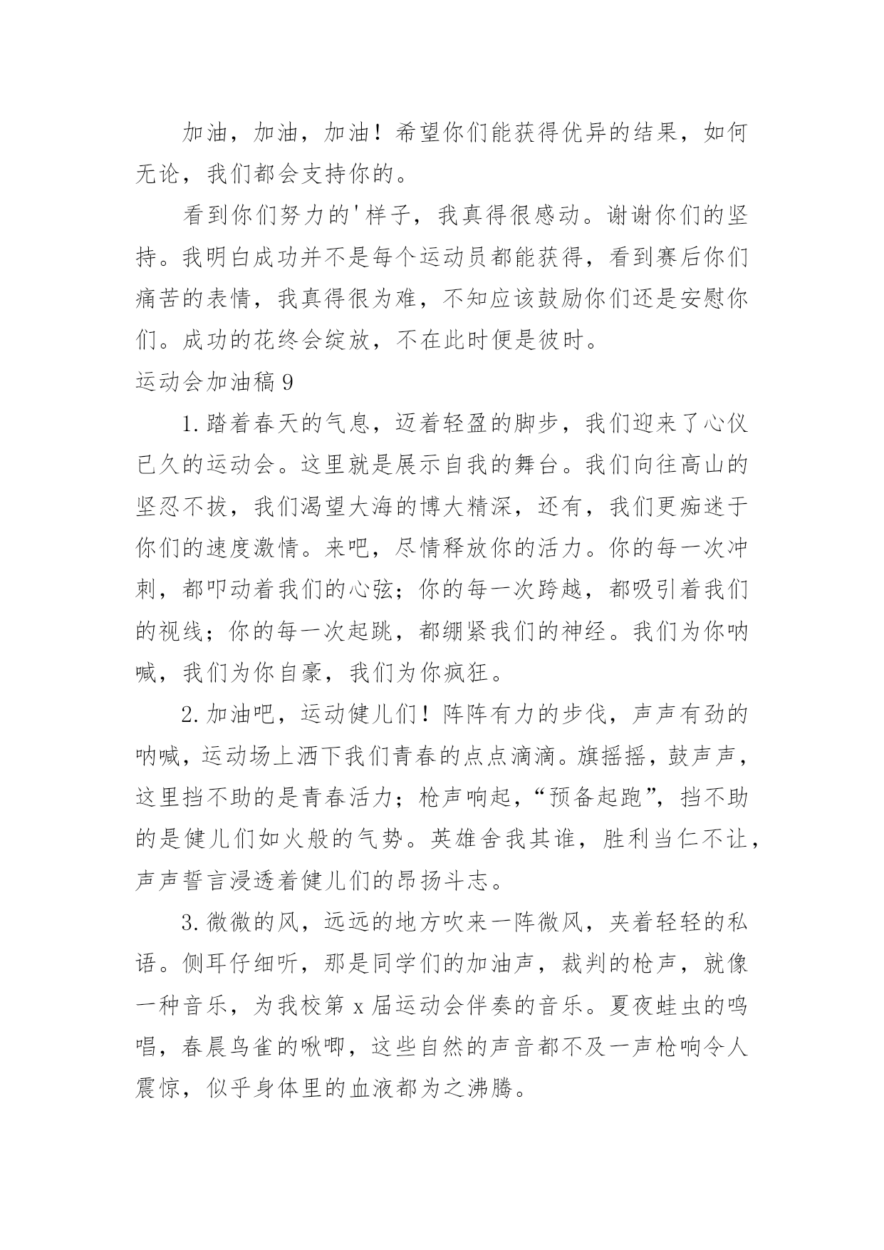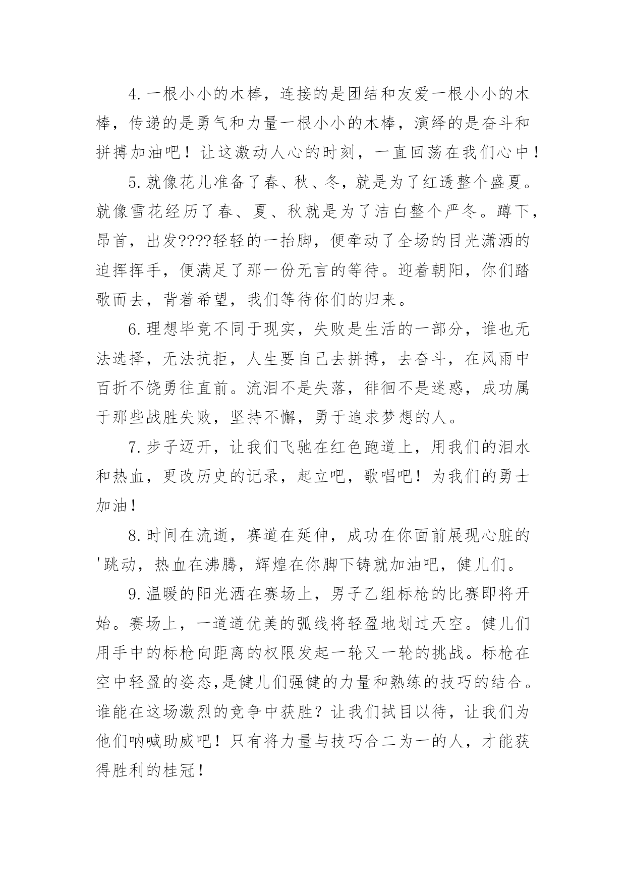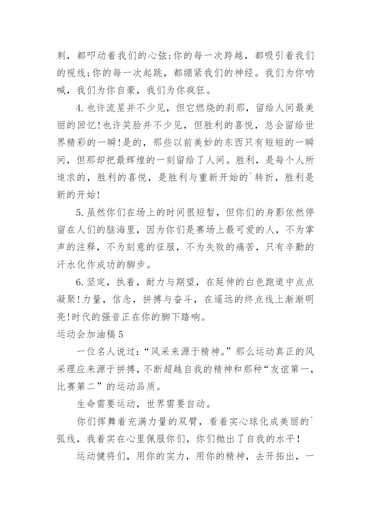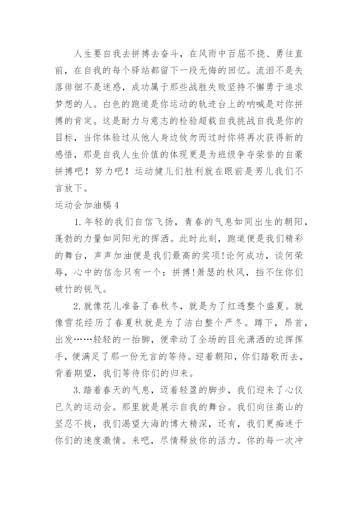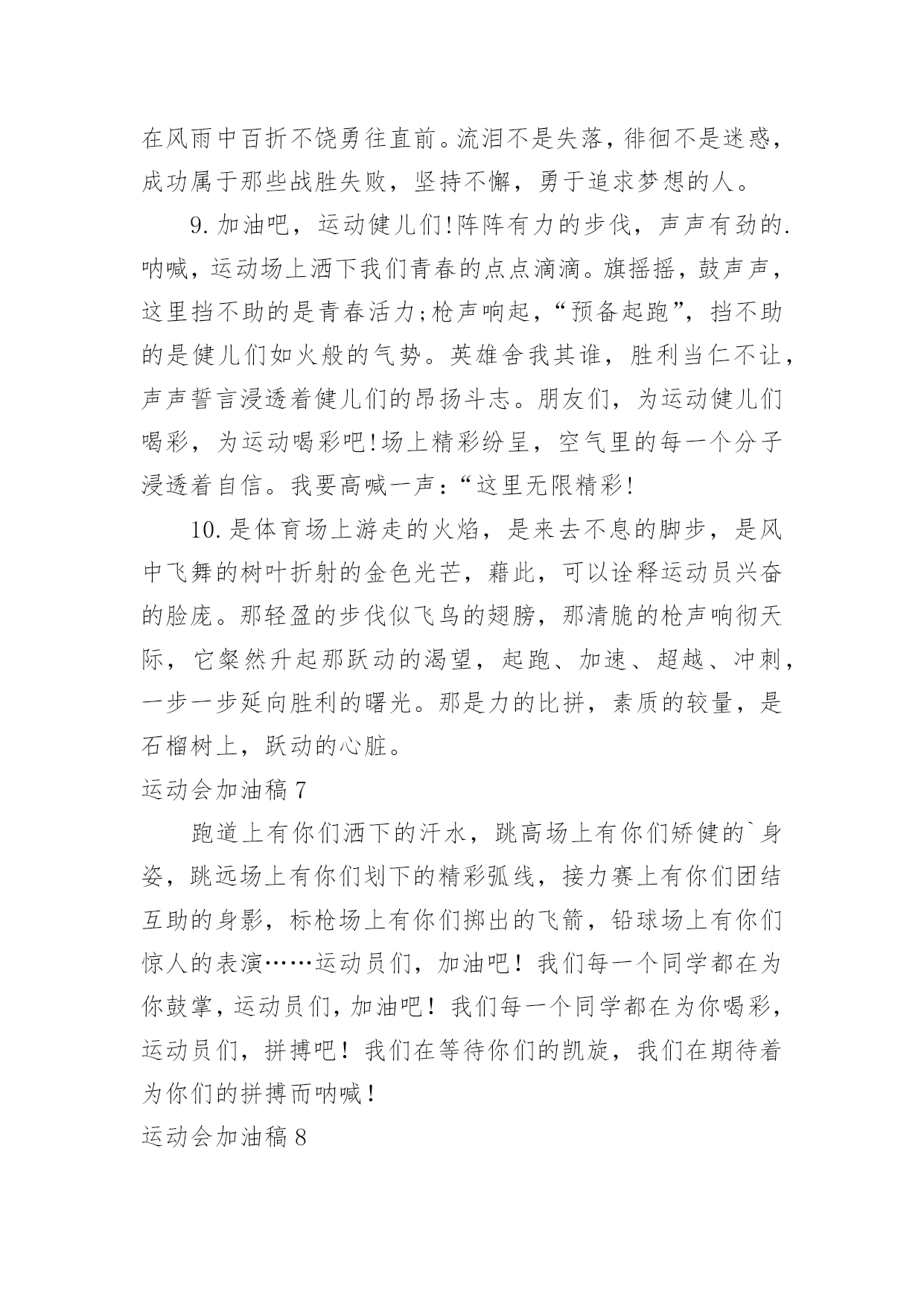 运动会加油稿运动会加油稿(经典)在充满活力,日益开放的今天,我们都可能会用到加油稿,借助加油稿可以点燃对方的激情,激发对方的斗志。你知道加油稿怎样才能写的好吗?以下是小编为大家整理的运动会加油稿,欢迎大家借鉴与参考,希望对大家有所帮助。运动会加油稿1漫漫长路,的确令人忐忑然而我们知道,你们早已跑过多次早已在这红色的跑道上挥汗如雨劳累没有使你们退缩酸痛没有使你们放弃你们用毅力证明内心的渴望天气转凉,秋叶泛黄而你们便是那生生不息的希望用倔强和坚持,用顽强的拼劲展现春的`生气冬天快到了,春天还会远吗在起点焦灼等待的人儿啊扬帆起航吧,驶向春天驶向渴望,驶向美好的明天终点那里有专属于你们的土地期待你们为自己开春为自己播下希望的种子胜利就在前方运动会加油稿21.不为鲜花的围绕,不为刹那的荣耀,只有执着的信念,化作不停的奔跑,心中燃烧着梦想,脚下不停的步伐,2.你用行动述说着过城的.重要,没有无尽的终点,没有无法攀登的险峰,希望载着终点在向你微笑,拼搏吧!经历是一种精彩,迸发你全部的能量,成功是你汗水的写照。3.虽然你们在场上的时间很短暂,但你们的身影依然停留在人们的脑海里,因为你们是赛场上最可爱的人!4.泥泞的路走过无数,累了,告诉自己:快了,再坚持一会儿。身上的伤流出血来,疼了,告诉自己:别哭,会好的。摔到了,告诉自己:快爬起来,世上很少有坦途。5.心中坚定的信念,脚下沉稳的步伐,你用行动告诉我们一个不变之理,没有走不完的路,没有过不了的山,成功正在终点冲着你高高的招手,用你那顽强的意志去努力,去迎接终点的鲜花与掌声,相信成功一定是属于你。运动会加油稿3人生的路有坦途也有坎坷;走过的岁月有欢笑也有苦涩。泪水告诉我一个跌倒的故事。汗水使我多了一份沉重几多成熟。理想毕竟不一样于现实,失败是生活的`一部分谁也无法选取无法拒绝。人生要自我去拼搏去奋斗,在风雨中百屈不挠、勇往直前,在自我的每个驿站都留下一段无悔的回忆。流泪不是失落徘徊不是迷惑,成功属于那些战胜失败坚持不懈勇于追求梦想的人。白色的跑道是你运动的轨迹台上的呐喊是对你拼搏的肯定。这是耐力与意志的检验超载自我挑战自我是你的目标,当你体验过从他人身边攸勿而过时你将再次获得新的感悟,那是自我人生价值的体现更是为班级争夺荣誉的自豪拼搏吧!努力吧!运动健儿们胜利就在眼前是男儿我们不言放下。运动会加油稿41.年轻的我们自信飞扬,青春的气息如同出生的朝阳,蓬勃的力量如同阳光的挥洒。此时此刻,跑道便是我们精彩的舞台,声声加油便是我们最高的奖项!论何成功,谈何荣辱,心中的信念只有一个:拼搏!萧瑟的秋风,挡不住你们破竹的锐气。2.就像花儿准备了春秋冬,就是为了红透整个盛夏。就像雪花经历了春夏秋就是为了洁白整个严冬。蹲下,昂首,出发……轻轻的一抬脚,便牵动了全场的目光潇洒的迫挥挥手,便满足了那一份无言的等待。迎着朝阳,你们踏歌而去,背着期望,我们等待你们的归来。3.踏着春天的气息,迈着轻盈的脚步,我们迎来了心仪已久的运动会。那里就是展示自我的舞台。我们向往高山的坚忍不拔,我们渴望大海的博大精深,还有,我们更痴迷于你们的速度激情。来吧,尽情释放你的活力。你的每一次冲刺,都叩动着我们的心弦;你的每一次跨越,都吸引着我们的视线;你的每一次起跳,都绷紧我们的神经。我们为你呐喊,我们为你自豪,我们为你疯狂。4.也许流星并不少见,但它燃烧的刹那,留给人间最美丽的回忆!也许笑脸并不少见,但胜利的喜悦,总会留给世界精彩的一瞬!是的,那些以前美妙的东西只有短短的一瞬间,但那却把最辉煌的一刻留给了人间。胜利,是每个人所追求的,胜利的喜悦,是胜利与重新开始的`转折,胜利是新的开始!5.虽然你们在场上的时间很短暂,但你们的身影依然停留在人们的脑海里,因为你们是赛场上最可爱的人,不为掌声的注释,不为刻意的征服,不为失败的痛苦,只有辛勤的汗水化作成功的脚步。6.坚定,执着,耐力与期望,在延伸的白色跑道中点点凝聚!力量,信念,拼搏与奋斗,在遥远的终点线上渐渐明亮!时代的强音正在你的脚下踏响。运动会加油稿5一位名人说过:“风采来源于精神。”那么运动真正的风采理应来源于拼搏,不断超越自我的精神和那种“友谊第一,比赛第二”的运动品质。生命需要运动,世界需要自动。你们挥舞着充满力量的双臂,看着实心球化成美丽的`弧线,我着实在心里佩服你们,你们抛出了自我的水平!运动健将们,用你的实力,用你的精神,去开拓出,一片属于你的长跑天地!运动会加油稿61.在枪声响起的一刹那你如箭在弦飞刺而出,在跑道的尽头你奋力的一掷中你让铅球落在最远点是你们——让我们知道了什么是拼搏,什么是激情,什么是荣耀。加油吧,让所有的人目击你们胜出的那刹那瞬间,让所有的人为你们而骄傲!2.天空中有道彩虹,它在雨后的天空中美丽夺目,生命中也有一道彩虹,那就是运动,他让生命丰富多彩