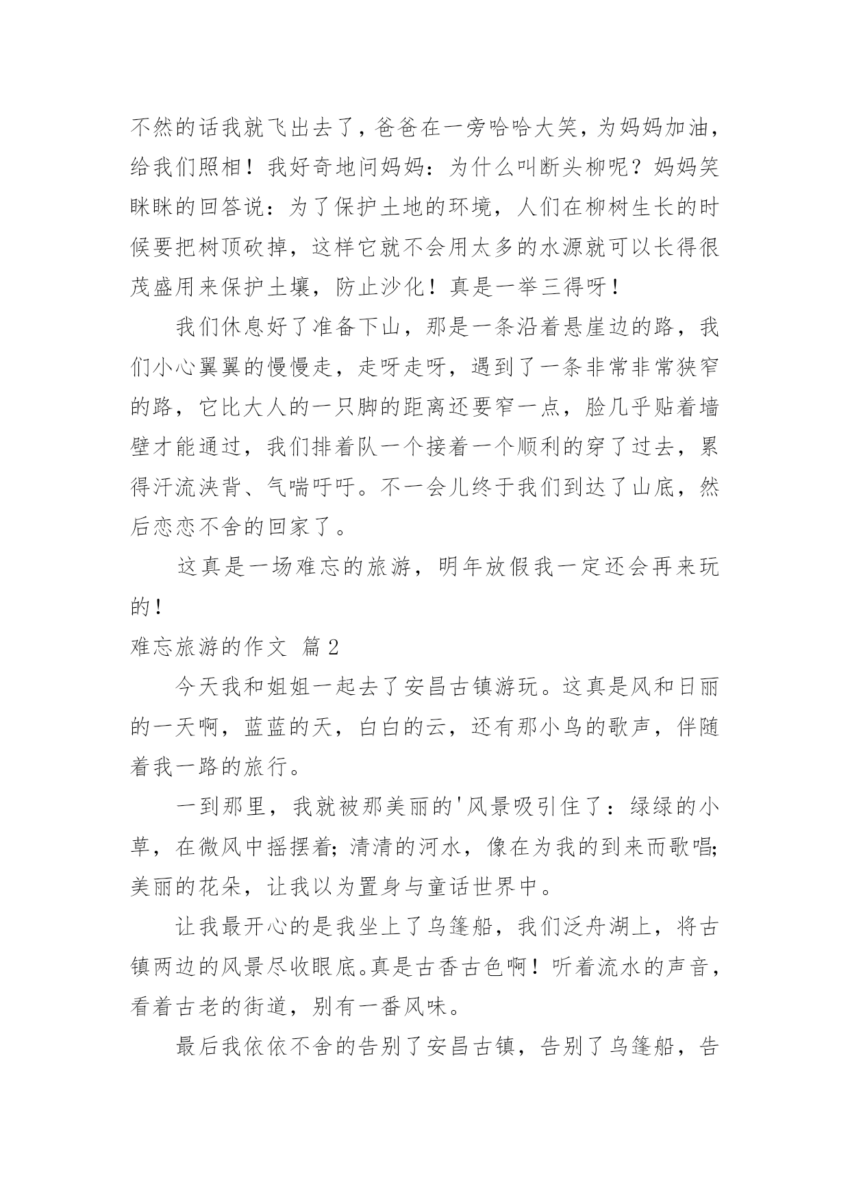 难忘旅游的作文【推荐】难忘旅游的作文四篇在日常学习、工作或生活中,大家都有写作文的经历,对作文很是熟悉吧,借助作文人们可以实现文化交流的目的。相信许多人会觉得作文很难写吧,下面是小编整理的难忘旅游的作文4篇,仅供参考,希望能够帮助到大家。难忘旅游的作文篇1快乐的国庆节到来了,天气晴朗、万里无云,妈妈终于可以休息了,我们一起去龙州丹霞地貌游玩。很快我们到了景区,那里有许多多连绵起伏的大山,妈妈告诉我因为土壤里的铁含量丰富,所以山的颜色是红色的,而且经过上百年的风吹日晒,样子都是稀奇古怪的,有的像一尊尊佛像、有的像一台台雷达、还有的像一顶顶古怪的帽子。看着奇特的景色,我心花怒放,迫不及待地开始爬山了。因为我光着脚,所以跑得最快,妈妈紧跟在后生怕我出危险,爸爸一只手拿着我的鞋一只手给我们摄影。我们先经过一段土黄色的山路,再越过一座危险的独木桥,最后我们到达了危险的山顶。山顶两旁是深不见底的悬崖,阴凉的风吹过,叫人直打冷颤,远远地望去是一望无尽的.荒漠。我们决定休息一下,忽然我发现了一排断头柳,我像猴子一样敏捷的爬上了一棵,妈妈灵机一动,用围巾把我脖子一套变成了愤怒小鸟,准备射出去,我紧紧抓住树干不放,不然的话我就飞出去了,爸爸在一旁哈哈大笑,为妈妈加油,给我们照相!我好奇地问妈妈:为什么叫断头柳呢?妈妈笑眯眯的回答说:为了保护土地的环境,人们在柳树生长的时候要把树顶砍掉,这样它就不会用太多的水源就可以长得很茂盛用来保护土壤,防止沙化!真是一举三得呀!我们休息好了准备下山,那是一条沿着悬崖边的路,我们小心翼翼的慢慢走,走呀走呀,遇到了一条非常非常狭窄的路,它比大人的一只脚的距离还要窄一点,脸几乎贴着墙壁才能通过,我们排着队一个接着一个顺利的穿了过去,累得汗流浃背、气喘吁吁。不一会儿终于我们到达了山底,然后恋恋不舍的回家了。这真是一场难忘的旅游,明年放假我一定还会再来玩的!难忘旅游的作文篇2今天我和姐姐一起去了安昌古镇游玩。这真是风和日丽的一天啊,蓝蓝的天,白白的云,还有那小鸟的歌声,伴随着我一路的旅行。一到那里,我就被那美丽的'风景吸引住了:绿绿的小草,在微风中摇摆着;清清的河水,像在为我的到来而歌唱;美丽的花朵,让我以为置身与童话世界中。让我最开心的是我坐上了乌篷船,我们泛舟湖上,将古镇两边的风景尽收眼底。真是古香古色啊!听着流水的声音,看着古老的街道,别有一番风味。最后我依依不舍的告别了安昌古镇,告别了乌篷船,告别了这快乐的一天。但是,这美好的记忆永远的留在了我的脑海中,希望下次还能再来游玩。难忘旅游的作文篇3去福州游玩,森林公园是必去的地方。这不,我就去那儿游玩去了,欣赏那里美不胜收的风景。我又是激动又是兴奋,迫不及待的想出发。汽车在马路上奔驰。一开始,汽车来来往往,发出令人烦躁的“轰轰”声。但过了一会儿,我们的左右两边出现了绿色的山,到处都有小鸟“叽叽喳喳”的歌声,空气也渐渐的清新的起来,我心想“应该马上就到了。”果然,不一会儿,我们就到了。我跳下车,直进了这空气清新,鸟语花香的森林公园。我们沿着幽静的小路走,就到达了第一个景点“鸟语林”。我们走了进去,首先映入眼帘的是一个大大的长方体房子——保棚。里面有一排排的绿树又高又大,在树木下有一丛一丛的花朵,有的洁白如玉,有的白里透红,有的'蓝红相见。每株花都亭亭玉立的立在那里,在微风中轻轻的摇曳着。这些姹紫嫣红的花朵还吸引出了一群可爱的小家伙,它们毛茸茸的,圆滚滚的像个小毛球。给这些花朵增添了许多生机。我们又沿着路走,到了一个大草坪。大草坪上有着一棵千年古榕。它有着繁茂的树叶,风轻轻地拂过,大树摇动了起来,就像一层层的碧波在荡漾。这棵古树就像一个巨型的西兰花,让人感到不可思议。在古榕,还有一座水滴型的湖,里面的鱼数不胜数,而且都是又肥又大的。只要你扔下一个面包,原本水平如静的湖面便被打破了,一下子一大群鱼来争先恐后的抢。水面就像出现了一个小型的“海龙卷”。这次的旅游让我至今记忆犹新。我不禁感叹:大自然真是太美啦!难忘旅游的作文篇4这次活动是从学校一路步行到目的地,全程大约有十公里。同学们走在一起,一路上边走边笑,非常高兴,走起路来也轻松极了。走着走着,我不禁被路两旁的景色所吸引。瞧,路旁的树又高又大,有的枝干笔直向上、有的蜿蜒曲折,非常有趣;看,那边的梨树上挂满了黄澄澄的梨,好一派丰收的景象;不远处的山坡上野菊花开得正艳,有紫色的、黄色的,红色的`,真像一条五彩的地毯;向远处望去,一片一片的树木郁郁葱葱,让人心旷神怡。我不由地深深地吸了几口气,呵!好舒服。我们走得满头大汗,就在树旁休息片刻之后,大家又继续往前走,现在的路比刚才的又难走了一点,不是上坡就是下坡或走弯路,但是大家都很坚强,没人叫一声苦,也没有人喊一声累。差不多走了五个小时,终于到达目的地了,虽然大家都感动有些累,但