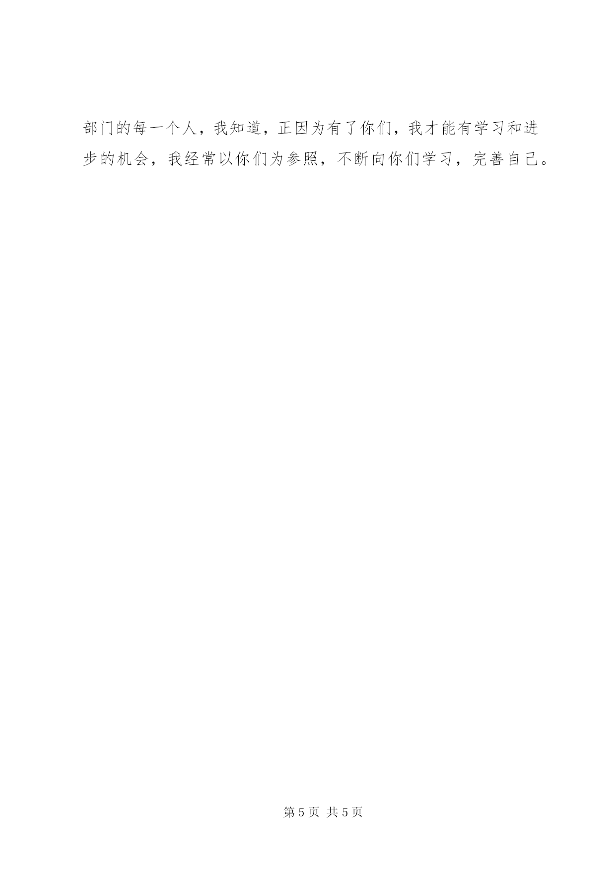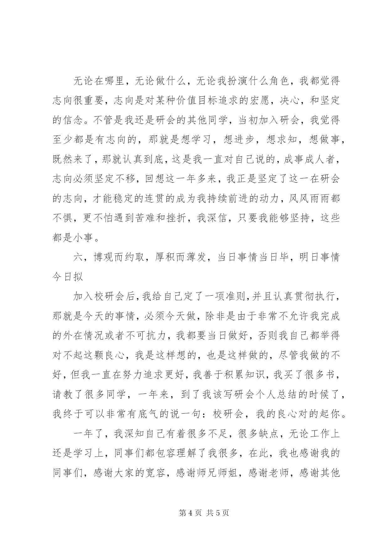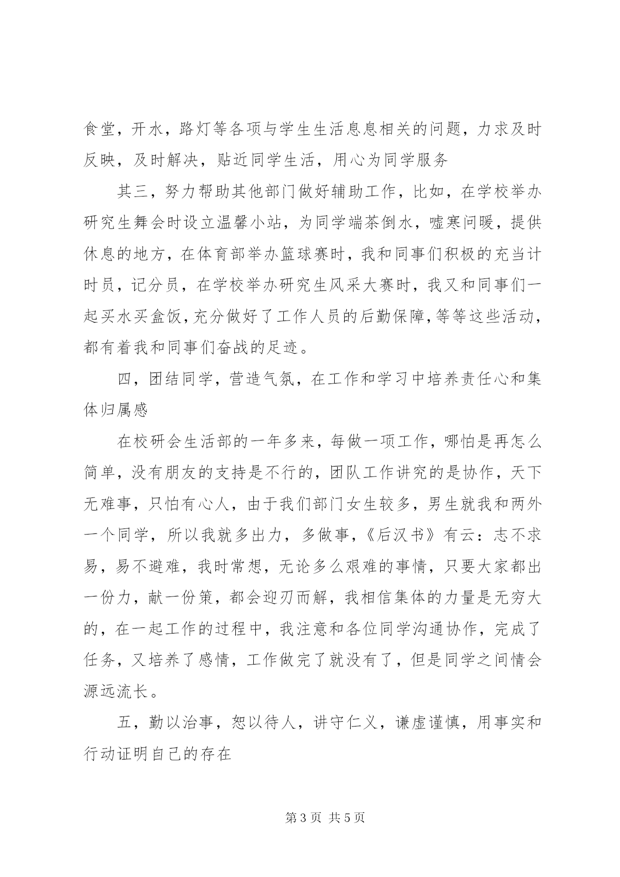 第PAGE\*Arabic\*MERGEFORMAT5页共NUMPAGES\*MERGEFORMAT5页校研究生会个人工作总结时光忽忽飞逝,转瞬间,我加入校研究生会已经有一年了。虽说雁过无痕,风吹无影,但校研究生会这个我最热爱的团体,给我留下了深刻的烙印,我的整个研一生活也是她伴随着我走过来的。通过一年的不断学习,在老师的指导下,在师兄师姐和研会同学们的关心和帮助下,我已完全融入校研会这个大家庭。个人的工作技能和工作水平也有了显著提高。现将我一年来的工作情况简要总结如下:一,初识校研会,端正态度,摆正自我,踏踏实实做人,认认真真做事。还记得去年十月份,当得到师兄的短信告知我被校研会录取,我所加入的部门是生活服务部,我的职位是生活部副部长。生活部是校研会的一个重要部门,其主要职能是:关心同学生活,尽力解决和满足同学提出的各种问题和要求,为大家提供方便,做好学校与广大研究生之间沟通的桥梁,明确了这个目标,我深感任务艰巨和责任重大,虽然我是副部,但我依然要做好这个副手,用尽全力和部长以及同事们一起完成研会和老师交给的各项工作任务,加入研会的第一天,我首先就端正了态度,研会和工作不同,尽管我已经工作两年,但是研会我是第一次加入,很多方面我不懂,不了解,不懂的我就问,问同学,问老师,问师兄师姐,另一方面,我时刻提醒自己,做事务必认真踏实,一件事情,我可以做的不那么出色甚至不会做,但只要我做了,我就要认真的去做。二,不断加强自身学习,提高修养,开拓创新,努力进取由于自己第一次加入研会,对这个组织不是特别了解,而自己的认识,能力,和阅历与其胜任这一职位还有一定的距离,所以我一直不敢掉以轻心,总在学习,我向老师学习,向同学学习,向师兄师姐学习,还记得研工部石老师在召开第二次研会全体大会上说的一句话:尽力而为,量力而行。简短的几个字,却体现了丰厚的内涵,道出了唯物辩证的精髓,加入研会后,我每时每刻不忘记提醒自己要修身养性,做事不重要,要先学会做人,我深知一次完美的创造,需要追求极致的精神和登峰造极的技艺,这些我并没有,但是我可以学,我有同学,有朋友,有研会的所有同事们,我坚信我可以,。三,深入开展生活部各项工作,和同事们一起做好同学们的后勤保障工作在这里我简单说一下和同事们一起共同完成的工作:其一,设置意见箱,还记得那天,同事们一起不惧困难,不怕磨难,一起完成了这项浩大的工程,意见箱的设置,方便了同学们提意见,诉苦闷,更能督促学校抓效率,重落实,是关心同学生活的一项创举,其二,定期召开与学校后勤集团等部门的座谈会,充分反映食堂,开水,路灯等各项与学生生活息息相关的问题,力求及时反映,及时解决,贴近同学生活,用心为同学服务其三,努力帮助其他部门做好辅助工作,比如,在学校举办研究生舞会时设立温馨小站,为同学端茶倒水,嘘寒问暖,提供休息的地方,在体育部举办篮球赛时,我和同事们积极的充当计时员,记分员,在学校举办研究生风采大赛时,我又和同事们一起买水买盒饭,充分做好了工作人员的后勤保障,等等这些活动,都有着我和同事们奋战的足迹。四,团结同学,营造气氛,在工作和学习中培养责任心和集体归属感在校研会生活部的一年多来,每做一项工作,哪怕是再怎么简单,没有朋友的支持是不行的,团队工作讲究的是协作,天下无难事,只怕有心人,由于我们部门女生较多,男生就我和两外一个同学,所以我就多出力,多做事,《后汉书》有云:志不求易,易不避难,我时常想,无论多么艰难的事情,只要大家都出一份力,献一份策,都会迎刃而解,我相信集体的力量是无穷大的,在一起工作的过程中,我注意和各位同学沟通协作,完成了任务,又培养了感情,工作做完了就没有了,但是同学之间情会源远流长。五,勤以治事,恕以待人,讲守仁义,谦虚谨慎,用事实和行动证明自己的存在无论在哪里,无论做什么,无论我扮演什么角色,我都觉得志向很重要,志向是对某种价值目标追求的宏愿,决心,和坚定的信念。不管是我还是研会的其他同学,当初加入研会,我觉得至少都是有志向的,那就是想学习,想进步,想求知,想做事,既然来了,那就认真到底,这是我一直对自己说的,成事成人者,志向必须坚定不移,回想这一年多来,我正是坚定了这一在研会的志向,才能稳定的连贯的成为我持续前进的动力,风风雨雨都不惧,更不怕遇到苦难和挫折,我深信,只要我能够坚持,这些都是小事。六,博观而约取,厚积而薄发,当日事情当日毕,明日事情今日拟加入校研会后,我给自己定了一项准则,并且认真贯彻执行,那就是今天的事情,必须今天做,除非是由于非常不允许我完成的外在情况或者不可抗力,我都要当日做好,否则我自己都举得对不起这颗良心,我是这样想的,也是这样做的,尽管我做的不好,但我一直在努力追求更好,我善于积累知识,我买了很多书,请教了很多同学,一年来,到了我该写研会个人总结的