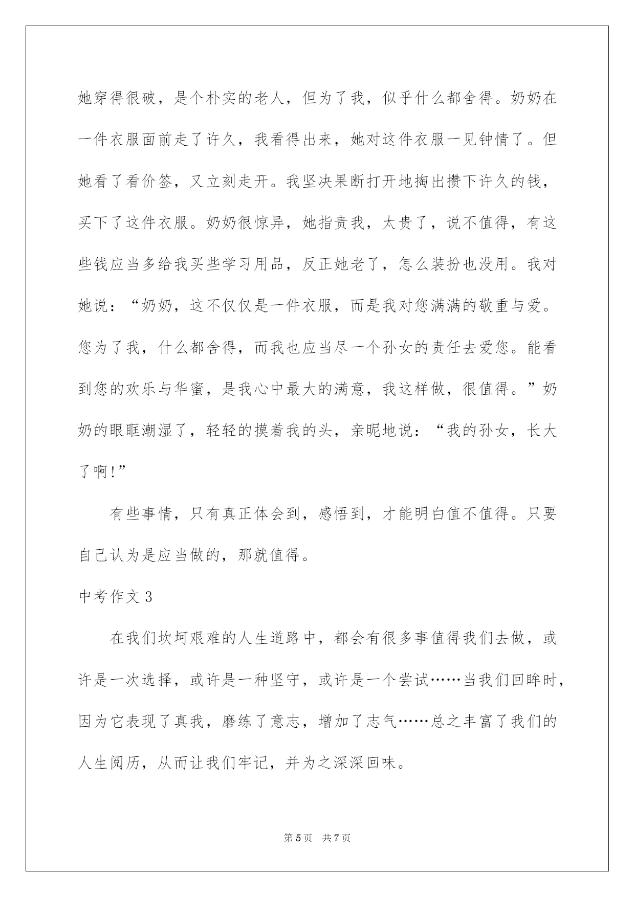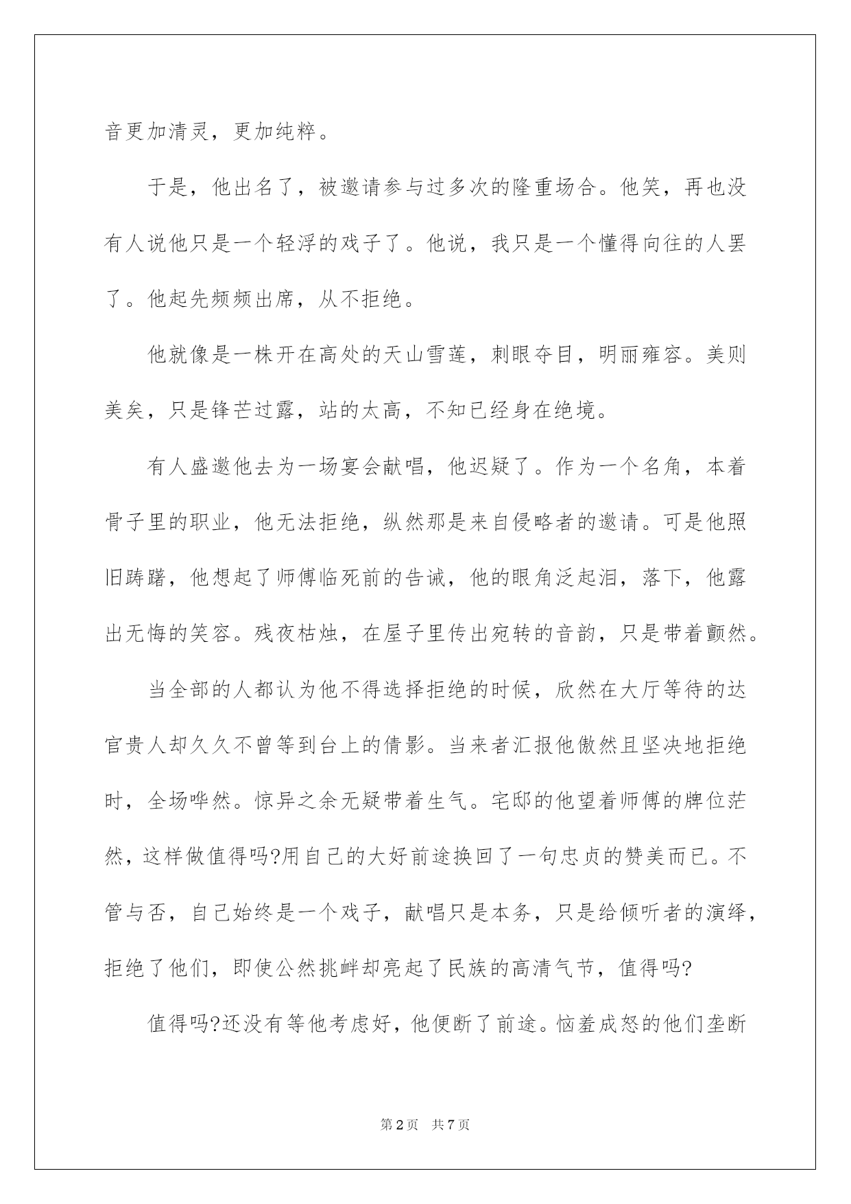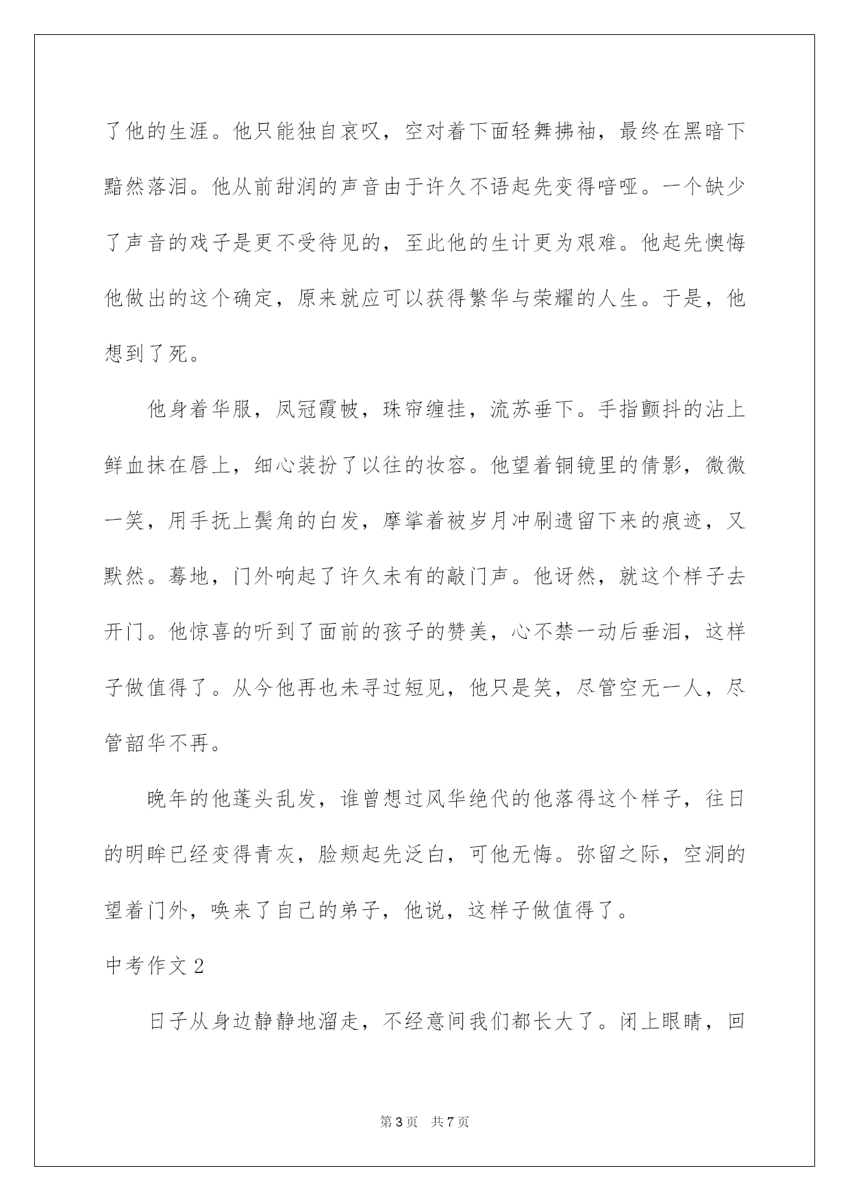 第PAGE\*Arabic\*MERGEFORMAT7页共NUMPAGES\*Arabic\*MERGEFORMAT7页第PAGE\*MERGEFORMAT7页共NUMPAGES\*MERGEFORMAT7页第PAGE\*MERGEFORMAT7页共NUMPAGES\*MERGEFORMAT7页第PAGE\*MERGEFORMAT7页共NUMPAGES\*MERGEFORMAT7页第PAGE\*MERGEFORMAT7页共NUMPAGES\*MERGEFORMAT7页第PAGE\*MERGEFORMAT7页共NUMPAGES\*MERGEFORMAT7页第PAGE\*MERGEFORMAT7页共NUMPAGES\*MERGEFORMAT7页第PAGE\*MERGEFORMAT7页共NUMPAGES\*MERGEFORMAT7页第PAGE\*MERGEFORMAT7页共NUMPAGES\*MERGEFORMAT7页第PAGE\*MERGEFORMAT7页共NUMPAGES\*MERGEFORMAT7页第PAGE\*MERGEFORMAT7页共NUMPAGES\*MERGEFORMAT7页2022中考作文中考作文中考作文1历年而来,五千年的文化层层翻阅,历史氤氲着历久弥坚的色调荡漾而来。历代的繁华与向往参杂着艰辛揉碎在年华中永存。从古至今,中华的封面上总少不了舞台上的韶华背影。至今做过很多事,从卖唱至献艺,如今宛若长大成了名角,表演时的刻苦与努力勃发,他是一个青衣。曾幻想过一人独踞舞台,咿呀开口,余音绕梁,浩名流传,震惊海外。也曾许诺过将毕生献予京剧。烂漫的向往随着时间愈烈。他学习,泯灭了一切的闲暇时间。那年,他学有所成,跪在师傅门下,流着泪说,传承……浓妆淡抹,黛色细眉,明眸传情,一颦一笑倾人城国,肃杀万定尘埃。广袖水衫,轻姿曼舞,舞台上的身影尤为动人,似弱柳扶风,婀娜多姿间妩媚动人。他朱唇轻启,宽大的衣袖下露出圆润含情的唱音。一曲演绎使他一时轰动,很多人为他喝彩,掌声如雷贯耳。他的脸上绽出久久未有的笑靥,他想他选择了一条没有走错的路。他的声音更加清灵,更加纯粹。于是,他出名了,被邀请参与过多次的隆重场合。他笑,再也没有人说他只是一个轻浮的戏子了。他说,我只是一个懂得向往的人罢了。他起先频频出席,从不拒绝。他就像是一株开在高处的天山雪莲,刺眼夺目,明丽雍容。美则美矣,只是锋芒过露,站的太高,不知已经身在绝境。有人盛邀他去为一场宴会献唱,他迟疑了。作为一个名角,本着骨子里的职业,他无法拒绝,纵然那是来自侵略者的邀请。可是他照旧踌躇,他想起了师傅临死前的告诫,他的眼角泛起泪,落下,他露出无悔的笑容。残夜枯烛,在屋子里传出宛转的音韵,只是带着颤然。当全部的人都认为他不得选择拒绝的时候,欣然在大厅等待的达官贵人却久久不曾等到台上的倩影。当来者汇报他傲然且坚决地拒绝时,全场哗然。惊异之余无疑带着生气。宅邸的他望着师傅的牌位茫然,这样做值得吗?用自己的大好前途换回了一句忠贞的赞美而已。不管与否,自己始终是一个戏子,献唱只是本务,只是给倾听者的演绎,拒绝了他们,即使公然挑衅却亮起了民族的高清气节,值得吗?值得吗?还没有等他考虑好,他便断了前途。恼羞成怒的他们垄断了他的生涯。他只能独自哀叹,空对着下面轻舞拂袖,最终在黑暗下黯然落泪。他从前甜润的声音由于许久不语起先变得喑哑。一个缺少了声音的戏子是更不受待见的,至此他的生计更为艰难。他起先懊悔他做出的这个确定,原来就应可以获得繁华与荣耀的人生。于是,他想到了死。他身着华服,凤冠霞帔,珠帘缠挂,流苏垂下。手指颤抖的沾上鲜血抹在唇上,细心装扮了以往的妆容。他望着铜镜里的倩影,微微一笑,用手抚上鬓角的白发,摩挲着被岁月冲刷遗留下来的痕迹,又默然。蓦地,门外响起了许久未有的敲门声。他讶然,就这个样子去开门。他惊喜的听到了面前的孩子的赞美,心不禁一动后垂泪,这样子做值得了。从今他再也未寻过短见,他只是笑,尽管空无一人,尽管韶华不再。晚年的他蓬头乱发,谁曾想过风华绝代的他落得这个样子,往日的明眸已经变得青灰,脸颊起先泛白,可他无悔。弥留之际,空洞的望着门外,唤来了自己的弟子,他说,这样子做值得了。中考作文2日子从身边静静地溜走,不经意间我们都长大了。闭上眼睛,回首往事,一切仿佛就发生在昨天,匆忙出现在我眼前,有好像发生很久以前,以至于当我睁开眼睛时竟找不到半点痕迹……真的不想长大,因为我的长大换来的是亲人的苍老。特殊是我的奶奶,想起奶奶年迈的步伐,苍老的面孔,佝偻的背影,心理面不由得产生一阵阵酸楚。在我的心里,奶奶占据着太多的位置,奶奶总是用她满满的爱在