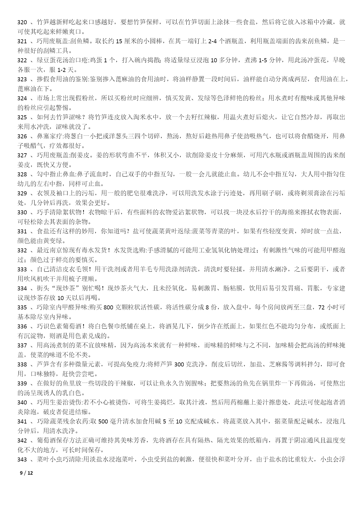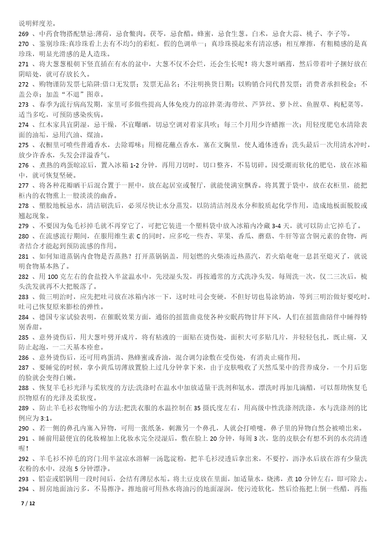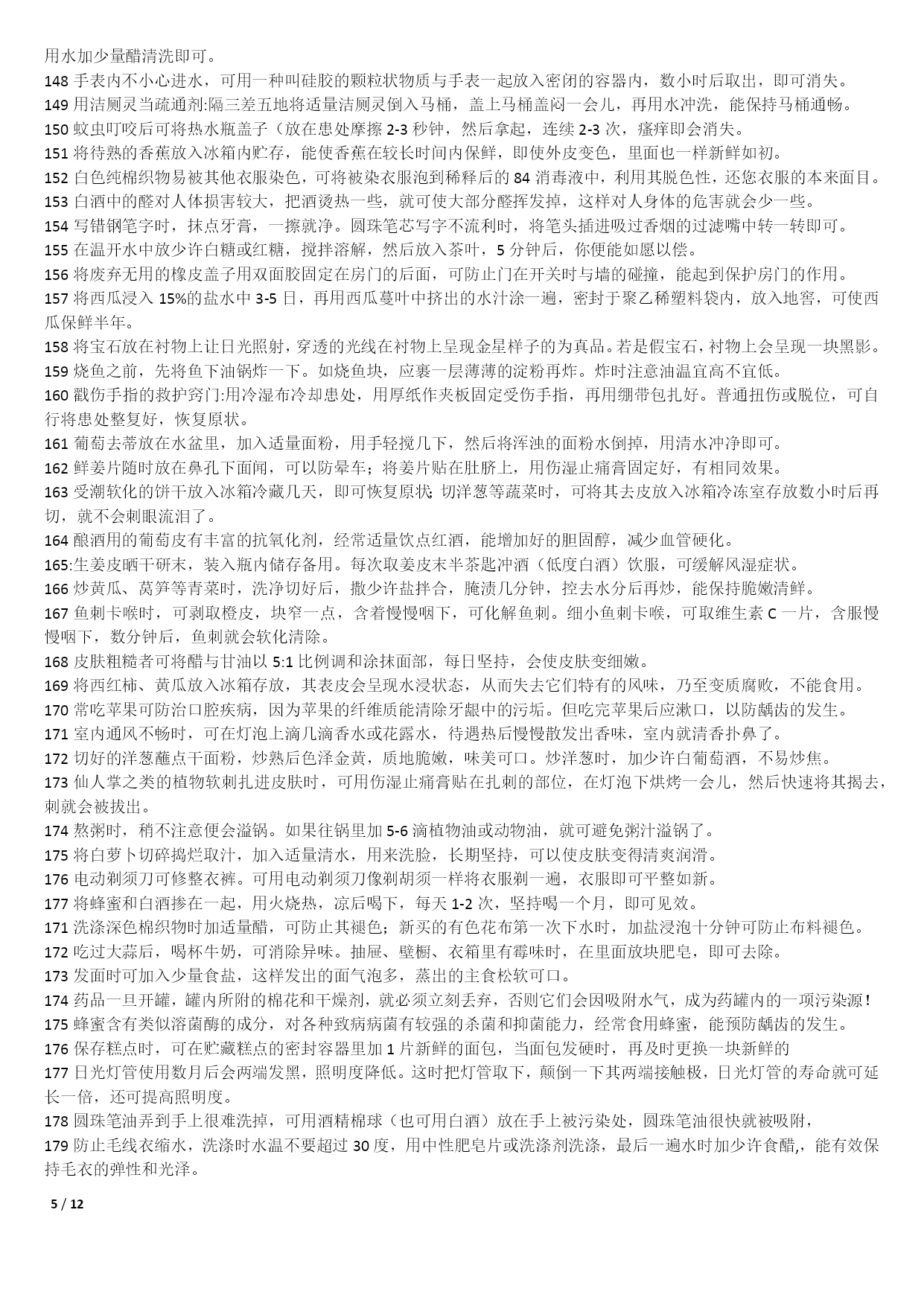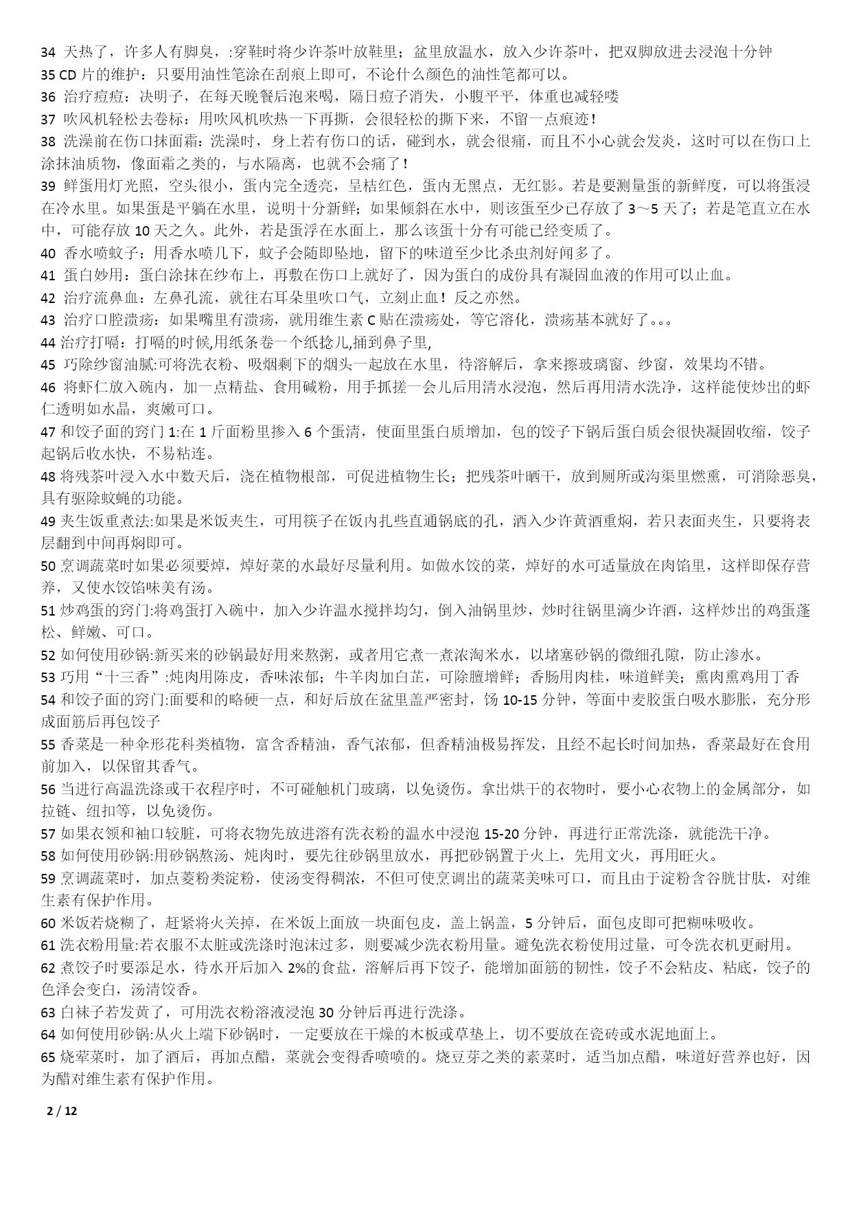 /NUMPAGES121000个家庭生活小窍门1不管是鞋子的哪个地方磨到了你的脚,你就在鞋子磨脚的地方涂一点点白酒,保证就不磨;2皮包上有了污渍或者是脏了的话,可以用棉花蘸风油精擦拭;3在洗完脸后,用手指沾些细盐在鼻头两侧轻轻摩擦,然后再用清水冲净,黑头粉刺就会清除干净,毛细孔也会变小;4出门在包包里面带一节小的干电池,如果你的裙子带静电的话把电池的正极在裙子上面擦几下就可以去掉静电了;5若有小面积皮肤损伤或烧伤、烫伤,抹上少许牙膏,可立即止血止痛,也可防止感染;6牛仔裤穿时间长了就会褪色。可以把新买来的牛仔裤放入浓盐水中浸泡12小时后,再用清水洗净7每天早晨起床后,用豆腐一块,放在掌心,用以摩擦面部几分钟,坚持一个月,面部肌肤就会变得白嫩滋润。8拉链的保养:拉链不能拉得太急、太猛;不能崩得太紧;保持干燥,防止和酸、碱东西接触;9白背心穿久了会出现黑斑,鲜姜2两捣烂放锅内加1斤水煮沸,稍凉后倒入洗衣盆,浸泡十分钟,再反复揉搓几遍10巧除领带上的皱纹。打皱了的领带,只要把领带卷在啤酒瓶上,第二天再用时,原来的皱纹就消除了;11当你非常口渴而家中又无凉开水时,可把装有热水的杯子放入冷水中浸泡,然后在冷水中撒上一把盐,这样能加速开水的冷却;12旅途中遭遇雷雨时,千万不要在巨石、悬崖下和山洞口躲避,电流从这些地方通过时会产生电弧,击伤避雨者。若山洞很深,可躲在里面;13吃羊肉有助于保持健美体形,羊肉是理想的肉碱来源,能帮助细胞“烧”掉人体多余的脂肪;14皮肤粗糙者可将醋与甘油以5:1比例调和涂抹面部,每日坚持。在洗脸水中加一汤匙醋洗脸,也有美容功效;15衣服最好不要在阳光下曝晒,应在阴凉通风处晾至半干时,再放到较弱的太阳光下晒干,保护衣服的色泽和寿命;16晾晒衣服不可拧得太干,应带水晾晒,并用手将衣服的襟、领、袖等处拉平17防衣物褪色二法:洗涤深色棉织物时加适量醋,可防止其褪色,且光泽如新;新买的有色花布第一次下水时,加盐浸泡十分钟可防止布料褪色;18身上有伤口流血时,可撒些白糖,因为白糖能减少伤口局部的水分,抑制细菌的繁殖,有助于伤口收敛愈合;19化妆时,先把微湿的化妆绵放到冰箱里,几分钟后把冰凉海绵拍在抹好粉底的肌肤上,你会觉得肌肤格外清爽,彩妆也显得特别清新;20画眼线的小技巧:要画好一双细致的眼线,可以先把手肘固定在桌上,然后平放一块小镜子,让双眼朝下望向镜子21专家建议冬天多吃红辣椒、胡萝卜、西红柿、洋葱、山楂等红颜色食品,可预防感冒;每天喝一杯酸奶、一碗鸡汤也有预防感冒的作用;22毛巾科学消毒法:将毛巾先用开水煮沸10分钟左右,再用肥皂洗涤,然后用清水充分洗净,最后将毛巾折叠好放入微波炉中,加热5分钟;239种让你笑容绽放的食物:芹菜、乳酪、绿茶、洋葱、香菇、芥末、无糖口香糖、薄荷、水;可消除口臭、防止蛀牙;24头皮屑过多可通过饮食改善。多吃碱性食物如水果、蔬菜、蜂蜜等;多吃含维生素B2、B6食物,如动物肝、肾、心、奶类、蛋黄、麦胚等;25枕头应有一定弹性,但过强也不好,头部不断受到外加的弹力作用,易产生肌肉疲劳和损伤。如弹簧枕、气枕等,都不能算是有利健康的枕头;26冬季当心“低热烫伤”。热水袋内水温不要太热,热力表面不要直接贴近皮肤。糖尿病人或末梢感觉神经迟钝者及婴幼儿最好不用热水袋取暖;27减少电脑伤害策略:连续工作1小时后应休息十分钟左右。室内光线要适宜,且保持通风干爽。注意正确的操作姿势。保持皮肤清洁;28白色毛衣穿旧了会逐渐发黑,将毛衣清洗后放入冰箱冷冻1小时,再取出晾干,即可洁白如新;29钻石保养:不要将钻饰堆放在一起,以免镶托间相互摩擦刮花;做粗重、剧烈活动时,先将钻饰脱下;每隔半年送珠宝店作一次专业性清洗;30被子晒法:以化纤面料为被里、被面的棉被不宜在阳光下曝晒,以防温度过高烤坏化学纤维,晒时可在被子上盖一层布,防止阳光直接晒到;31不要因为兔毛衫掉毛就不再穿它了,可把它装进一个塑料袋中放入冰箱内冷藏3-4天,就可以防止它掉毛了;32丝巾的妙用。在美容院做好发型,一觉醒来就变形了。睡前在枕头上铺一条丝巾,就不会弄乱头发33天热更要防感冒。天热流汗使人们消耗大量的能量,人体抵抗力下降,易患感冒,应注意多喝白开水,少量多次,以每次三百至五百毫升为宜;34天热了,许多人有脚臭,:穿鞋时将少许茶叶放鞋里;盆里放温水,放入少许茶叶,把双脚放进去浸泡十分钟35CD片的维护:只要用油性笔涂在刮痕上即可,不论什么颜色的油性笔都可以。36治疗痘痘:决明子,在每天晚餐后泡来喝,隔日痘子消失,小腹平平,体重也减轻喽37吹风机轻松去卷标:用吹风机吹热一下再撕,会很轻松的撕下来,不留一点痕迹!38洗澡前在伤口抹面霜:洗澡时,身上若有伤口的话,碰到