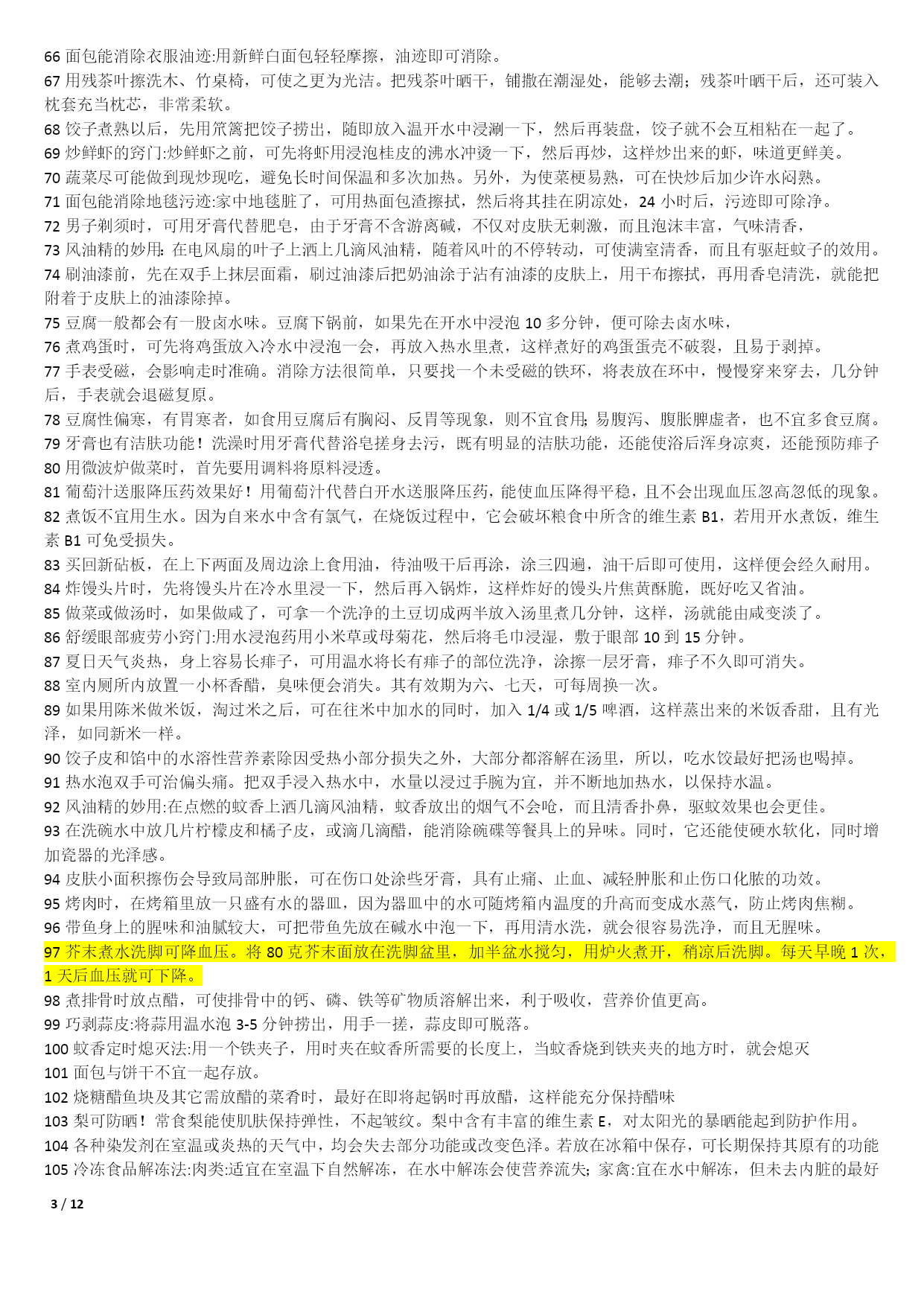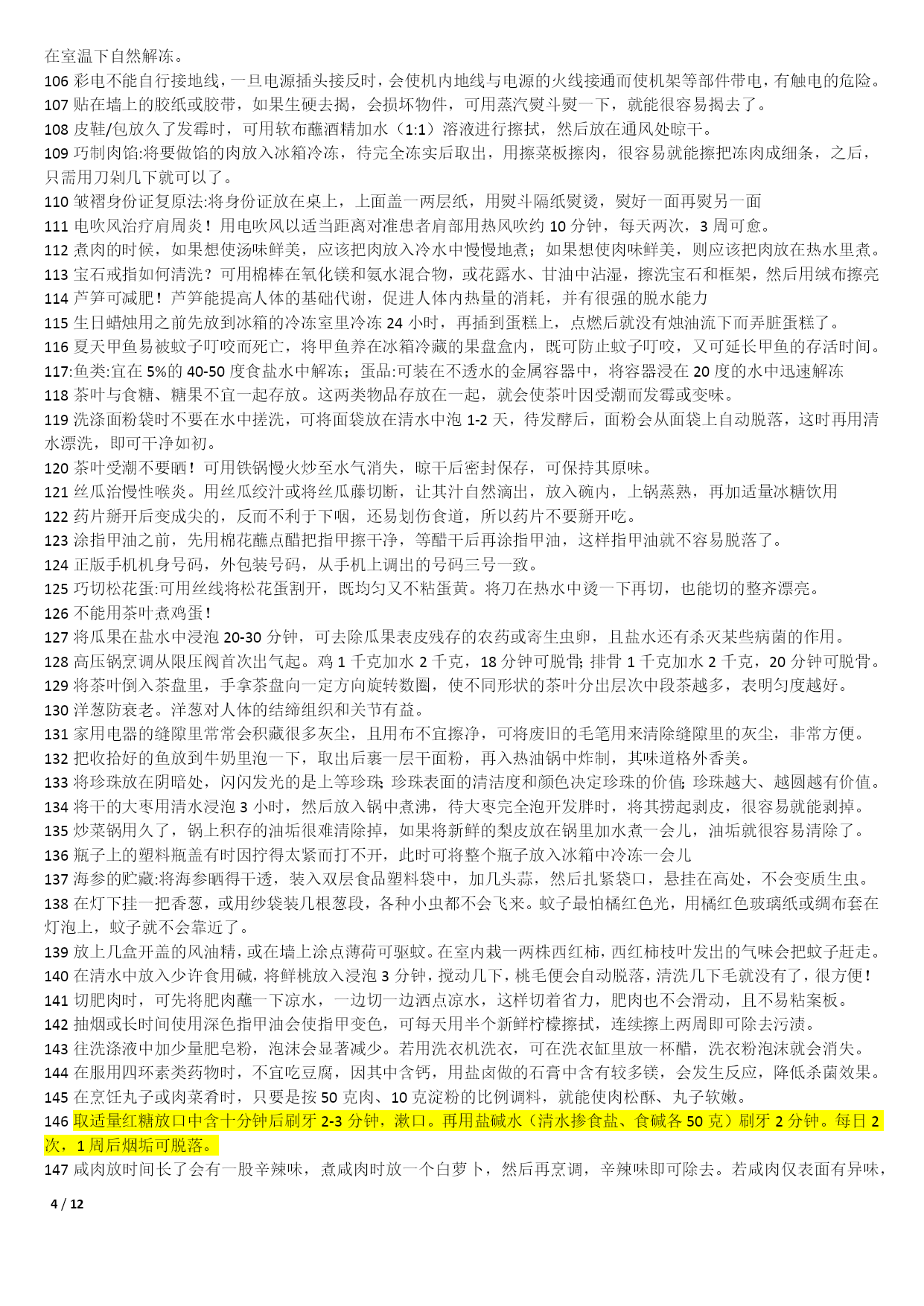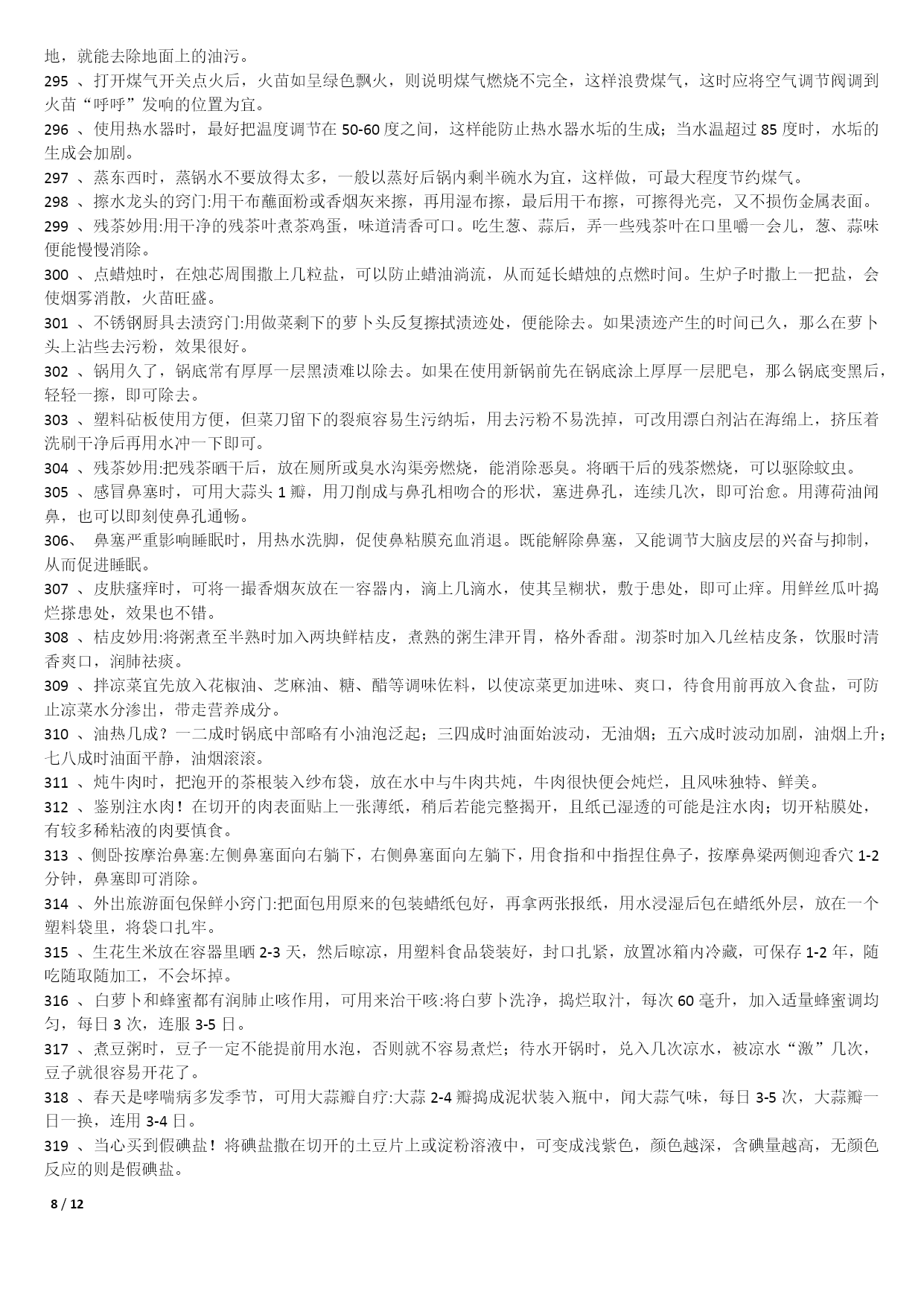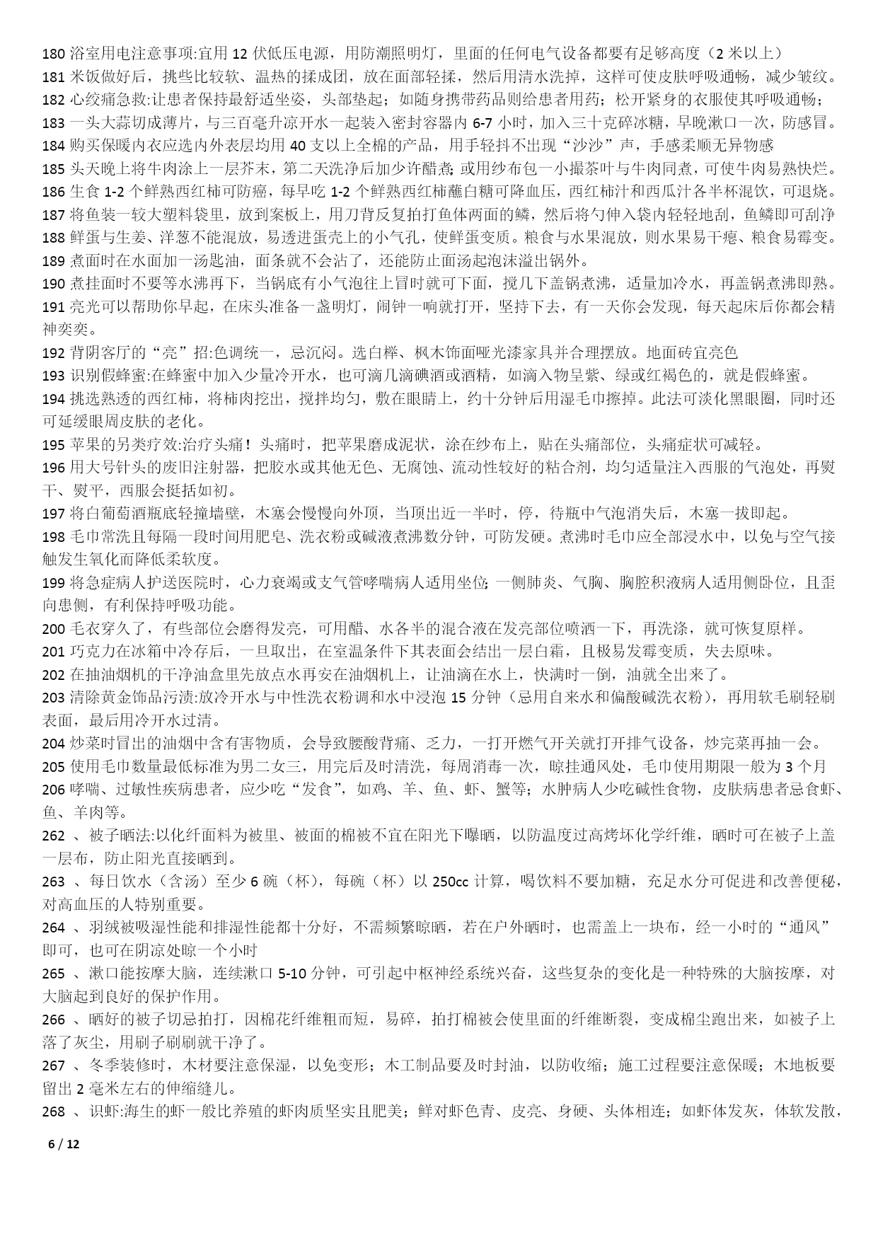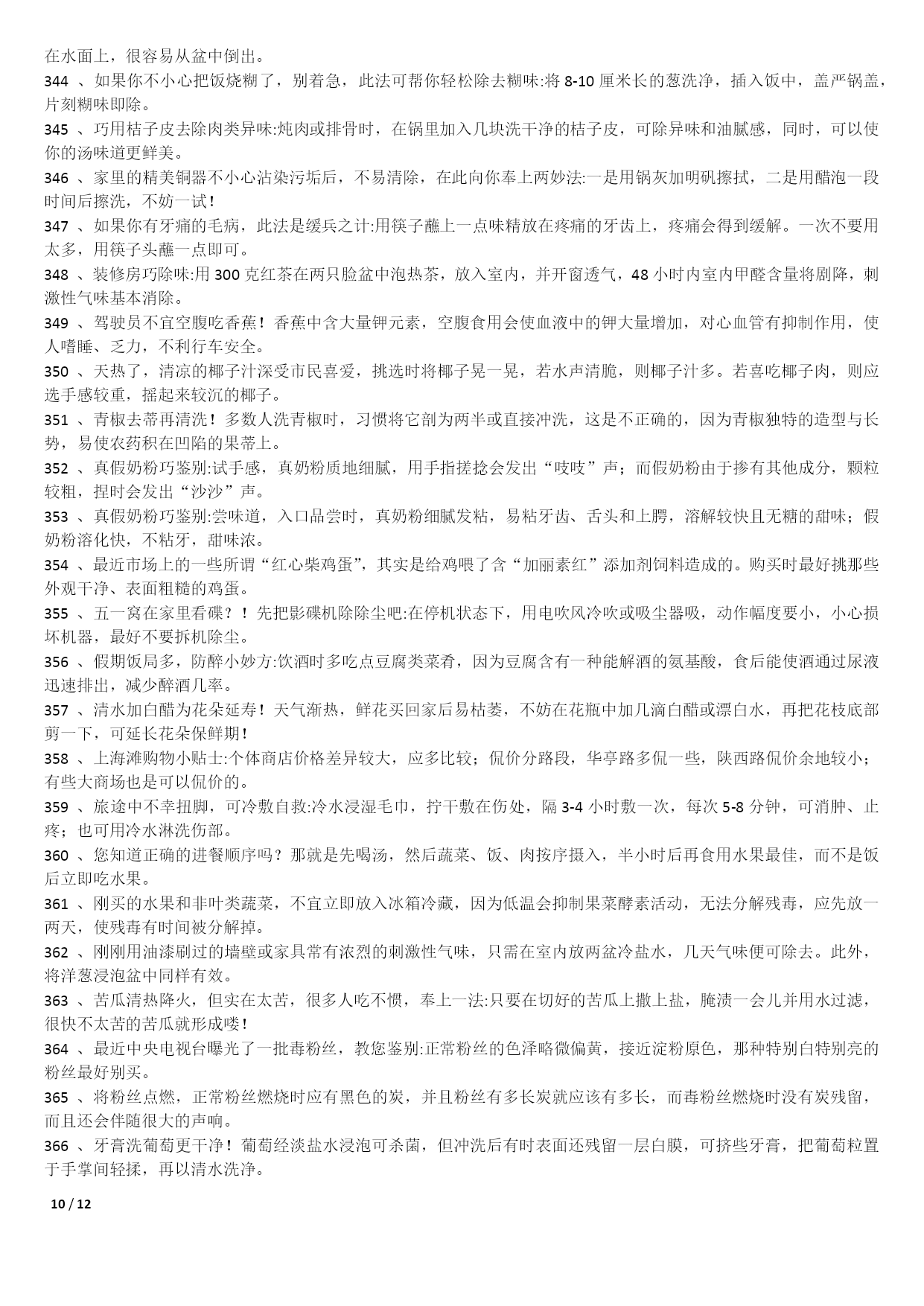 /NUMPAGES121000个家庭生活小窍门1不管是鞋子的哪个地方磨到了你的脚,你就在鞋子磨脚的地方涂一点点白酒,保证就不磨;2皮包上有了污渍或者是脏了的话,可以用棉花蘸风油精擦拭;3在洗完脸后,用手指沾些细盐在鼻头两侧轻轻摩擦,然后再用清水冲净,黑头粉刺就会清除干净,毛细孔也会变小;4出门在包包里面带一节小的干电池,如果你的裙子带静电的话把电池的正极在裙子上面擦几下就可以去掉静电了;5若有小面积皮肤损伤或烧伤、烫伤,抹上少许牙膏,可立即止血止痛,也可防止感染;6牛仔裤穿时间长了就会褪色。可以把新买来的牛仔裤放入浓盐水中浸泡12小时后,再用清水洗净7每天早晨起床后,用豆腐一块,放在掌心,用以摩擦面部几分钟,坚持一个月,面部肌肤就会变得白嫩滋润。8拉链的保养:拉链不能拉得太急、太猛;不能崩得太紧;保持干燥,防止和酸、碱东西接触;9白背心穿久了会出现黑斑,鲜姜2两捣烂放锅内加1斤水煮沸,稍凉后倒入洗衣盆,浸泡十分钟,再反复揉搓几遍10巧除领带上的皱纹。打皱了的领带,只要把领带卷在啤酒瓶上,第二天再用时,原来的皱纹就消除了;11当你非常口渴而家中又无凉开水时,可把装有热水的杯子放入冷水中浸泡,然后在冷水中撒上一把盐,这样能加速开水的冷却;12旅途中遭遇雷雨时,千万不要在巨石、悬崖下和山洞口躲避,电流从这些地方通过时会产生电弧,击伤避雨者。若山洞很深,可躲在里面;13吃羊肉有助于保持健美体形,羊肉是理想的肉碱来源,能帮助细胞“烧”掉人体多余的脂肪;14皮肤粗糙者可将醋与甘油以5:1比例调和涂抹面部,每日坚持。在洗脸水中加一汤匙醋洗脸,也有美容功效;15衣服最好不要在阳光下曝晒,应在阴凉通风处晾至半干时,再放到较弱的太阳光下晒干,保护衣服的色泽和寿命;16晾晒衣服不可拧得太干,应带水晾晒,并用手将衣服的襟、领、袖等处拉平17防衣物褪色二法:洗涤深色棉织物时加适量醋,可防止其褪色,且光泽如新;新买的有色花布第一次下水时,加盐浸泡十分钟可防止布料褪色;18身上有伤口流血时,可撒些白糖,因为白糖能减少伤口局部的水分,抑制细菌的繁殖,有助于伤口收敛愈合;19化妆时,先把微湿的化妆绵放到冰箱里,几分钟后把冰凉海绵拍在抹好粉底的肌肤上,你会觉得肌肤格外清爽,彩妆也显得特别清新;20画眼线的小技巧:要画好一双细致的眼线,可以先把手肘固定在桌上,然后平放一块小镜子,让双眼朝下望向镜子21专家建议冬天多吃红辣椒、胡萝卜、西红柿、洋葱、山楂等红颜色食品,可预防感冒;每天喝一杯酸奶、一碗鸡汤也有预防感冒的作用;22毛巾科学消毒法:将毛巾先用开水煮沸10分钟左右,再用肥皂洗涤,然后用清水充分洗净,最后将毛巾折叠好放入微波炉中,加热5分钟;239种让你笑容绽放的食物:芹菜、乳酪、绿茶、洋葱、香菇、芥末、无糖口香糖、薄荷、水;可消除口臭、防止蛀牙;24头皮屑过多可通过饮食改善。多吃碱性食物如水果、蔬菜、蜂蜜等;多吃含维生素B2、B6食物,如动物肝、肾、心、奶类、蛋黄、麦胚等;25枕头应有一定弹性,但过强也不好,头部不断受到外加的弹力作用,易产生肌肉疲劳和损伤。如弹簧枕、气枕等,都不能算是有利健康的枕头;26冬季当心“低热烫伤”。热水袋内水温不要太热,热力表面不要直接贴近皮肤。糖尿病人或末梢感觉神经迟钝者及婴幼儿最好不用热水袋取暖;27减少电脑伤害策略:连续工作1小时后应休息十分钟左右。室内光线要适宜,且保持通风干爽。注意正确的操作姿势。保持皮肤清洁;28白色毛衣穿旧了会逐渐发黑,将毛衣清洗后放入冰箱冷冻1小时,再取出晾干,即可洁白如新;29钻石保养:不要将钻饰堆放在一起,以免镶托间相互摩擦刮花;做粗重、剧烈活动时,先将钻饰脱下;每隔半年送珠宝店作一次专业性清洗;30被子晒法:以化纤面料为被里、被面的棉被不宜在阳光下曝晒,以防温度过高烤坏化学纤维,晒时可在被子上盖一层布,防止阳光直接晒到;31不要因为兔毛衫掉毛就不再穿它了,可把它装进一个塑料袋中放入冰箱内冷藏3-4天,就可以防止它掉毛了;32丝巾的妙用。在美容院做好发型,一觉醒来就变形了。睡前在枕头上铺一条丝巾,就不会弄乱头发33天热更要防感冒。天热流汗使人们消耗大量的能量,人体抵抗力下降,易患感冒,应注意多喝白开水,少量多次,以每次三百至五百毫升为宜;34天热了,许多人有脚臭,:穿鞋时将少许茶叶放鞋里;盆里放温水,放入少许茶叶,把双脚放进去浸泡十分钟35CD片的维护:只要用油性笔涂在刮痕上即可,不论什么颜色的油性笔都可以。36治疗痘痘:决明子,在每天晚餐后泡来喝,隔日痘子消失,小腹平平,体重也减轻喽37吹风机轻松去卷标:用吹风机吹热一下再撕,会很轻松的撕下来,不留一点痕迹!38洗澡前在伤口抹面霜:洗澡时,身上若有伤口的话,碰到