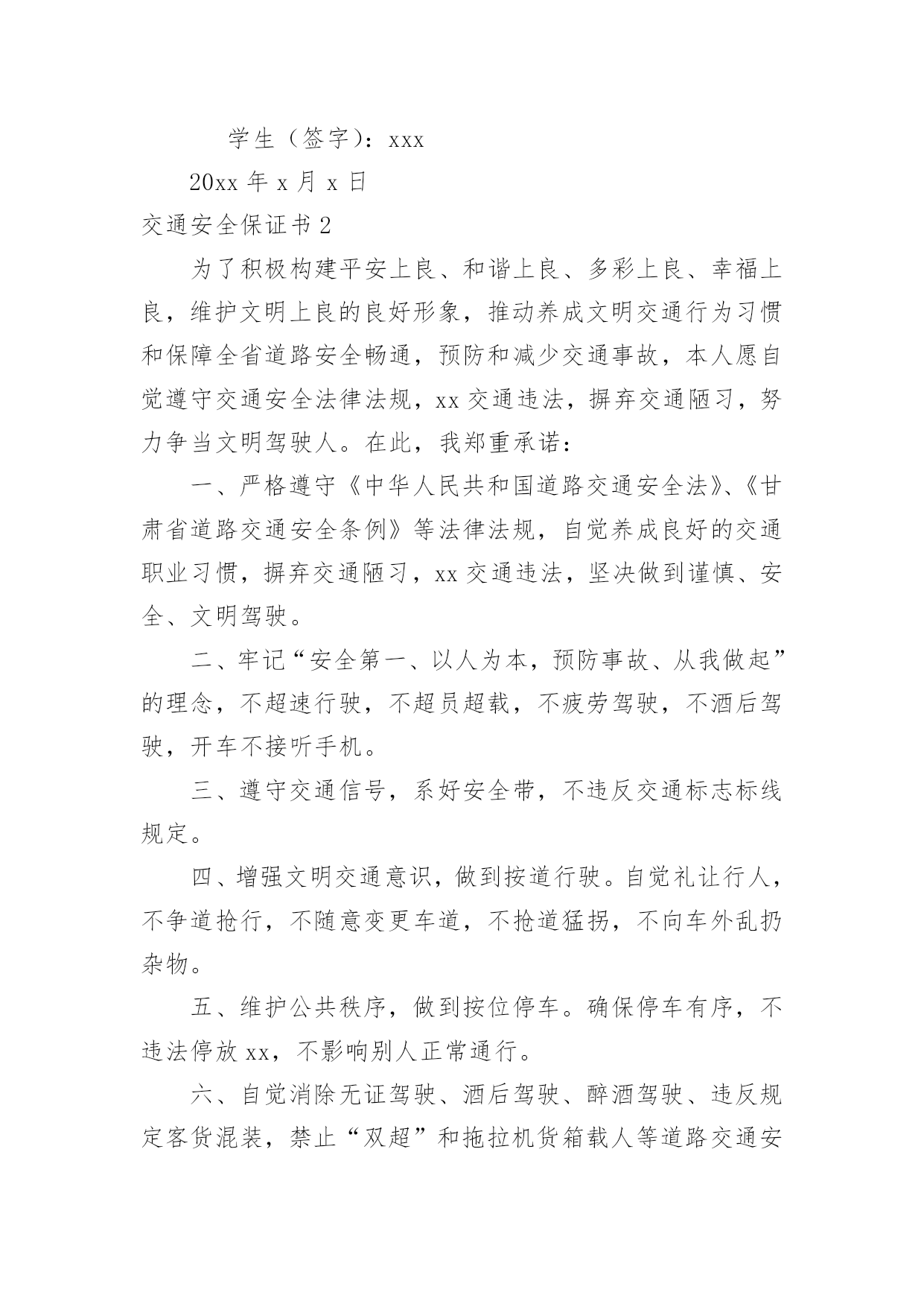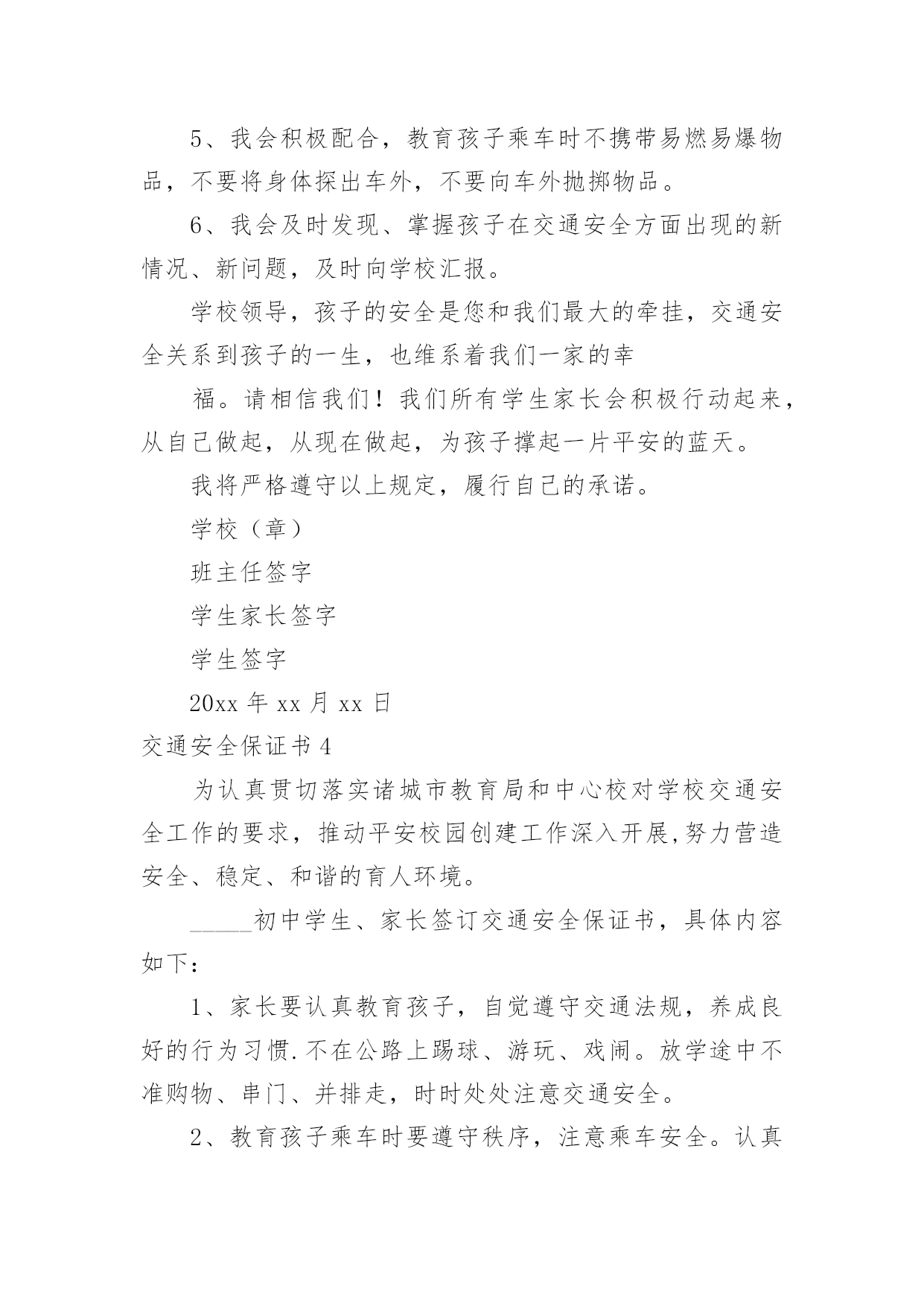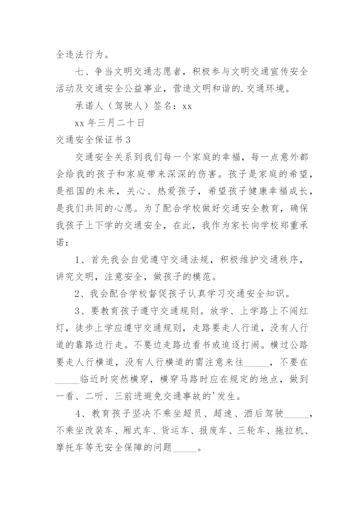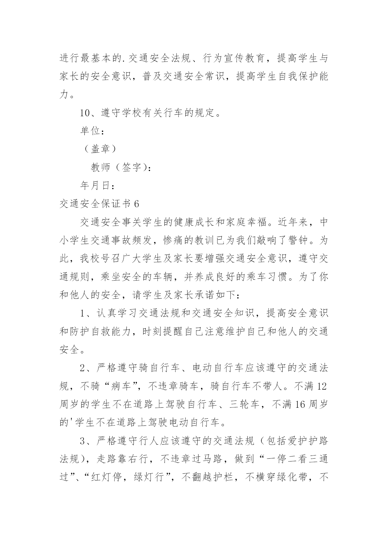 交通安全保证书交通安全保证书我们眼下的社会,接触并使用保证书的人越来越多,保证书有利于保证者依此进行自我检查、自我约束、自我督促。那么,保证书到底怎么写才合适呢?下面是小编为大家收集的交通安全保证书,欢迎大家分享。交通安全保证书1为进一步提高自身的交通安全意识,减少道路交通安全事故的发生,我与班主任老师签订交通安全保证书。1、认真学习道路交通安全法律法规和安全常识,强化自身交通法制观念,积极参加学校组织的交通安全教育活动。2、自觉遵守交通法律法规,骑车时靠右行,不并行,不撒把,不飙车,按学校规定的路线或最安全的.路线上下学,放学后按时回家。3、不乘坐农用车,报废车,拖拉机和无牌无证无运营手续的xx,拒绝乘坐超载x。对运载学生的可疑xx及时向班主任及学校领导汇报或向有关部门进行举报。4、将在学校学到的交通安全法律法规知识传达给家长,请他们对自己在遵守交通安全方面的行为进行监督与教育。以上各项我保证做到,请老师予以监督。班主任(签字):xxx学生(签字):xxx20xx年x月x日交通安全保证书2为了积极构建平安上良、和谐上良、多彩上良、幸福上良,维护文明上良的良好形象,推动养成文明交通行为习惯和保障全省道路安全畅通,预防和减少交通事故,本人愿自觉遵守交通安全法律法规,xx交通违法,摒弃交通陋习,努力争当文明驾驶人。在此,我郑重承诺:一、严格遵守《中华人民共和国道路交通安全法》、《甘肃省道路交通安全条例》等法律法规,自觉养成良好的交通职业习惯,摒弃交通陋习,xx交通违法,坚决做到谨慎、安全、文明驾驶。二、牢记“安全第一、以人为本,预防事故、从我做起”的理念,不超速行驶,不超员超载,不疲劳驾驶,不酒后驾驶,开车不接听手机。三、遵守交通信号,系好安全带,不违反交通标志标线规定。四、增强文明交通意识,做到按道行驶。自觉礼让行人,不争道抢行,不随意变更车道,不抢道猛拐,不向车外乱扔杂物。五、维护公共秩序,做到按位停车。确保停车有序,不违法停放xx,不影响别人正常通行。六、自觉消除无证驾驶、酒后驾驶、醉酒驾驶、违反规定客货混装,禁止“双超”和拖拉机货箱载人等道路交通安全违法行为。七、争当文明交通志愿者,积极参与文明交通宣传安全活动及交通安全公益事业,营造文明和谐的.交通环境。承诺人(驾驶人)签名:xxxx年三月二十日交通安全保证书3交通安全关系到我们每一个家庭的幸福,每一点意外都会给我的孩子和家庭带来深深的伤害。孩子是家庭的希望,是祖国的未来,关心、热爱孩子,希望孩子健康幸福成长,是我们共同的心愿。为了配合学校做好交通安全教育,确保我孩子上下学的交通安全,在此,我作为家长向学校郑重承诺:1、首先我会自觉遵守交通法规,积极维护交通秩序,讲究文明,注意安全,做孩子的模范。2、我会配合学校督促孩子认真学习交通安全知识。3、要教育孩子遵守交通规则。放学、上学路上不闯红灯,徒步上学应遵守交通规则,走路要走人行道,没有人行道的靠路边行走。不要边走路边看书或追逐打闹。横过公路要走人行横道,没有人行横道的需注意来往_____,不要在_____临近时突然横穿,横穿马路时应在规定的地点,做到一看、二听、三前进避免交通事故的'发生。4、教育孩子坚决不乘坐超员、超速、酒后驾驶_____,不乘坐改装车、厢式车、货运车、报废车、三轮车、拖拉机、摩托车等无安全保障的问题_____。5、我会积极配合,教育孩子乘车时不携带易燃易爆物品,不要将身体探出车外,不要向车外抛掷物品。6、我会及时发现、掌握孩子在交通安全方面出现的新情况、新问题,及时向学校汇报。学校领导,孩子的安全是您和我们最大的牵挂,交通安全关系到孩子的一生,也维系着我们一家的幸福。请相信我们!我们所有学生家长会积极行动起来,从自己做起,从现在做起,为孩子撑起一片平安的蓝天。我将严格遵守以上规定,履行自己的承诺。学校(章)班主任签字学生家长签字学生签字20xx年xx月xx日交通安全保证书4为认真贯切落实诸城市教育局和中心校对学校交通安全工作的要求,推动平安校园创建工作深入开展,努力营造安全、稳定、和谐的育人环境。_____初中学生、家长签订交通安全保证书,具体内容如下:1、家长要认真教育孩子,自觉遵守交通法规,养成良好的行为习惯.不在公路上踢球、游玩、戏闹。放学途中不准购物、串门、并排走,时时处处注意交通安全。2、教育孩子乘车时要遵守秩序,注意乘车安全。认真学习道路交通安全法律法规和安全常识,强化自身交通法制观念,积极参加学校组织的交通安全教育活动。3、家长作为孩子的第一监护人,必须保证孩子不乘坐农用车、报废车、拖拉机和无牌、无证或不合手续的报废车及个别家长私自组织的无运营手续的违规车辆。4、家长要教育孩子文明乘车,不拥挤,不抢座,不打架,自觉遵守乘车纪律,确保乘车期间的人身安全。拒绝乘坐超载车辆。对运载学生的可