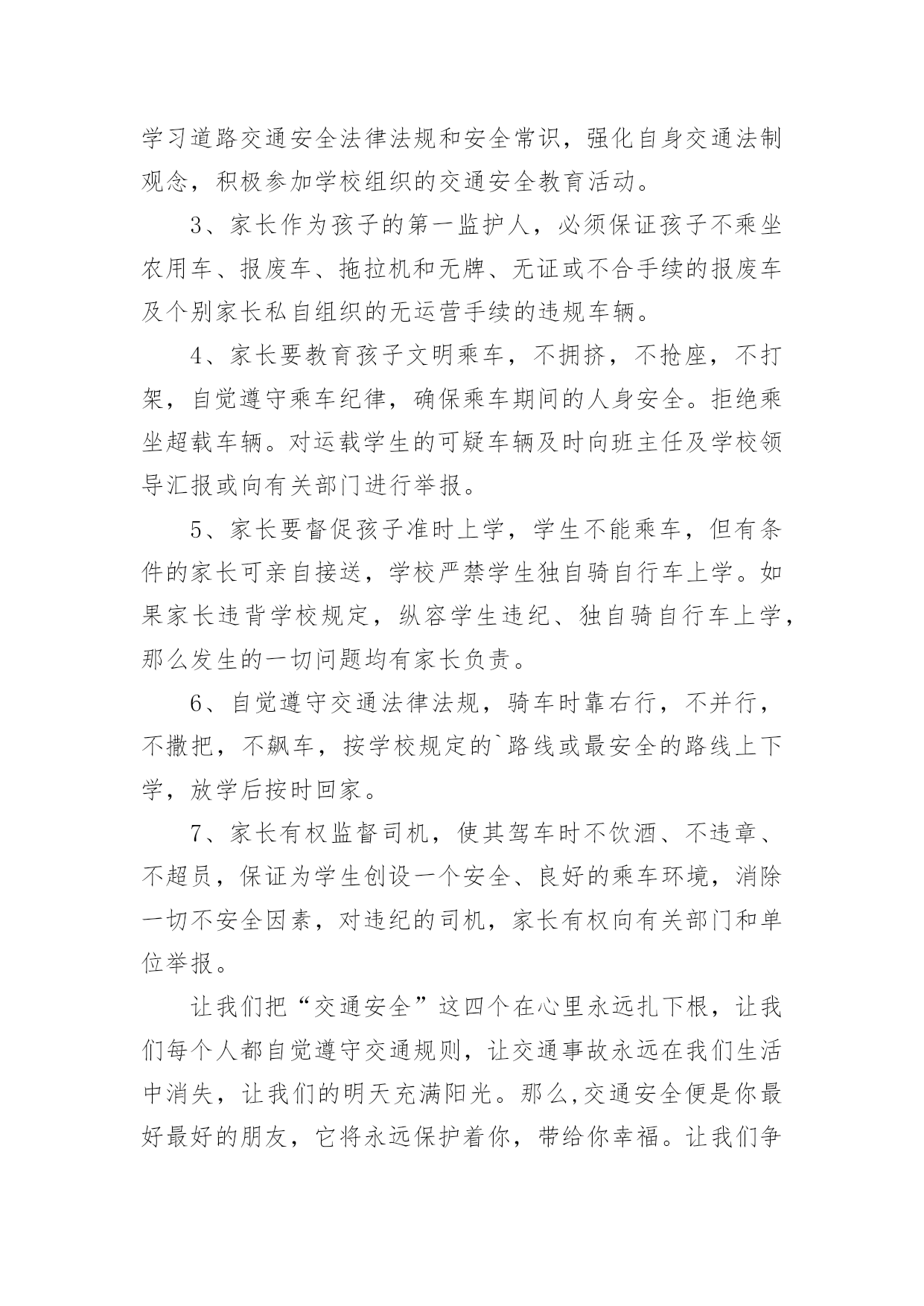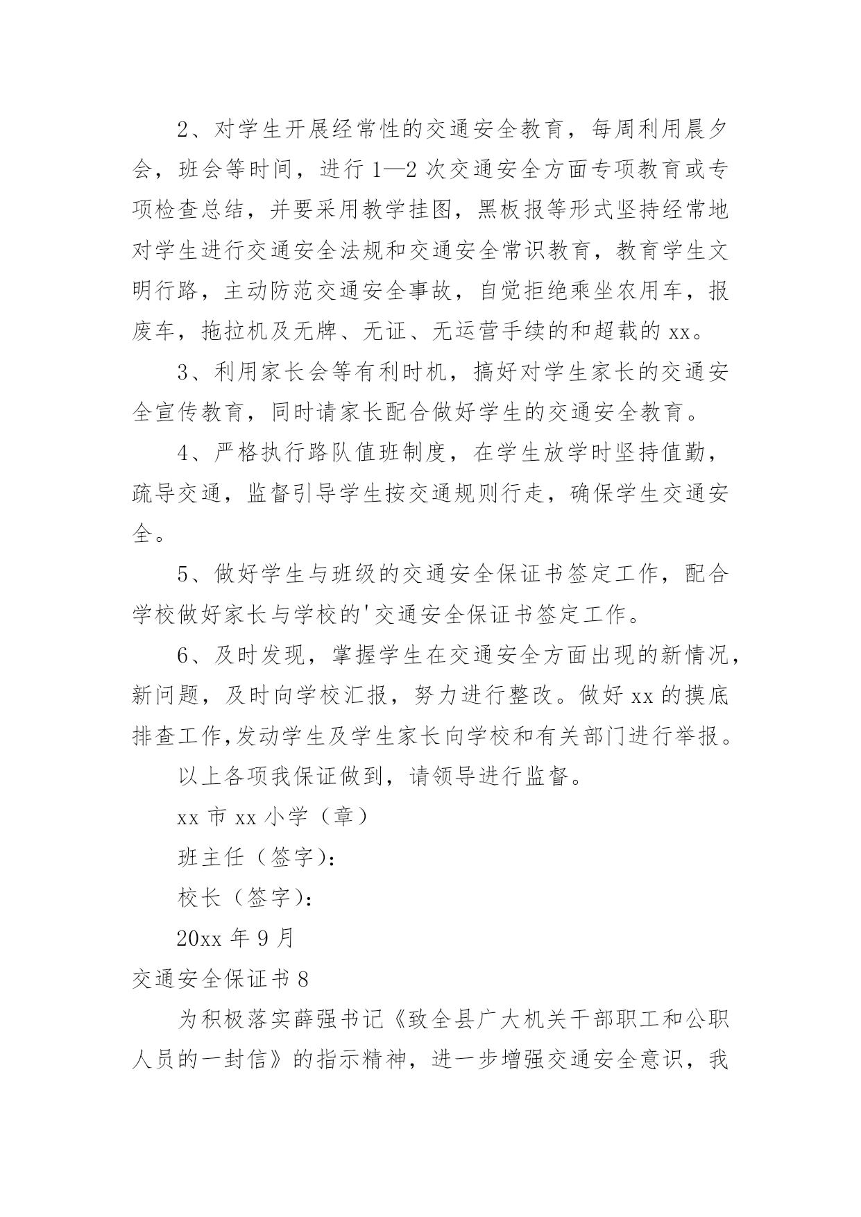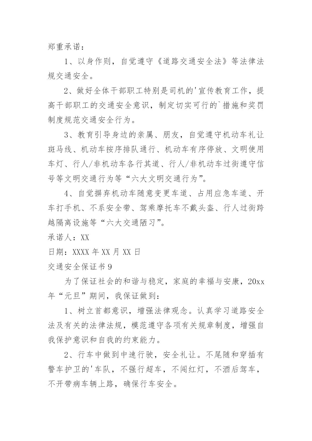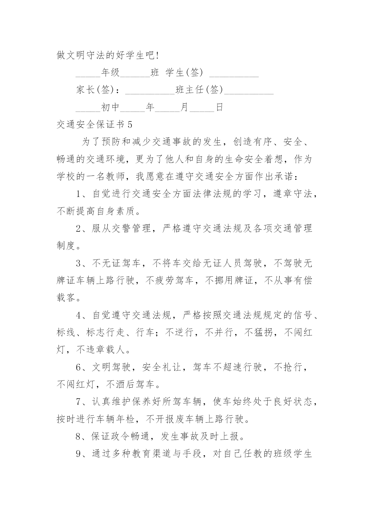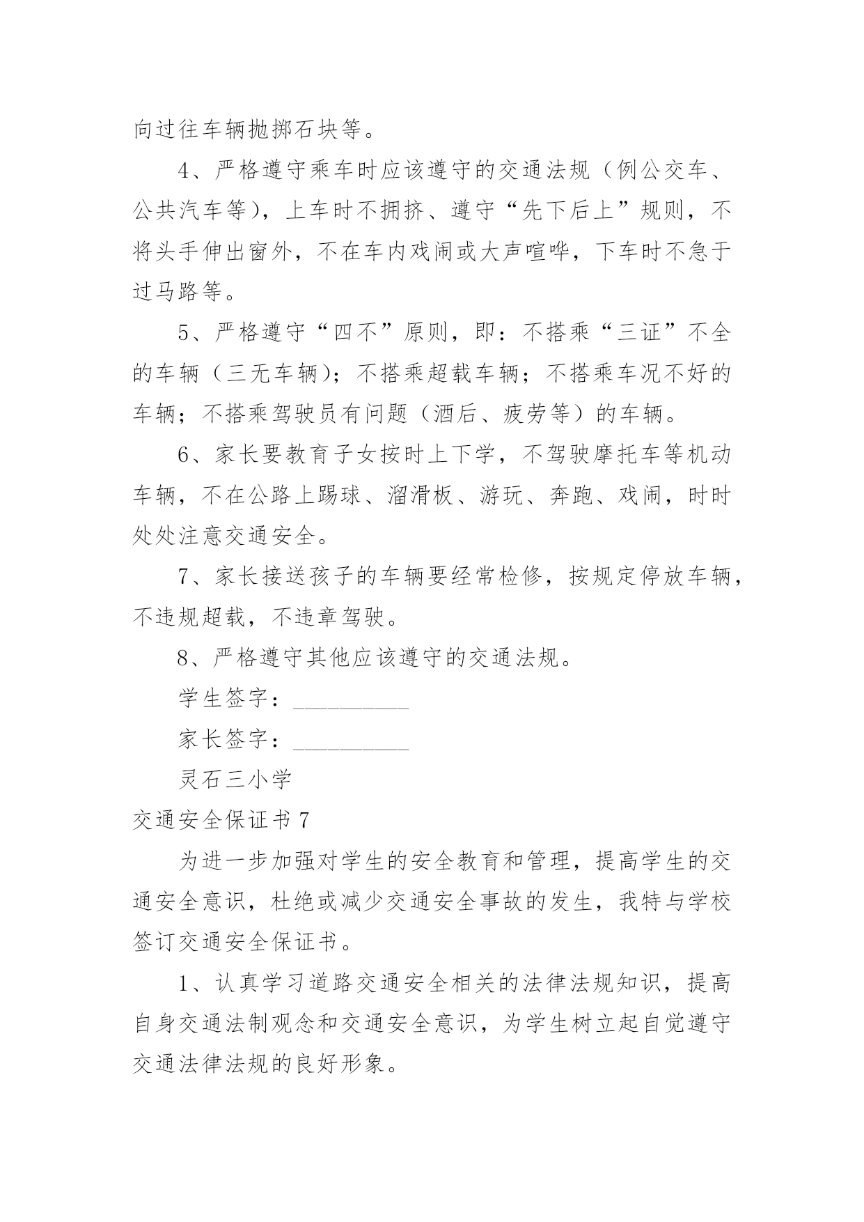 交通安全保证书交通安全保证书我们眼下的社会,接触并使用保证书的人越来越多,保证书有利于保证者依此进行自我检查、自我约束、自我督促。那么,保证书到底怎么写才合适呢?下面是小编为大家收集的交通安全保证书,欢迎大家分享。交通安全保证书1为进一步提高自身的交通安全意识,减少道路交通安全事故的发生,我与班主任老师签订交通安全保证书。1、认真学习道路交通安全法律法规和安全常识,强化自身交通法制观念,积极参加学校组织的交通安全教育活动。2、自觉遵守交通法律法规,骑车时靠右行,不并行,不撒把,不飙车,按学校规定的路线或最安全的.路线上下学,放学后按时回家。3、不乘坐农用车,报废车,拖拉机和无牌无证无运营手续的xx,拒绝乘坐超载x。对运载学生的可疑xx及时向班主任及学校领导汇报或向有关部门进行举报。4、将在学校学到的交通安全法律法规知识传达给家长,请他们对自己在遵守交通安全方面的行为进行监督与教育。以上各项我保证做到,请老师予以监督。班主任(签字):xxx学生(签字):xxx20xx年x月x日交通安全保证书2为了积极构建平安上良、和谐上良、多彩上良、幸福上良,维护文明上良的良好形象,推动养成文明交通行为习惯和保障全省道路安全畅通,预防和减少交通事故,本人愿自觉遵守交通安全法律法规,xx交通违法,摒弃交通陋习,努力争当文明驾驶人。在此,我郑重承诺:一、严格遵守《中华人民共和国道路交通安全法》、《甘肃省道路交通安全条例》等法律法规,自觉养成良好的交通职业习惯,摒弃交通陋习,xx交通违法,坚决做到谨慎、安全、文明驾驶。二、牢记“安全第一、以人为本,预防事故、从我做起”的理念,不超速行驶,不超员超载,不疲劳驾驶,不酒后驾驶,开车不接听手机。三、遵守交通信号,系好安全带,不违反交通标志标线规定。四、增强文明交通意识,做到按道行驶。自觉礼让行人,不争道抢行,不随意变更车道,不抢道猛拐,不向车外乱扔杂物。五、维护公共秩序,做到按位停车。确保停车有序,不违法停放xx,不影响别人正常通行。六、自觉消除无证驾驶、酒后驾驶、醉酒驾驶、违反规定客货混装,禁止“双超”和拖拉机货箱载人等道路交通安全违法行为。七、争当文明交通志愿者,积极参与文明交通宣传安全活动及交通安全公益事业,营造文明和谐的.交通环境。承诺人(驾驶人)签名:xxxx年三月二十日交通安全保证书3交通安全关系到我们每一个家庭的幸福,每一点意外都会给我的孩子和家庭带来深深的伤害。孩子是家庭的希望,是祖国的未来,关心、热爱孩子,希望孩子健康幸福成长,是我们共同的心愿。为了配合学校做好交通安全教育,确保我孩子上下学的交通安全,在此,我作为家长向学校郑重承诺:1、首先我会自觉遵守交通法规,积极维护交通秩序,讲究文明,注意安全,做孩子的模范。2、我会配合学校督促孩子认真学习交通安全知识。3、要教育孩子遵守交通规则。放学、上学路上不闯红灯,徒步上学应遵守交通规则,走路要走人行道,没有人行道的靠路边行走。不要边走路边看书或追逐打闹。横过公路要走人行横道,没有人行横道的需注意来往_____,不要在_____临近时突然横穿,横穿马路时应在规定的地点,做到一看、二听、三前进避免交通事故的'发生。4、教育孩子坚决不乘坐超员、超速、酒后驾驶_____,不乘坐改装车、厢式车、货运车、报废车、三轮车、拖拉机、摩托车等无安全保障的问题_____。5、我会积极配合,教育孩子乘车时不携带易燃易爆物品,不要将身体探出车外,不要向车外抛掷物品。6、我会及时发现、掌握孩子在交通安全方面出现的新情况、新问题,及时向学校汇报。学校领导,孩子的安全是您和我们最大的牵挂,交通安全关系到孩子的一生,也维系着我们一家的幸福。请相信我们!我们所有学生家长会积极行动起来,从自己做起,从现在做起,为孩子撑起一片平安的蓝天。我将严格遵守以上规定,履行自己的承诺。学校(章)班主任签字学生家长签字学生签字20xx年xx月xx日交通安全保证书4为认真贯切落实诸城市教育局和中心校对学校交通安全工作的要求,推动平安校园创建工作深入开展,努力营造安全、稳定、和谐的育人环境。_____初中学生、家长签订交通安全保证书,具体内容如下:1、家长要认真教育孩子,自觉遵守交通法规,养成良好的行为习惯.不在公路上踢球、游玩、戏闹。放学途中不准购物、串门、并排走,时时处处注意交通安全。2、教育孩子乘车时要遵守秩序,注意乘车安全。认真学习道路交通安全法律法规和安全常识,强化自身交通法制观念,积极参加学校组织的交通安全教育活动。3、家长作为孩子的第一监护人,必须保证孩子不乘坐农用车、报废车、拖拉机和无牌、无证或不合手续的报废车及个别家长私自组织的无运营手续的违规车辆。4、家长要教育孩子文明乘车,不拥挤,不抢座,不打架,自觉遵守乘车纪律,确保乘车期间的人身安全。拒绝乘坐超载车辆。对运载学生的可