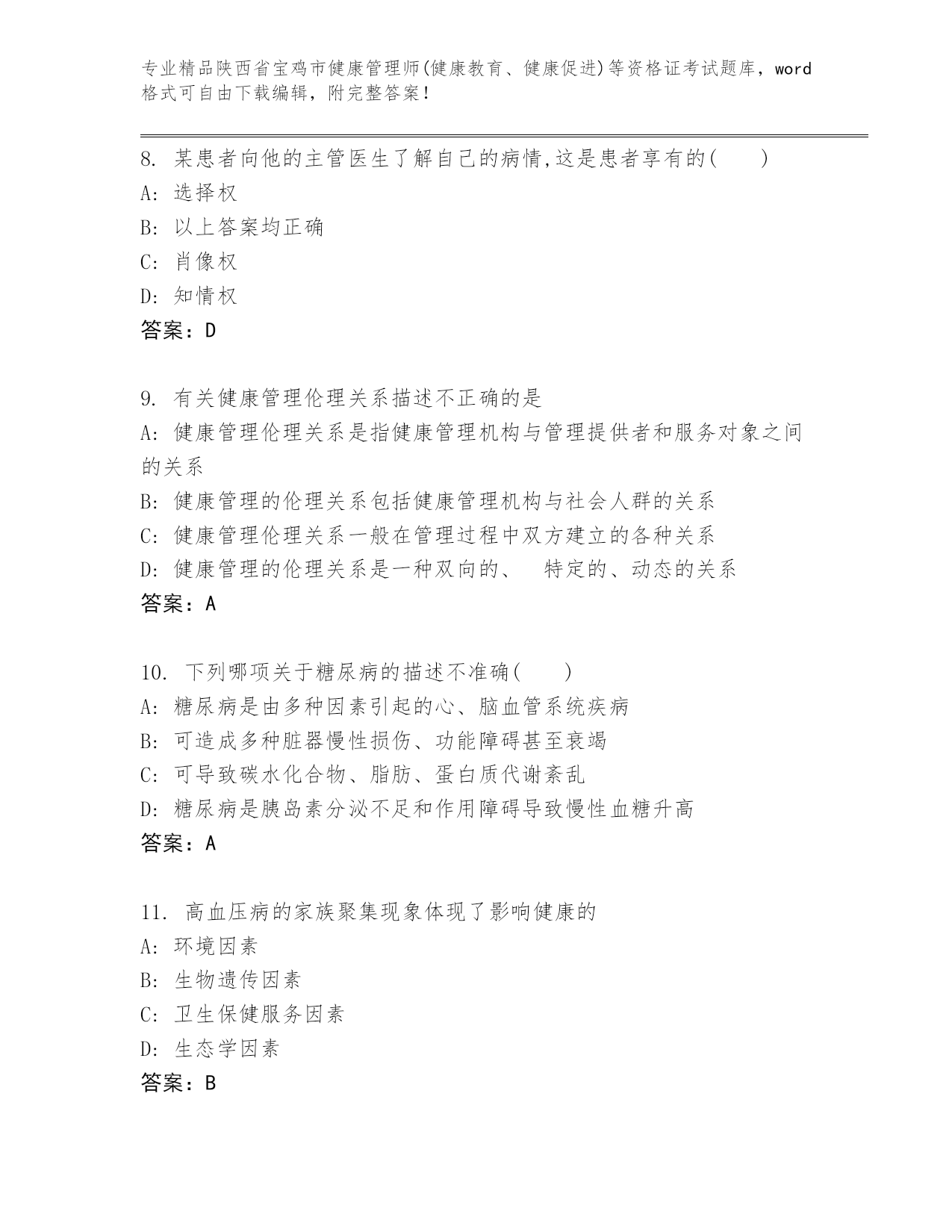陕西省宝鸡市健康管理师(健康教育、健康促进)等资格证考试通用题库及答案(精选题)