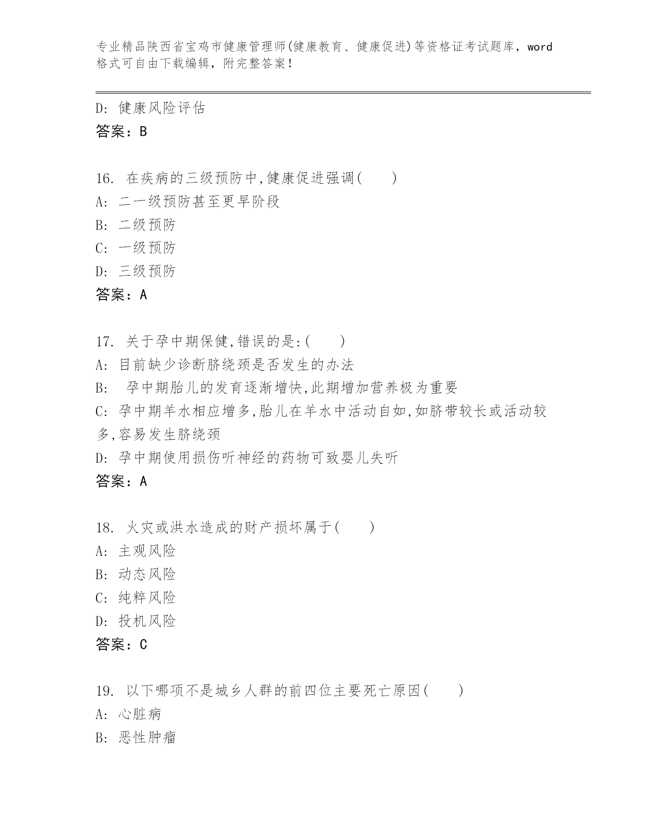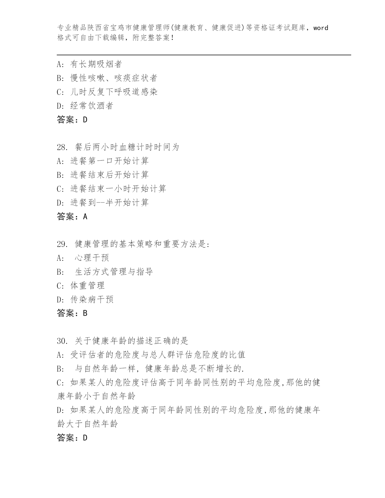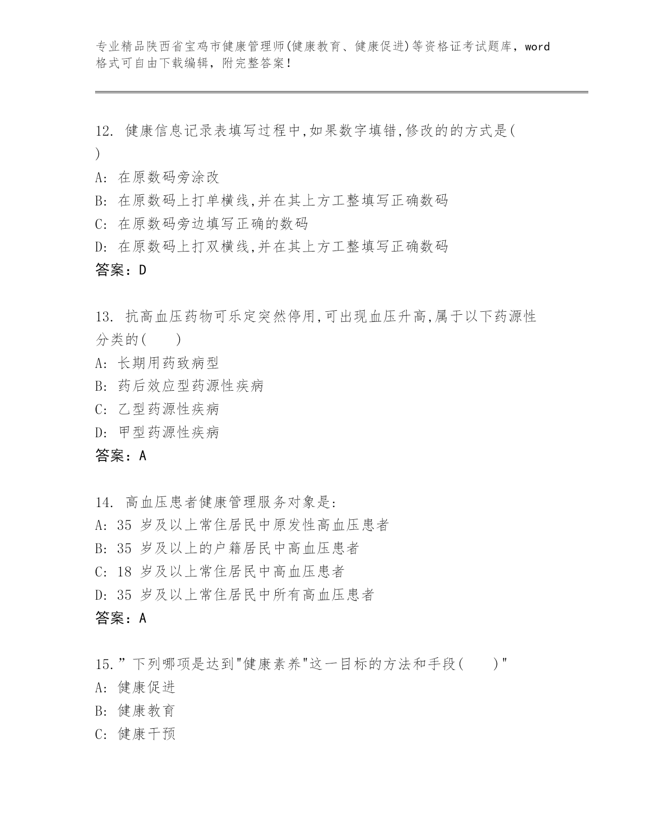 陕西省宝鸡市健康管理师(健康教育、健康促进)等资格证考试通用题库及答案(精选题).docx