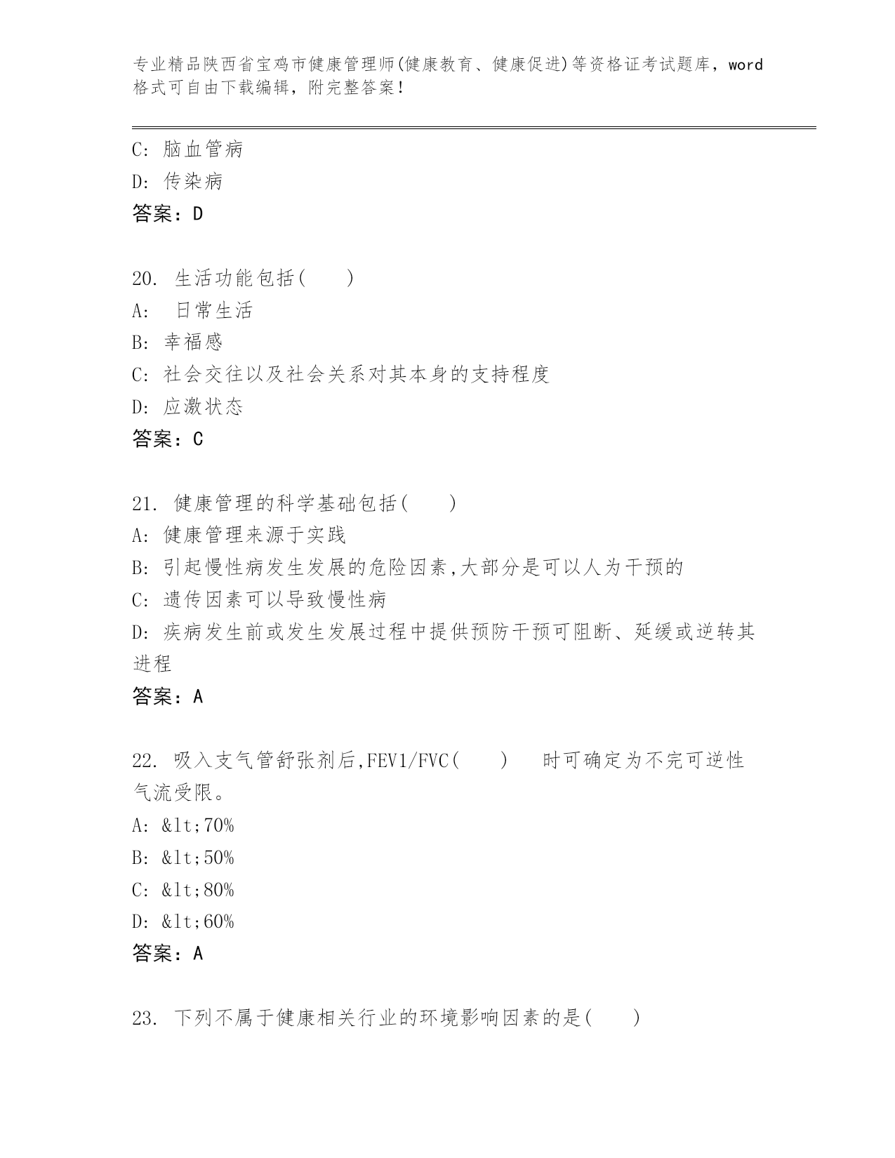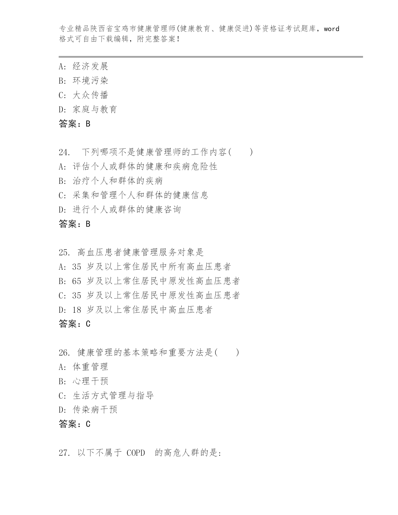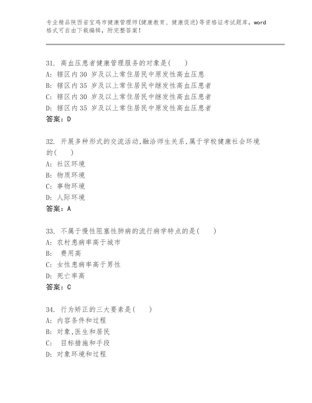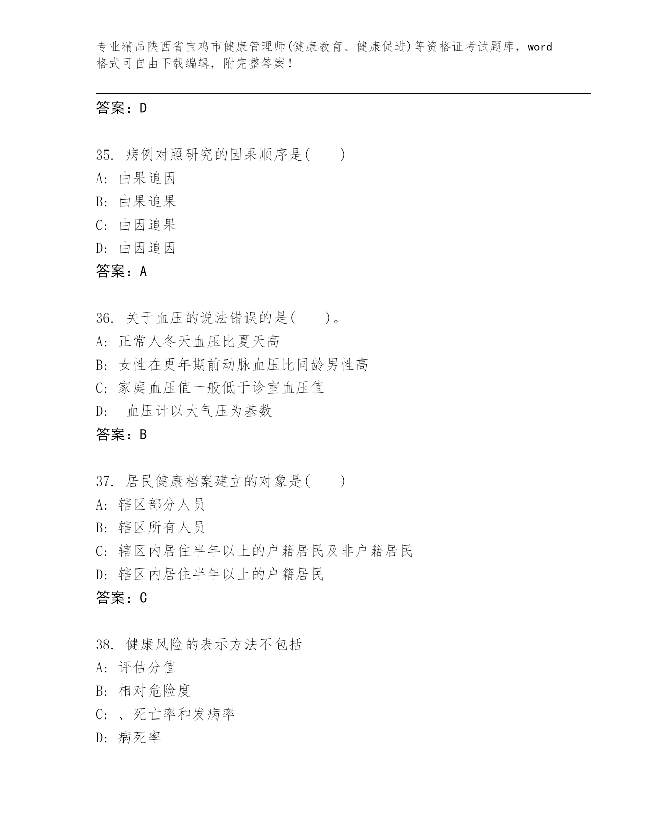 陕西省宝鸡市健康管理师(健康教育、健康促进)等资格证考试通用题库及答案(精选题).docx